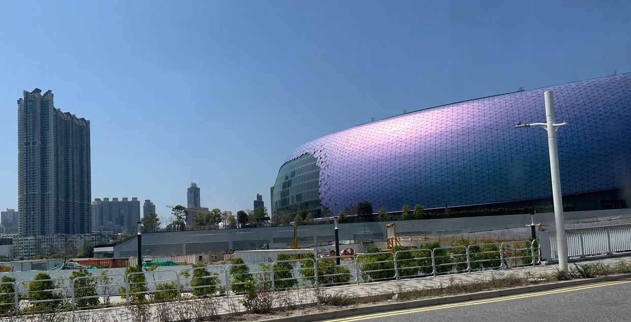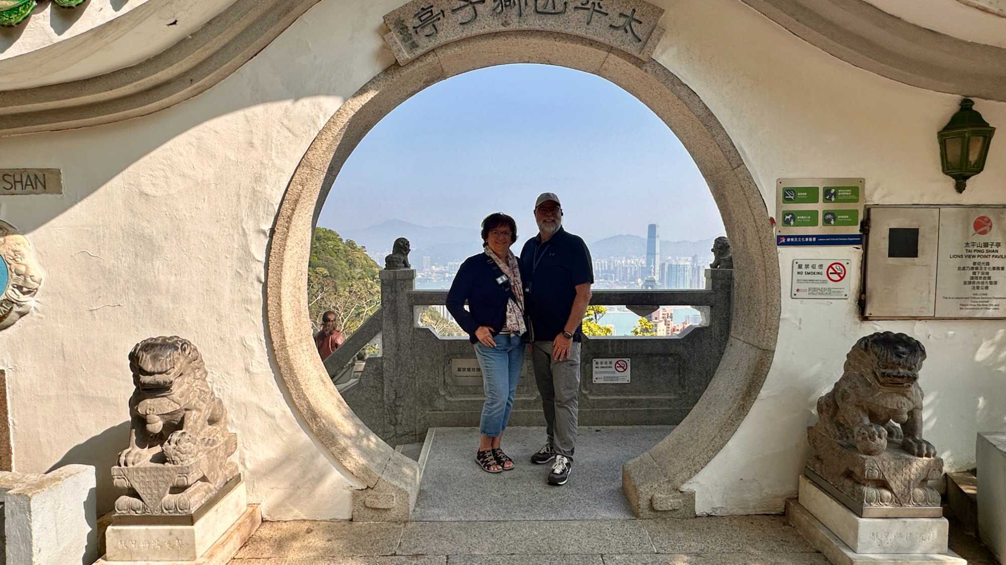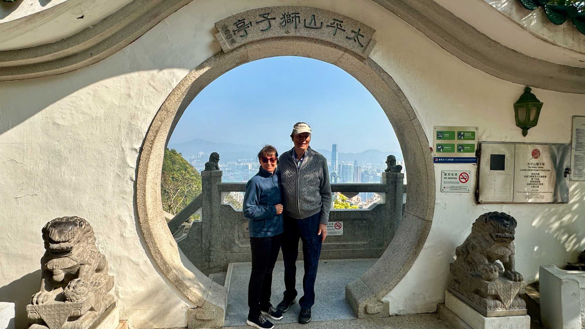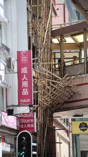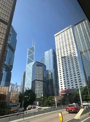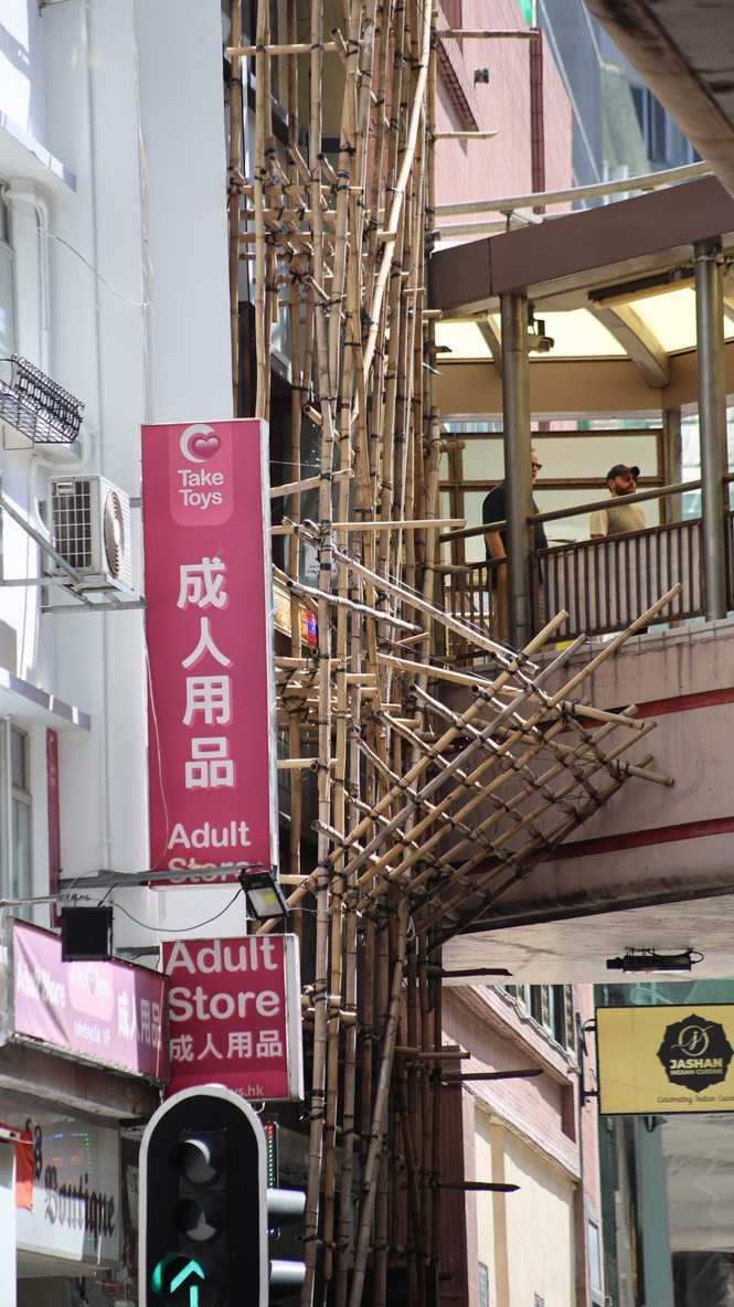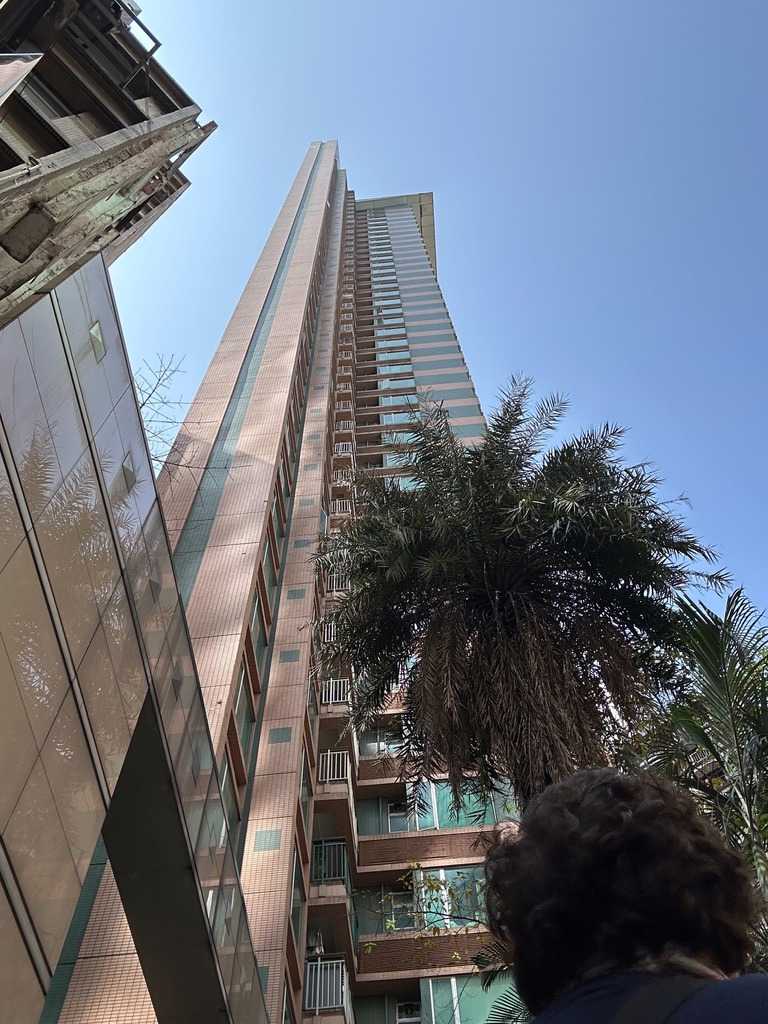 415 m. Nous pouvons facilement identifier la tour de la China Bank, dont le célèbre architecte I.M. Pei a signé les plans. L’édifice s’élève à 387 m pour 72 étages en s’inspirant des structures de bambous (pour la croissance, la résilience et la flexibilité) de formes triangulaires, reconnaissables parmi toutes particulièrement le soir avec ses losanges éclairés en blanc. C’est une des villes les plus densément peuplées au monde et un pôle économique et financier des plus importants, rivalisant avec Singapour. Parlant de bambou, nous avons pu constater, lire avons été impressionnés ou même stupéfaits, que la très grande majorité des échafauds, si hauts soient-ils, sont encore faits de ce matériau. Ce n’est pas sans rappeler le terrible incendie survenu le 26 novembre 2025 dans un complexe d’édifices en rénovation, qui a coûté la vie à plus de 140 personnes et qui en a délogé près de 4000 résidents.