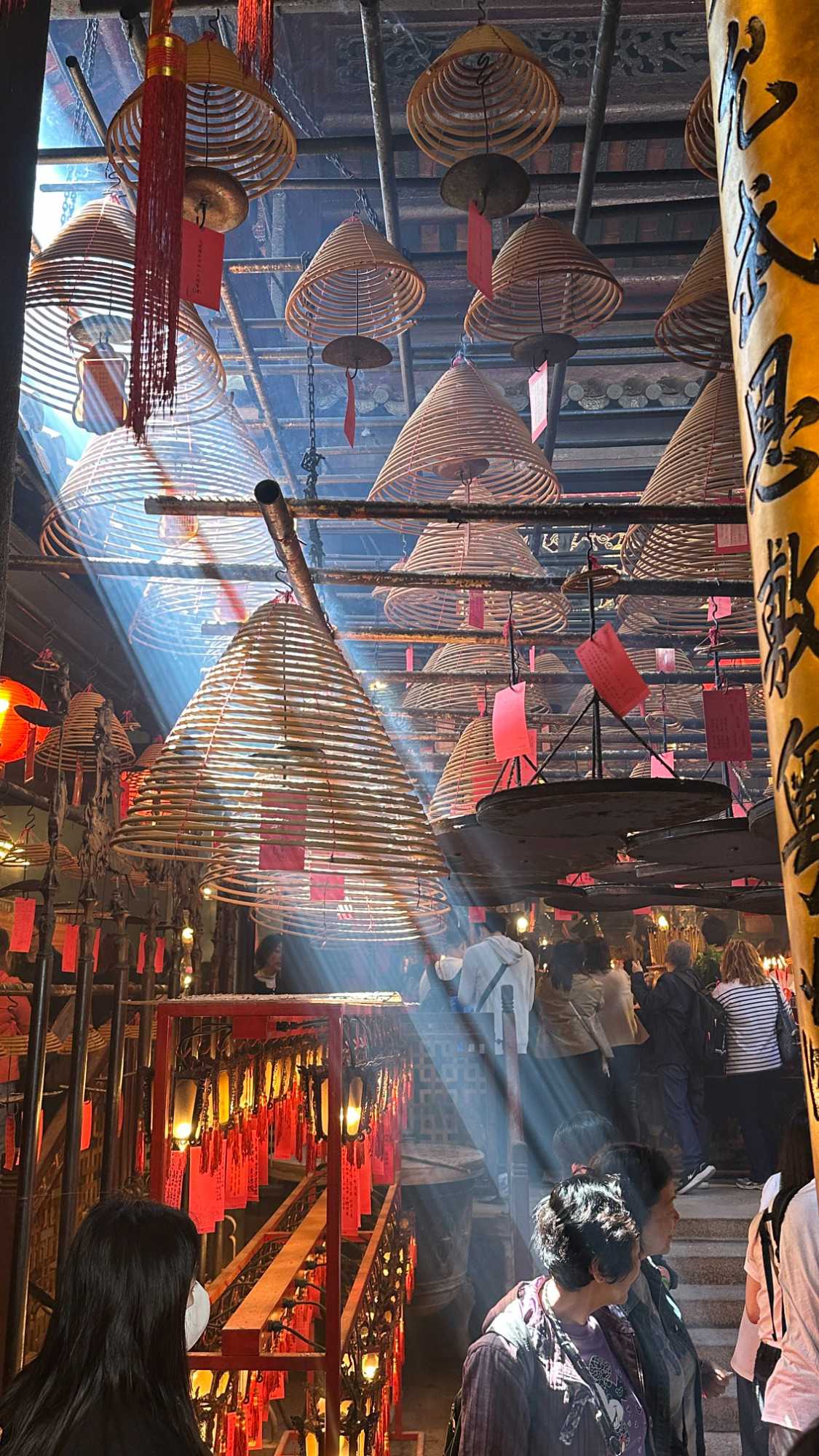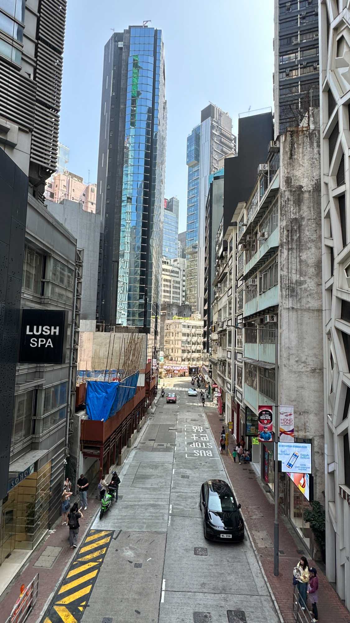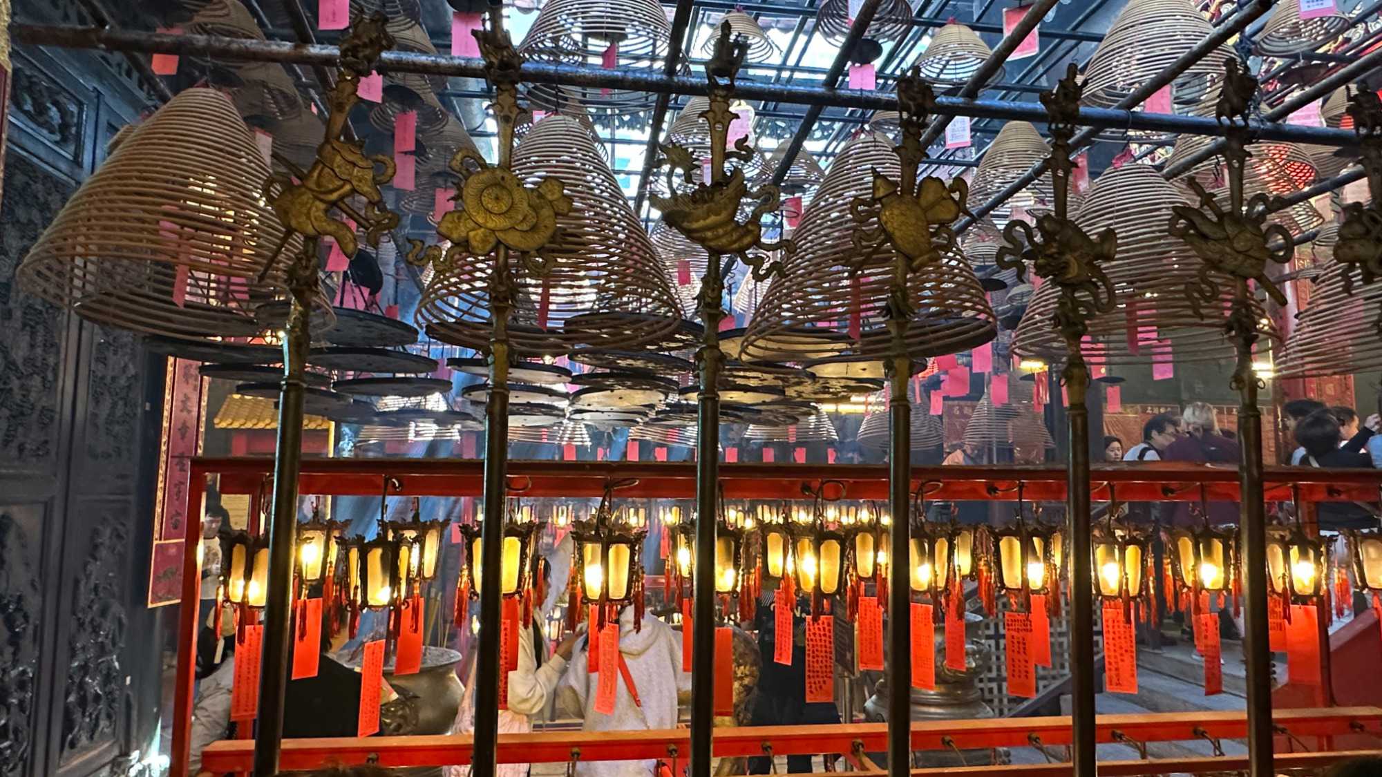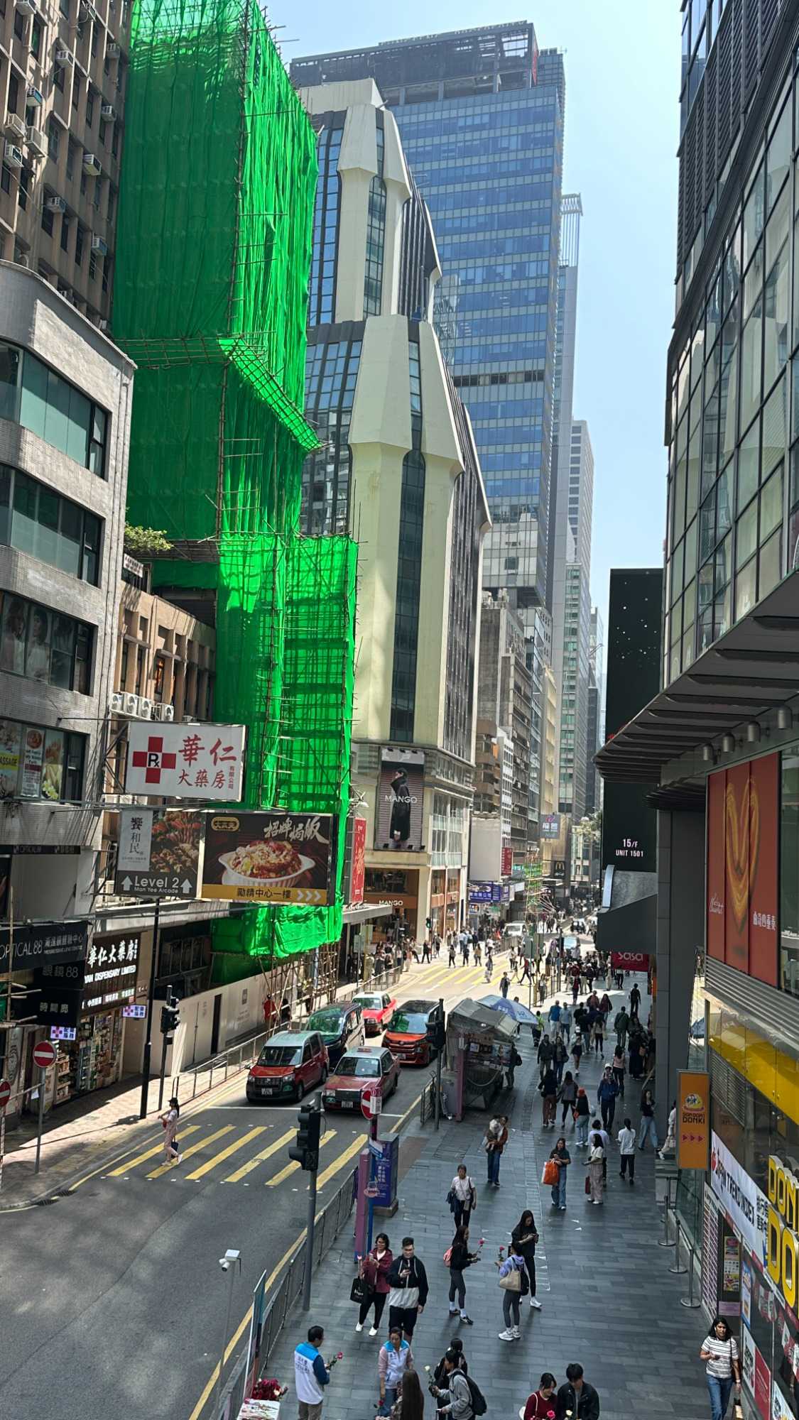 415 m. Nous pouvons facilement identifier la tour de la China Bank, dont le célèbre architecte I.M. Pei a signé les plans. L’édifice s’élève à 387 m pour 72 étages en s’inspirant des structures de bambous (pour la croissance, la résilience et la flexibilité) de formes triangulaires, reconnaissables parmi toutes particulièrement le soir avec ses losanges éclairés en blanc. C’est une des villes les plus densément peuplées au monde et un pôle économique et financier des plus importants, rivalisant avec Singapour. Parlant de bambou, nous avons pu constater, lire avons été impressionnés ou même stupéfaits, que la très grande majorité des échafauds, si hauts soient-ils, sont encore faits de ce matériau. Ce n’est pas sans rappeler le terrible incendie survenu le 26 novembre 2025 dans un complexe d’édifices en rénovation, qui a coûté la vie à plus de 140 personnes et qui en a délogé près de 4000 résidents.