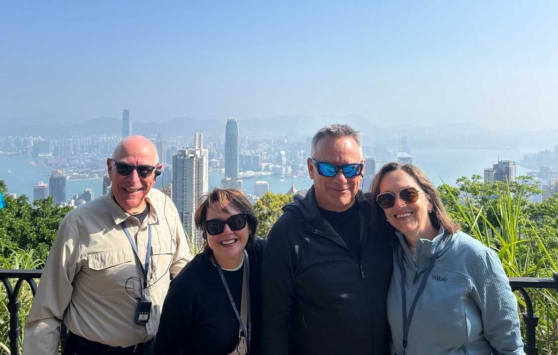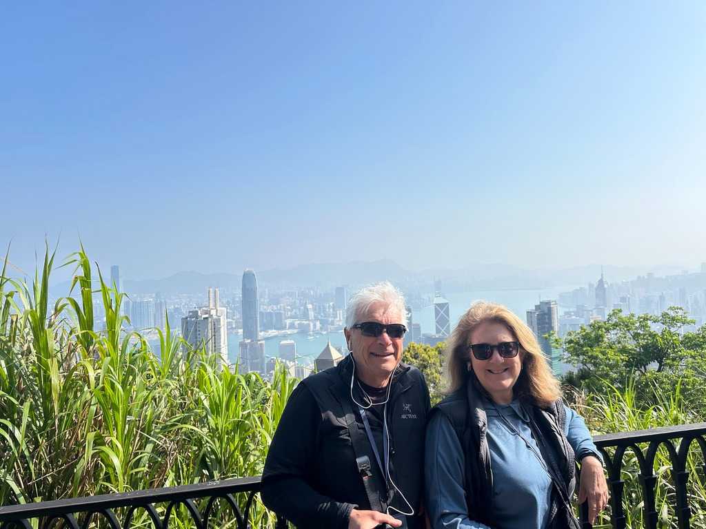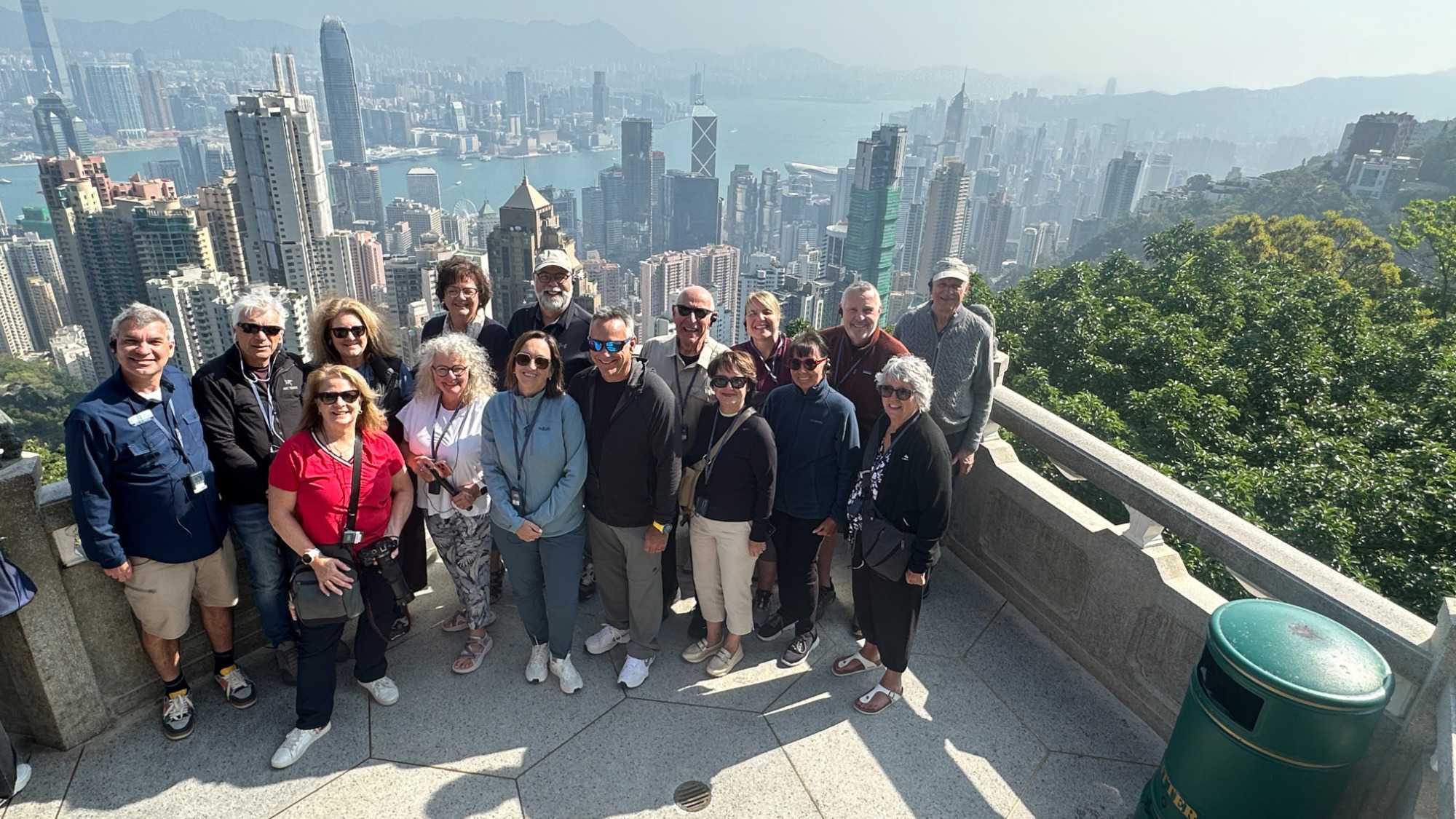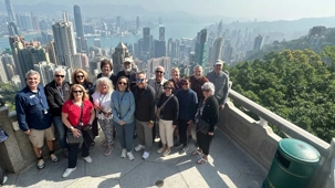 Pendant que Wallace nous entretient, nous sommes surtout impressionnés par le trajet, ou je devrais plutôt dire, l’ascension en autocar qui nous mène droit au sommet de Victoria Peak, perché à 552 m sur l’île de Hong Kong. C’est ici qu’on trouve une des zones habitées les plus chères du km2, ainsi que les plus jolies résidences de la région. Avec raison, les vues sur la baie en contrebas sont tout simplement époustouflantes. Voyez par vous-mêmes les photos ci-dessous. Nous prenons la pleine mesure de la densité de population en voyant les édifices d’une quarantaine d’étages plantés comme des arbres à flanc de montagne. Il fait beau, le ciel est dégagé, nous savourons la chance que dame nature nous offre! On ne voudrait pas être ailleurs. Les caméras et appareils photos du téléphone se font allègrement. C’est toujours une excellente idée de grimper au point le plus haut lorsqu’on visite une ville pour la première fois. Cela nous situe et nous aide à nous orienter.