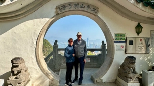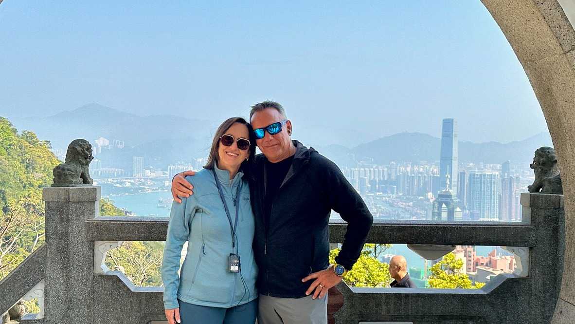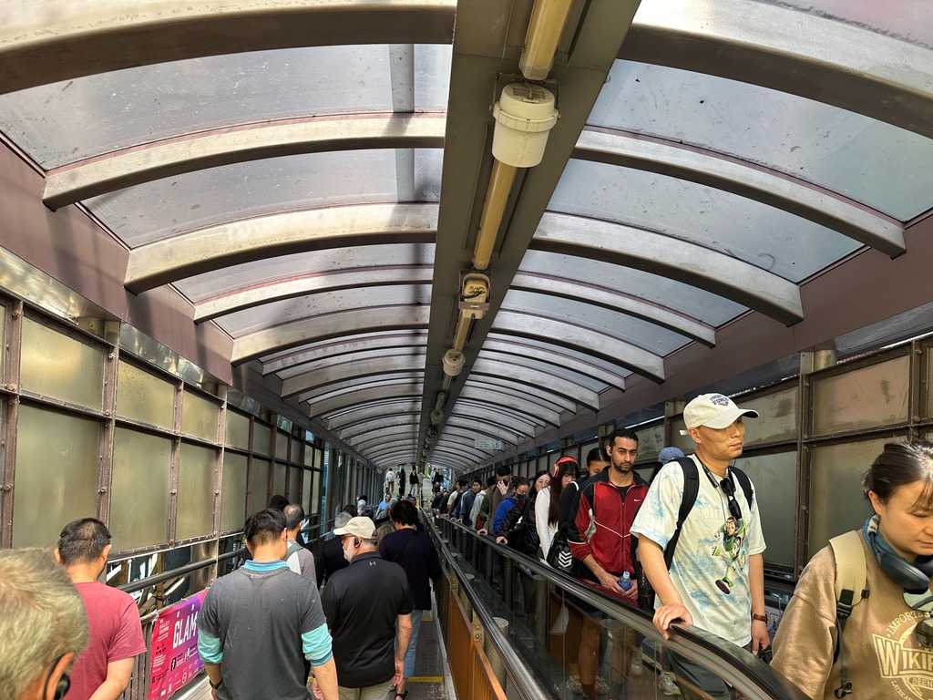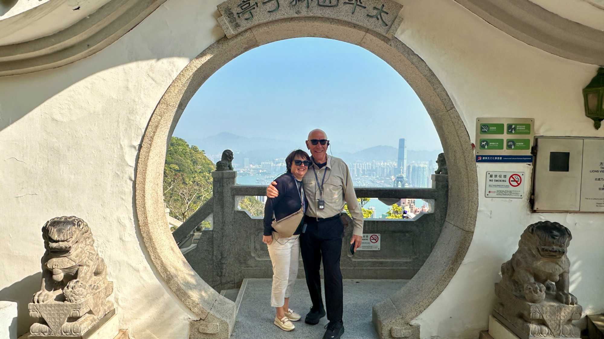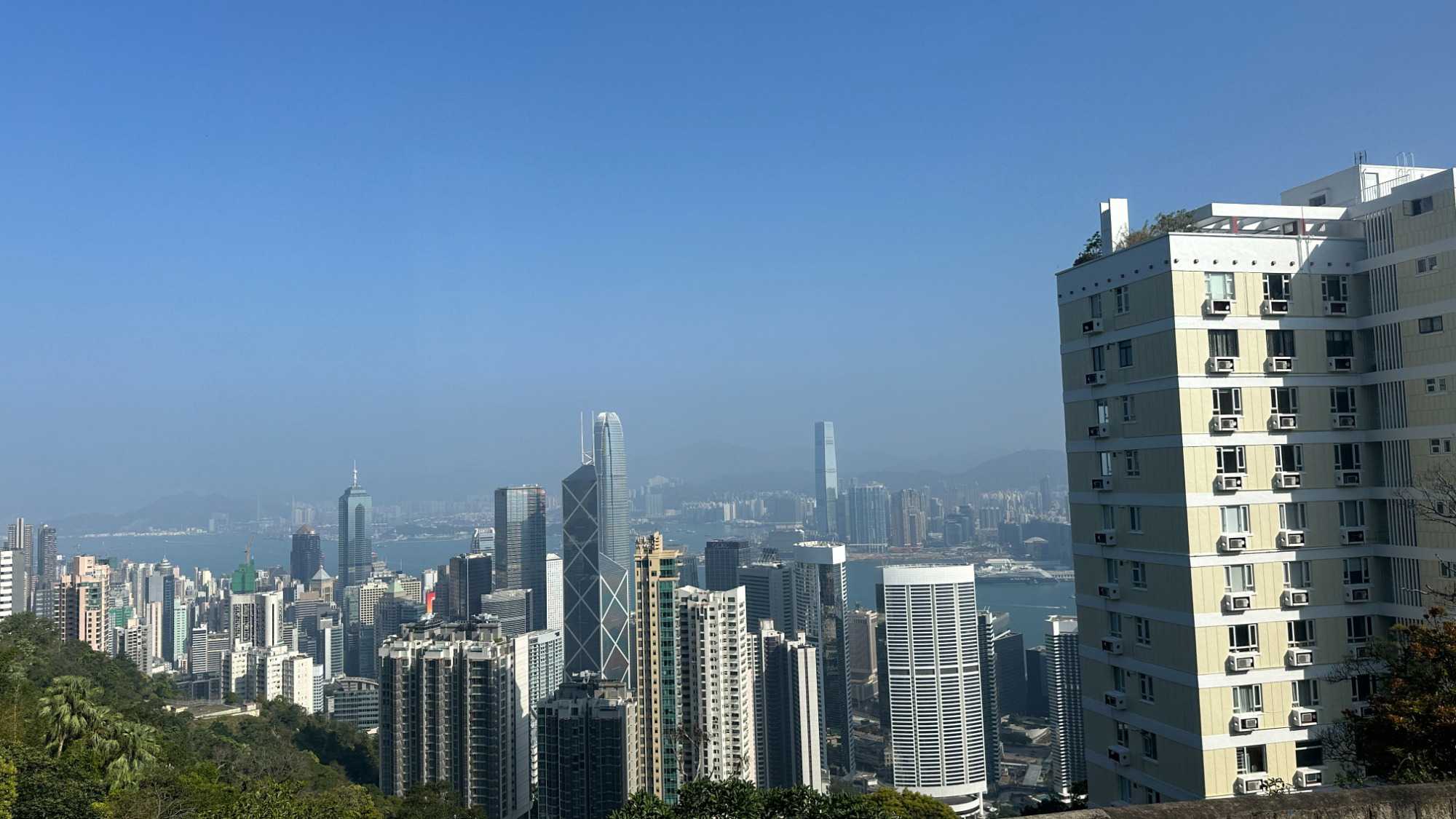 Pendant que Wallace nous entretient, nous sommes surtout impressionnés par le trajet, ou je devrais plutôt dire, l’ascension en autocar qui nous mène droit au sommet de Victoria Peak, perché à 552 m sur l’île de Hong Kong. C’est ici qu’on trouve une des zones habitées les plus chères du km2, ainsi que les plus jolies résidences de la région. Avec raison, les vues sur la baie en contrebas sont tout simplement époustouflantes. Voyez par vous-mêmes les photos ci-dessous. Nous prenons la pleine mesure de la densité de population en voyant les édifices d’une quarantaine d’étages plantés comme des arbres à flanc de montagne. Il fait beau, le ciel est dégagé, nous savourons la chance que dame nature nous offre! On ne voudrait pas être ailleurs. Les caméras et appareils photos du téléphone se font allègrement. C’est toujours une excellente idée de grimper au point le plus haut lorsqu’on visite une ville pour la première fois. Cela nous situe et nous aide à nous orienter.
