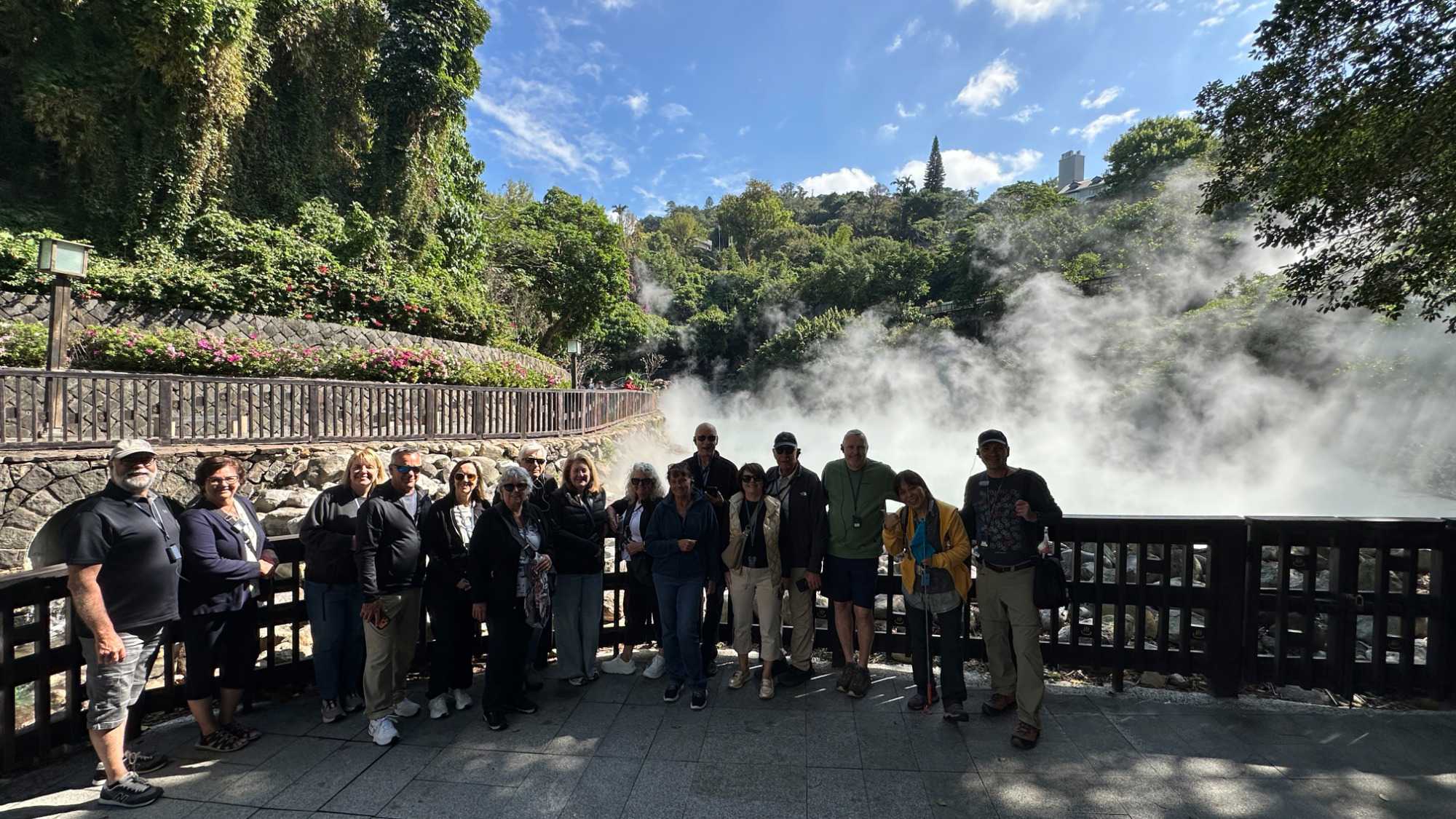 À notre arrivée au port, nous sommes chaleureusement accueillis par Zoé qui nous accompagne tout au long de cette journée riche en découvertes. Direction d’abord le quartier de Beitou, réputé pour son atmosphère paisible et son héritage thermal profondément enraciné dans la culture taïwanaise. Loin de l’agitation urbaine, nous profitons d’une agréable promenade à pied du parc de Beitou, véritable havre de verdure où les habitants viennent se ressourcer. La Vallée Thermale, enveloppée de mystérieuses vapeurs soufrées, intrigue autant qu’elle fascine, tandis que la bibliothèque écologique de Beitou, chef-d’œuvre d’architecture verte, impressionne par son intégration harmonieuse à la nature. Panneaux solaires, récupération de l’eau de pluie. La visite du musée des sources chaudes nous permet de mieux comprendre l’importance de ces bains dans la vie quotidienne et l’histoire locale.