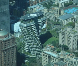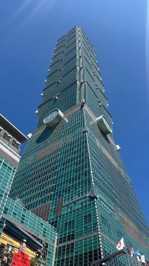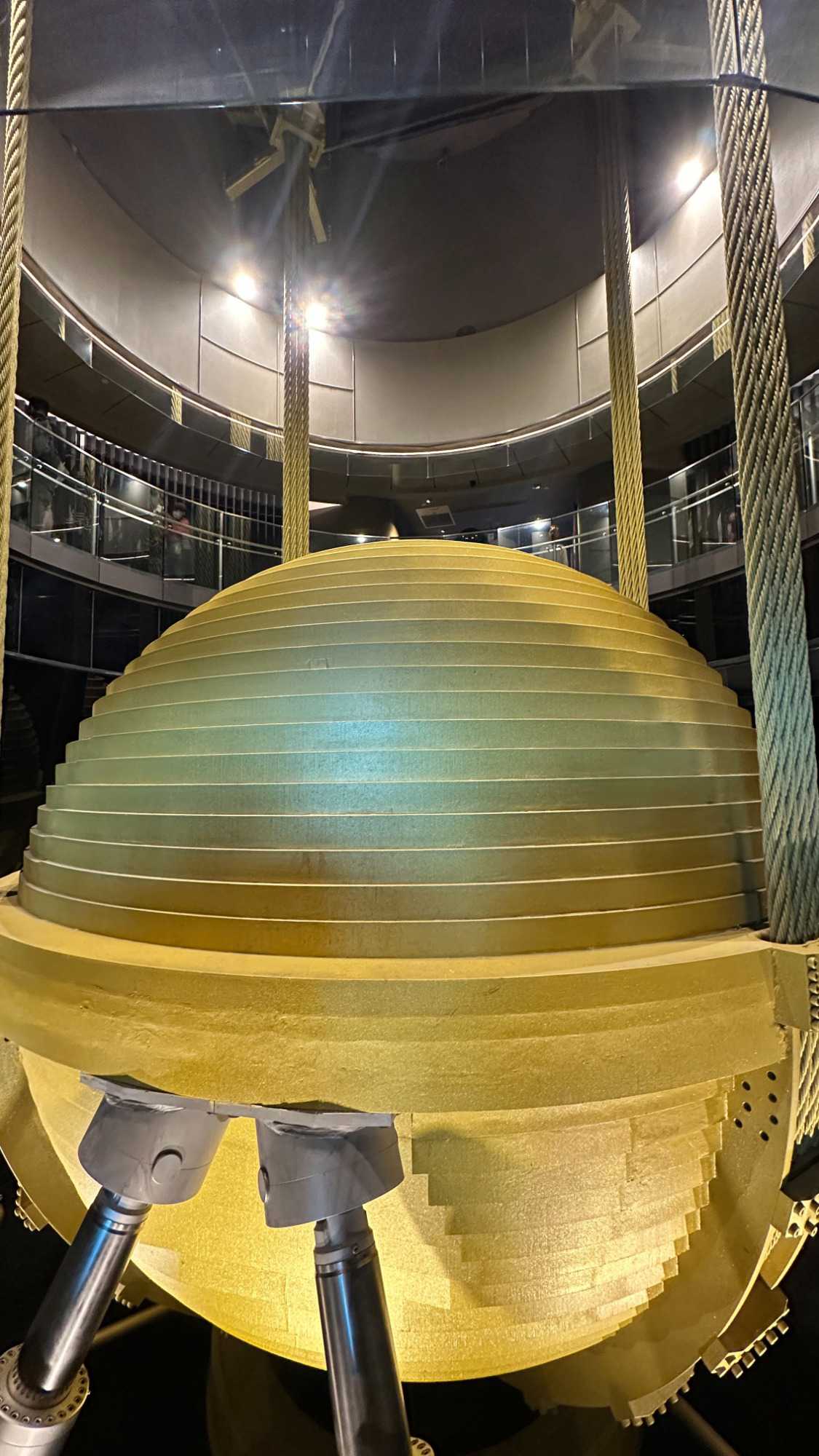 Zoé nous explique en plus, la boule amortissante de l’édifice, chef d’oeuvre d’ingéniosité: cet immense amortisseur de masse est destiné à stabiliser la tour face aux typhons et aux séismes fréquents à Taïwan. Il s’agit d’une sphère d’acier dorée de 5,5 m de diamètre pesant environ 660 tonnes, suspendue entre les 87ᵉ et 92ᵉ étages.