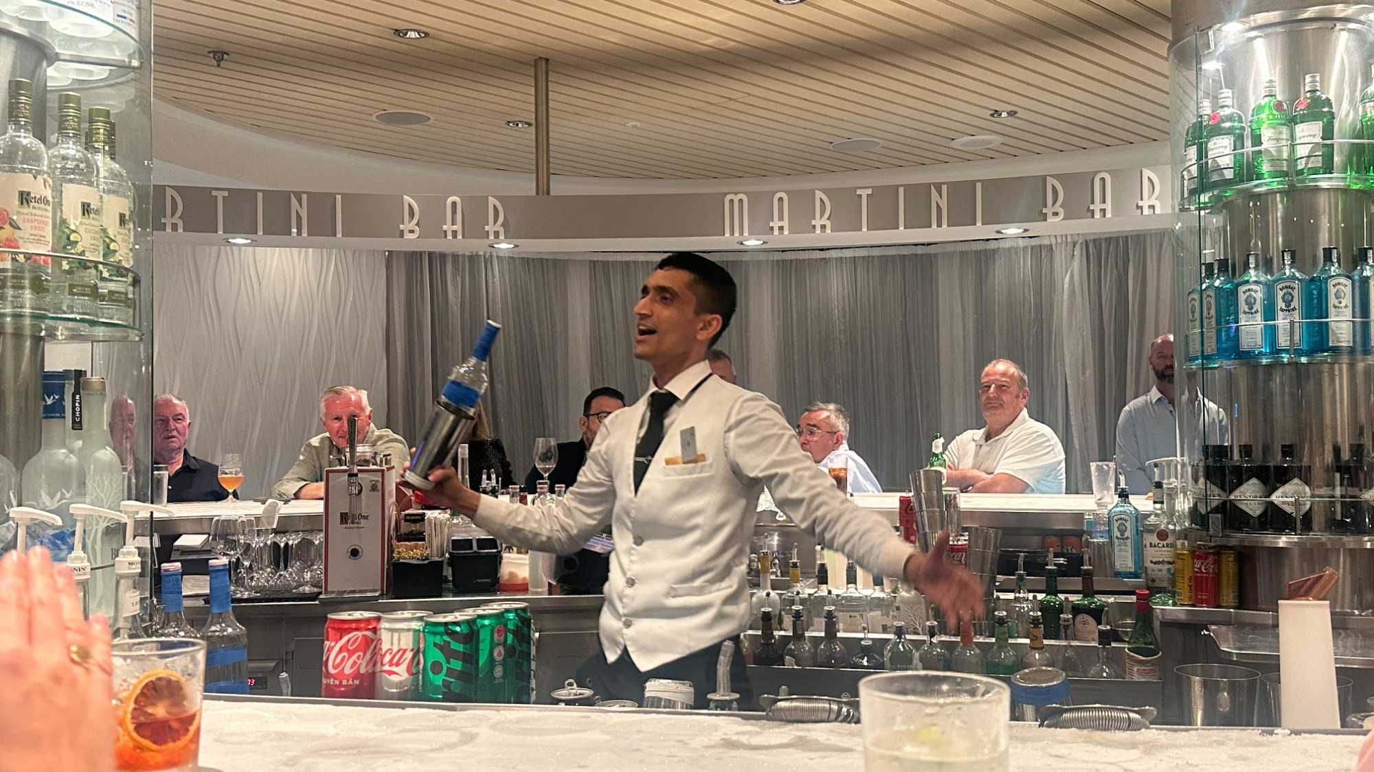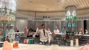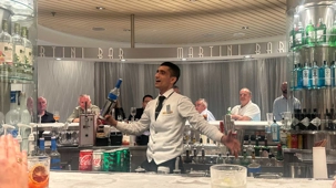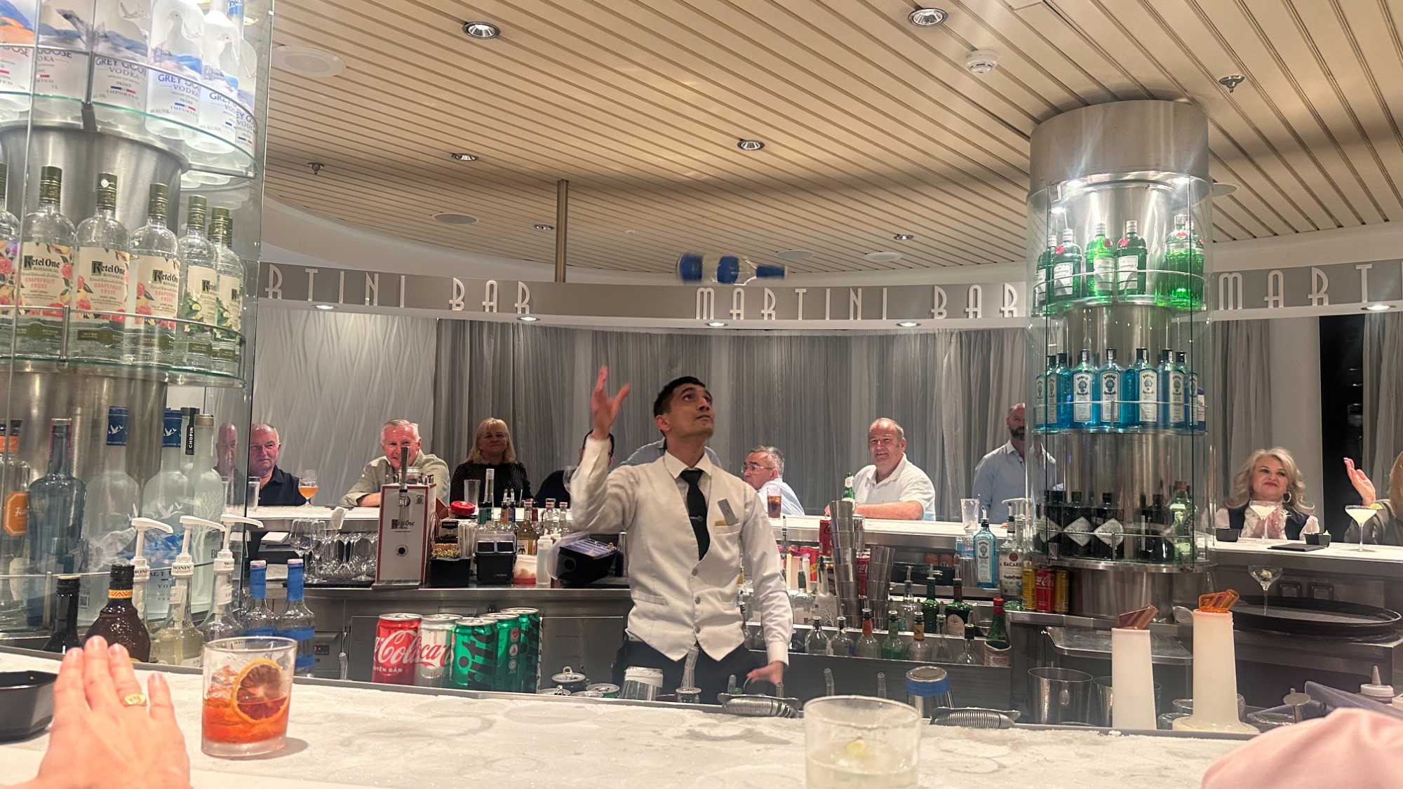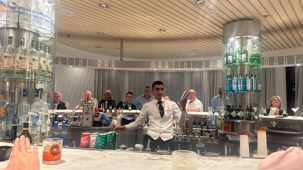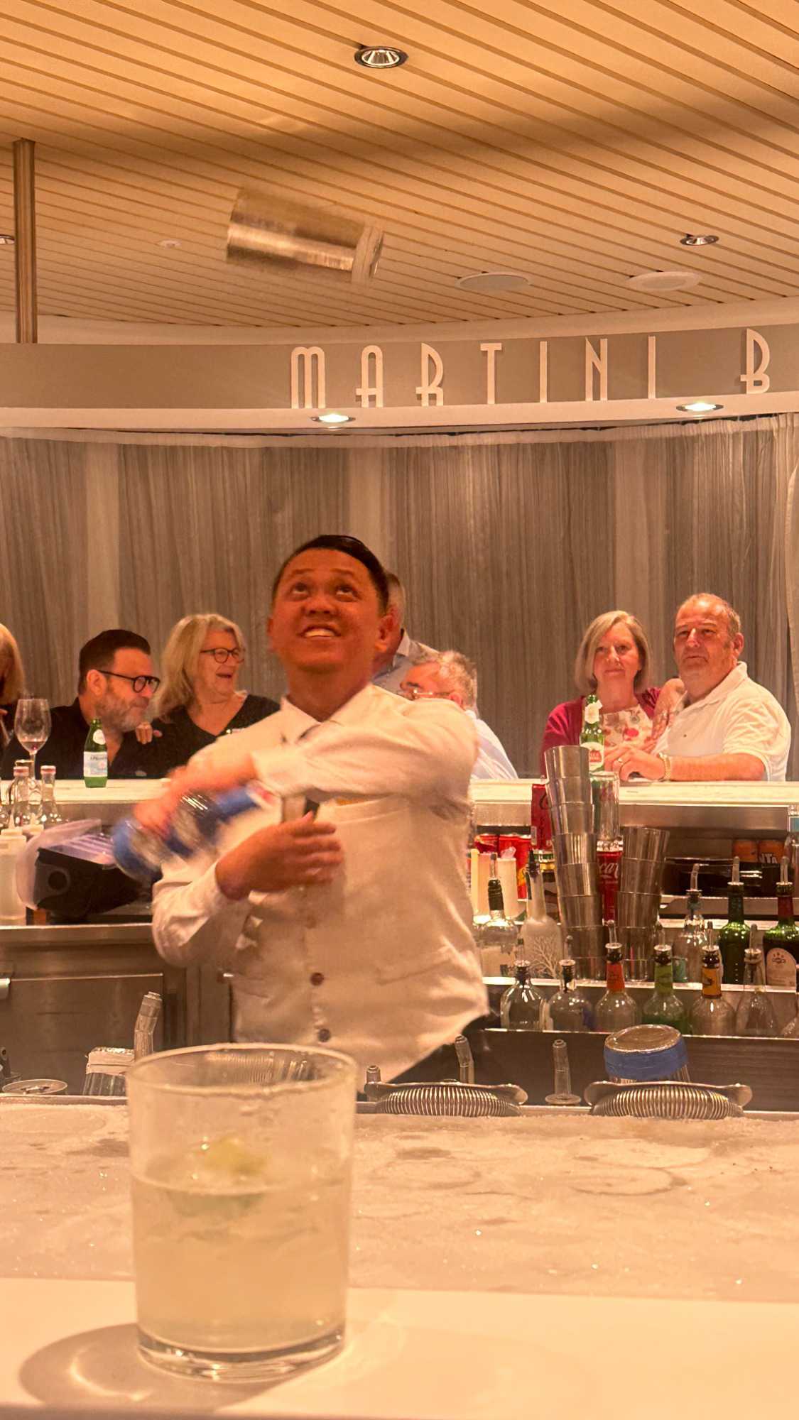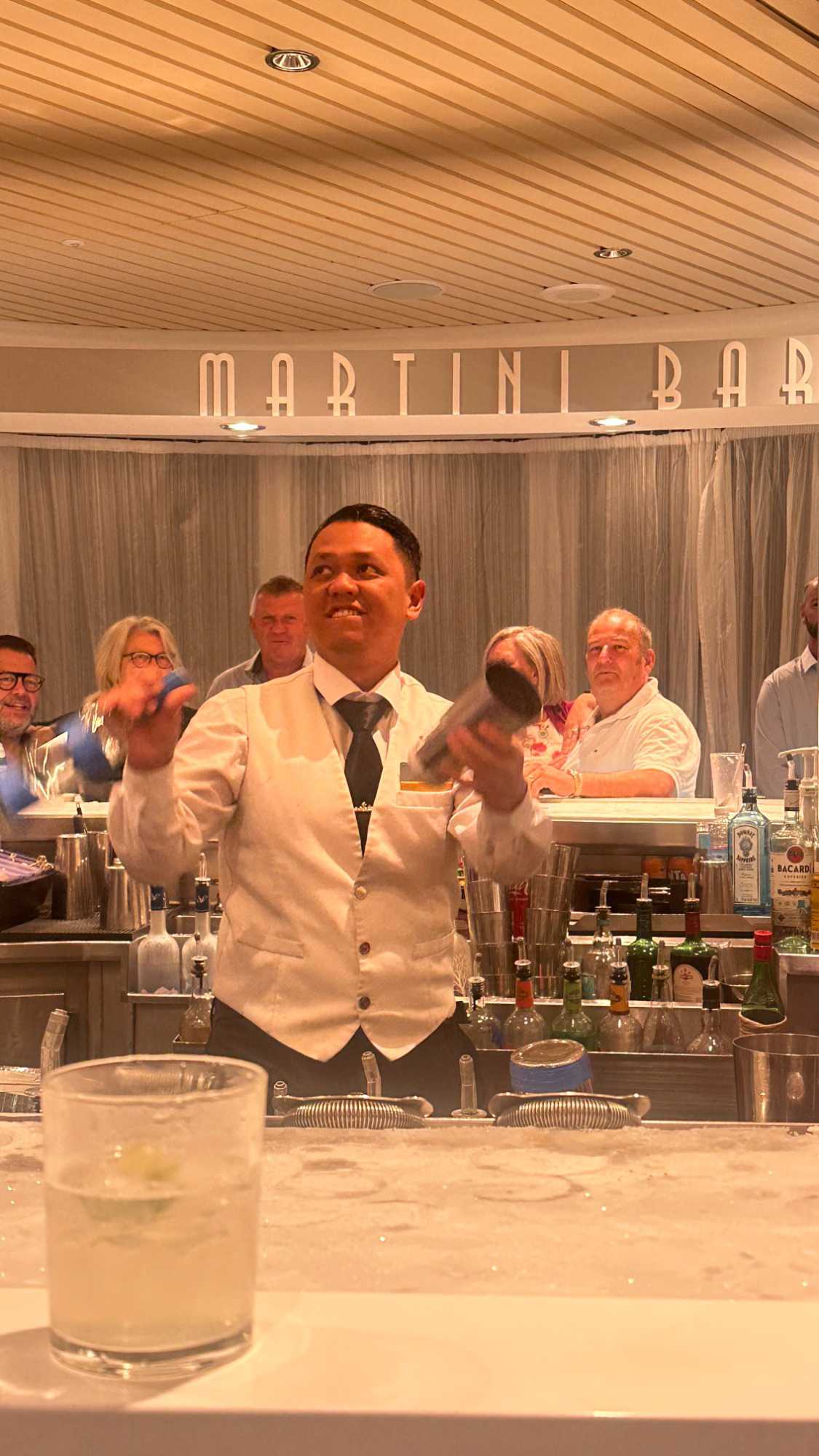 Ce soir au Théâtre du navire, c’est le spectacle Elysium interprété par la troupe d’acteurs, chanteurs, danseurs et musiciens du navire. Puis, nous avons pu capter les quelques minutes du spectacle du Martini Bar qui a lieu à chaque soir et qui suscite toujours autant d’engouement. Abiletés des barmans du Martini Bar à jongler avecl les “shakers”, les bouteilles au son rythmé de la musique du band du Millenium. À voir ! On ne s’ennuie vraiment pas sur le Millenium.
