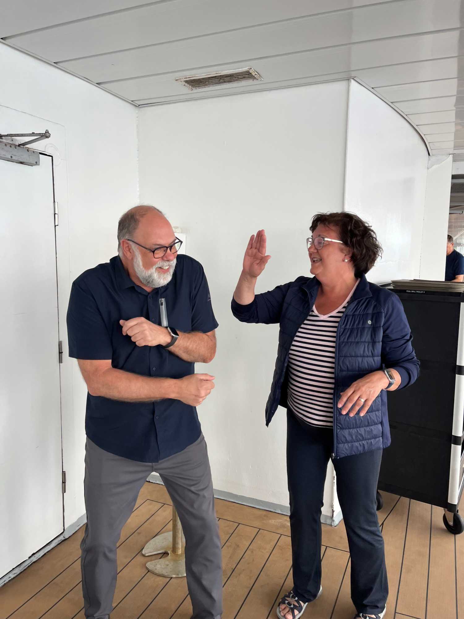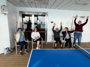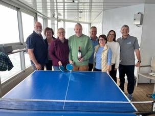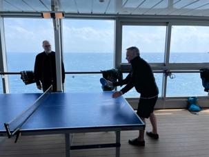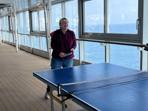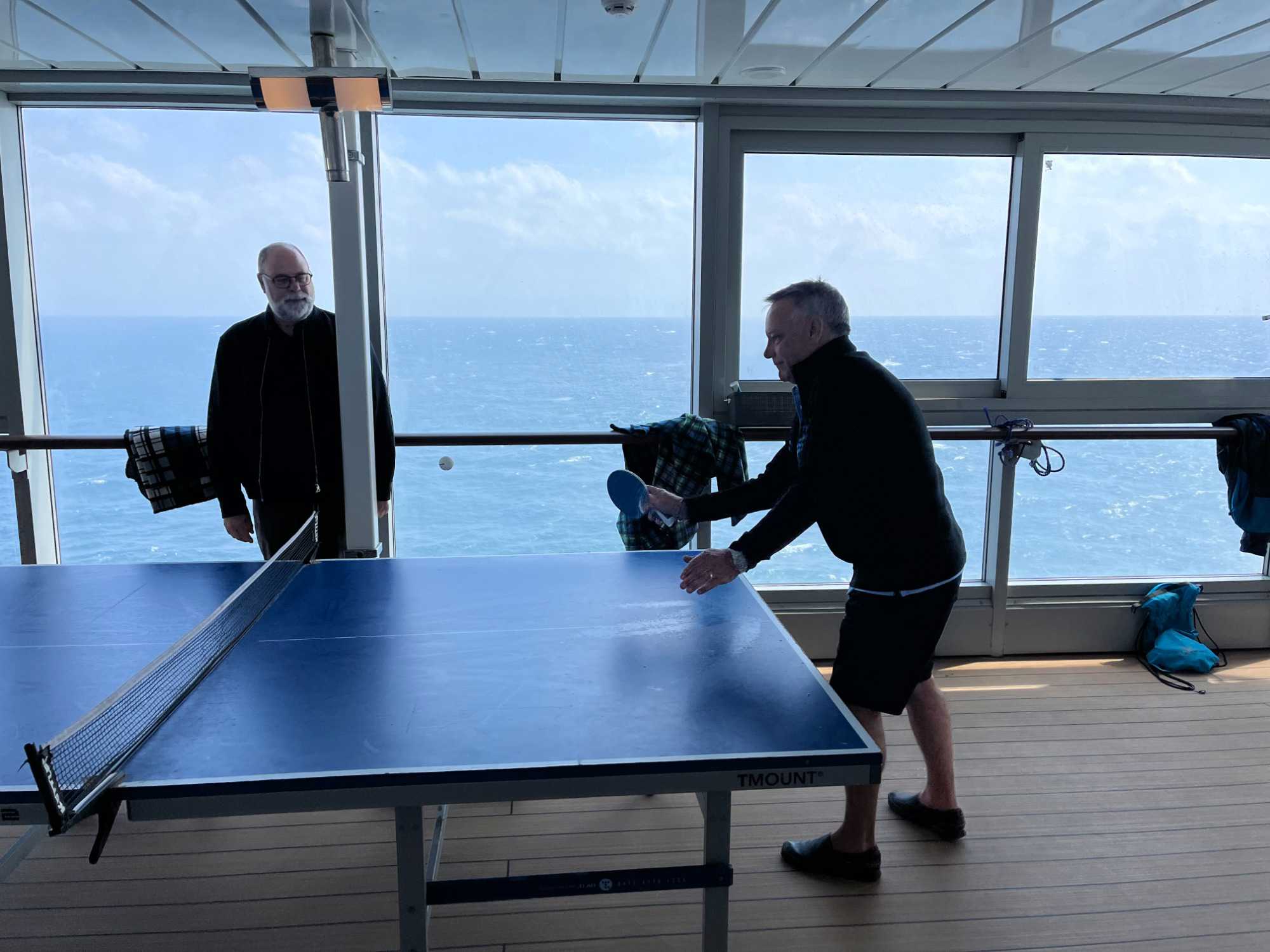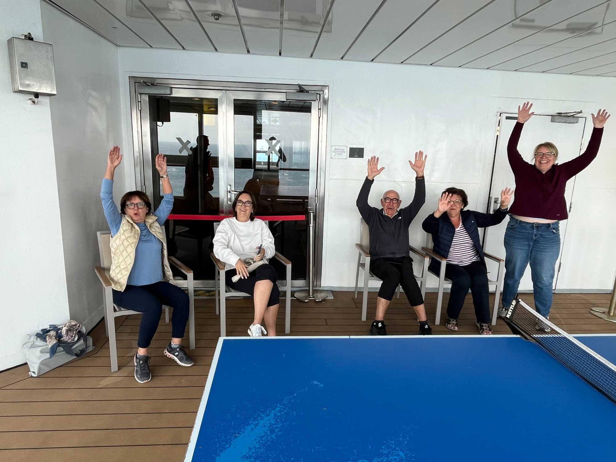 En début d’après-midi, Eric a organisé le traditionnel tournoi de ping-pong au 10è étage du navire. Nous étions 8 participants plus des spectateurs. Baptisé le ‘’Ping Pong 2026 en mer de Chine”, le tournoi nous a fait bien rire. Même les spectateurs ont fait la vague! Certains joueurs ont par contre mal digéré leur défaite: voyez sur les photos, Sylvie assez fachée après son conjoint Robert. Après les demies-finales, le combat final a opposé le couple Nathalie et Clermont. Oui, oui! Deux joueurs d’expérience et disons plutôt compétitifs. Imaginez donc que c’est Clermont qui a gagné le tournoi. Du jeu de haut niveau mesdames et messieurs! Félicitations à Clermont et bravo à tous ceux qui ont participé.