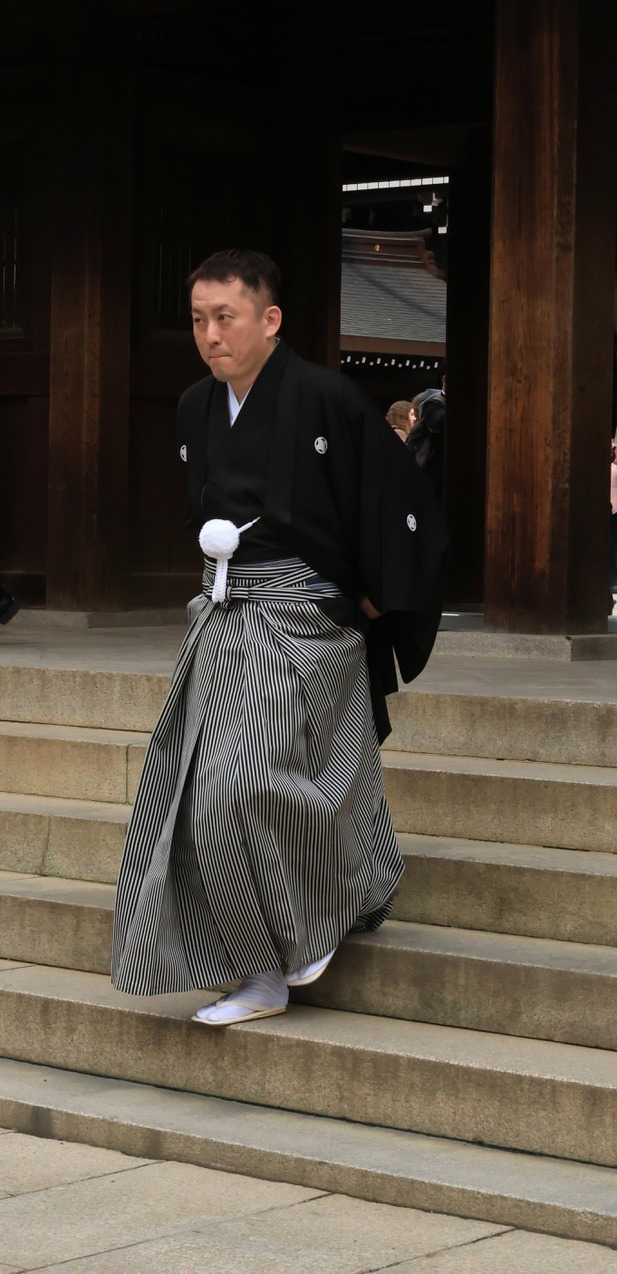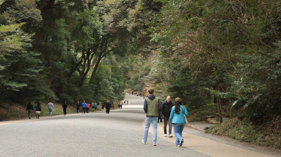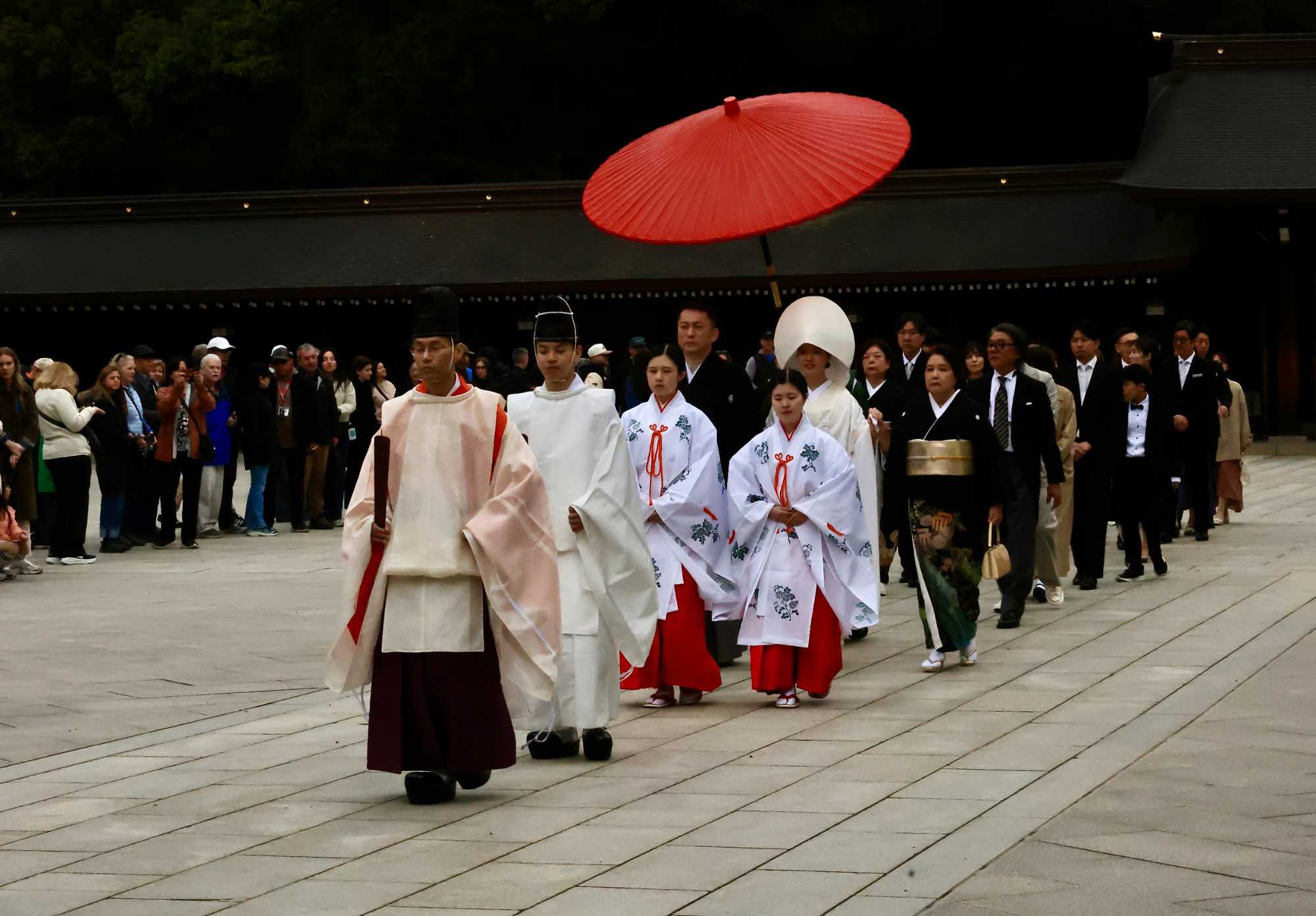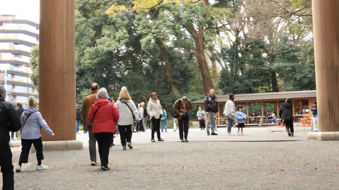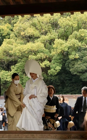 Nous nous sommes ensuite rendus au paisible Sanctuaire Meiji-jingū, véritable écrin de verdure au cœur de la capitale. Dédié à l’empereur Meiji et à l’impératrice Shōken, le sanctuaire a été inauguré en 1920, en hommage à celui qui a ouvert le Japon à la modernité lors de l’ère Meiji. Entouré d’une forêt de plus de 100 000 arbres offerts par des habitants de tout le pays, il incarne l’harmonie entre nature et spiritualité. Là, moment d’exception : au moment où nous nous apprêtions à quitter le temple, nous avons eu l’extrême chance d’assister au passage d’un mariage traditionnel japonais, procession élégante et silencieuse dont les mariés étaient vêtu des habits traditionnels, un instant rare que nous avons pu capter avec respect pour les nouveaux mariés et à notre plus grand bonheur. Wow!