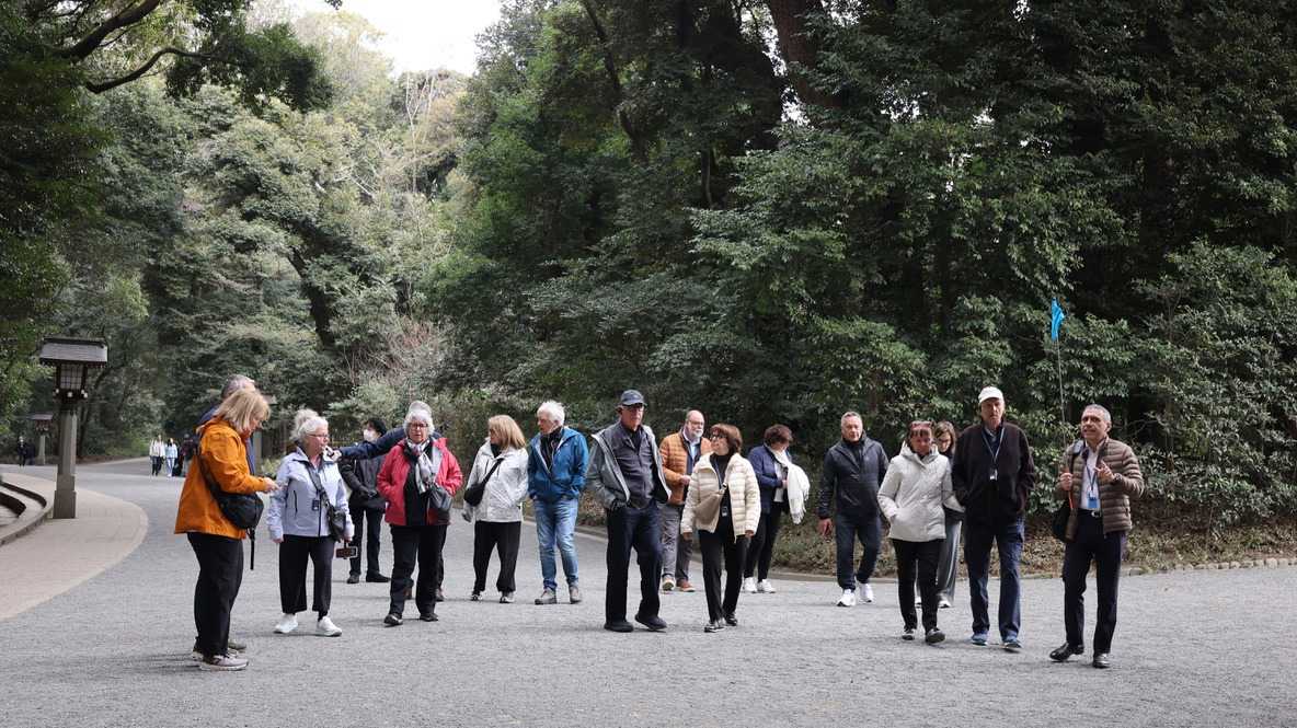 Alors, pour notre dernière journée au Japon, l’émotion est déjà présente lorsque notre groupe quitte le confortable Shiomi Prince Hotel. Une ultime journée riche en découvertes nous attend, ponctuée des précieuses explications de Jean. D’ailleurs, Jean nous réserve la surprise de faire un petit détour pour longer les abords du majestueux Palais impérial de Tokyo, dont les jardins et les douves offrent un contraste apaisant avec l’effervescence de la ville, avant de passer par le parlement d’où nous avons pu apercevoir le cortège des voitures dignitaires des dirigeants de l’Indonésie qui sont à Tokyo en ce moment. Puis, nous croisons le Stade olympique végétalisé de Tokyo de 2021 (eh oui, reportés en raison de la pandémie, vous vous en souvenez ?