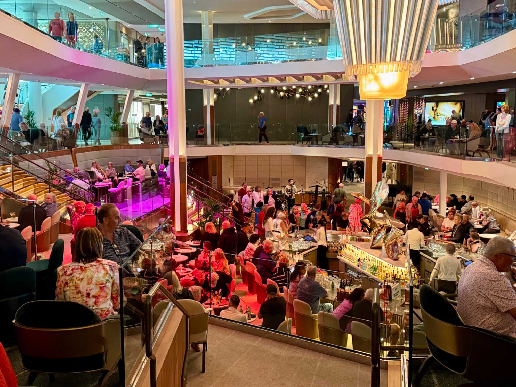 La soirée se termine pour plusieurs dans l’atrium du navire, profitant de la musique live et de l’ambiance festive qui règne à bord.