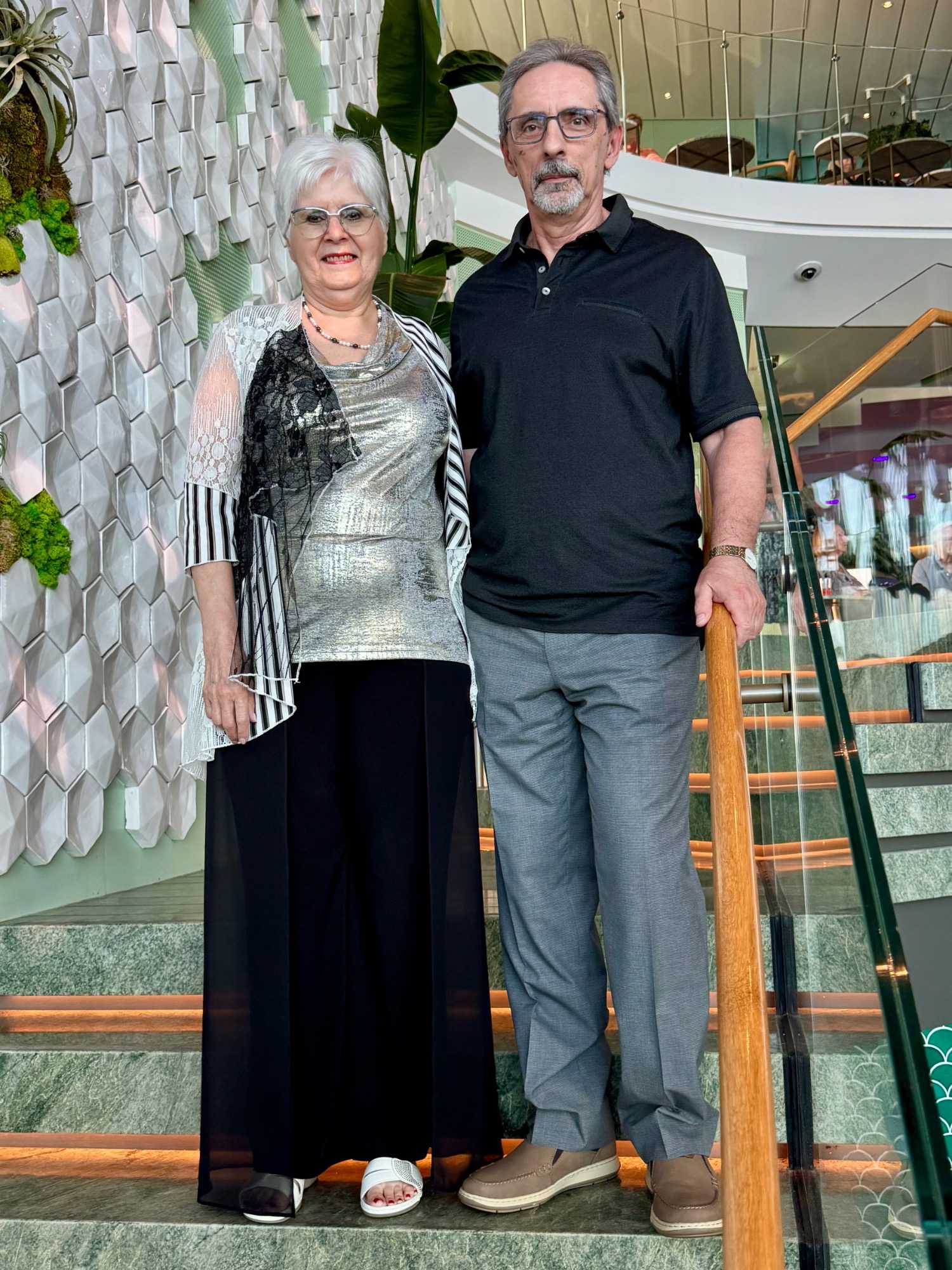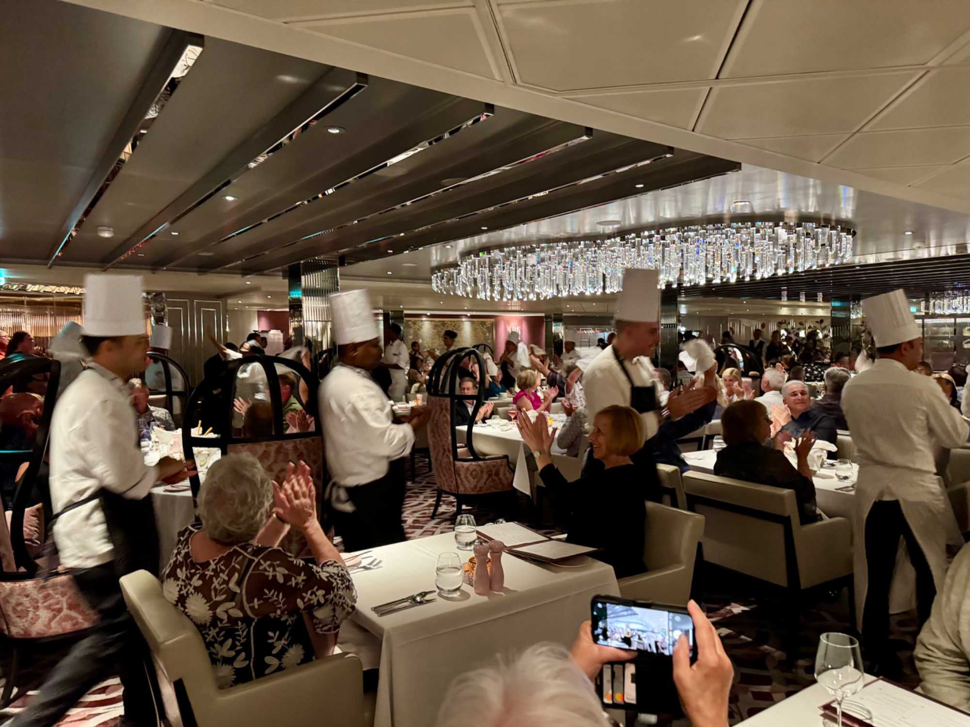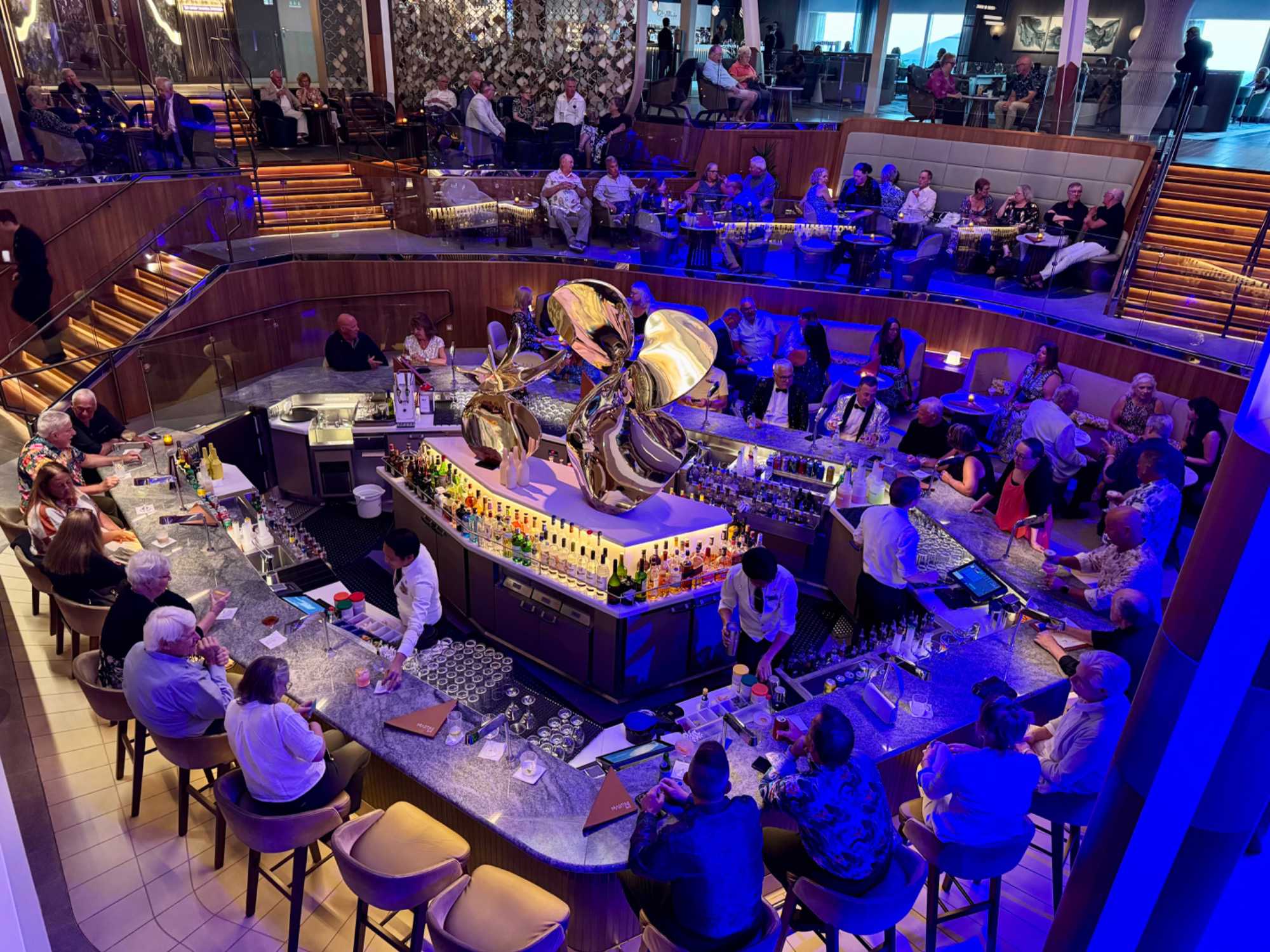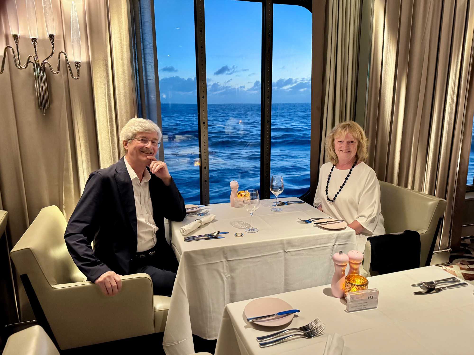 La soirée apporte ensuite une touche d’élégance particulière : c’est la soirée chic du capitaine, notre deuxième soirée élégante à bord. Les voyageurs se prêtent au jeu avec enthousiasme : les dames sont resplendissantes, les hommes impeccables. La fête bat son plein et la joie flotte dans l’air. Nous immortalisons le moment par une séance photo dans le majestueux escalier menant au restaurant Eden, de beaux souvenirs figés pour longtemps.