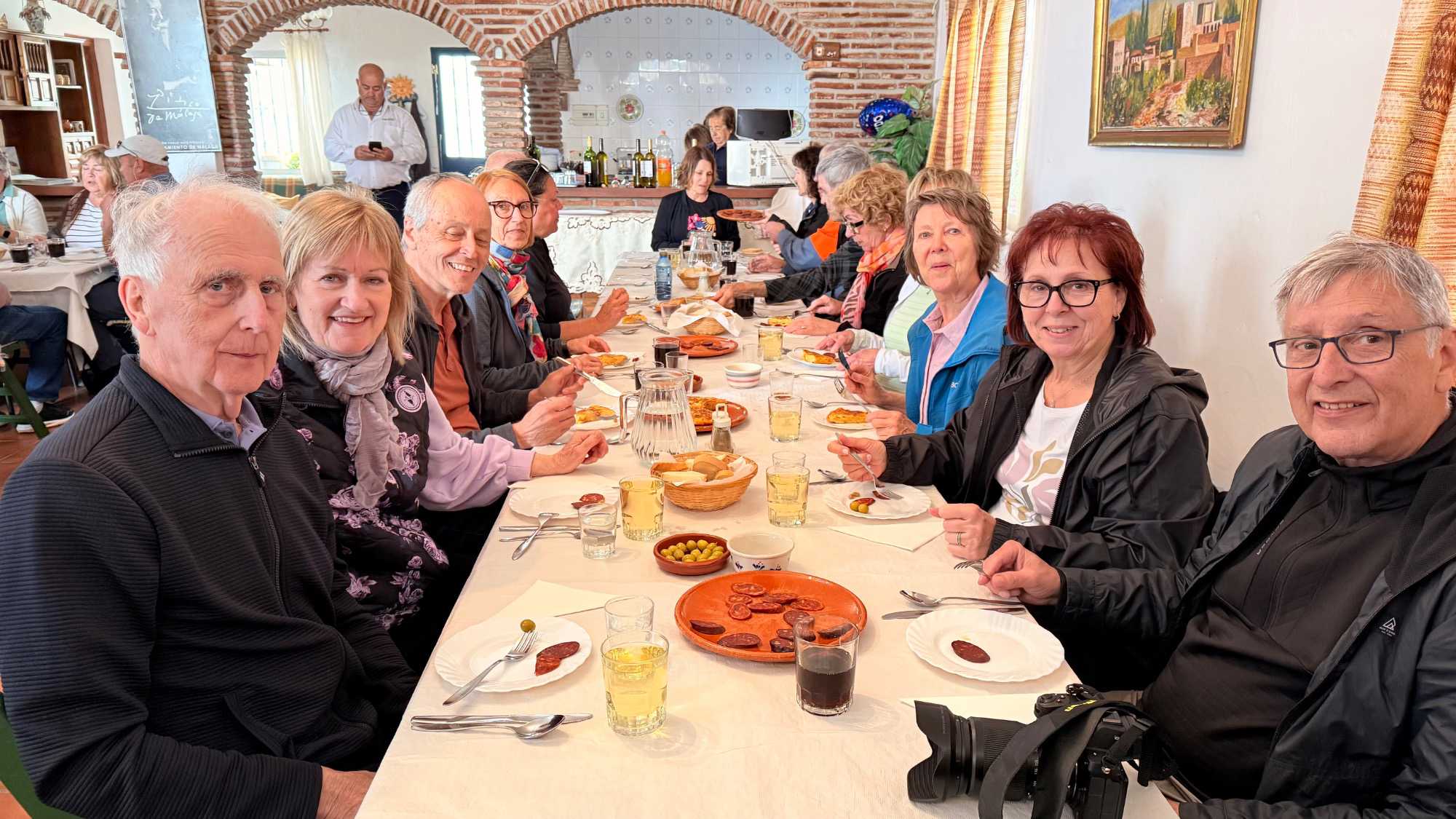 Nous commençons la journée tout en douceur dans un petit restaurant du village : un café pour certains, un chocolat chaud accompagné de délicieux churros pour d’autres. La terrasse s’anime tranquillement, les conversations s’entremêlent, les rires apparaissent déjà. La journée commence sous le signe de la bonne humeur.