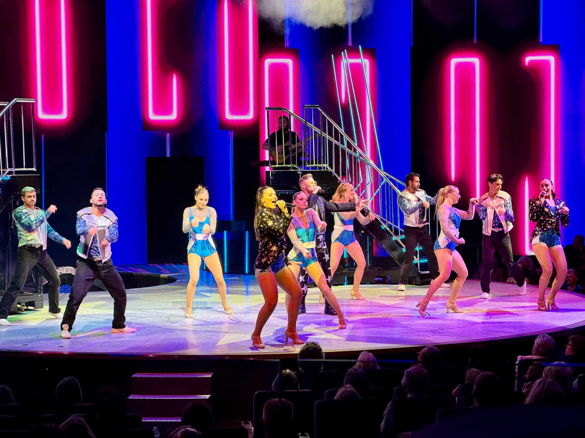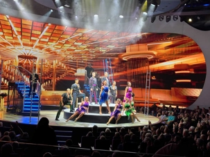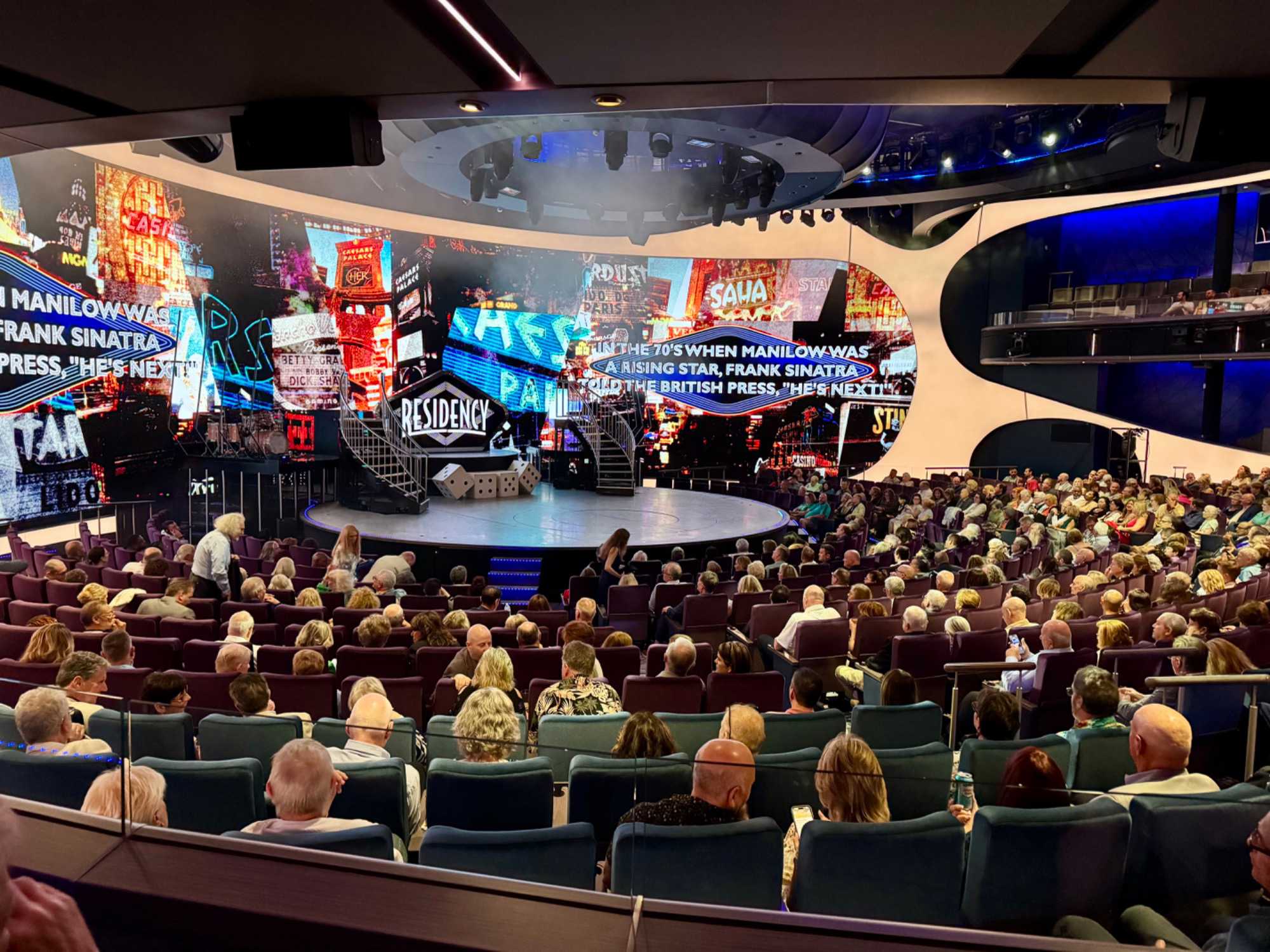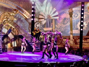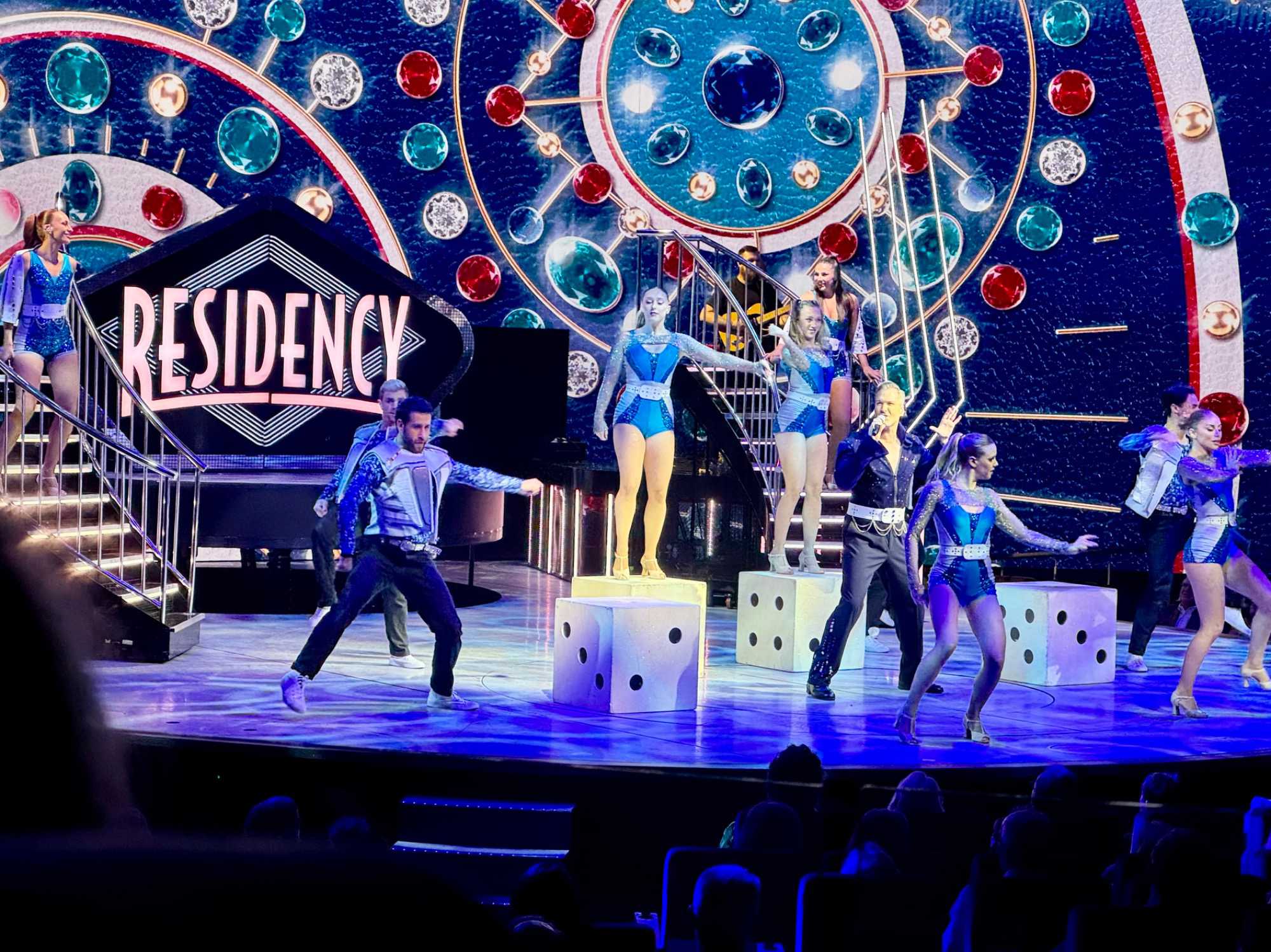 En soirée, le Capitaine nous adresse quelques mots au grand théâtre avant de laisser place au spectacle « Residency » mettant en vedette une équipe de chanteurs, danseurs et d’excellents musiciens. Cette production musicale énergique est inspirée des célèbres résidences de Las Vegas. Le spectacle rend hommage à des artistes emblématiques tels qu’Elvis Presley, Lady Gaga, Cher, U2, Bruno Mars et Céline Dion à travers des performances dynamiques et des projections visuelles captivantes tournées directement sur la célèbre Strip, incluant les iconiques enseignes restaurées du Neon Museum. Céline a présenté plus de 1000 spectacles à Las Vegas.