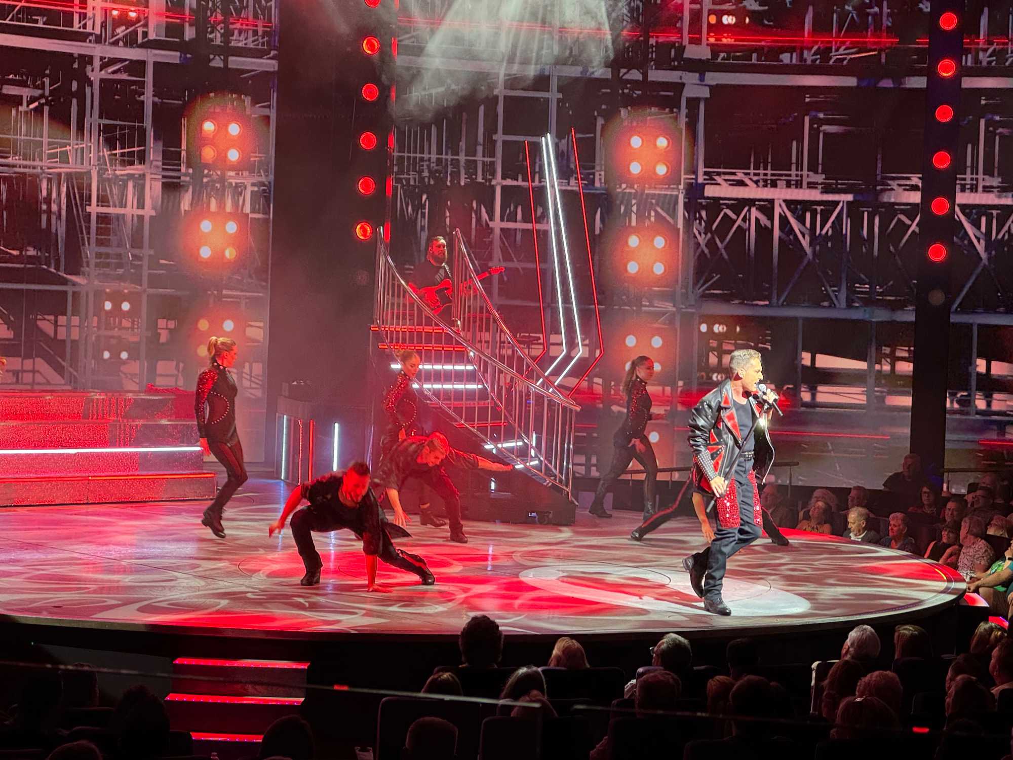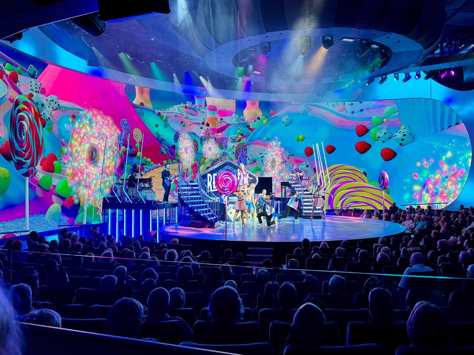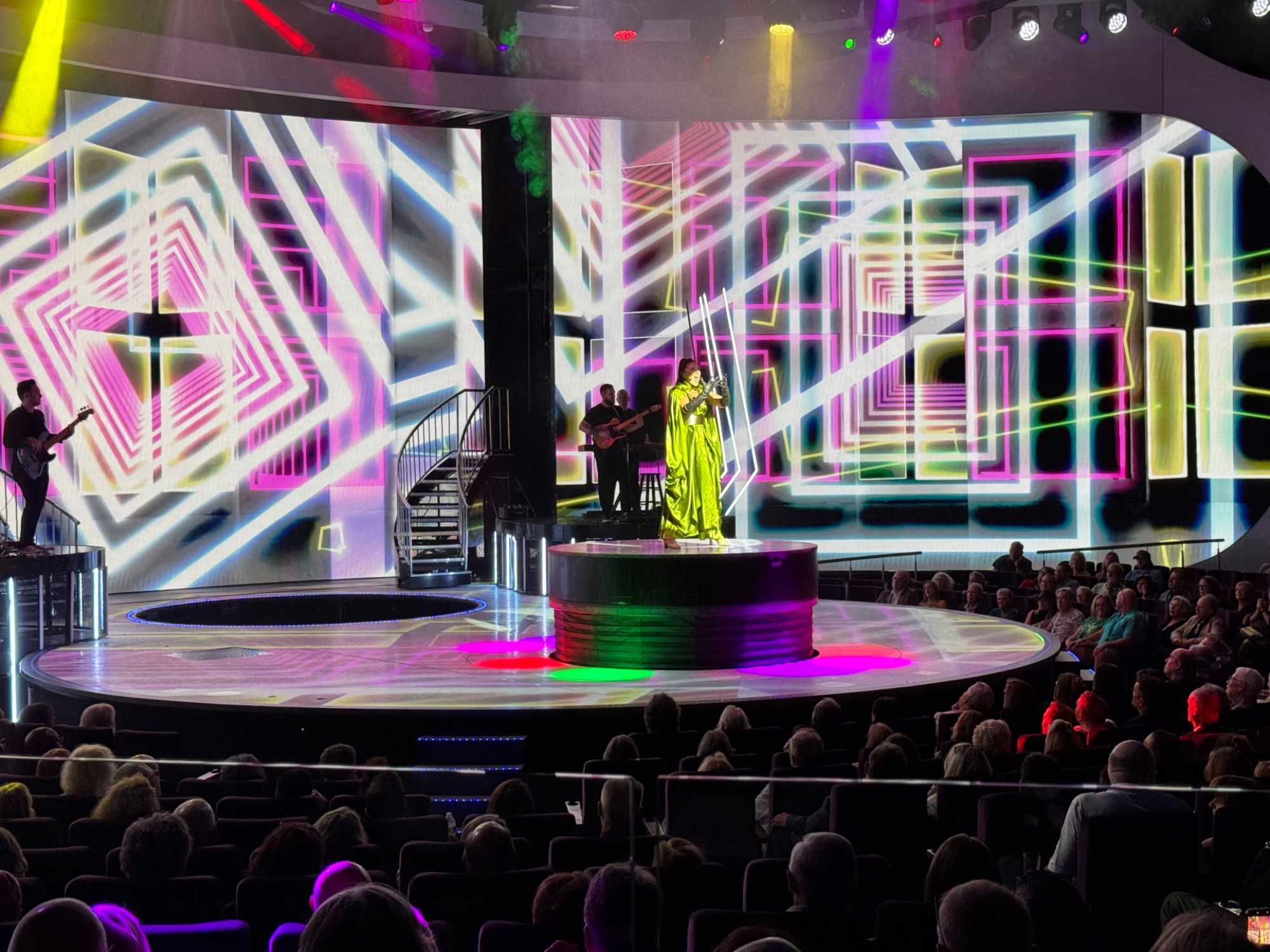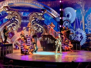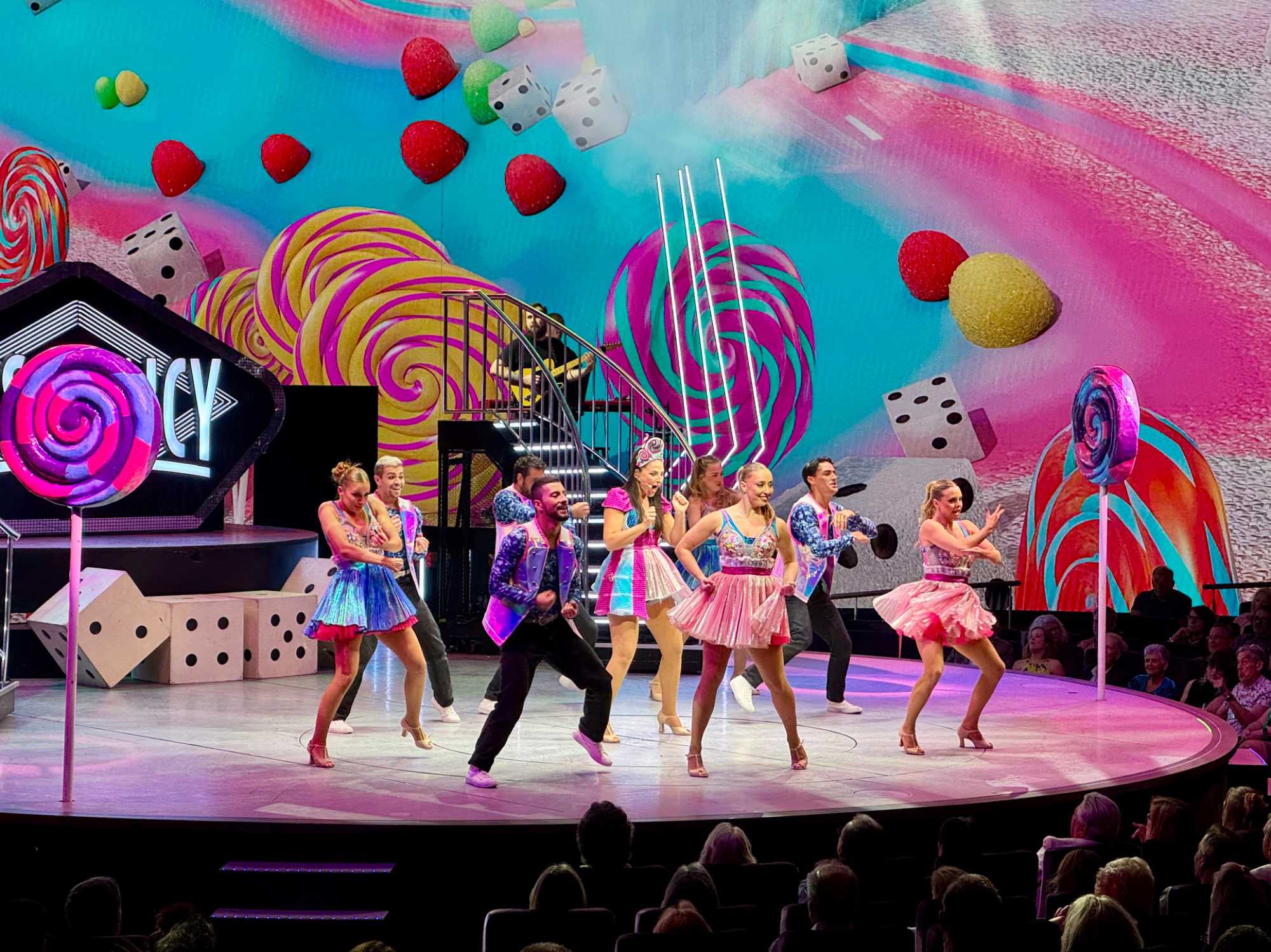 En soirée, le Capitaine nous adresse quelques mots au grand théâtre avant de laisser place au spectacle « Residency » mettant en vedette une équipe de chanteurs, danseurs et d’excellents musiciens. Cette production musicale énergique est inspirée des célèbres résidences de Las Vegas. Le spectacle rend hommage à des artistes emblématiques tels qu’Elvis Presley, Lady Gaga, Cher, U2, Bruno Mars et Céline Dion à travers des performances dynamiques et des projections visuelles captivantes tournées directement sur la célèbre Strip, incluant les iconiques enseignes restaurées du Neon Museum. Céline a présenté plus de 1000 spectacles à Las Vegas.