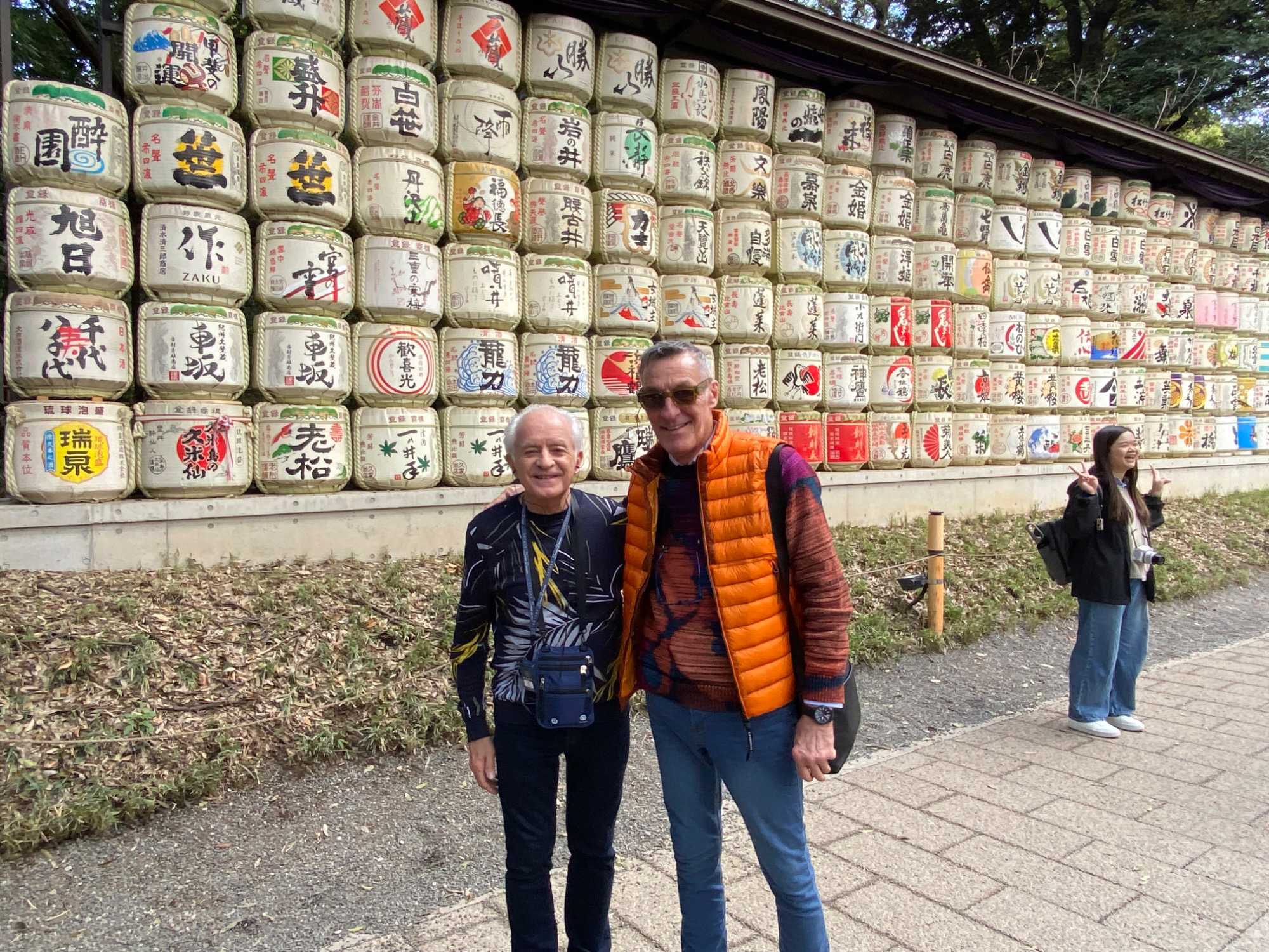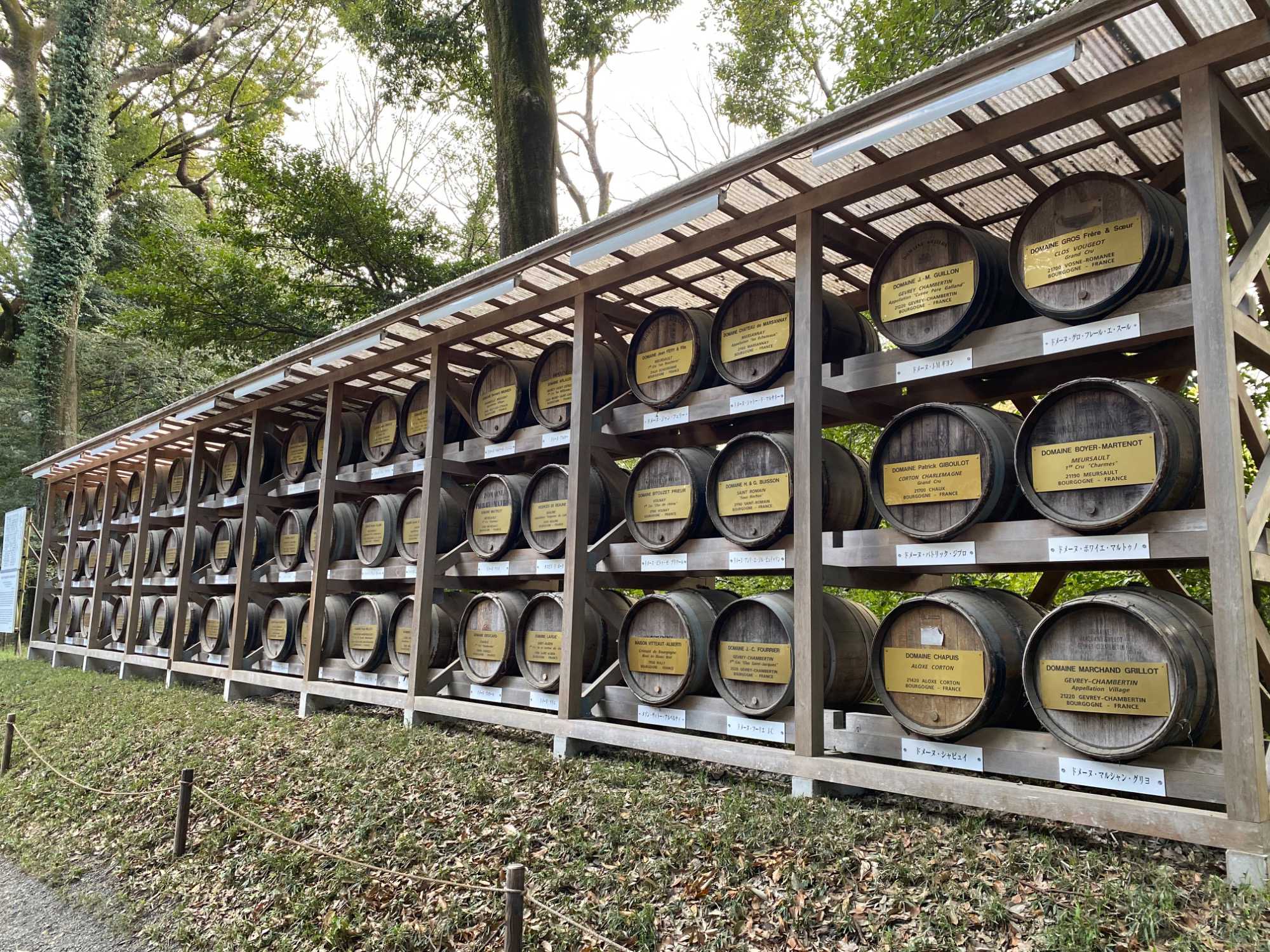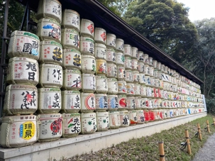 Ici, tout invite à la contemplation : l’immense torii en bois de cyprès de plus de 12 mètres sous lequel nous nous sommes inclinés avec respect selon les bons enseignements de Jean. Nous passons devant les offrandes des fûts de saké colorés offerts par des brasseries de tout le Japon de même que des barils vides de vins de grands crûs français garnissent l’allée menant au temple.