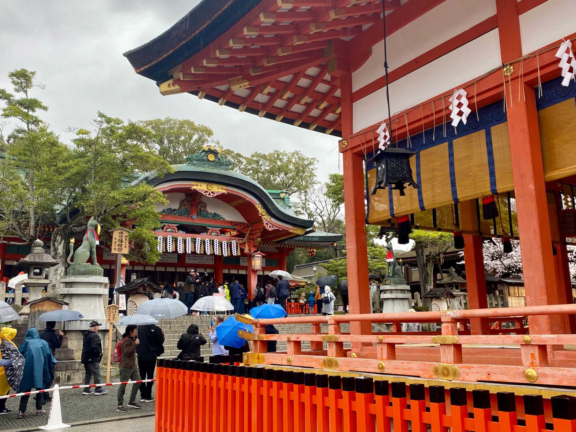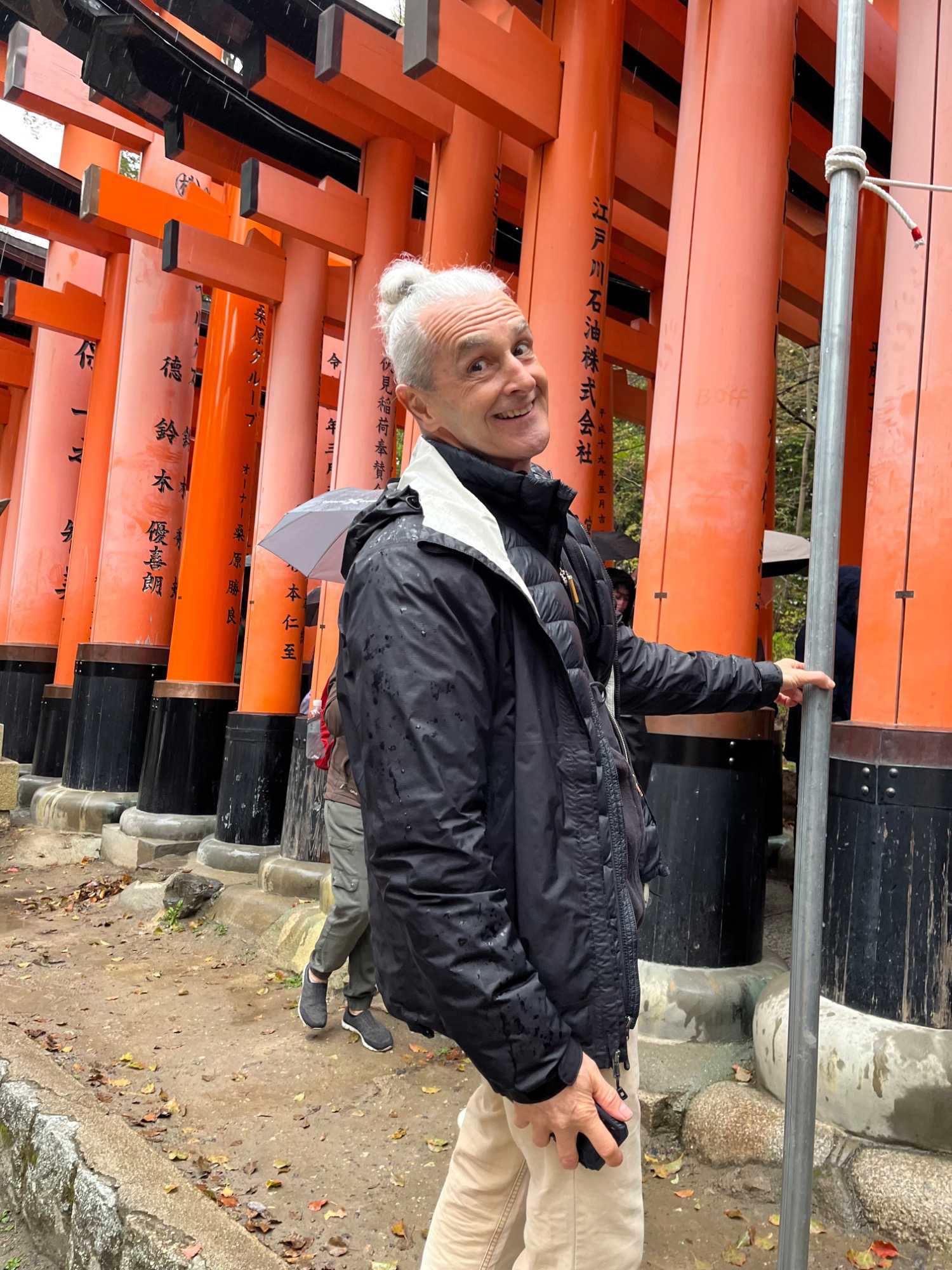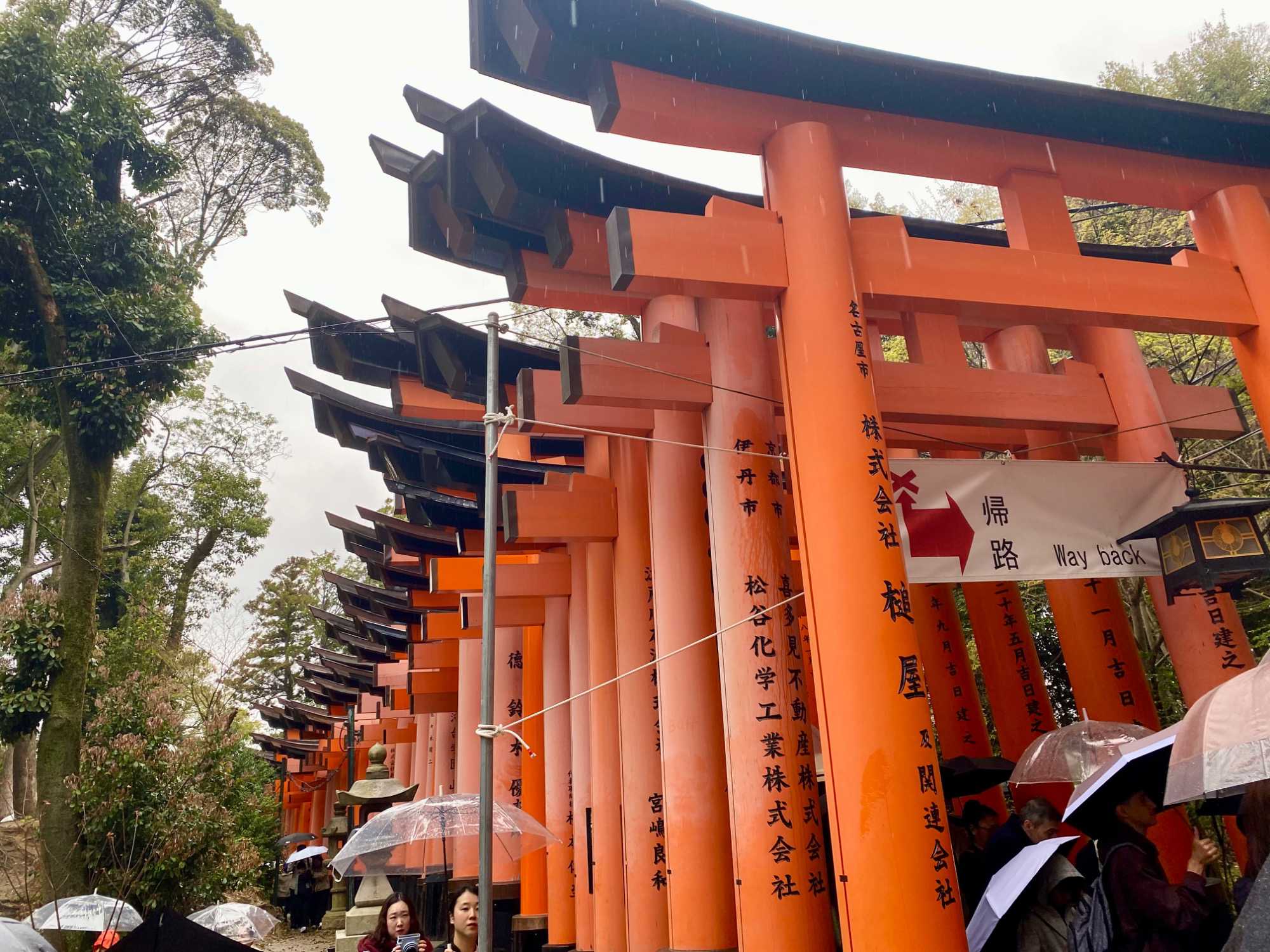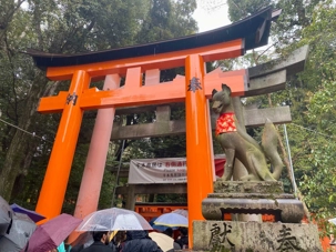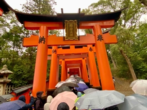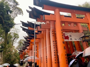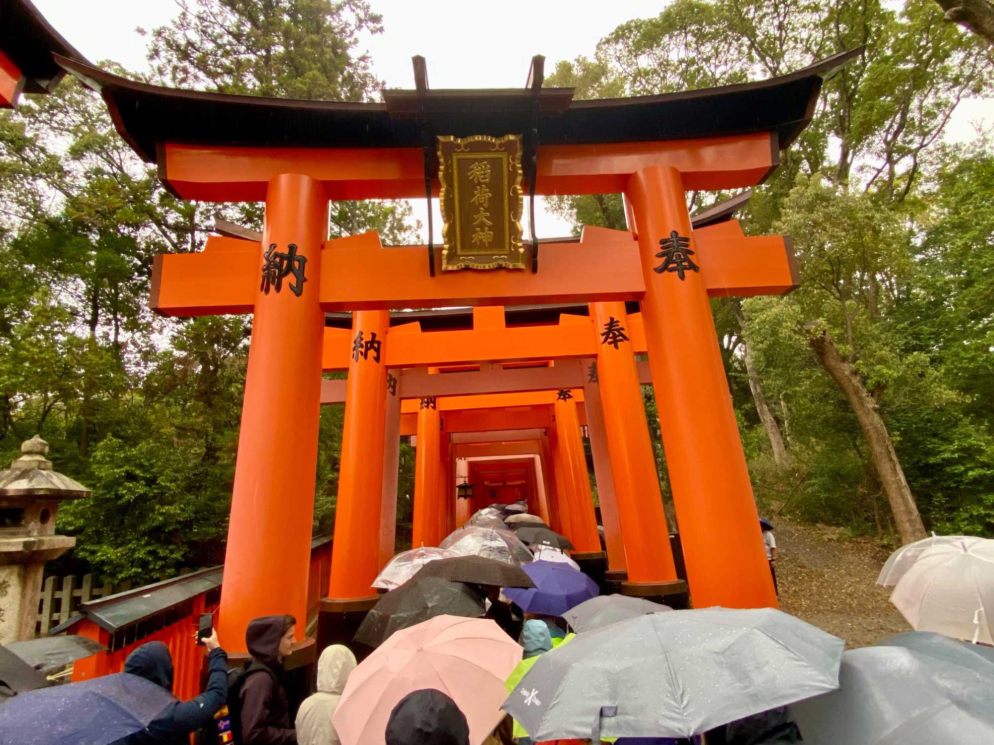 En parcourant ses sentiers bordés de 1000 torii, les visiteurs pénètrent dans un univers presque irréel, ponctué de petites statues de renards — messagers divins — et de sanctuaires secondaires nichés dans la forêt. Malheureusement, la pluie s’abat généreusement et plus nous avançons dans l’étroitesse des sentiers sous les torii; le tout mélangé à des milliers de visiteurs, ça devient difficile de se frayer un passage à travers ces sentiers qui forment un genre de tunnel. En peu de temps, un embouteillage se forme et ça ressemble à un festival du combat de parapluies!! Très intéressant; et nos yeux sont tout de même émerveillés malgré l’intervention de dame nature.