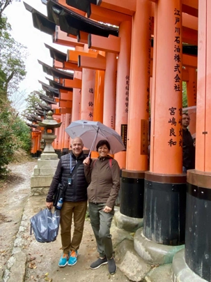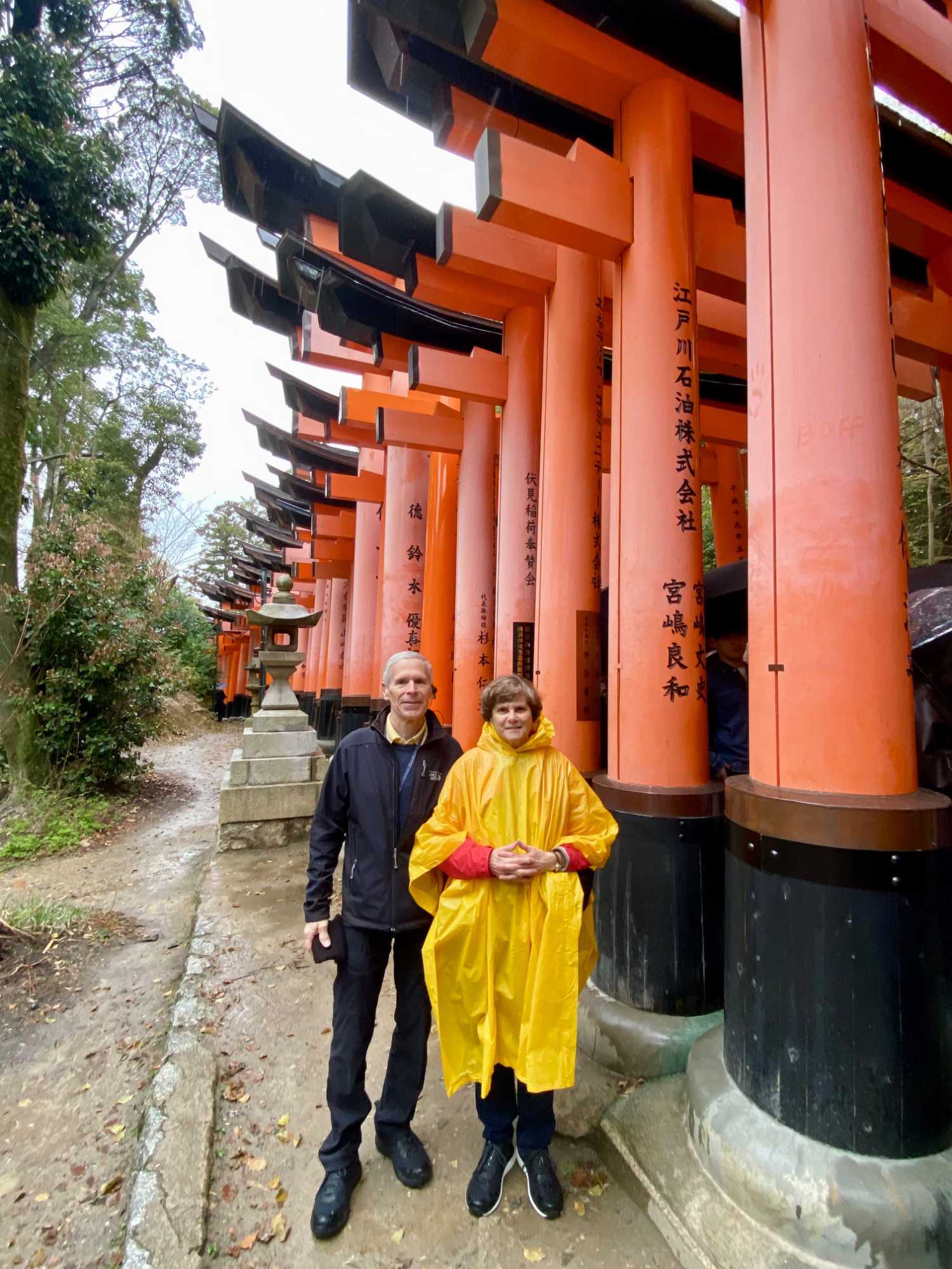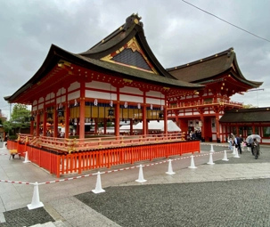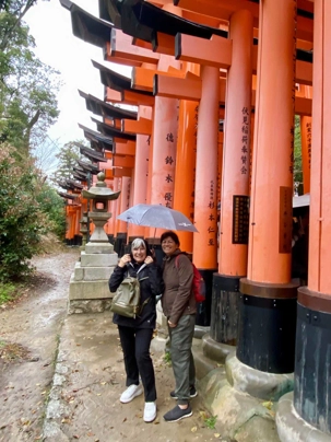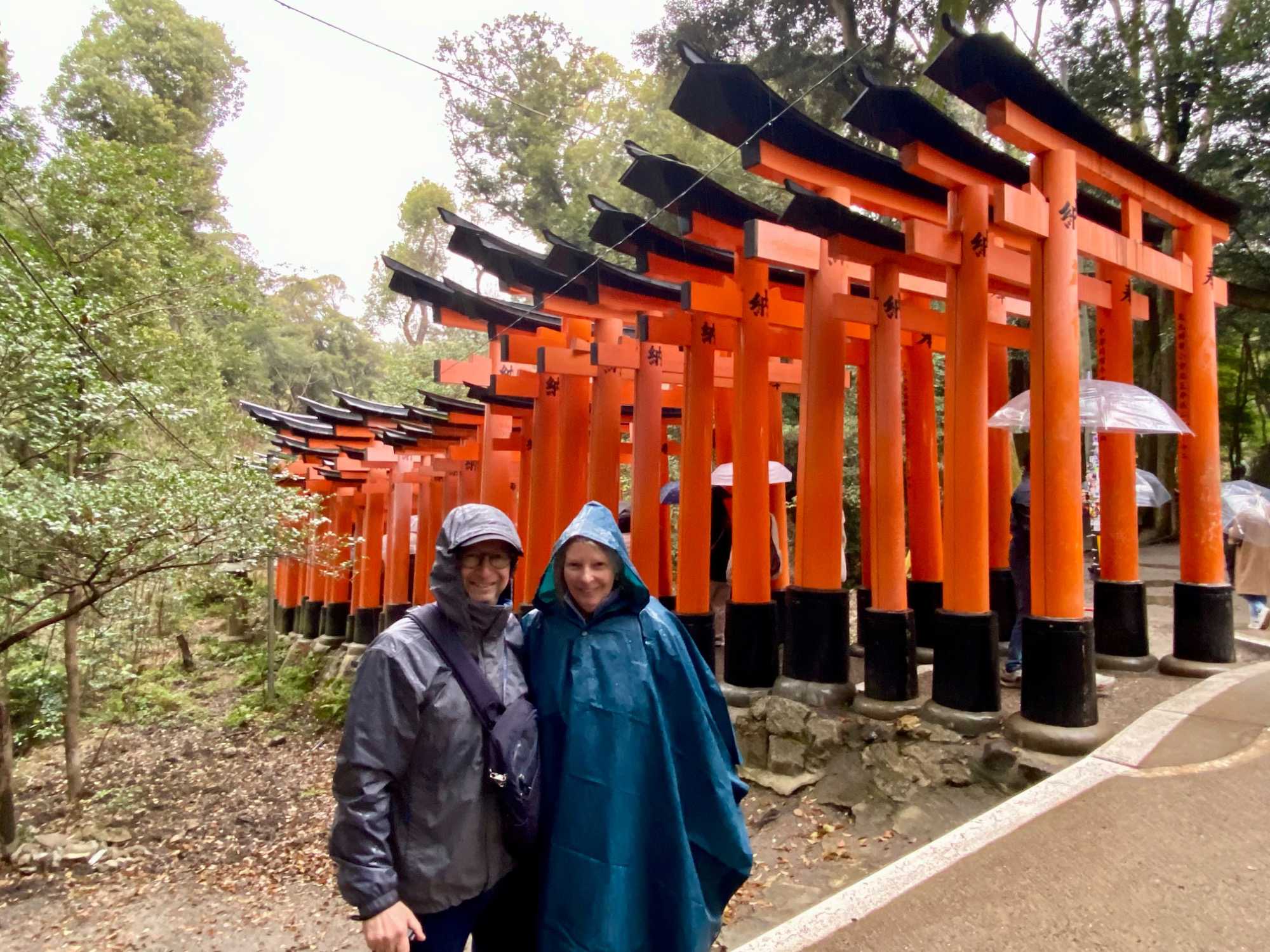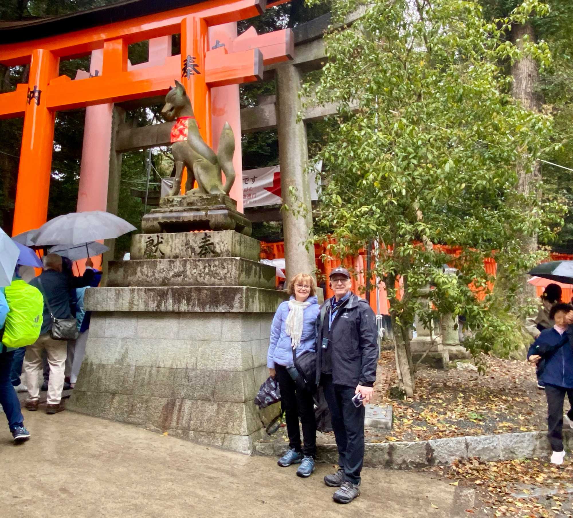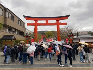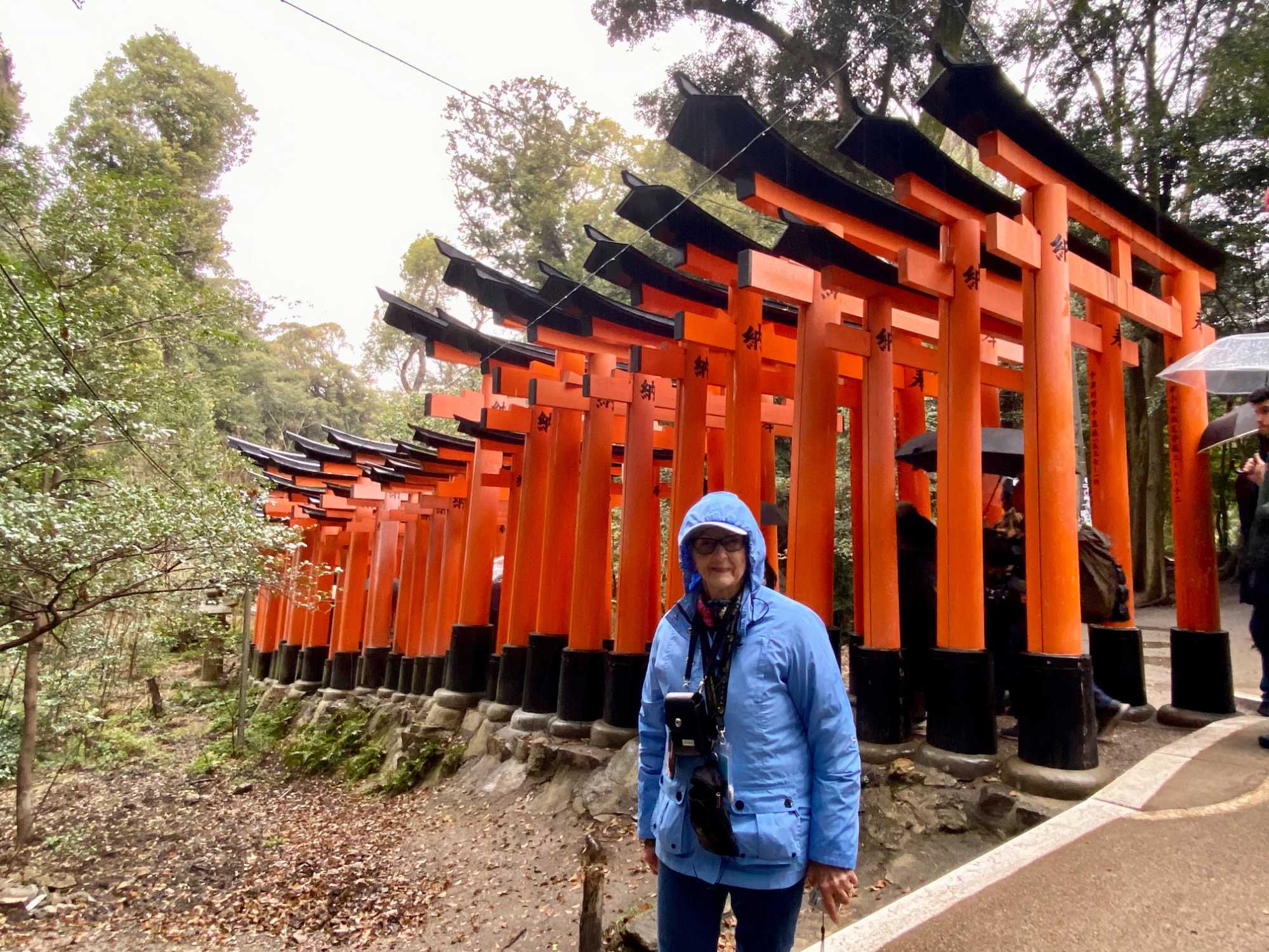 En parcourant ses sentiers bordés de 1000 torii, les visiteurs pénètrent dans un univers presque irréel, ponctué de petites statues de renards — messagers divins — et de sanctuaires secondaires nichés dans la forêt. Malheureusement, la pluie s’abat généreusement et plus nous avançons dans l’étroitesse des sentiers sous les torii; le tout mélangé à des milliers de visiteurs, ça devient difficile de se frayer un passage à travers ces sentiers qui forment un genre de tunnel. En peu de temps, un embouteillage se forme et ça ressemble à un festival du combat de parapluies!! Très intéressant; et nos yeux sont tout de même émerveillés malgré l’intervention de dame nature.