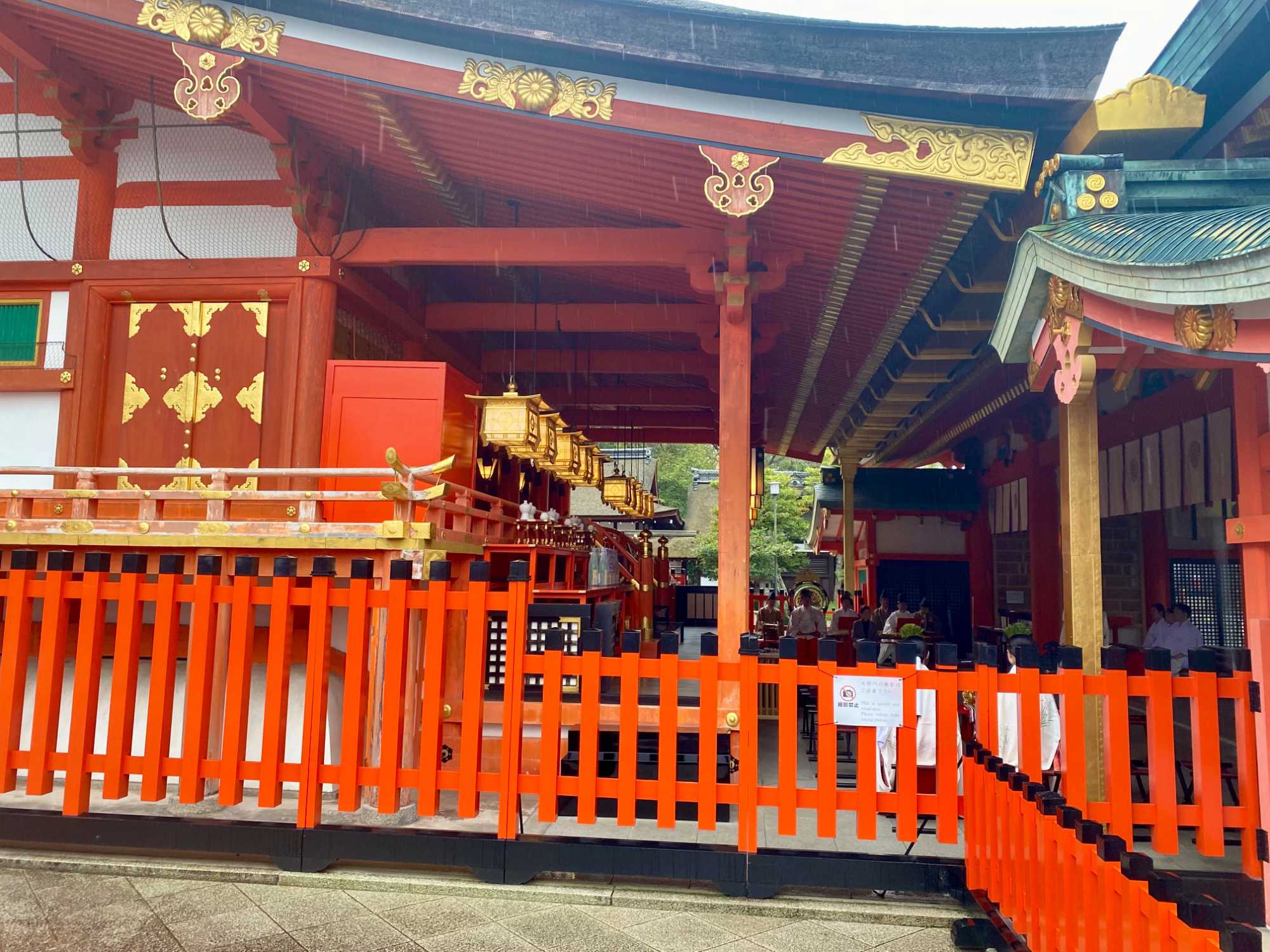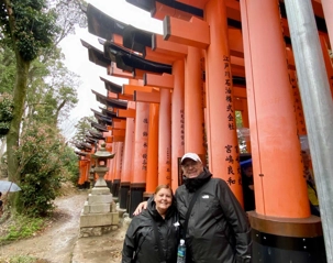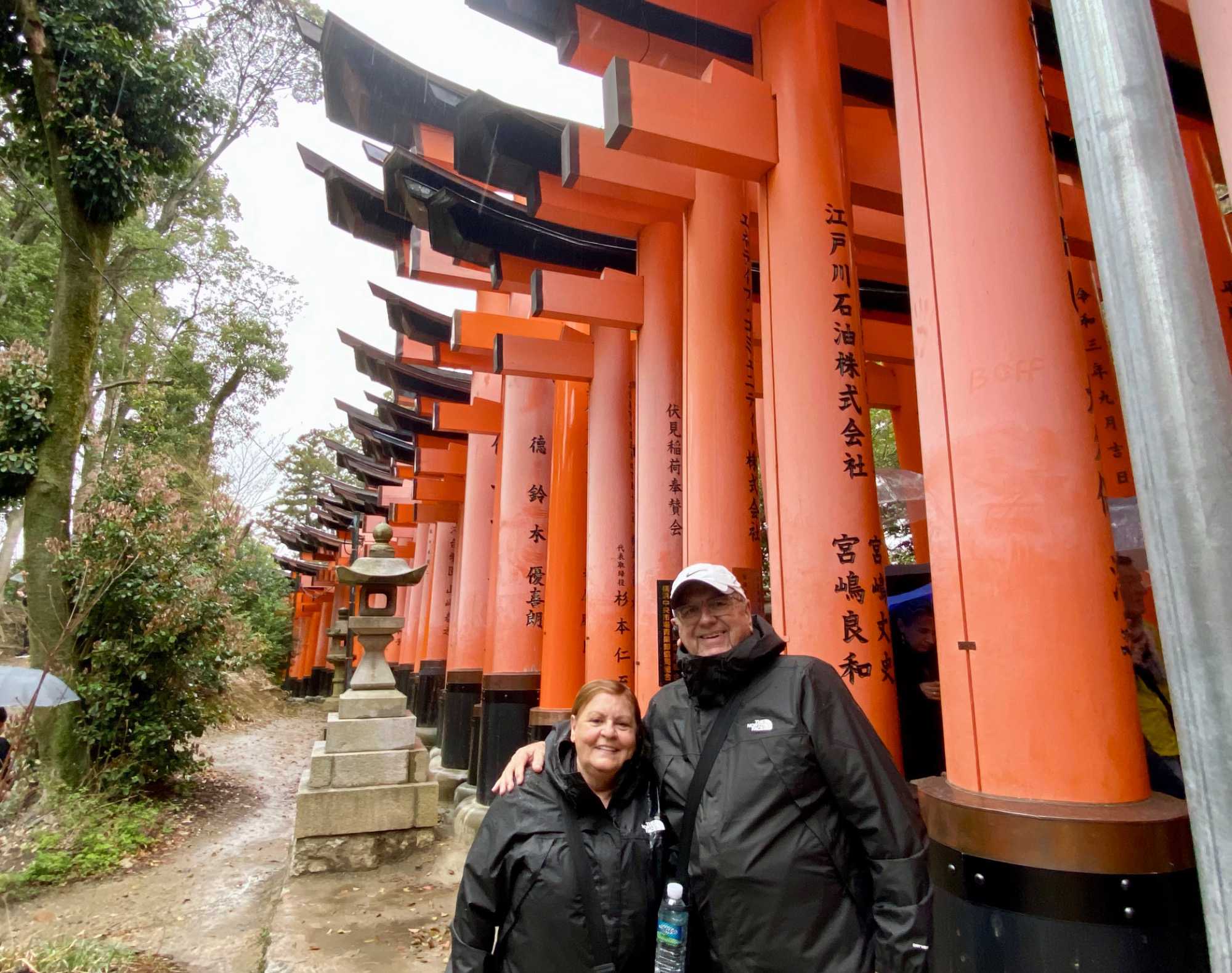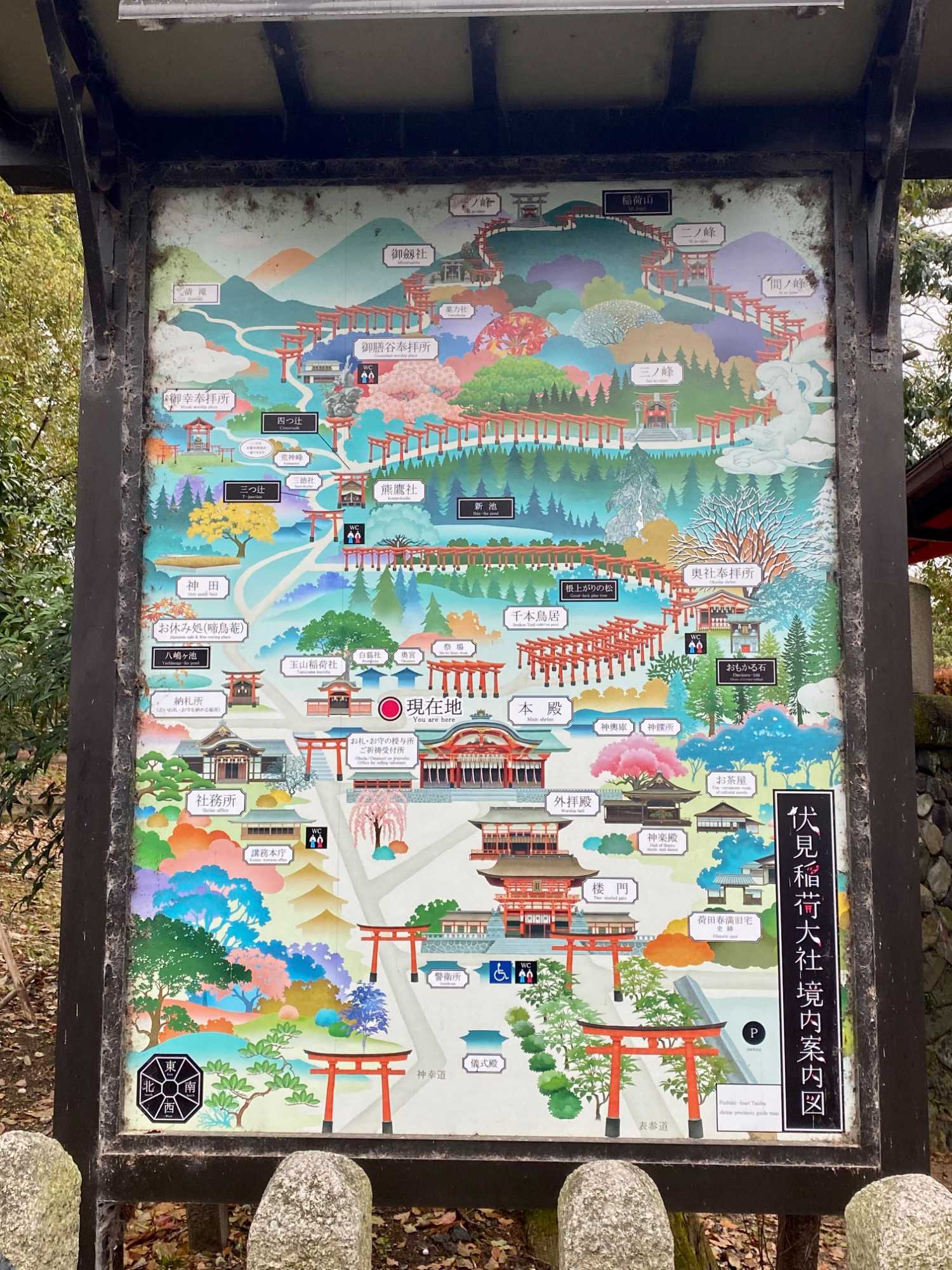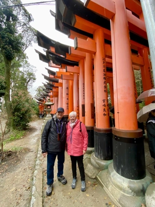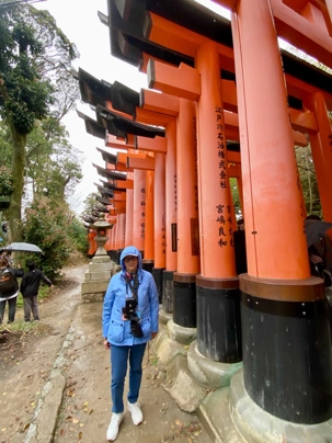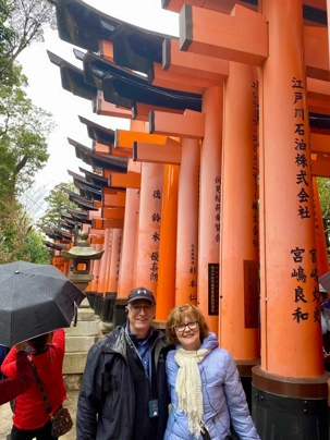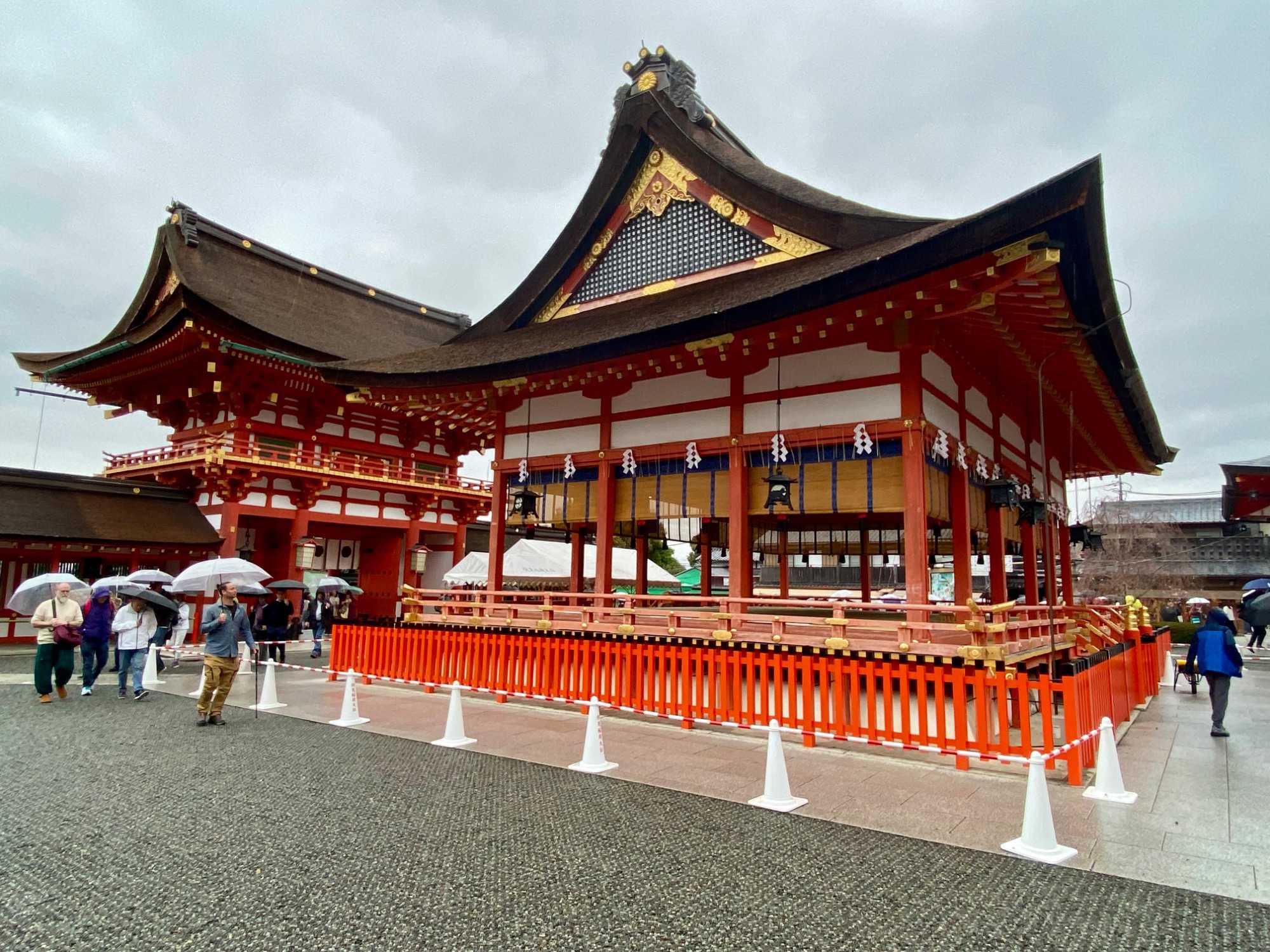 En parcourant ses sentiers bordés de 1000 torii, les visiteurs pénètrent dans un univers presque irréel, ponctué de petites statues de renards — messagers divins — et de sanctuaires secondaires nichés dans la forêt. Malheureusement, la pluie s’abat généreusement et plus nous avançons dans l’étroitesse des sentiers sous les torii; le tout mélangé à des milliers de visiteurs, ça devient difficile de se frayer un passage à travers ces sentiers qui forment un genre de tunnel. En peu de temps, un embouteillage se forme et ça ressemble à un festival du combat de parapluies!! Très intéressant; et nos yeux sont tout de même émerveillés malgré l’intervention de dame nature.
