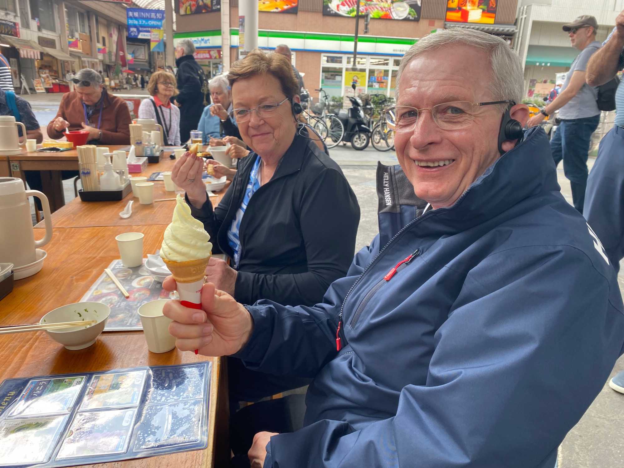Puis, nous reprenons la route; cette fois-ci en direction de la brasserie Suigei, où en fin de matinée nous procédons à la dégustation de Saké. La moitié du groupe en profite pour savourer cet élixir tandis que l’autre moitié se laisse tenter par la dégustation d’une crème glacé au Saké. On prend le temps de sentir, goûter et comparer quelques cuvées, dans une ambiance calme qui reflète l’esprit du saké : subtilité, équilibre et plaisir partagé.
