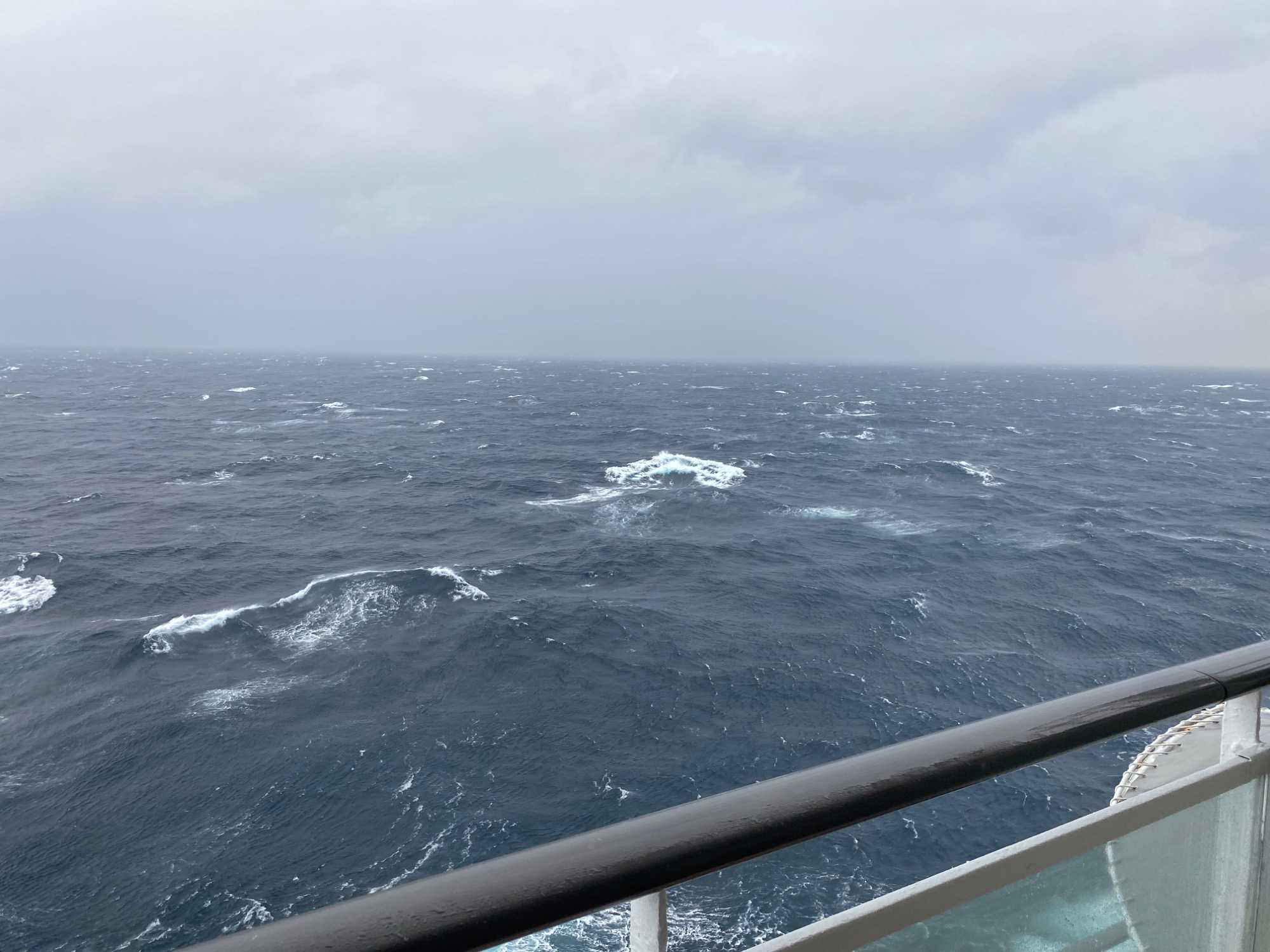 La nuit a été agitée; la pluie mélangée au vent donne un cocktail quelque peu explosif. Plusieurs s’aperçoivent qu’ils n’ont pas le pied marin. Le capitaine nous précise que nous avons des vagues de plus de 12 pieds.