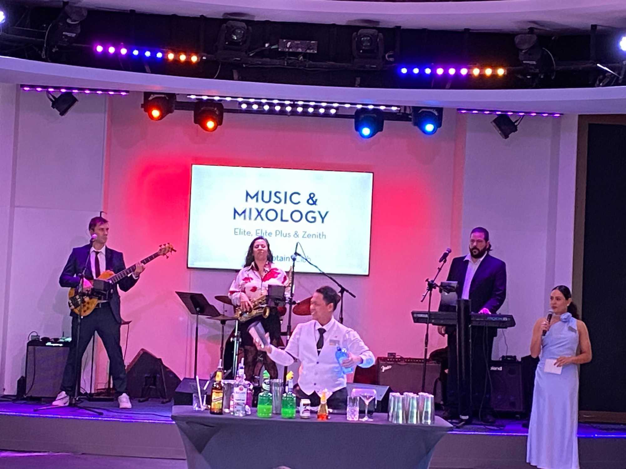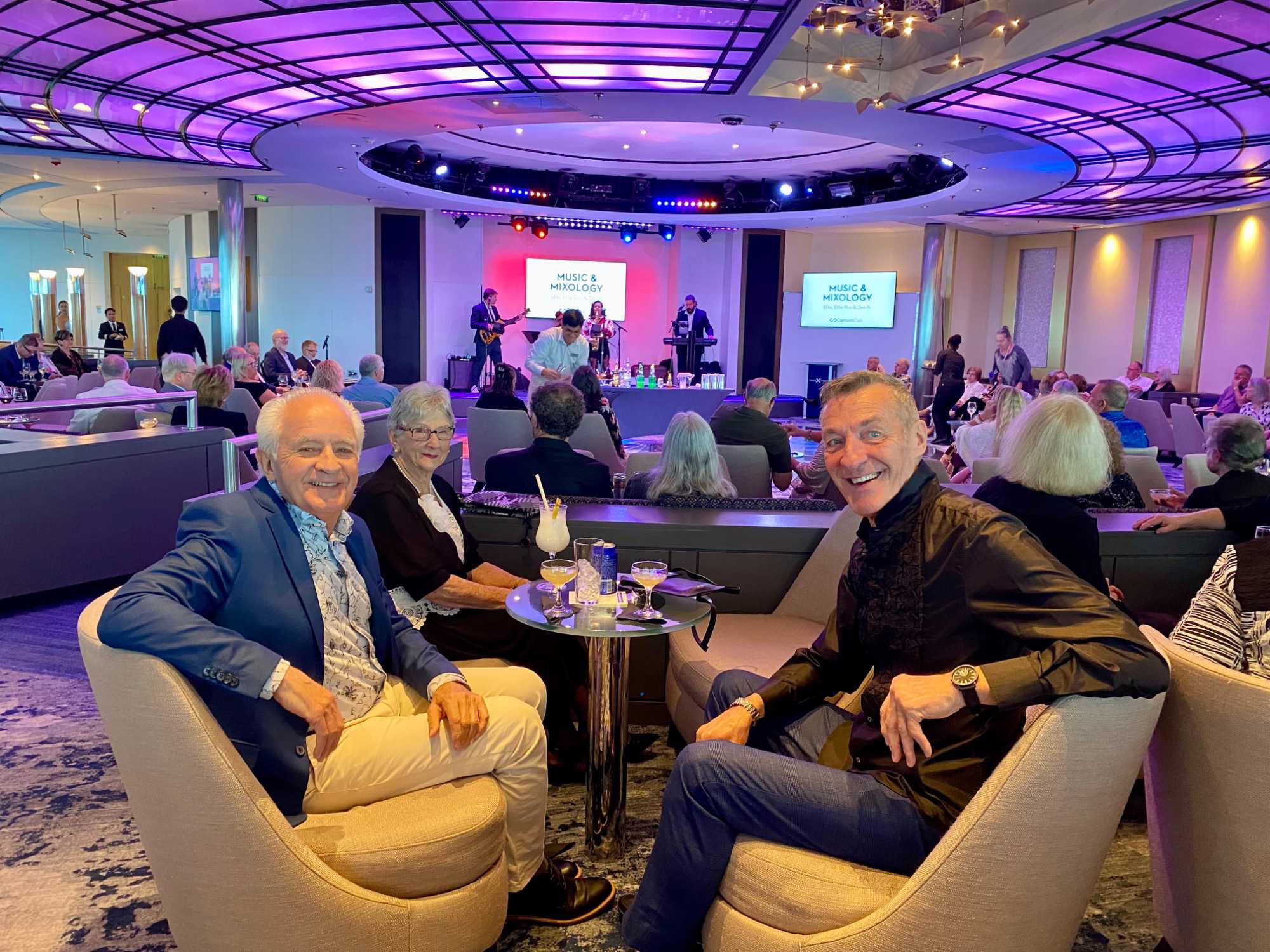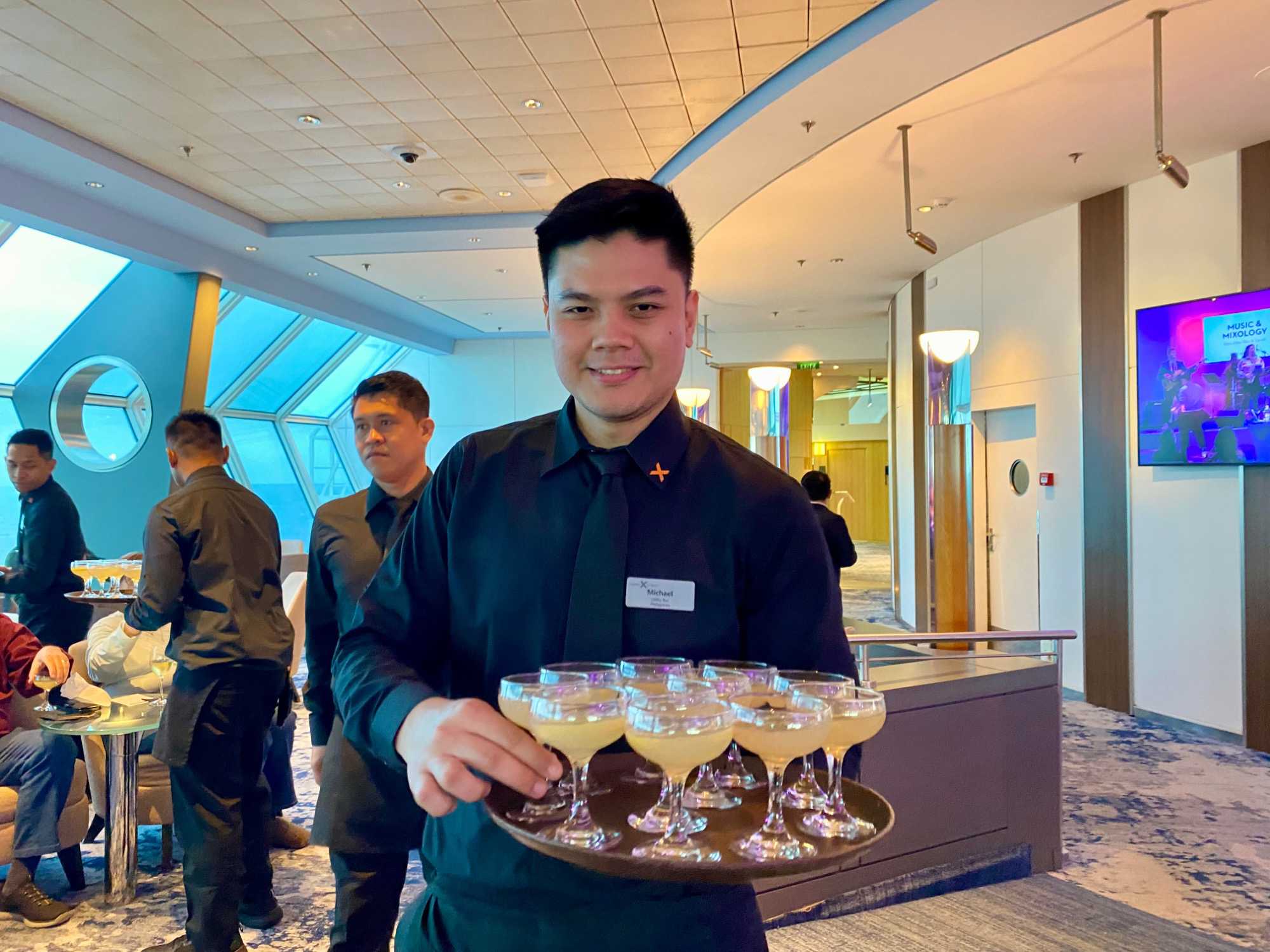 Ce soir, c’est la deuxième soirée à tenue vestimentaire chic. Tout le monde a sorti ses plus beaux habits pour cet événement, marqué par un élégant 5 à 7 au Sky Lounge, où nous sommes accueillis par les officiers du navire. Une démonstration de mixologie est offert dans un ambiance musicale chaleureuse d’un bon band. Pas tout le monde se présente car l’effet provoqué par l’agitation du bateau provoque quelques inconforts; tout tangue sans répit, comme si le bateau respirait au rythme chaotique de la mer.