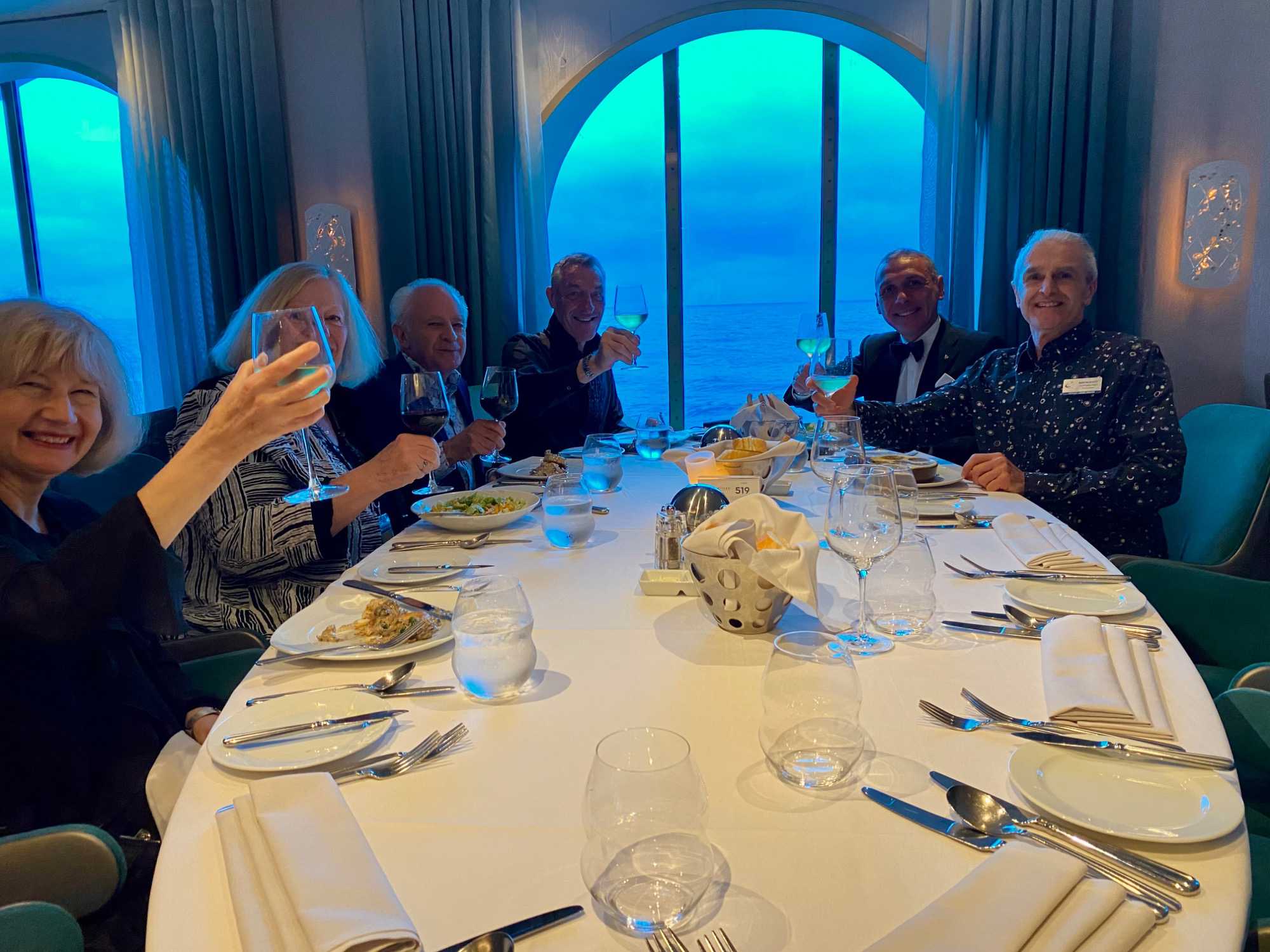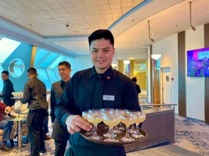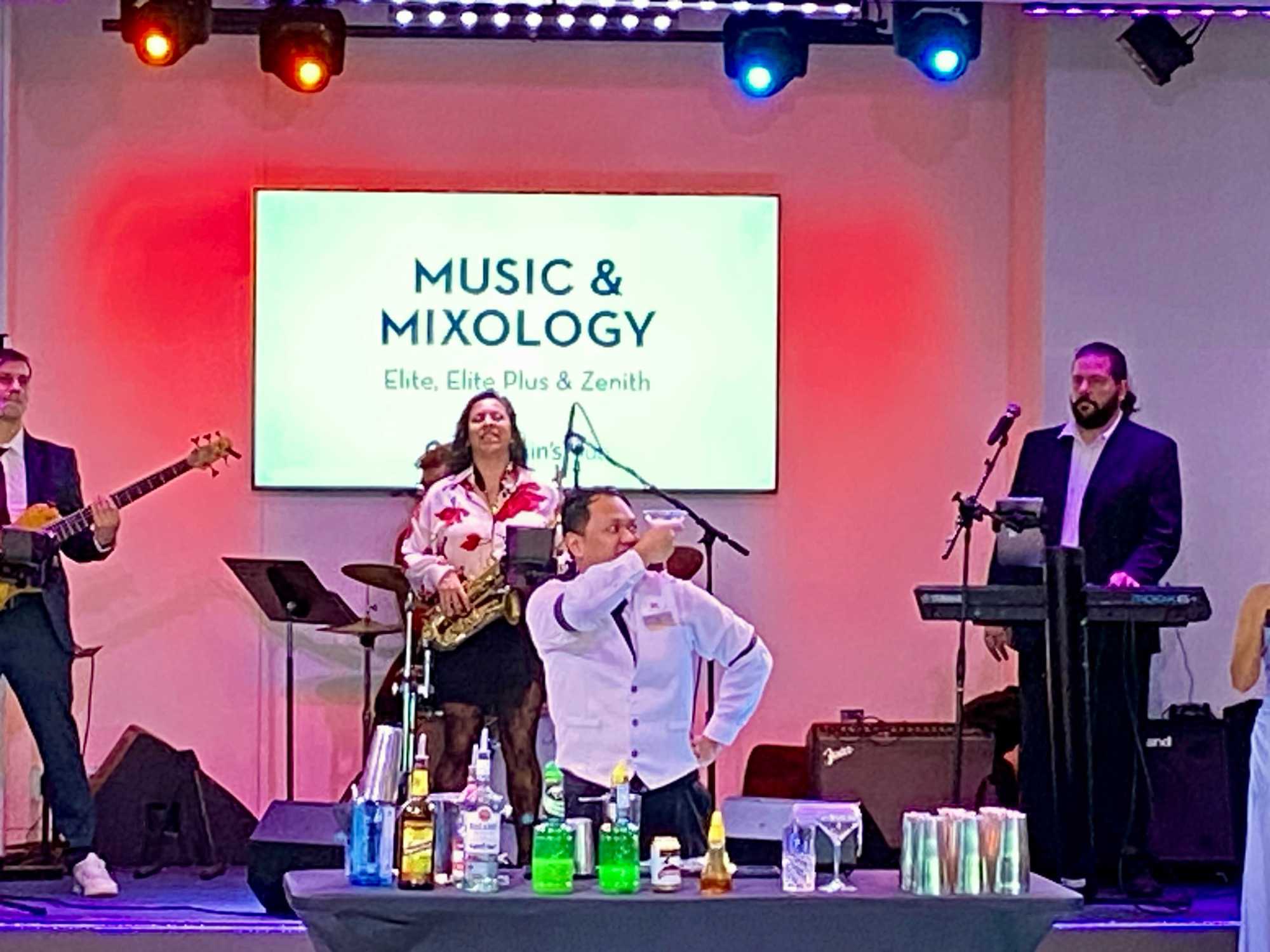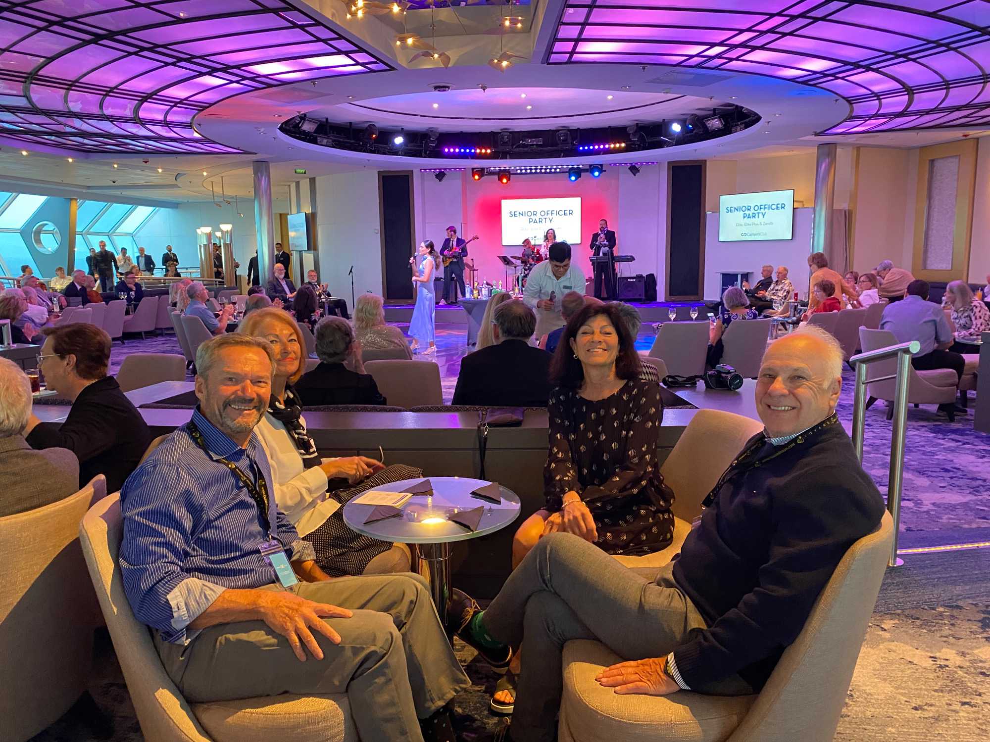 Ce soir, c’est la deuxième soirée à tenue vestimentaire chic. Tout le monde a sorti ses plus beaux habits pour cet événement, marqué par un élégant 5 à 7 au Sky Lounge, où nous sommes accueillis par les officiers du navire. Une démonstration de mixologie est offert dans un ambiance musicale chaleureuse d’un bon band. Pas tout le monde se présente car l’effet provoqué par l’agitation du bateau provoque quelques inconforts; tout tangue sans répit, comme si le bateau respirait au rythme chaotique de la mer.