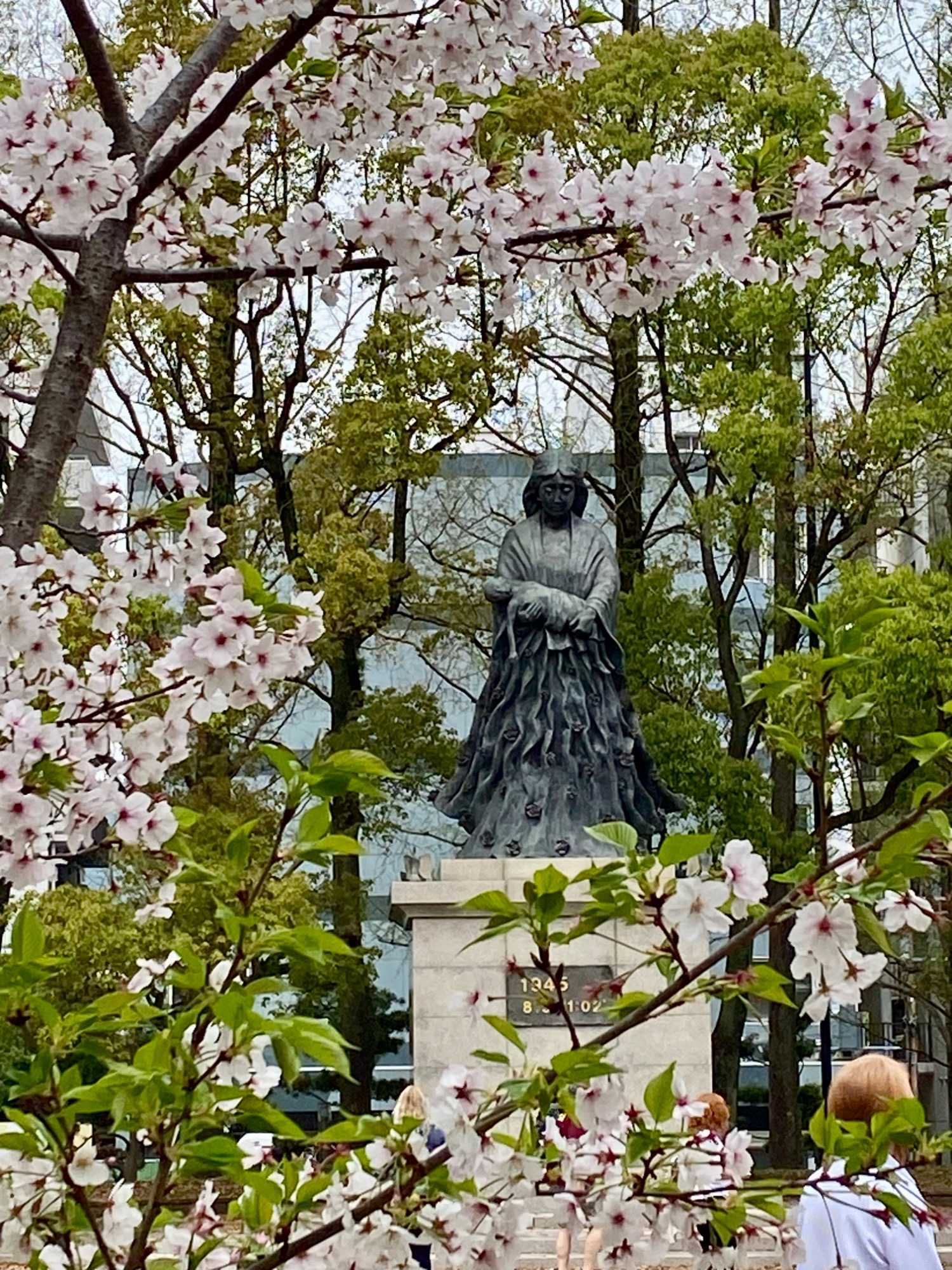 Les arbres en fleurs offrent un contraste saisissant avec l’histoire tragique du lieu.