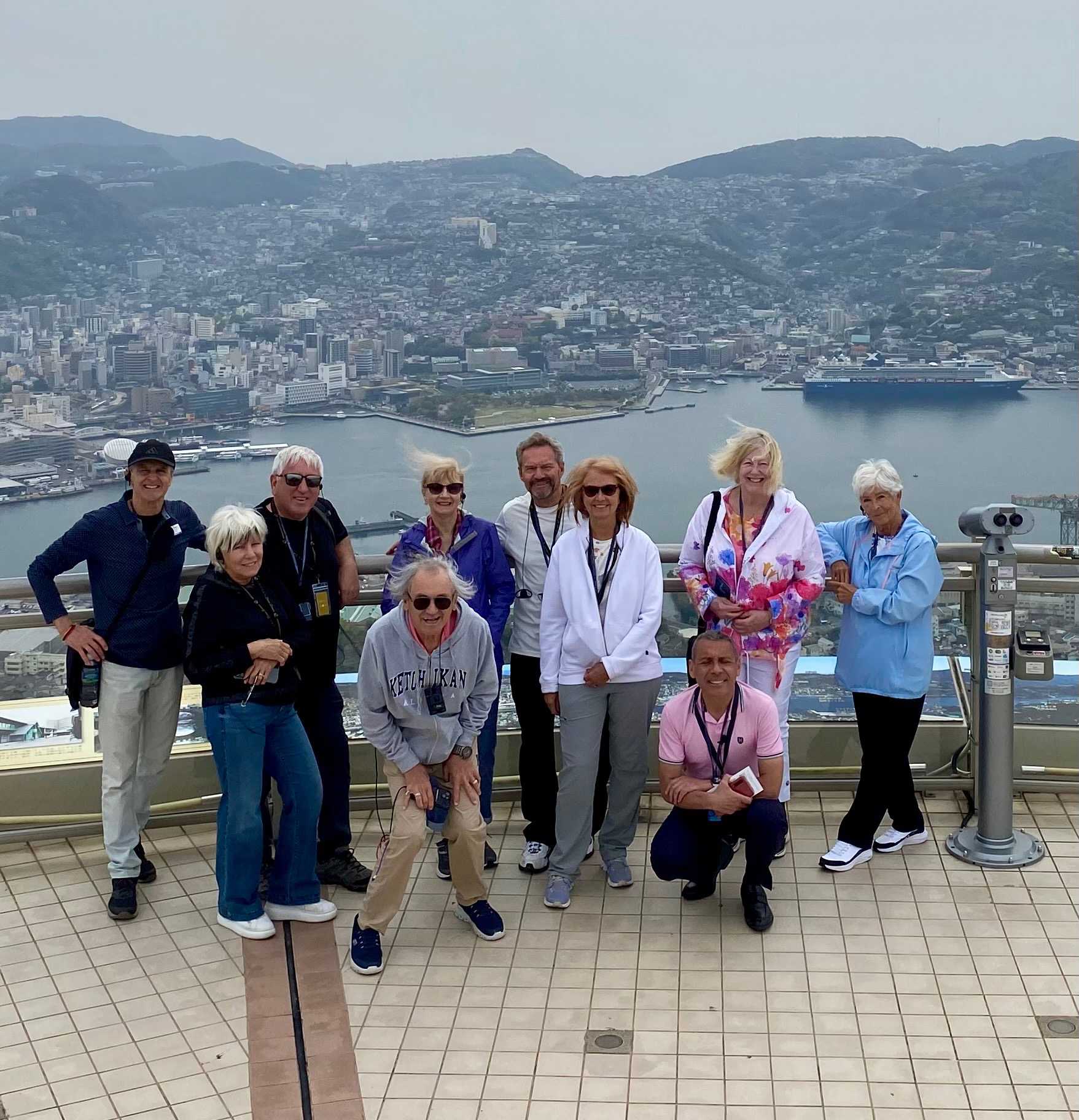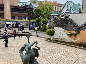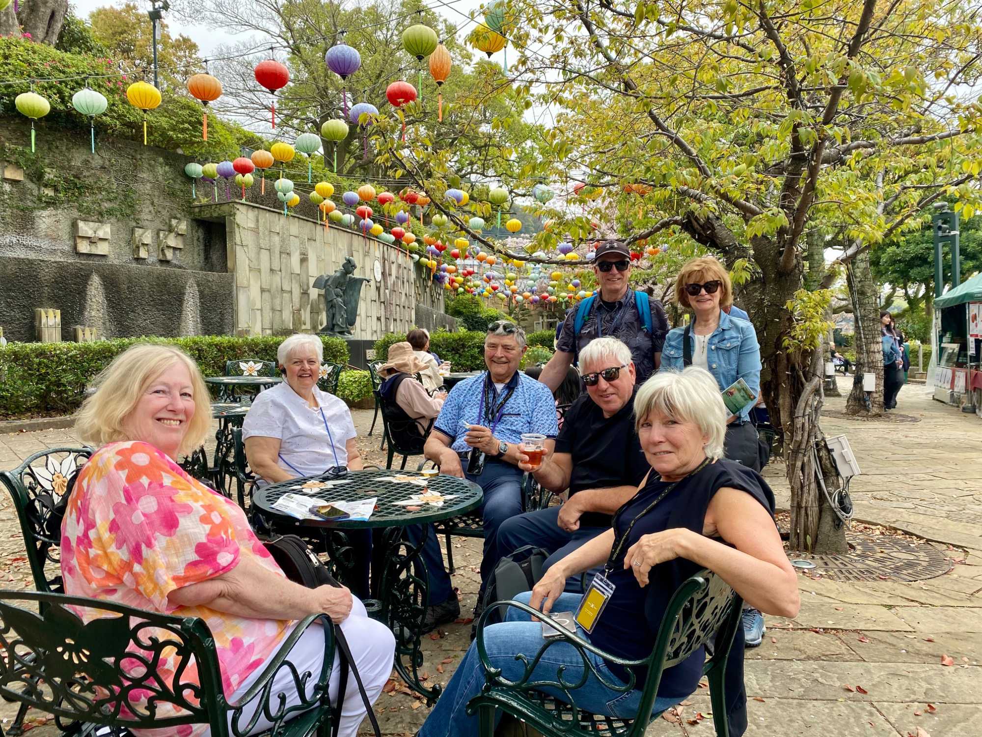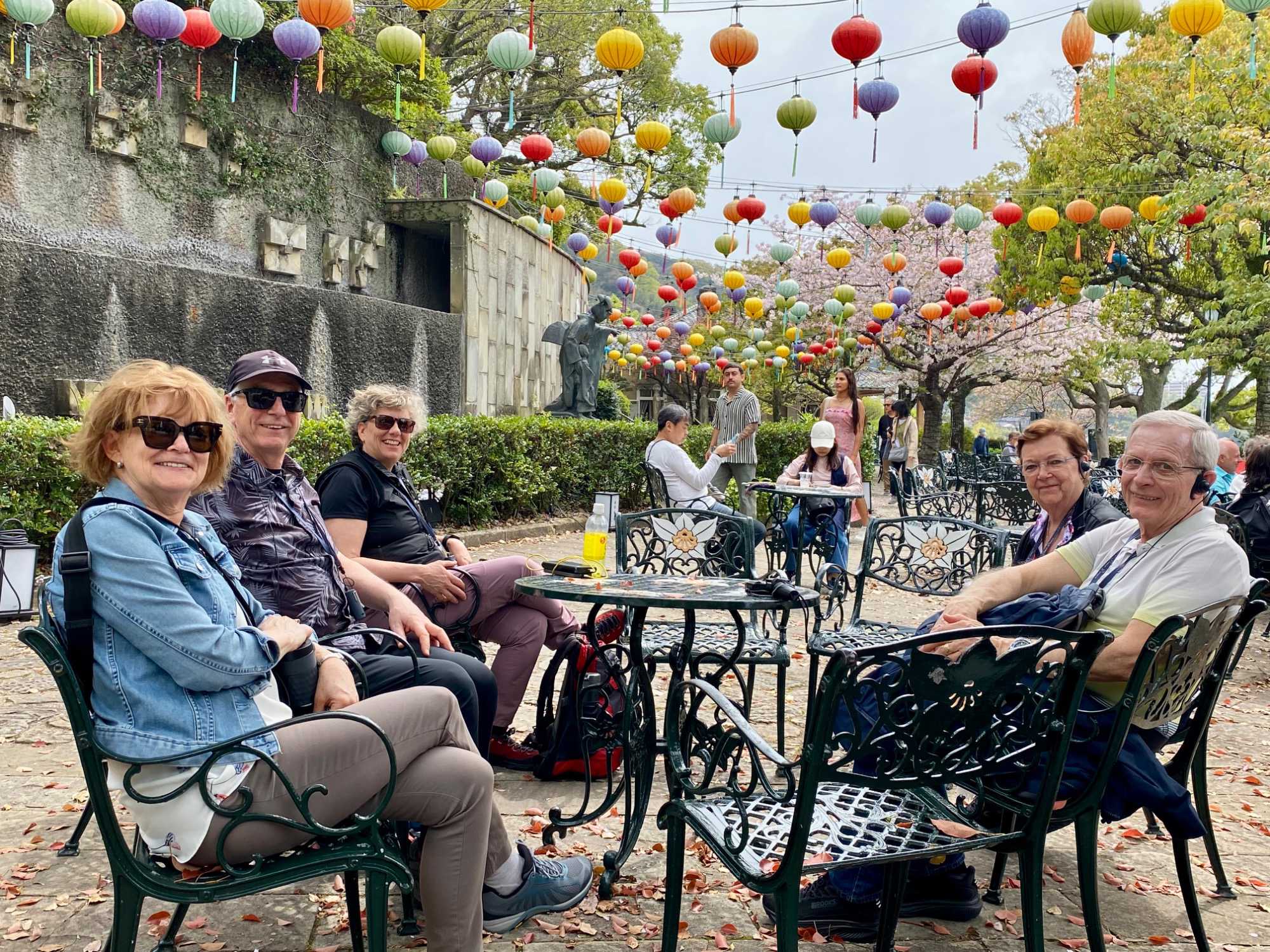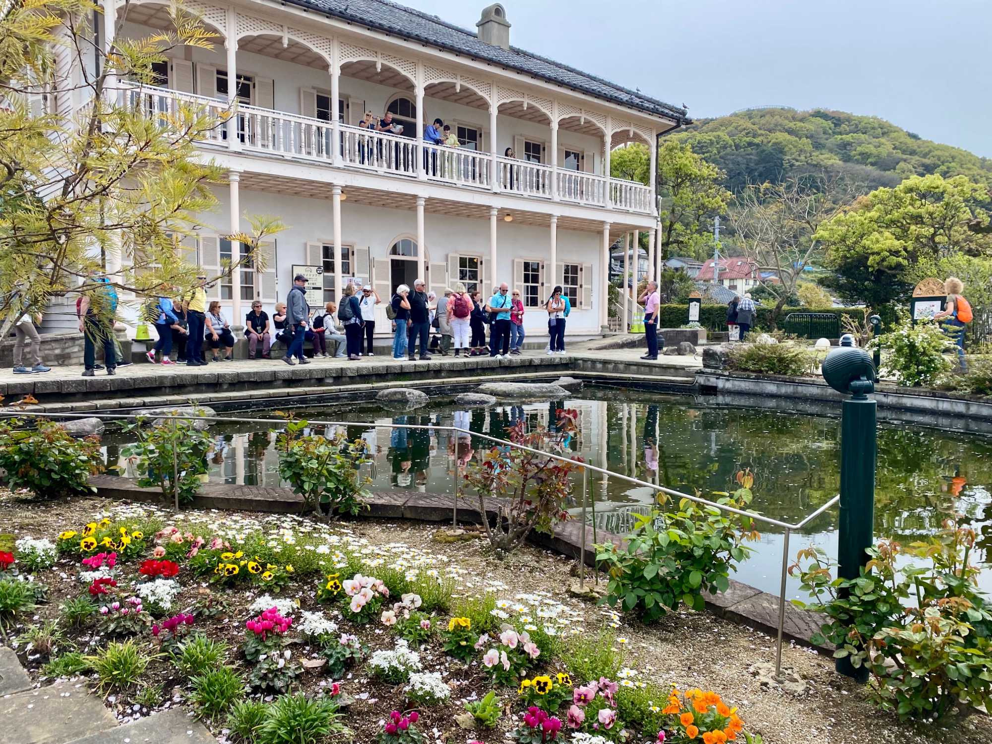 Par la suite, on se retrouve pour visiter le jardin Glover; un magnifique jardin perché sur les hauteurs de Nagasaki, offrant une vue panoramique sur le port. Comme un véritable musée à ciel ouvert; on y découvre d’élégantes maisons de style occidental-colonial, témoins de l’ouverture du Japon au commerce international au XIXe siècle. Les allées fleuries, les pelouses soignées et les plantes exotiques créent une atmosphère paisible et raffinée. Même que nous profitons de temps libre pour prendre un drink dans ce somptueux jardin, à relaxer, contempler et fraterniser.