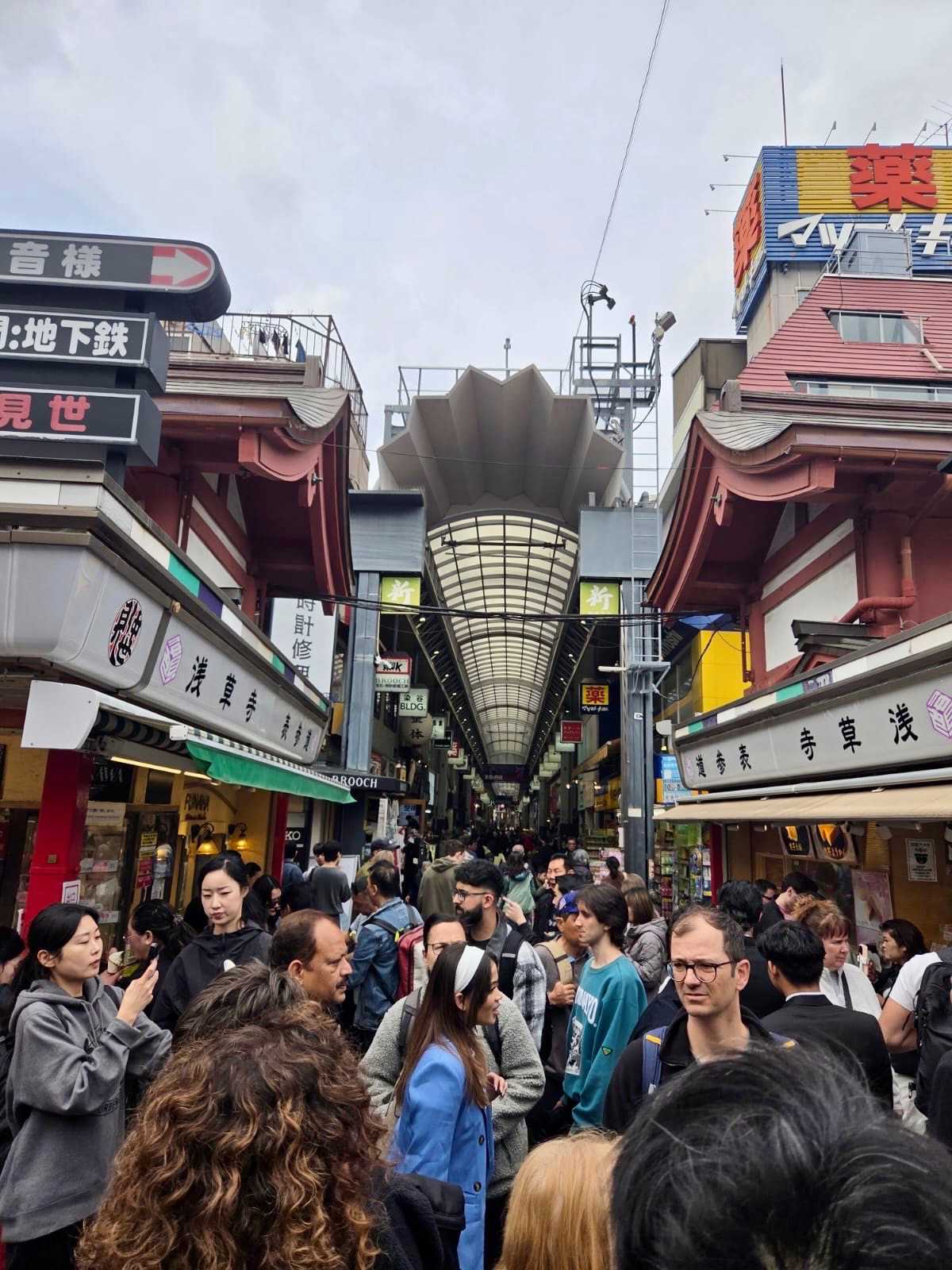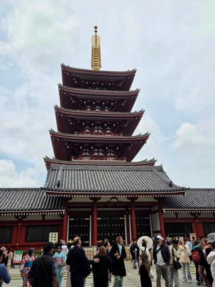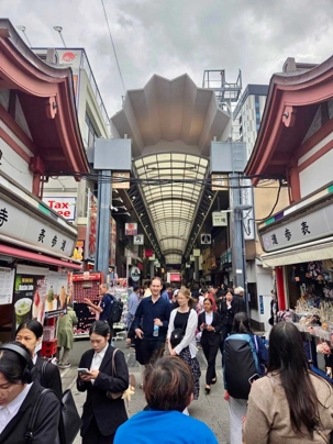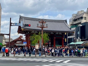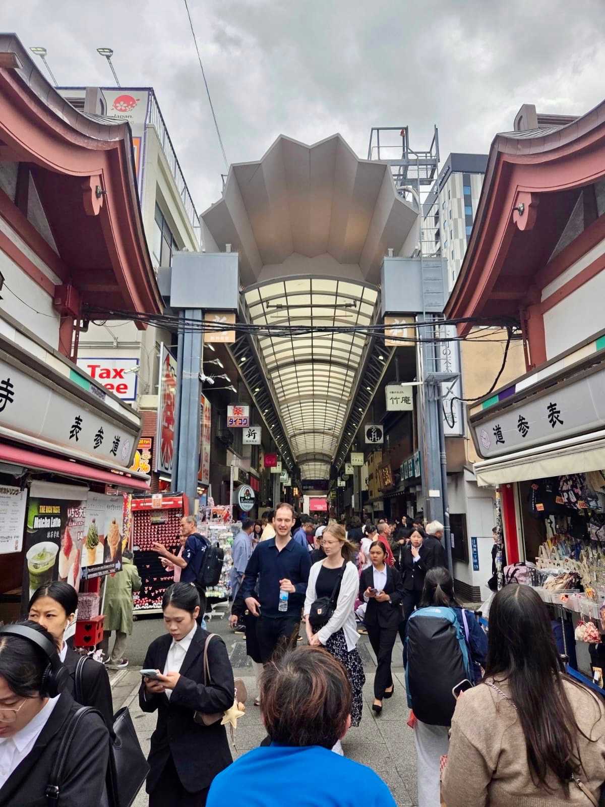 Nous commençons par la célèbre rue commerçante Nakamise Street, qui mène directement au temple. Bordée de dizaines de petites boutiques, cette rue animée est idéale pour goûter des spécialités japonaises comme les biscuits au riz (senbei) ou les pâtisseries sucrées. On y trouve aussi de nombreux souvenirs typiques, comme des éventails, des kimonos légers ou des porte-bonheur. L’ambiance y est vivante et colorée, avec une foule de visiteurs et une décoration traditionnelle qui plonge immédiatement dans la culture japonaise.