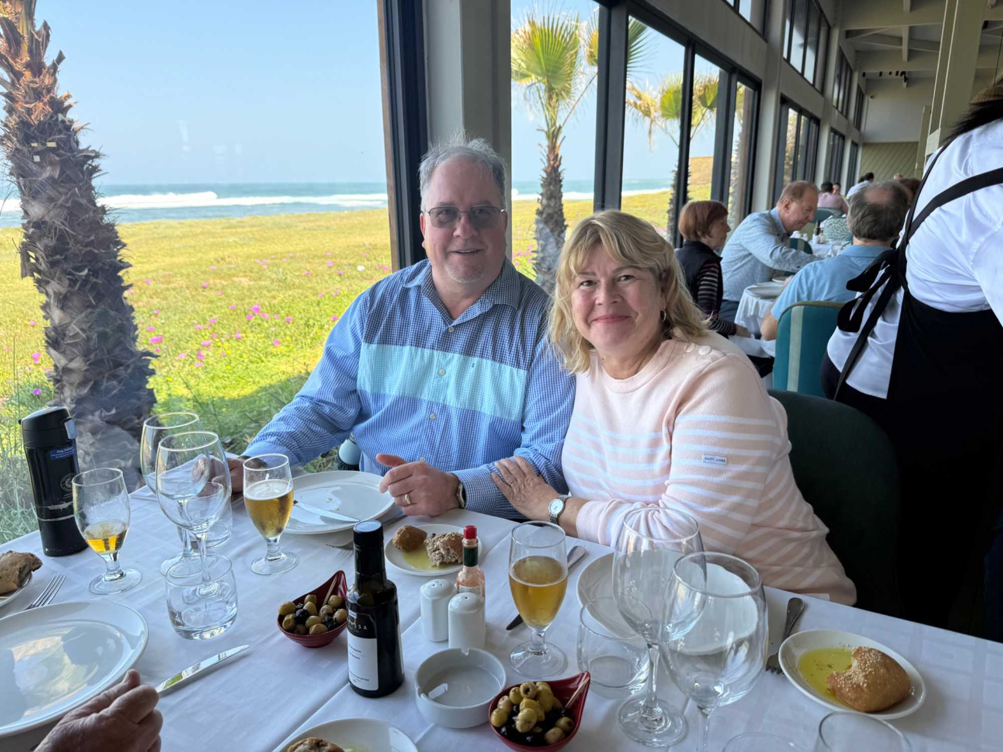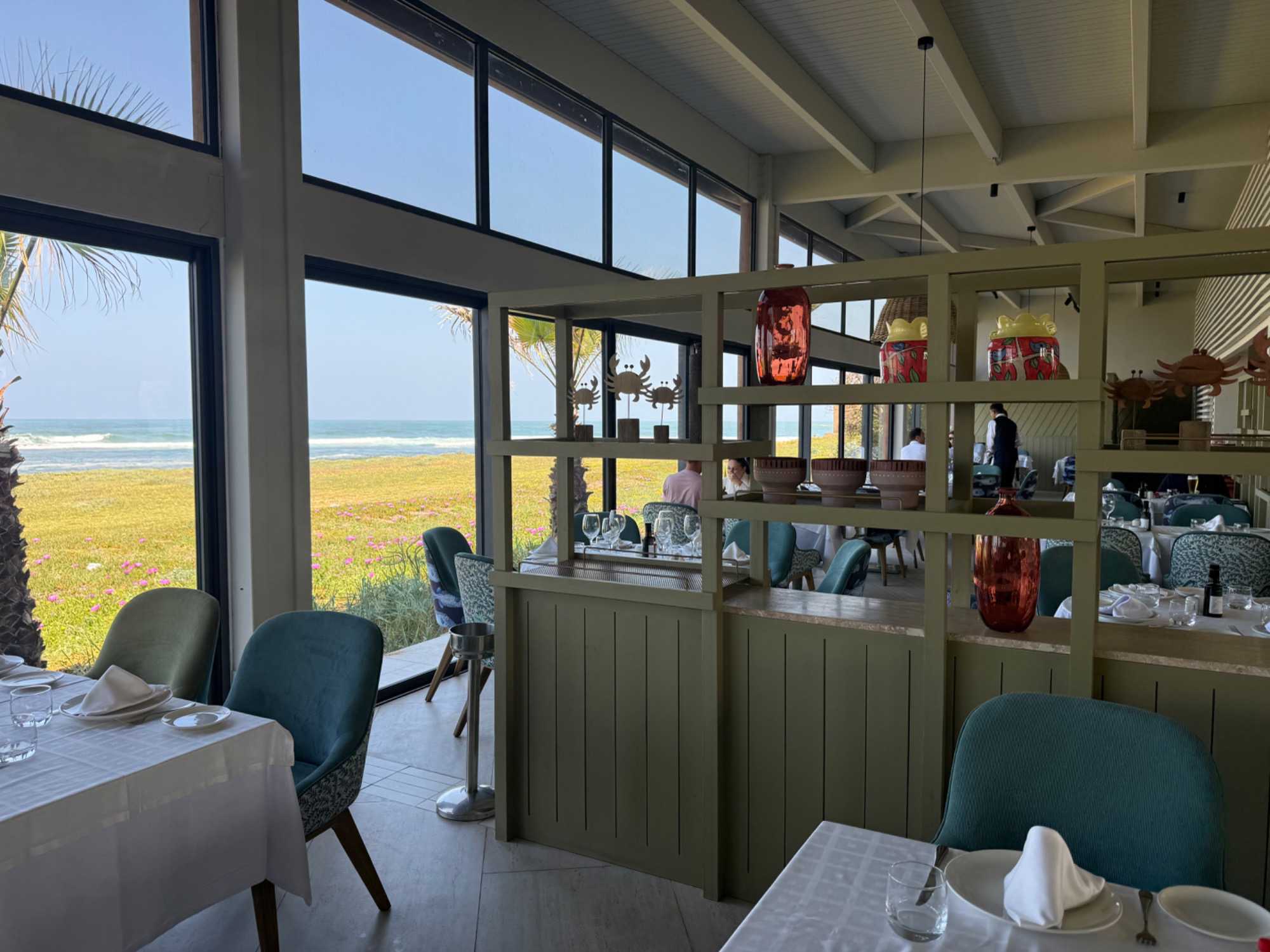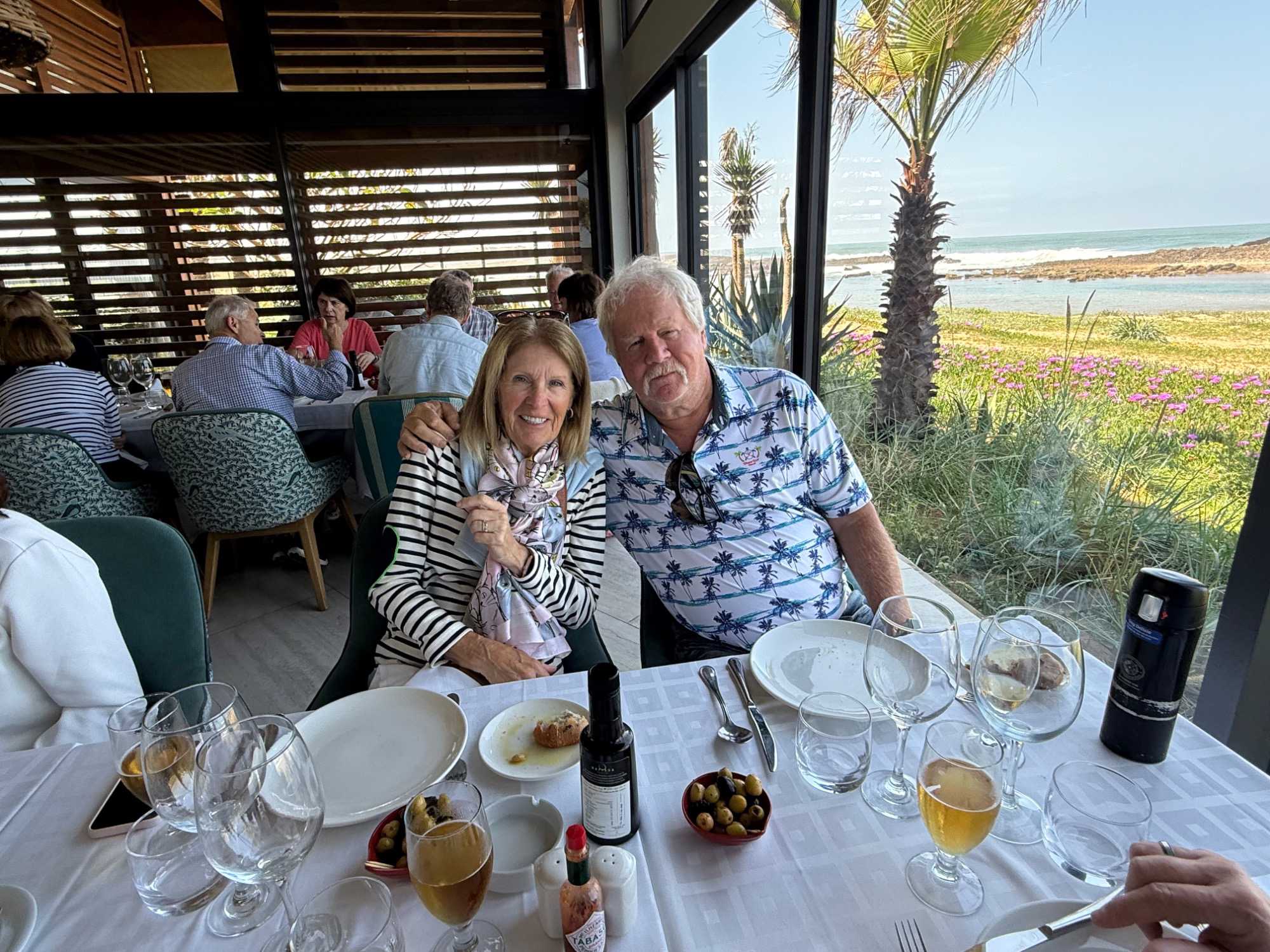 Patrick nous avait réservé un superbe restaurant en bord de mer, Les Trois Palmiers, situé juste avant l’arrivée à Rabat. Installés face à l’océan, nous avons savouré chaque instant…