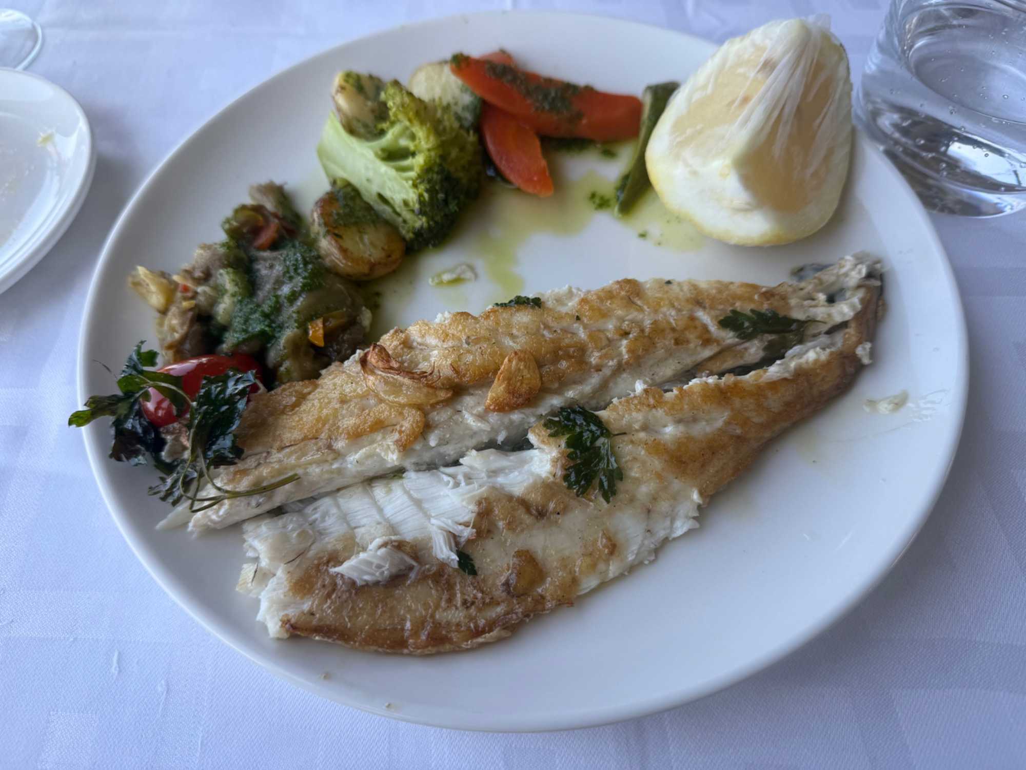de belles salades à partager, de délicieuses crevettes en entrée, puis un loup de mer d’une grande finesse, parfaitement apprêté devant nous… accompagné d’une savoureuse paella aux accents marocains.