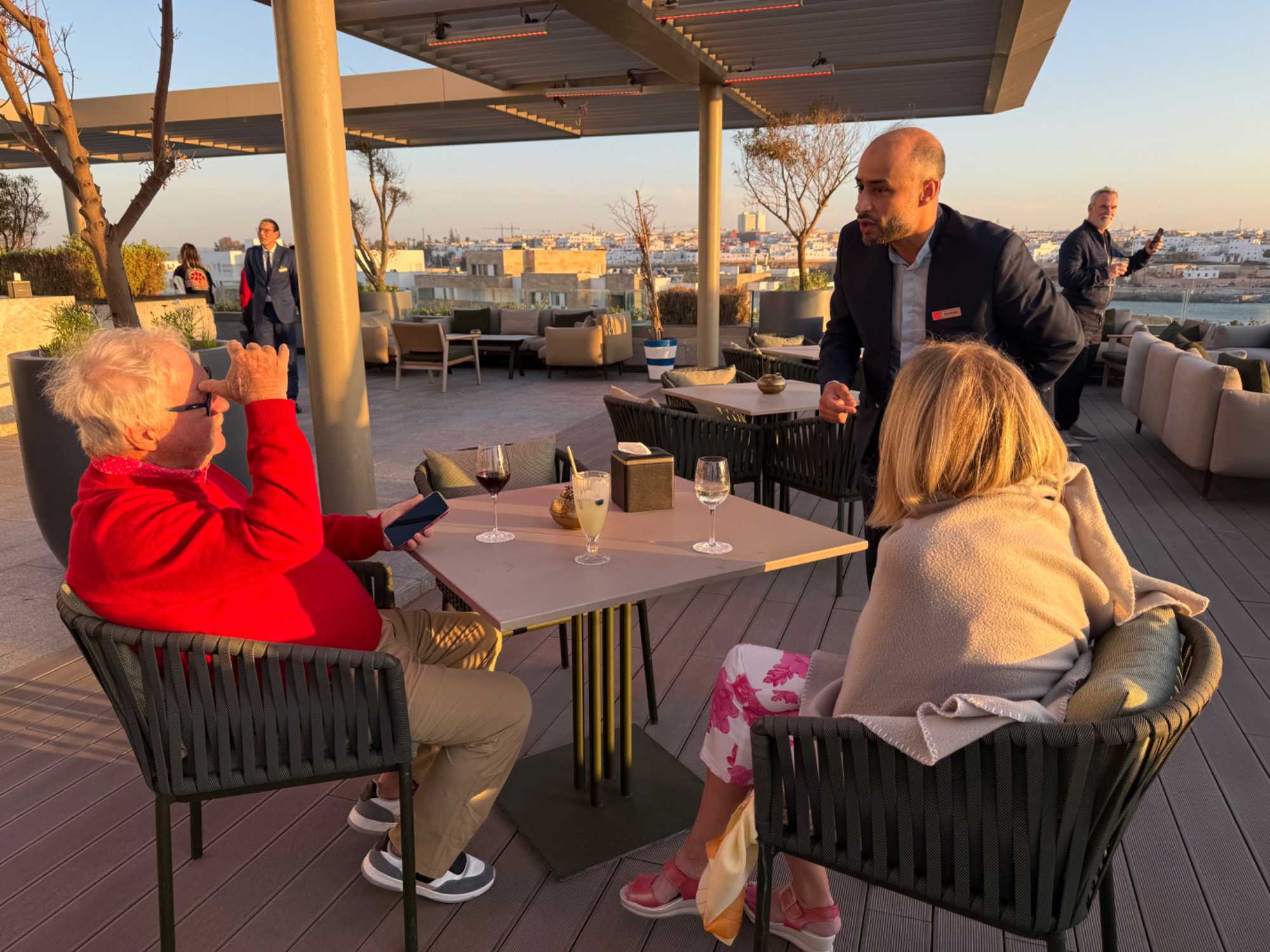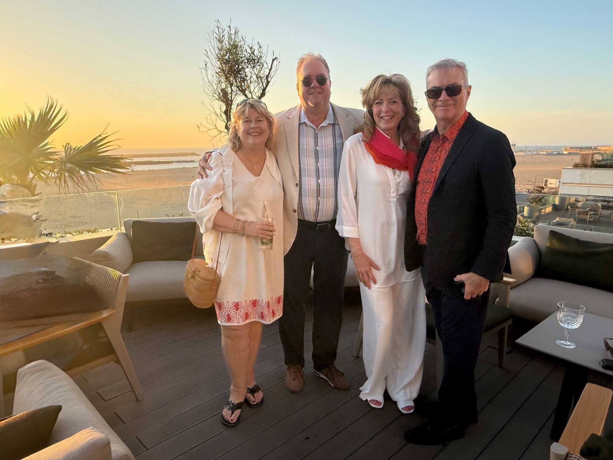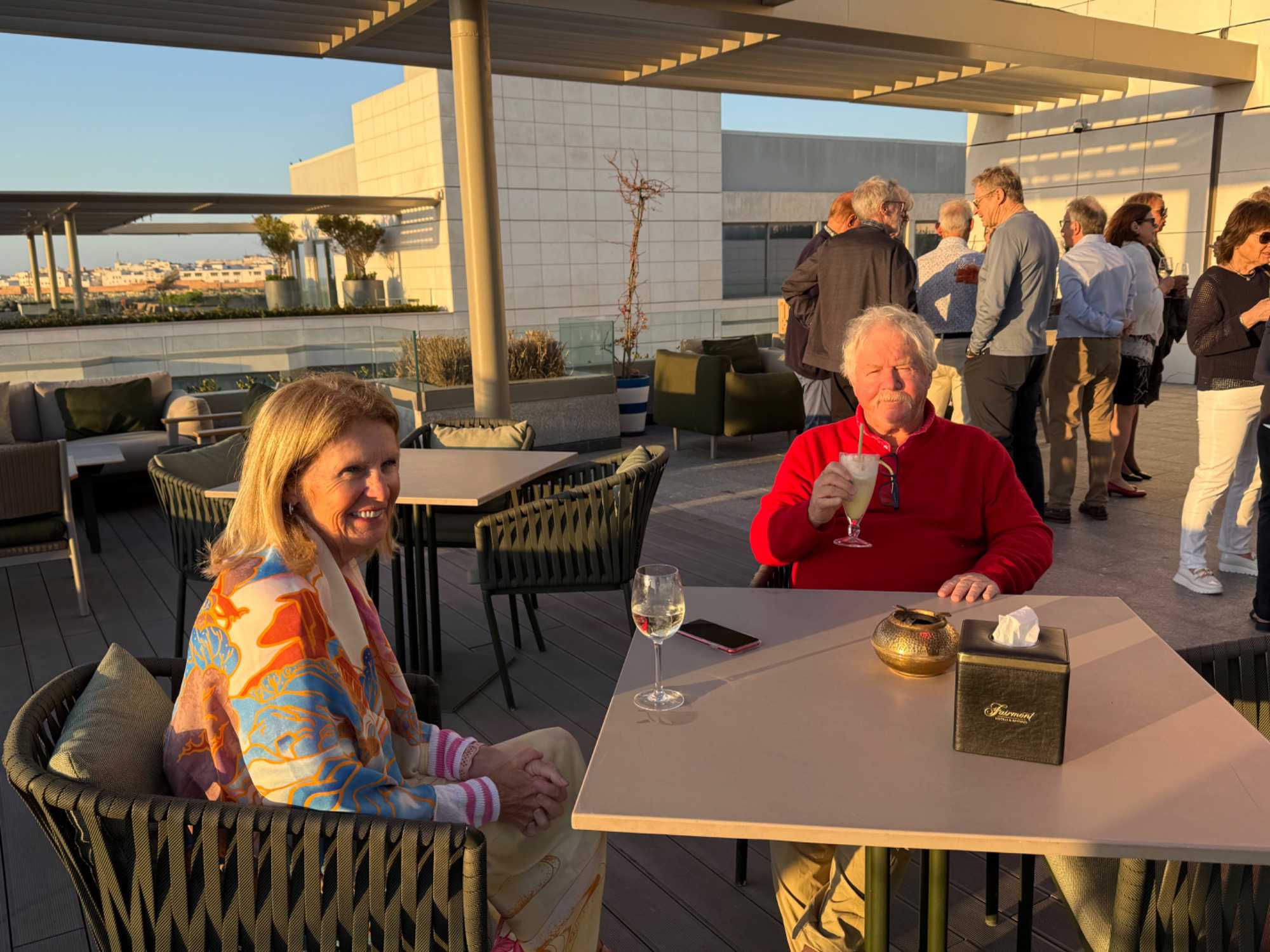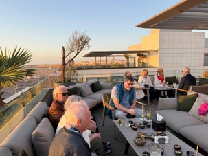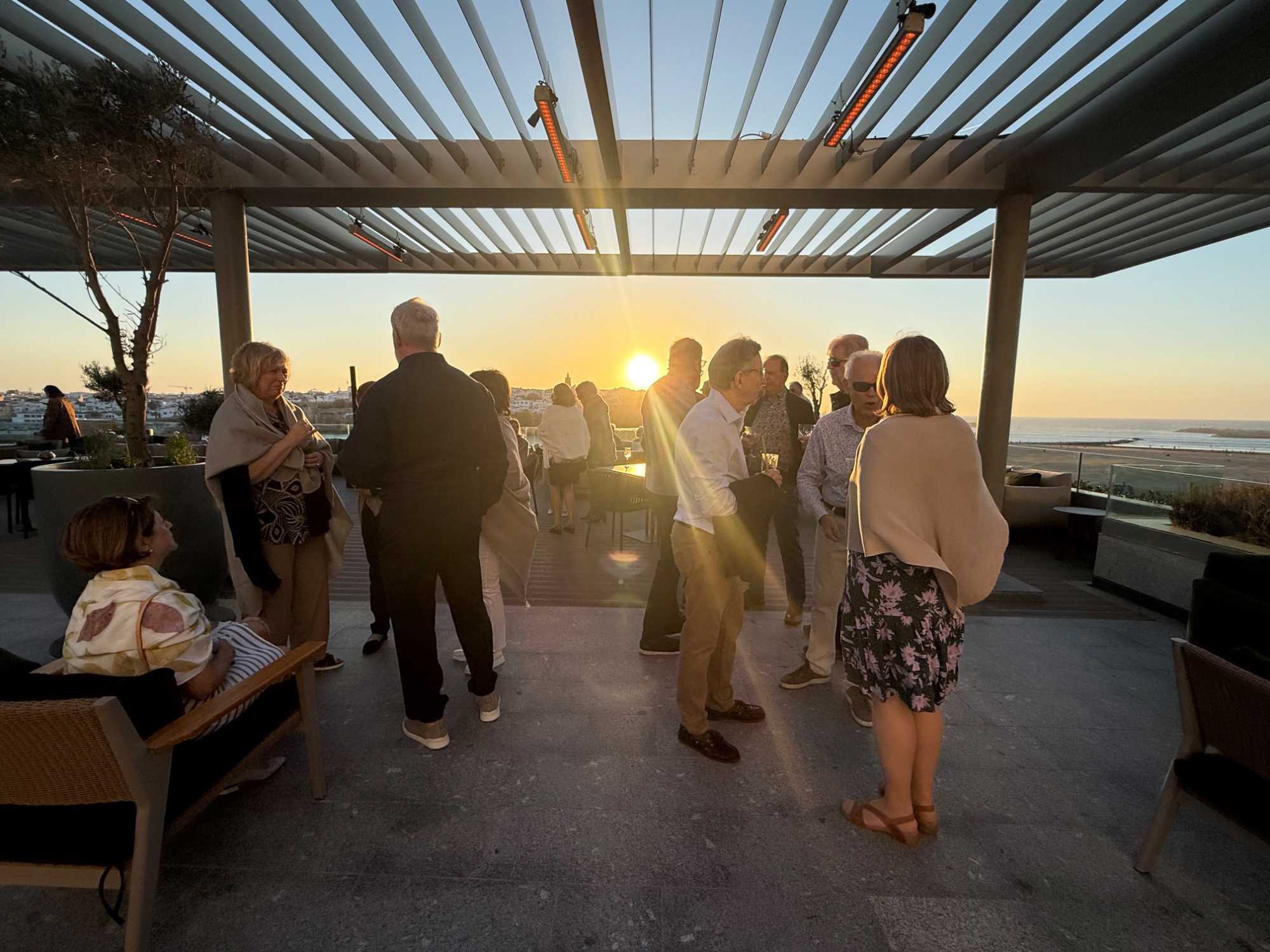 Après un peu de repos dans nos superbes chambres, nous nous sommes retrouvés sur le toit de l’hôtel pour un cocktail au coucher du soleil.