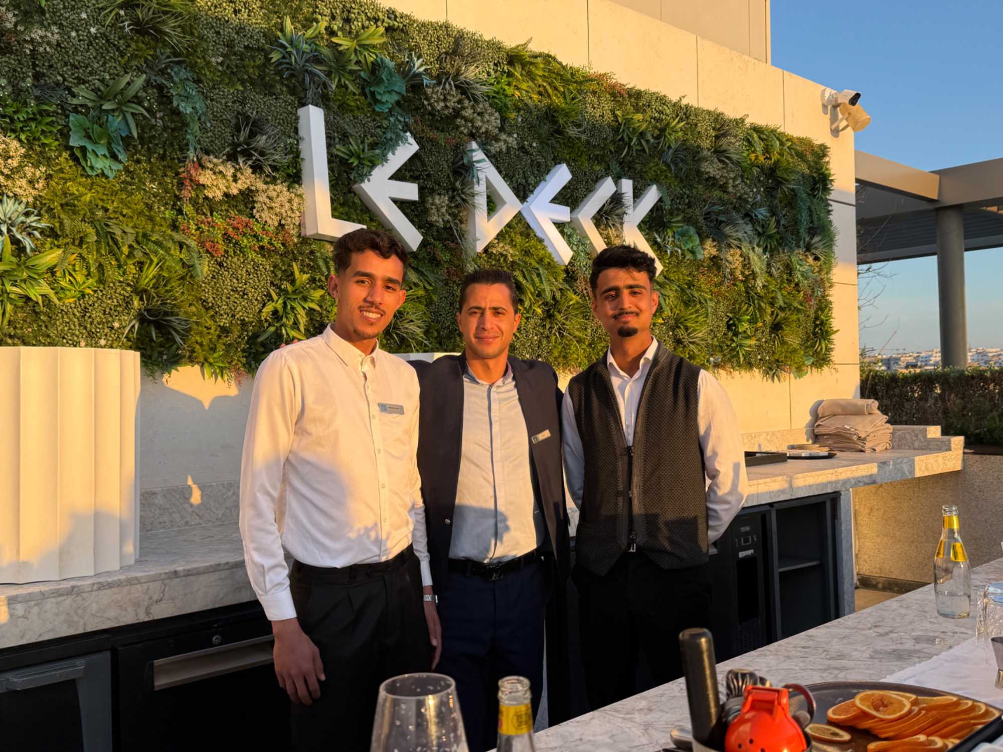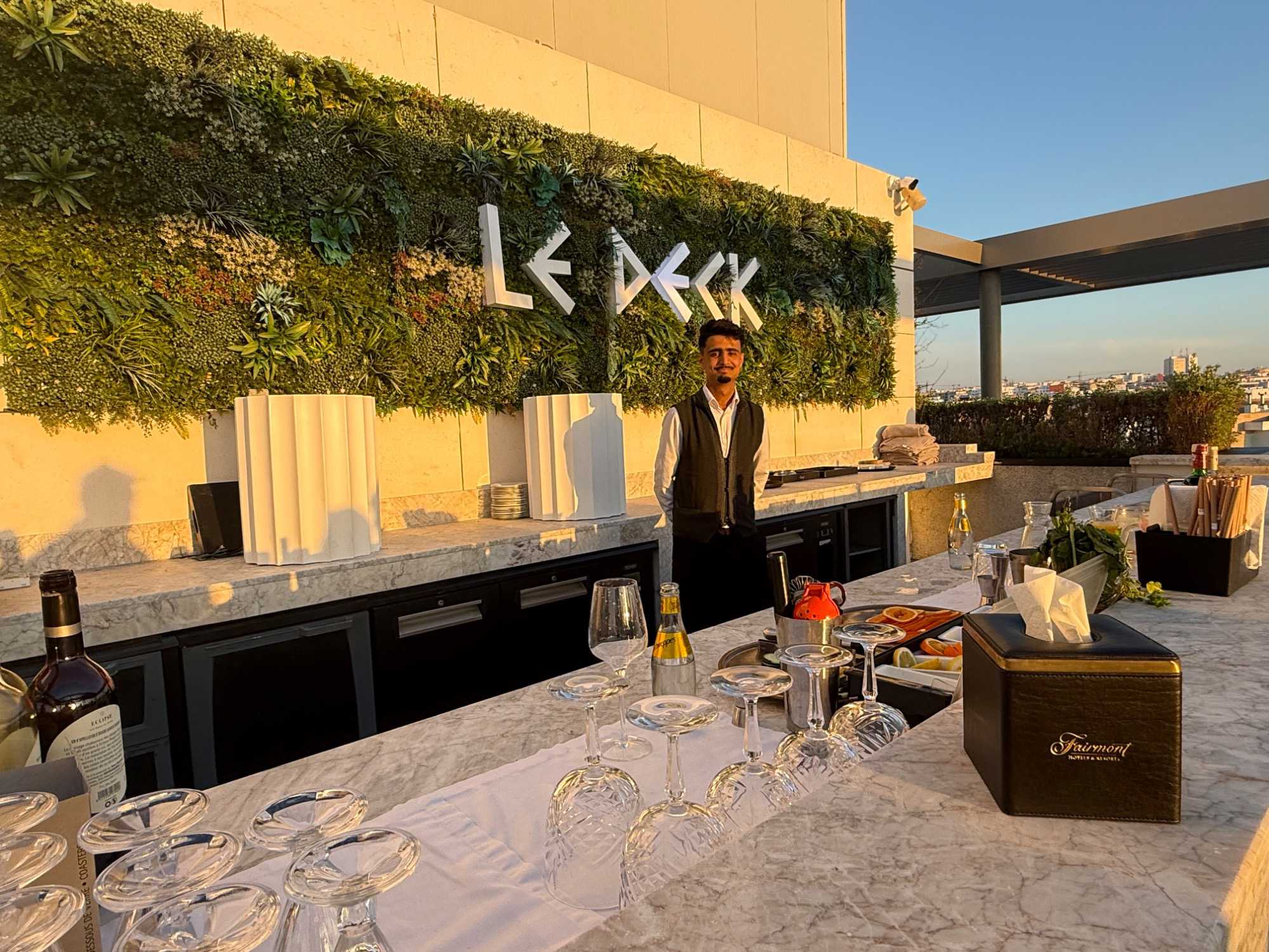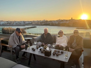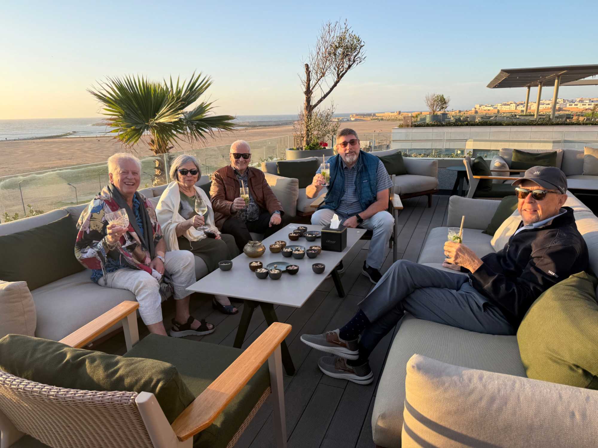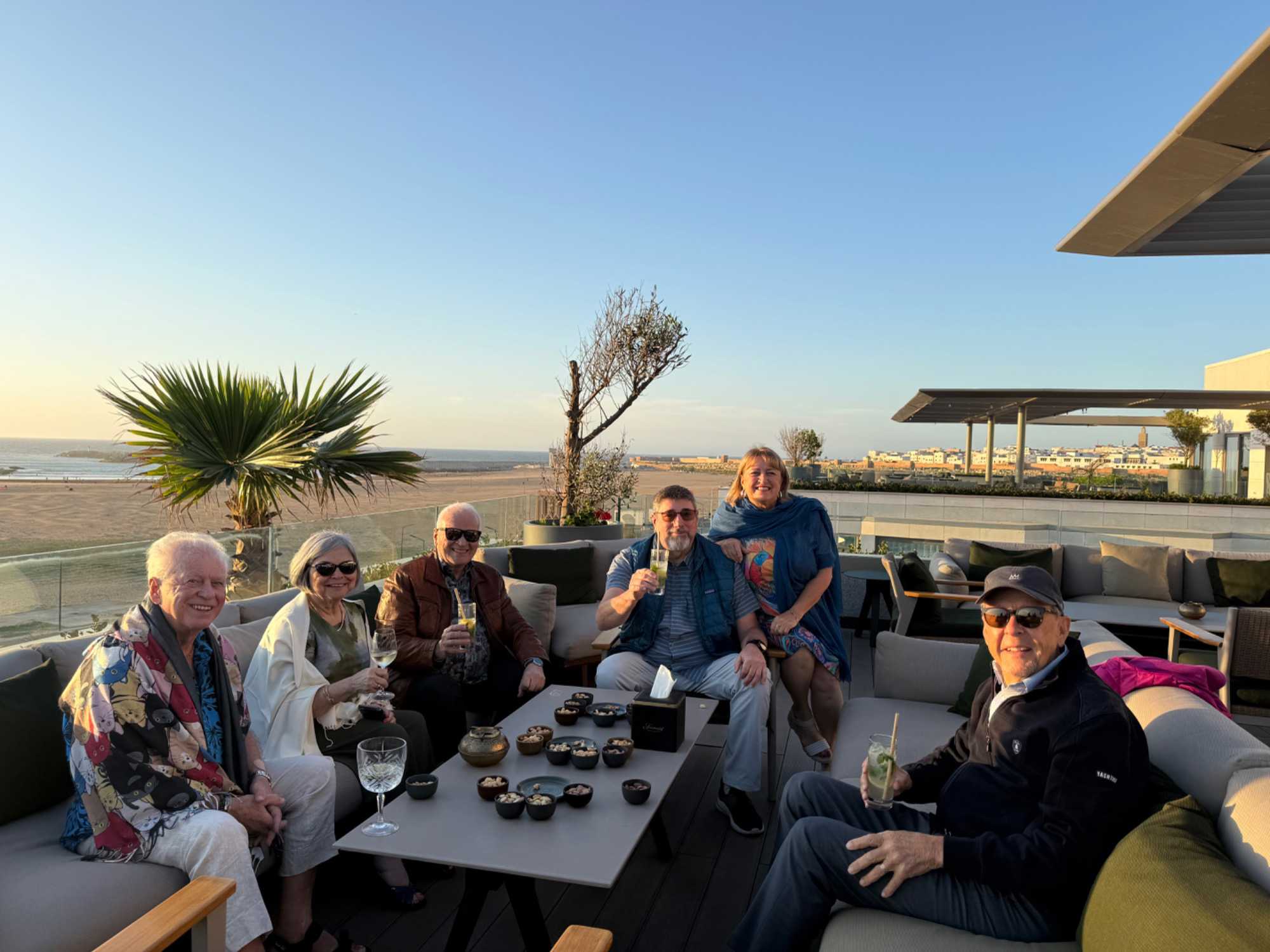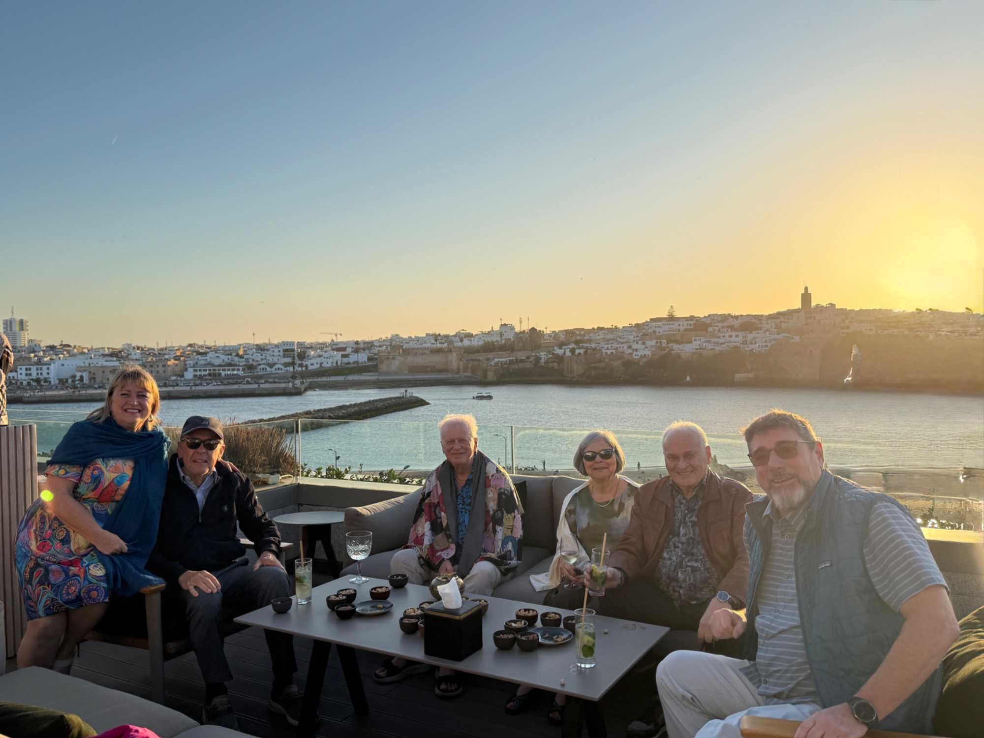 Après un peu de repos dans nos superbes chambres, nous nous sommes retrouvés sur le toit de l’hôtel pour un cocktail au coucher du soleil.