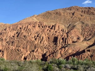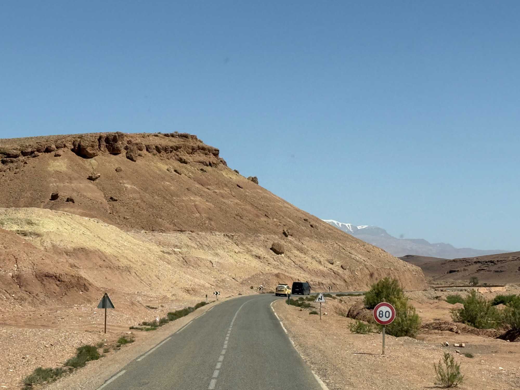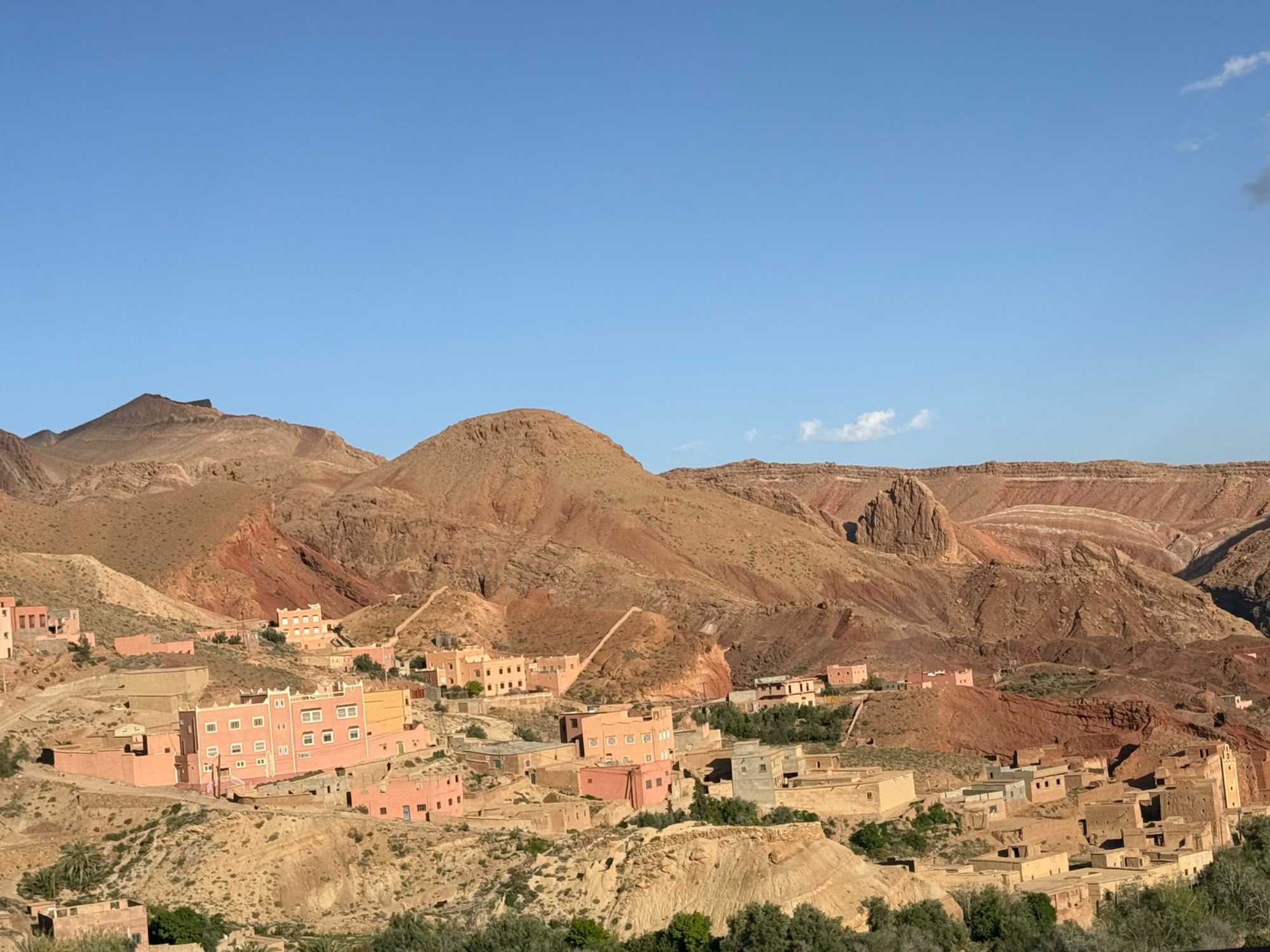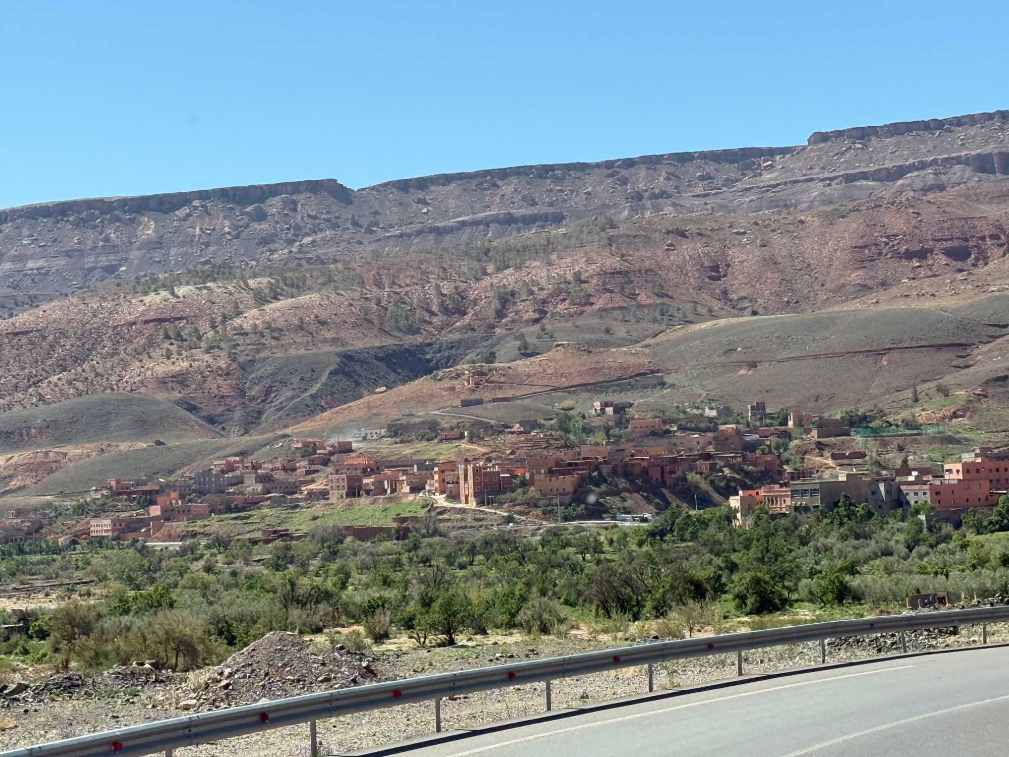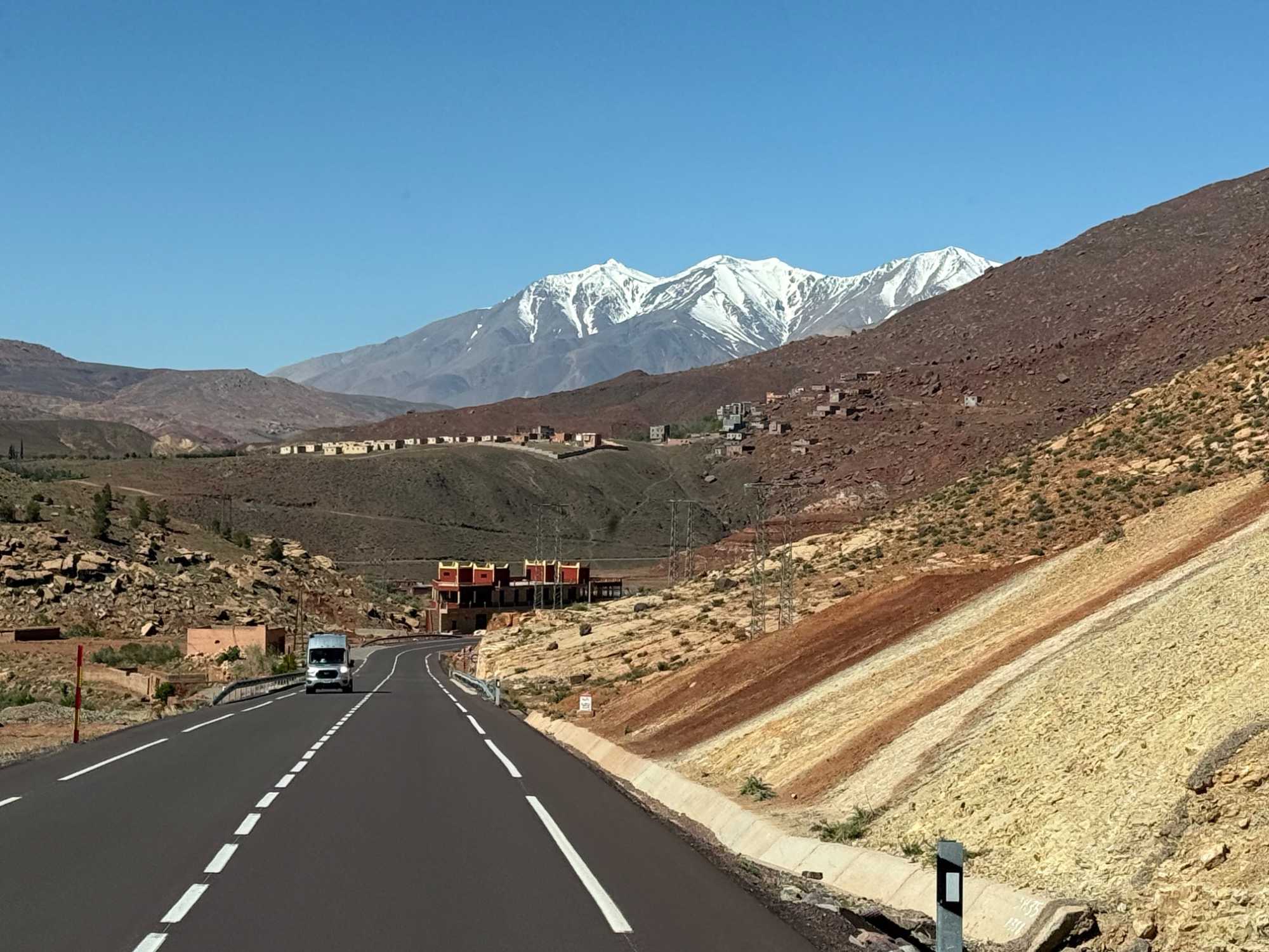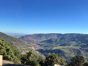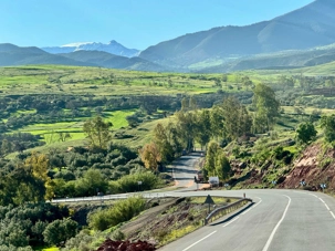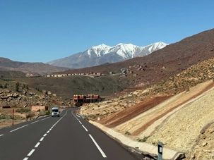 Au fil de notre montée, les paysages se transforment de façon spectaculaire. Nous quittons peu à peu les plaines pour emprunter des routes sinueuses qui s’élèvent à travers des cols impressionnants, dont certains dépassent les 2 000 mètres d’altitude. À chaque virage, le décor change : les teintes ocre et rouges de la terre, les villages berbères accrochés à flanc de montagne, les vallées profondes et les plateaux arides créent un contraste saisissant.