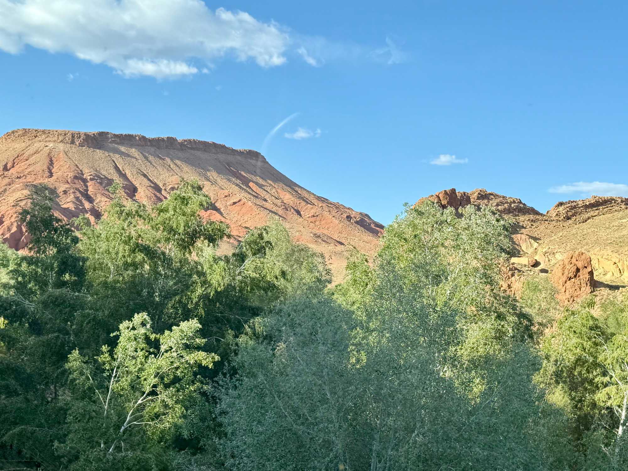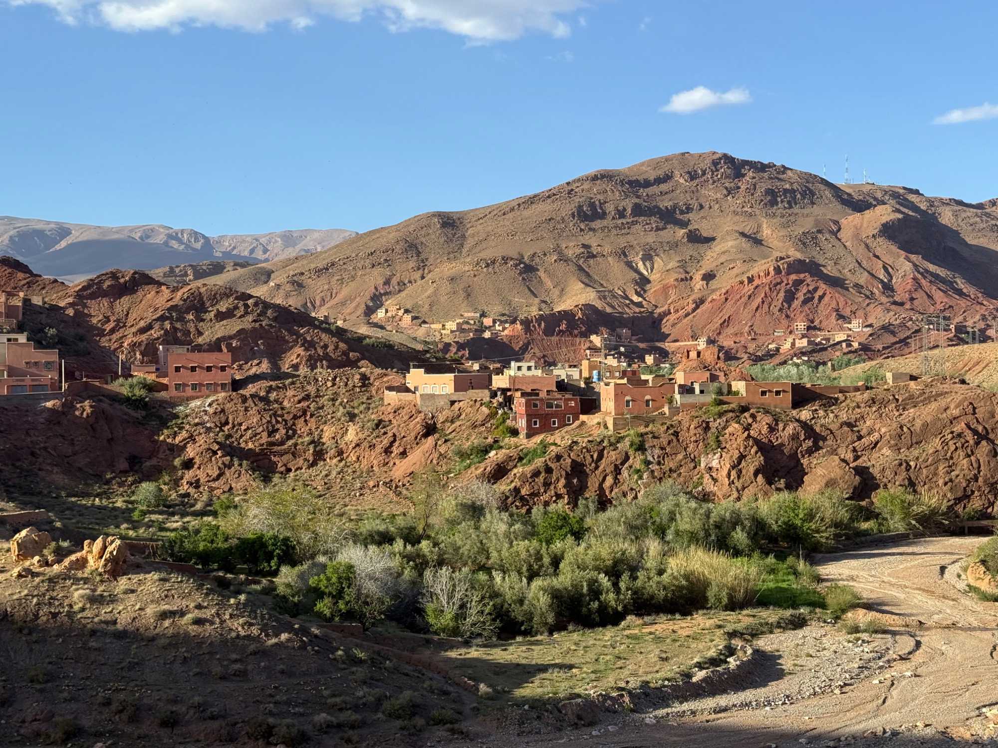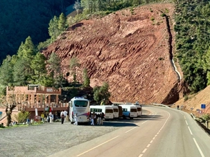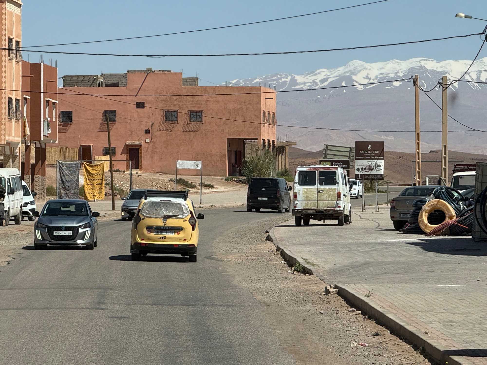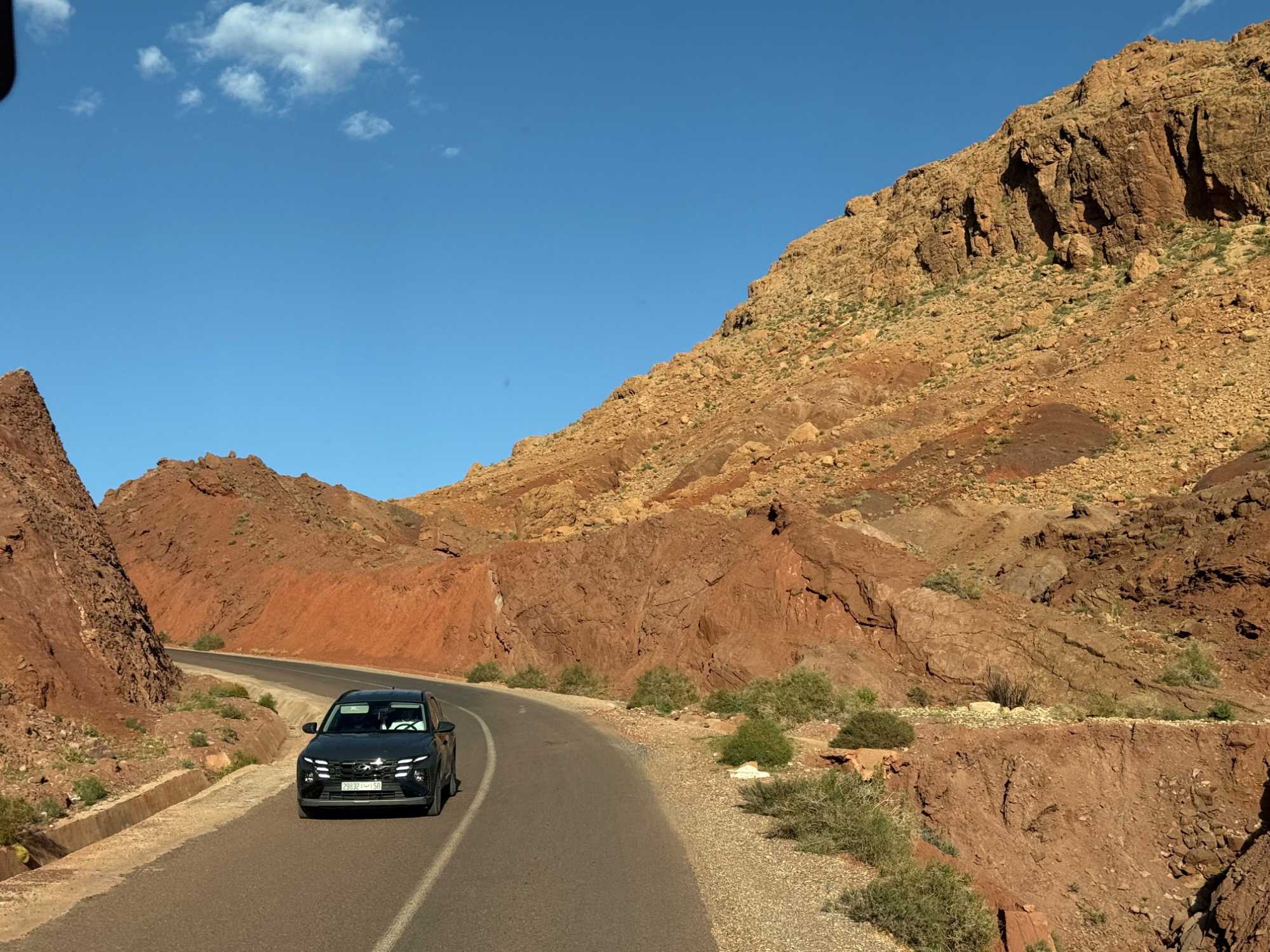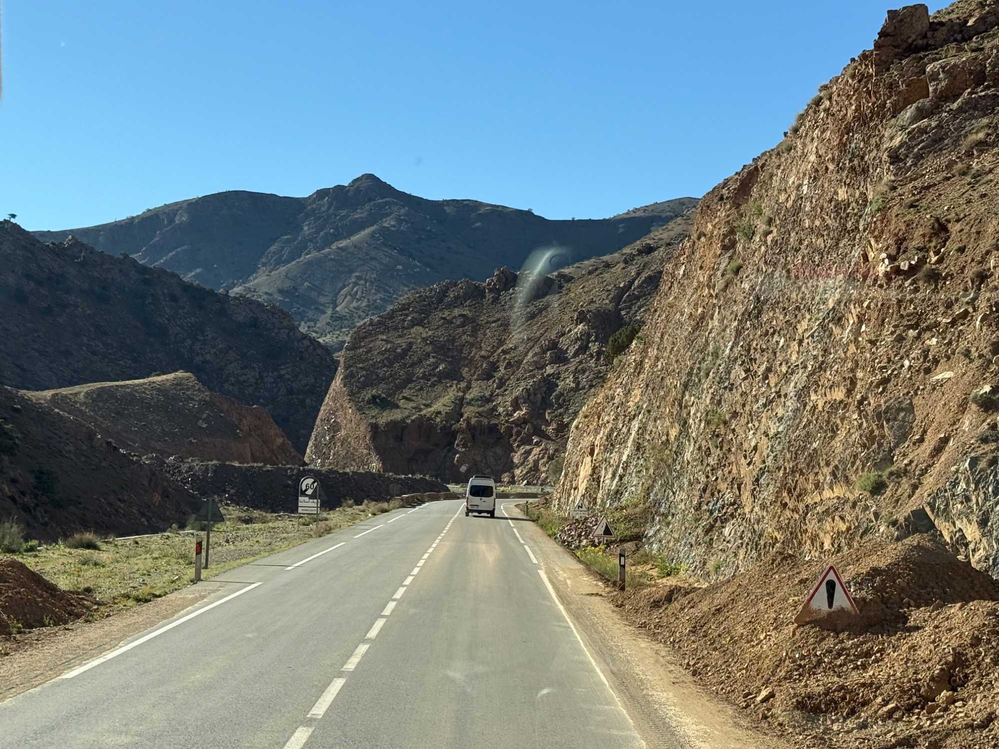 Au fil de notre montée, les paysages se transforment de façon spectaculaire. Nous quittons peu à peu les plaines pour emprunter des routes sinueuses qui s’élèvent à travers des cols impressionnants, dont certains dépassent les 2 000 mètres d’altitude. À chaque virage, le décor change : les teintes ocre et rouges de la terre, les villages berbères accrochés à flanc de montagne, les vallées profondes et les plateaux arides créent un contraste saisissant.