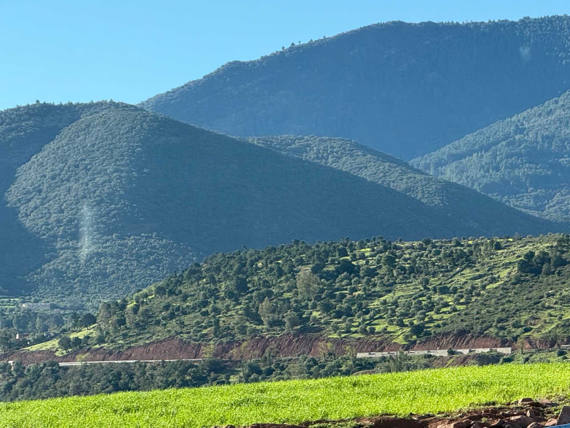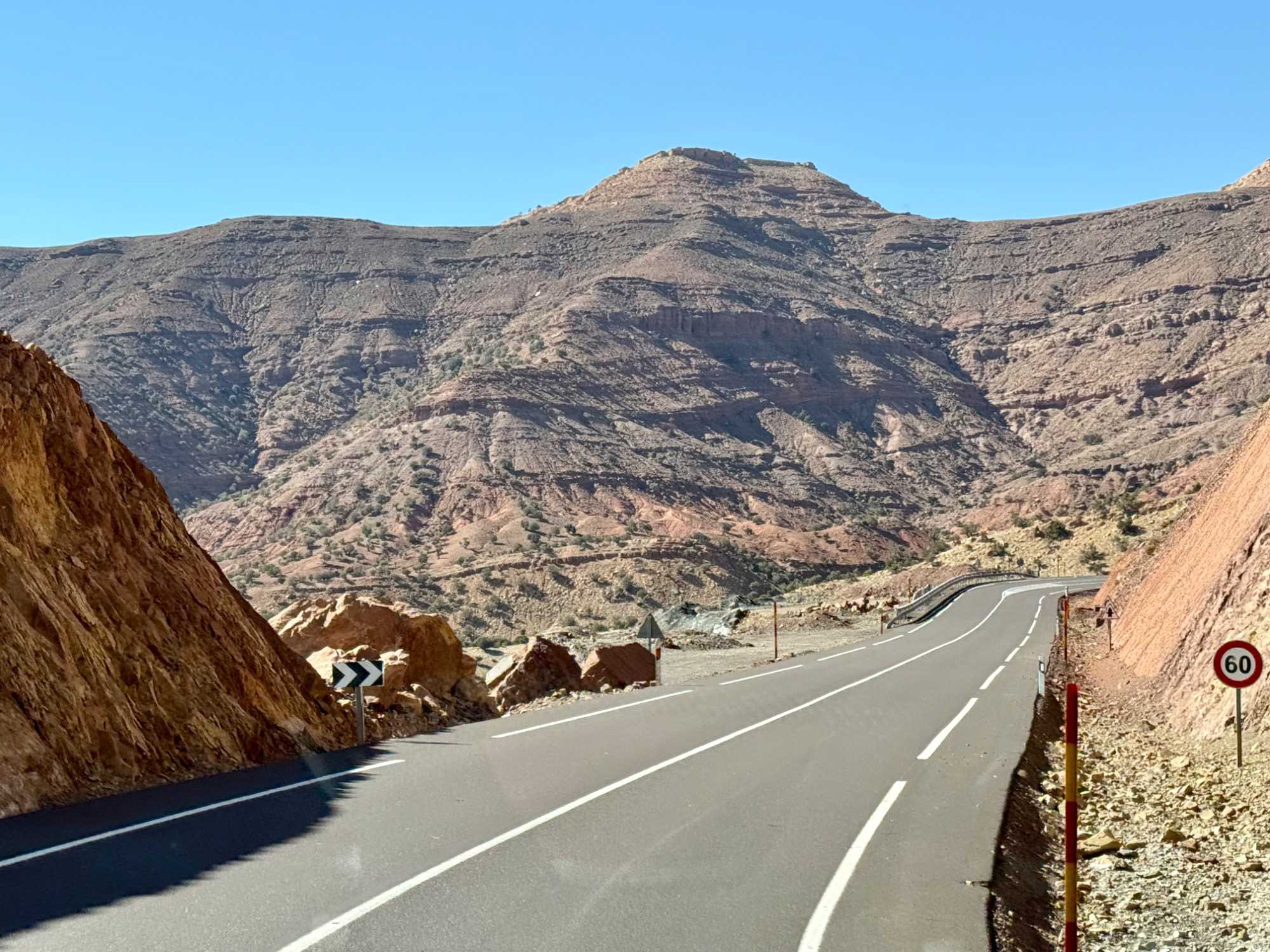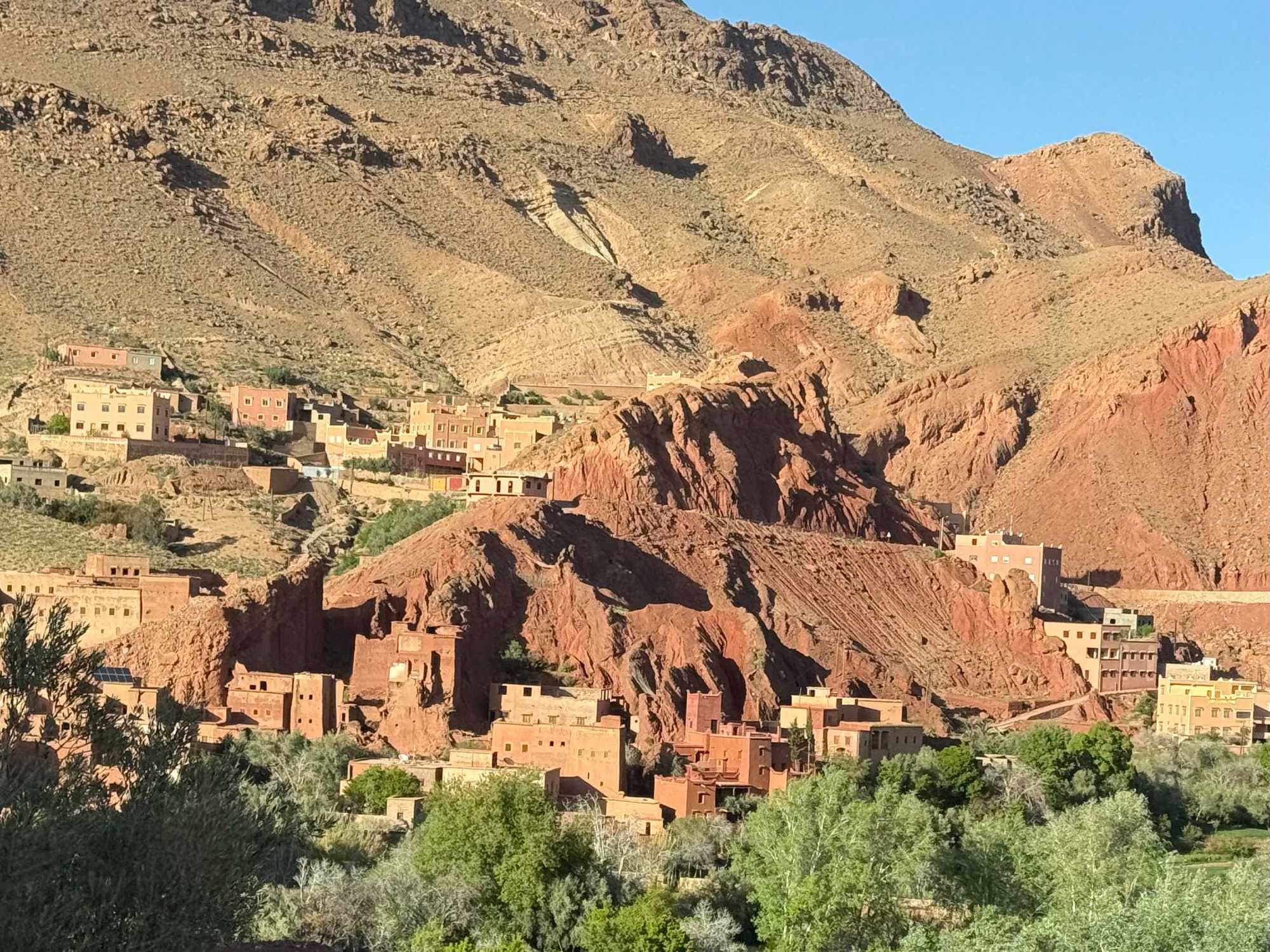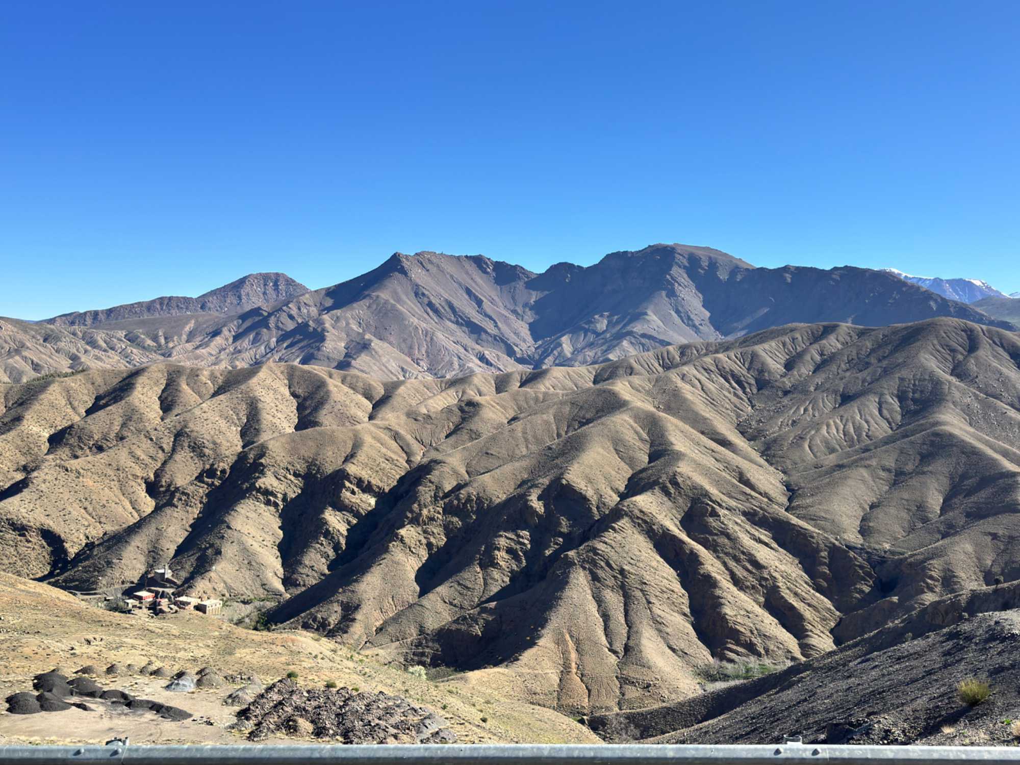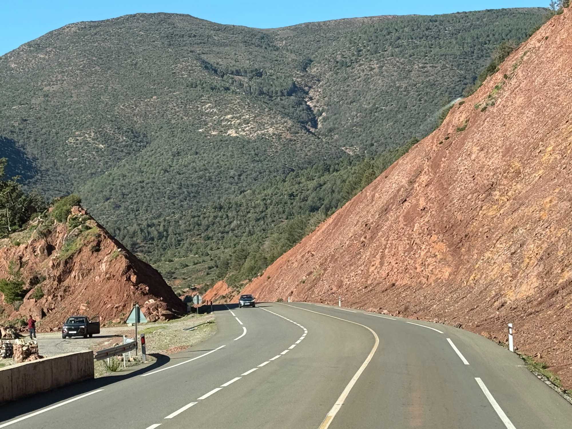 Au fil de notre montée, les paysages se transforment de façon spectaculaire. Nous quittons peu à peu les plaines pour emprunter des routes sinueuses qui s’élèvent à travers des cols impressionnants, dont certains dépassent les 2 000 mètres d’altitude. À chaque virage, le décor change : les teintes ocre et rouges de la terre, les villages berbères accrochés à flanc de montagne, les vallées profondes et les plateaux arides créent un contraste saisissant.