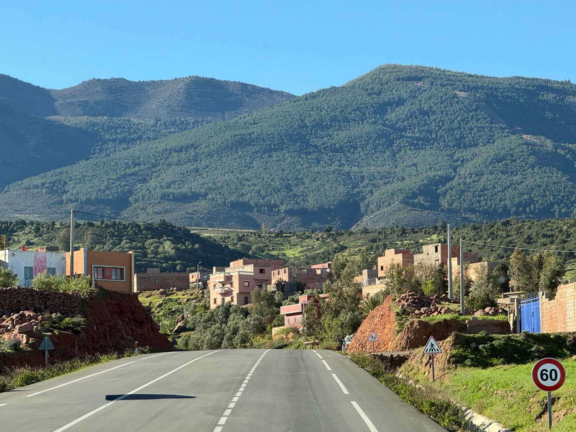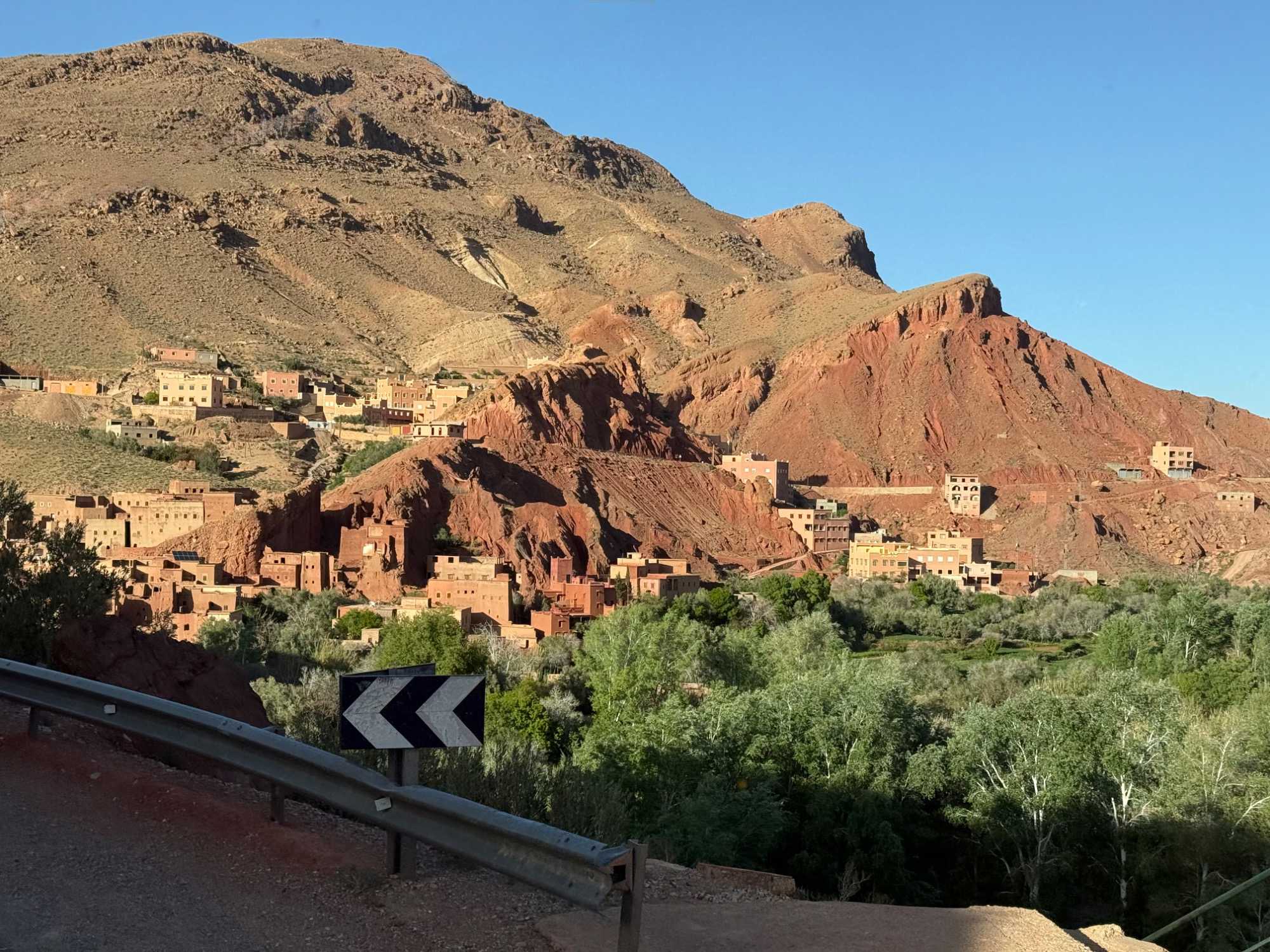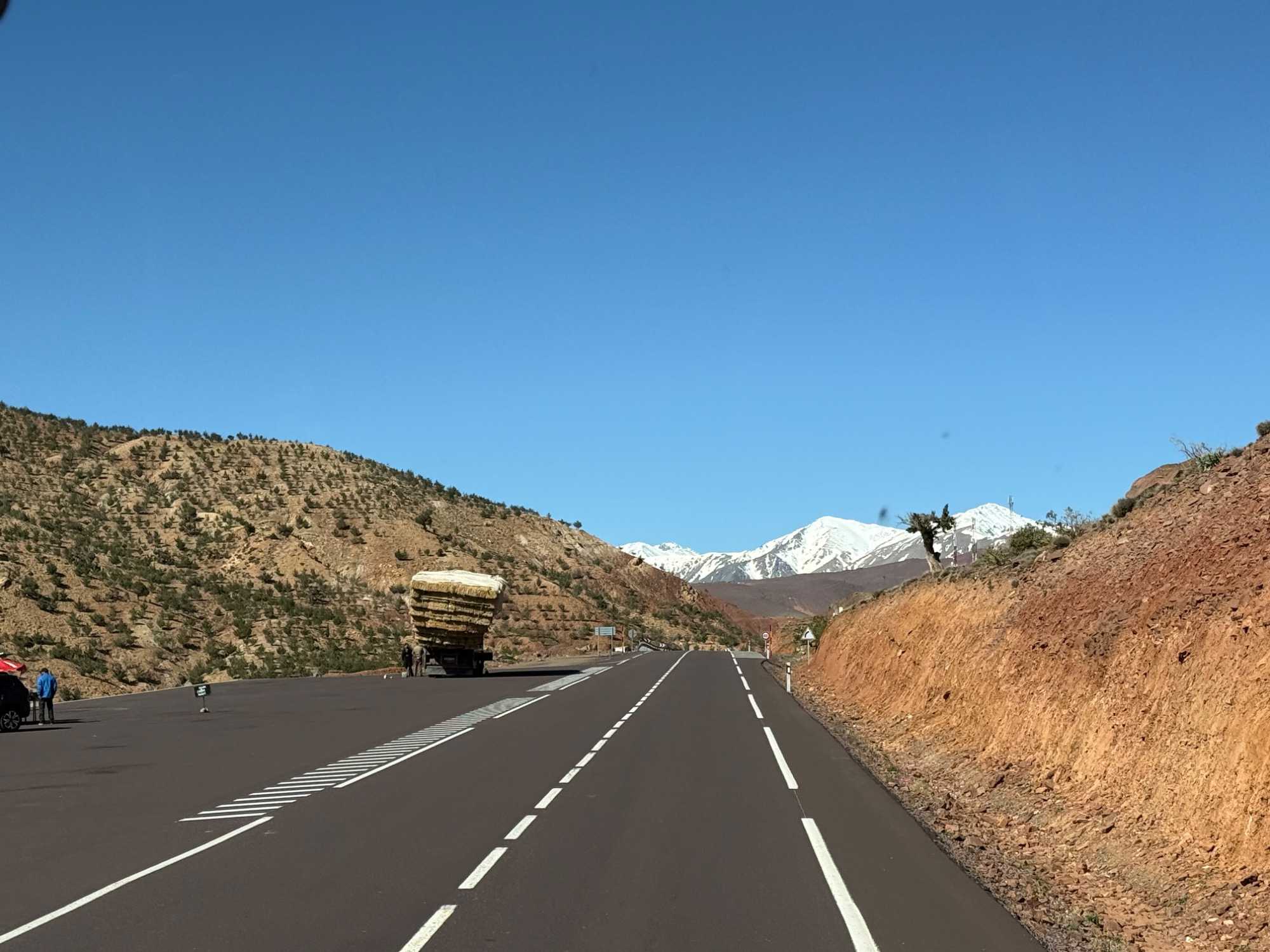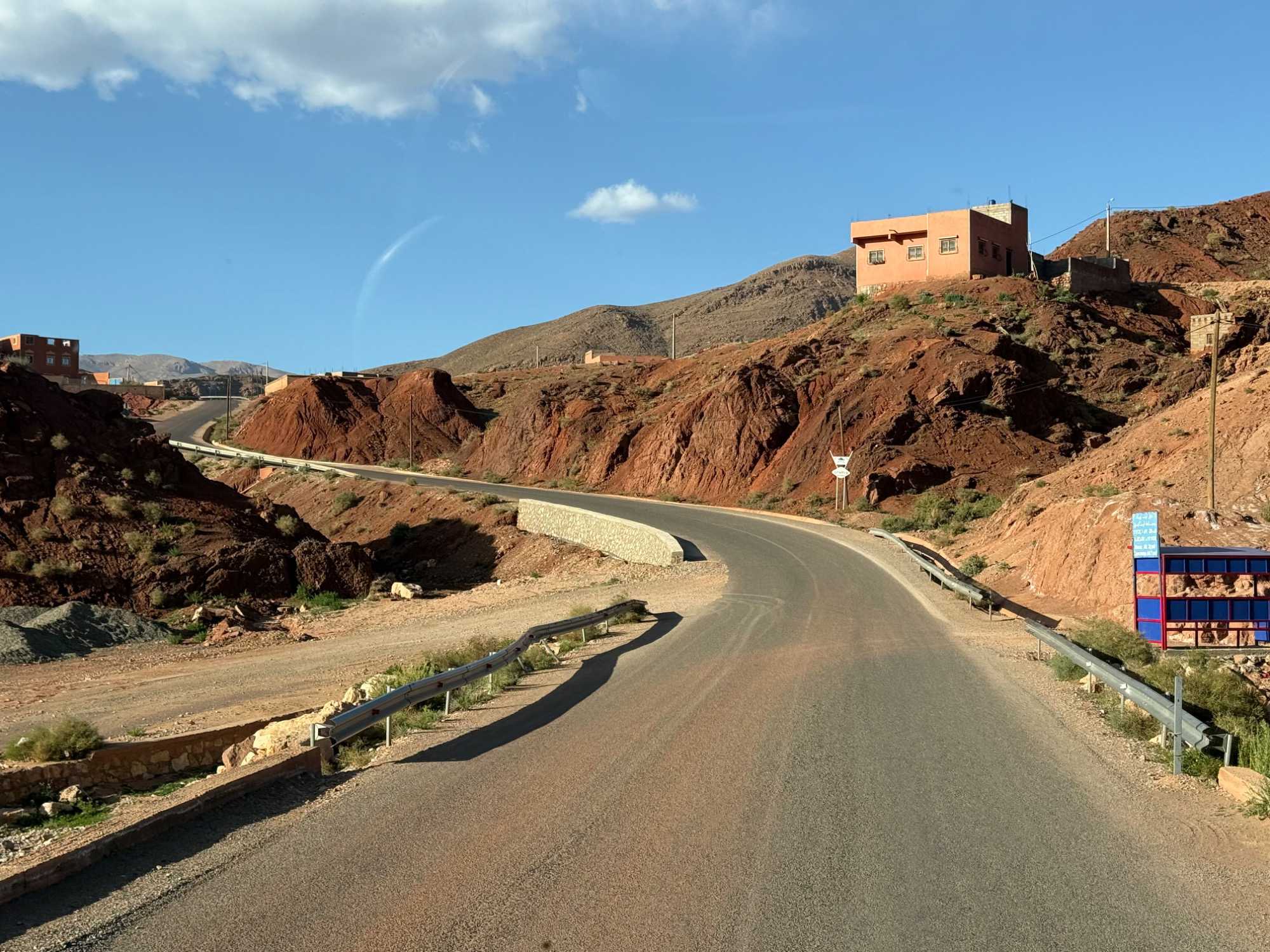 Au fil de notre montée, les paysages se transforment de façon spectaculaire. Nous quittons peu à peu les plaines pour emprunter des routes sinueuses qui s’élèvent à travers des cols impressionnants, dont certains dépassent les 2 000 mètres d’altitude. À chaque virage, le décor change : les teintes ocre et rouges de la terre, les villages berbères accrochés à flanc de montagne, les vallées profondes et les plateaux arides créent un contraste saisissant.