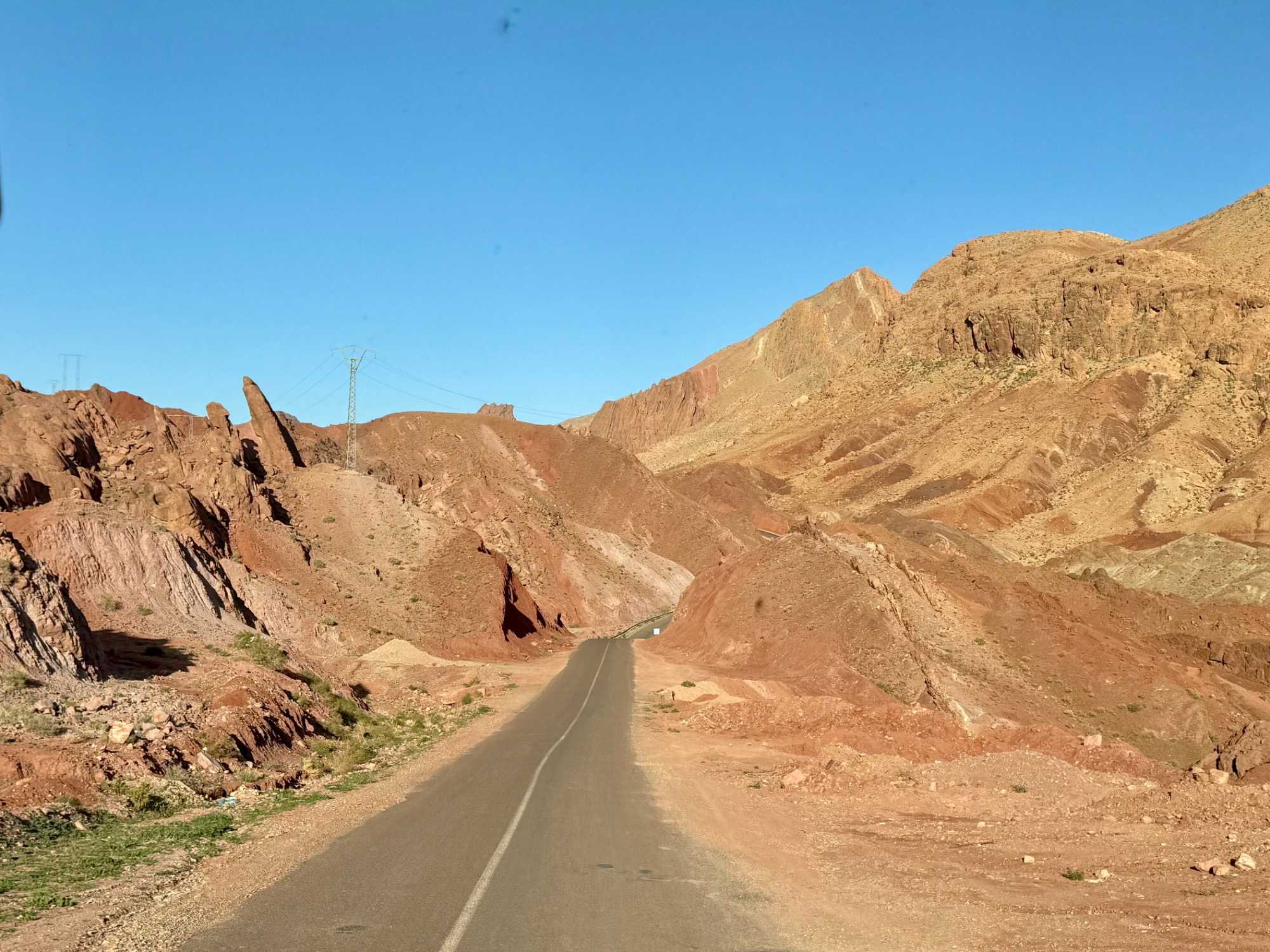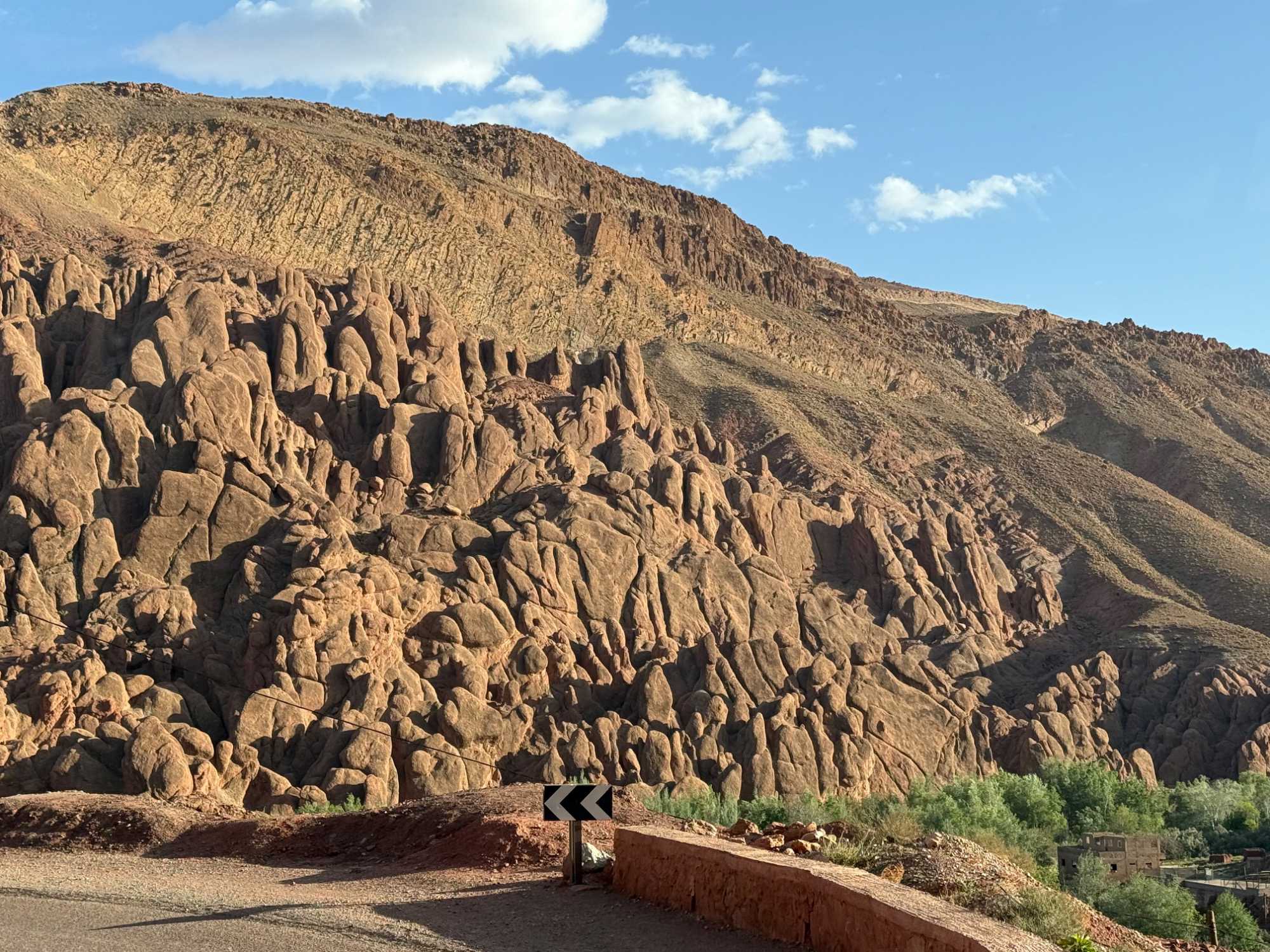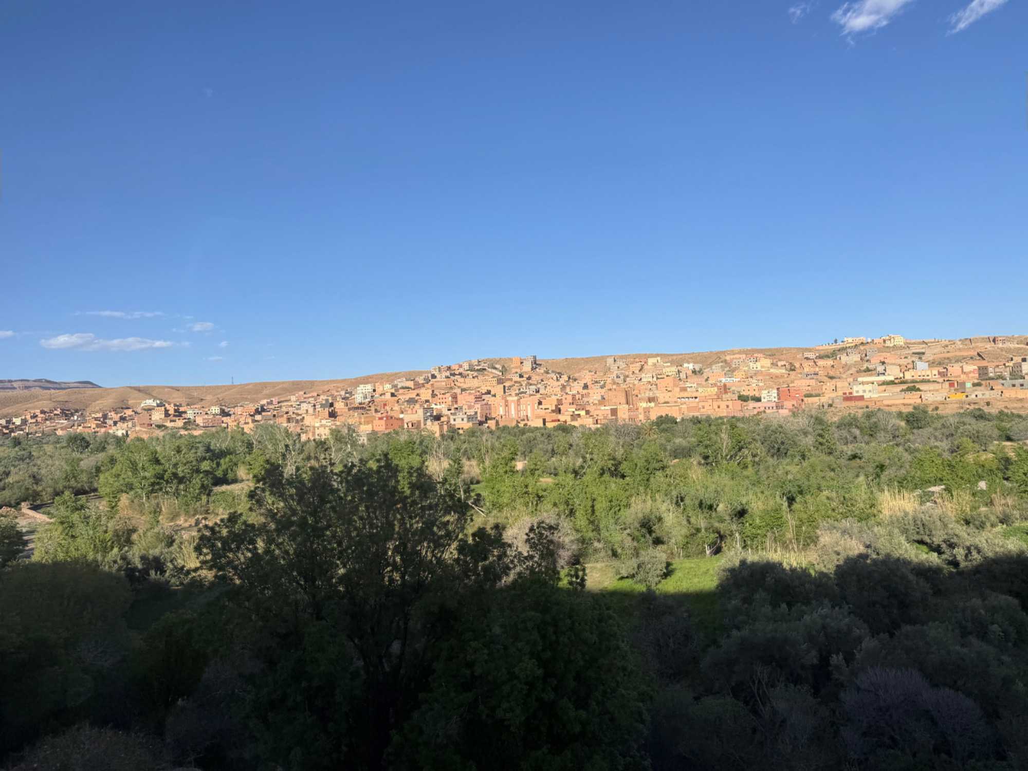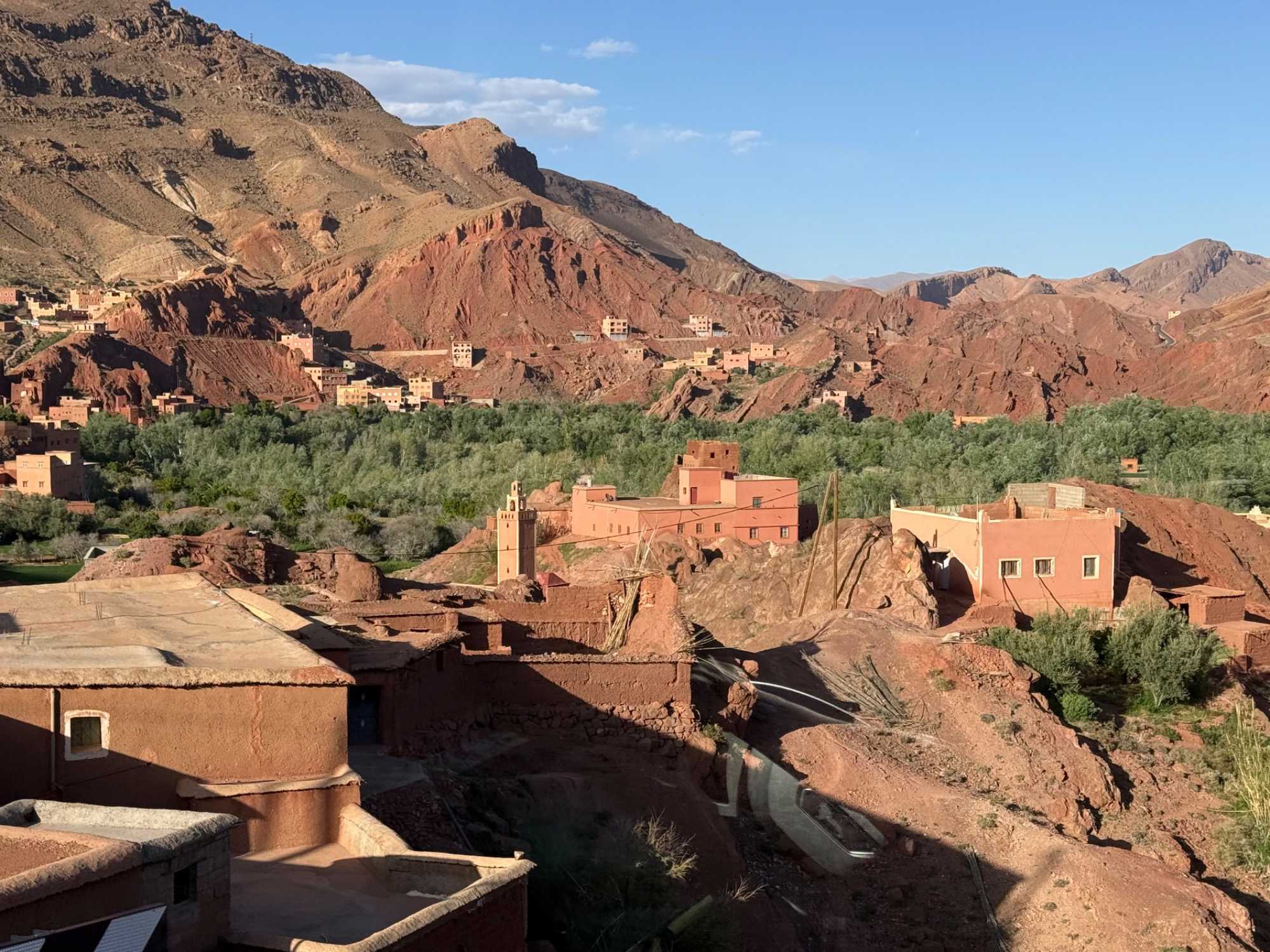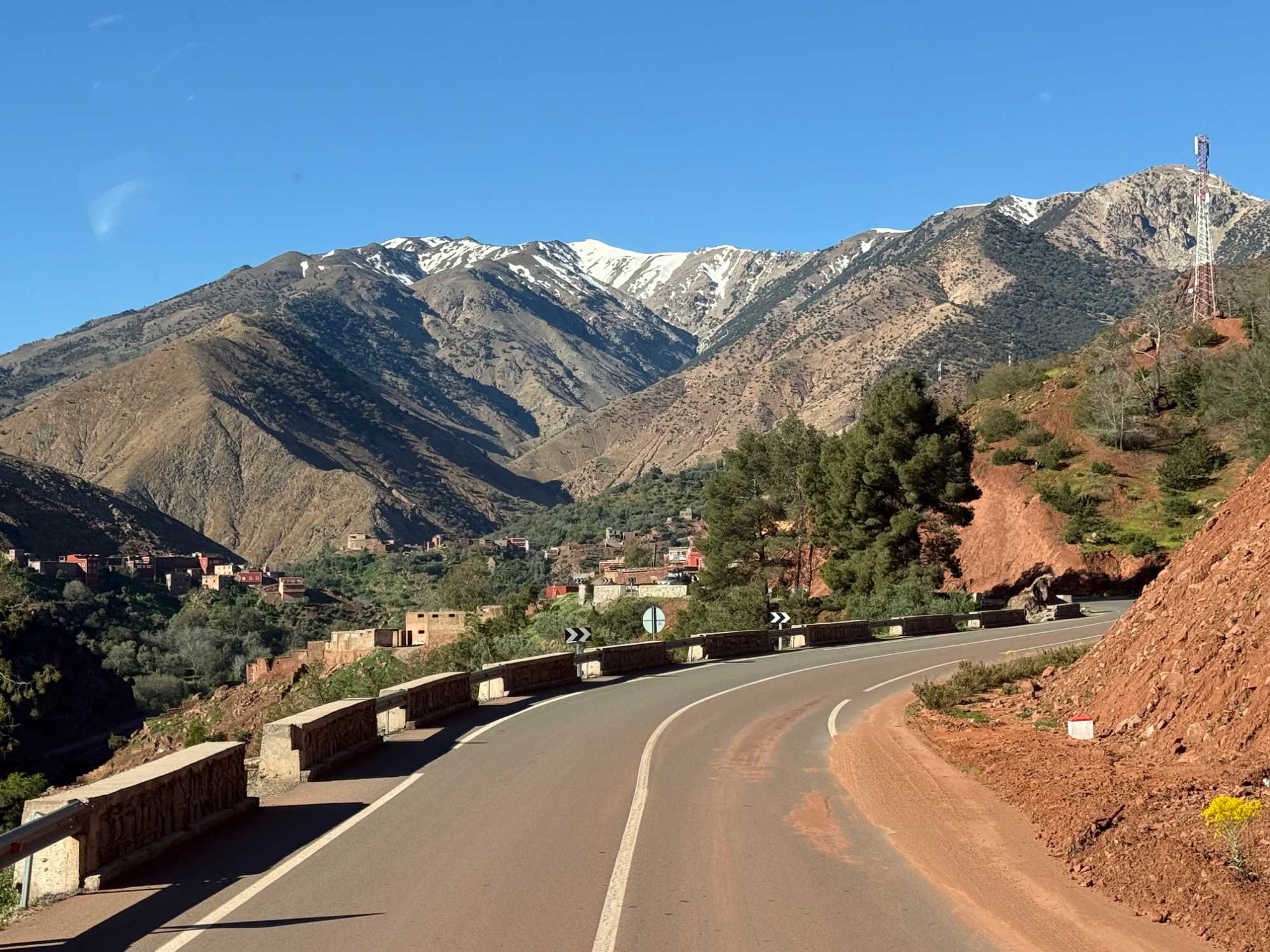 Au fil de notre montée, les paysages se transforment de façon spectaculaire. Nous quittons peu à peu les plaines pour emprunter des routes sinueuses qui s’élèvent à travers des cols impressionnants, dont certains dépassent les 2 000 mètres d’altitude. À chaque virage, le décor change : les teintes ocre et rouges de la terre, les villages berbères accrochés à flanc de montagne, les vallées profondes et les plateaux arides créent un contraste saisissant.