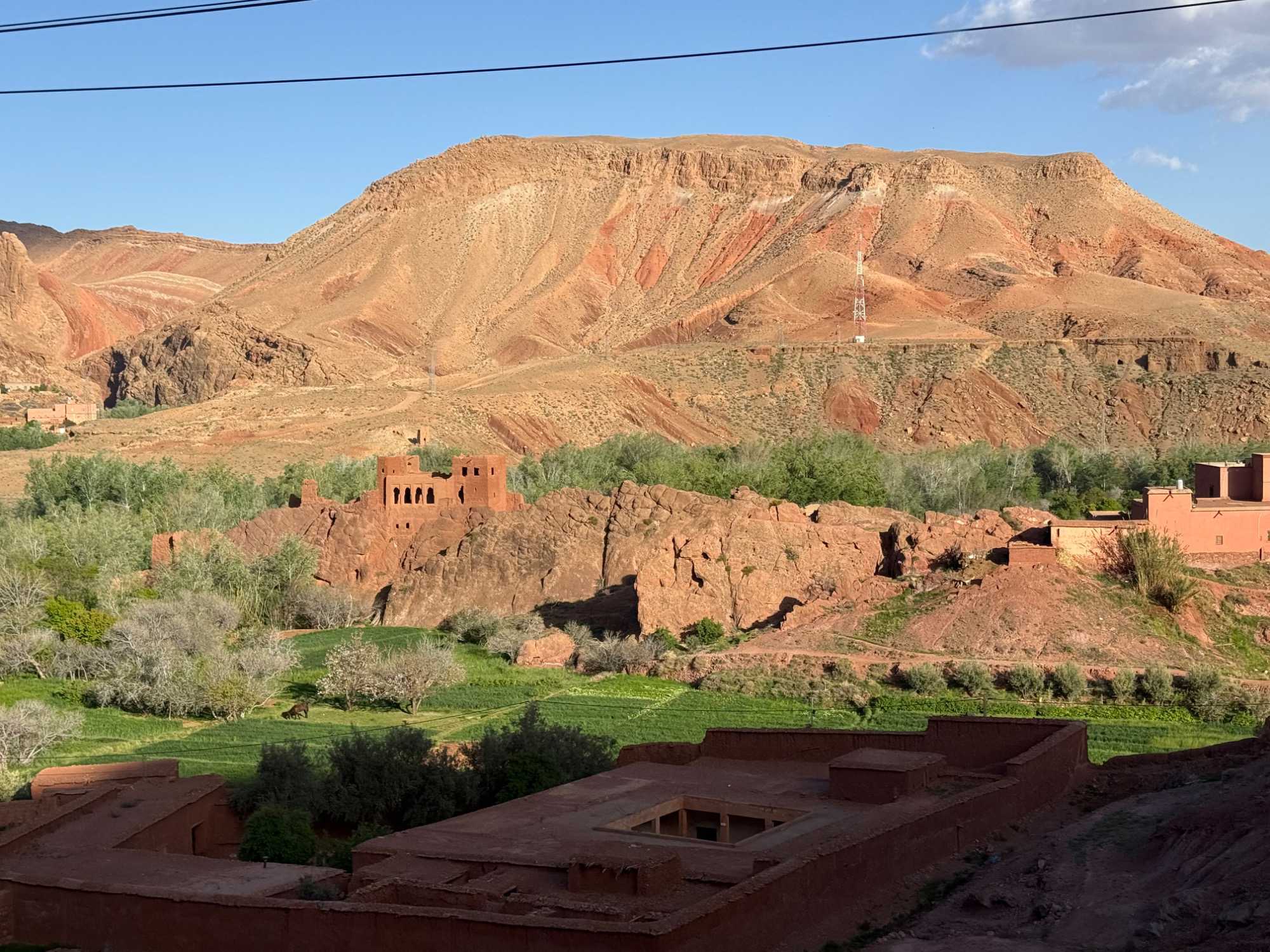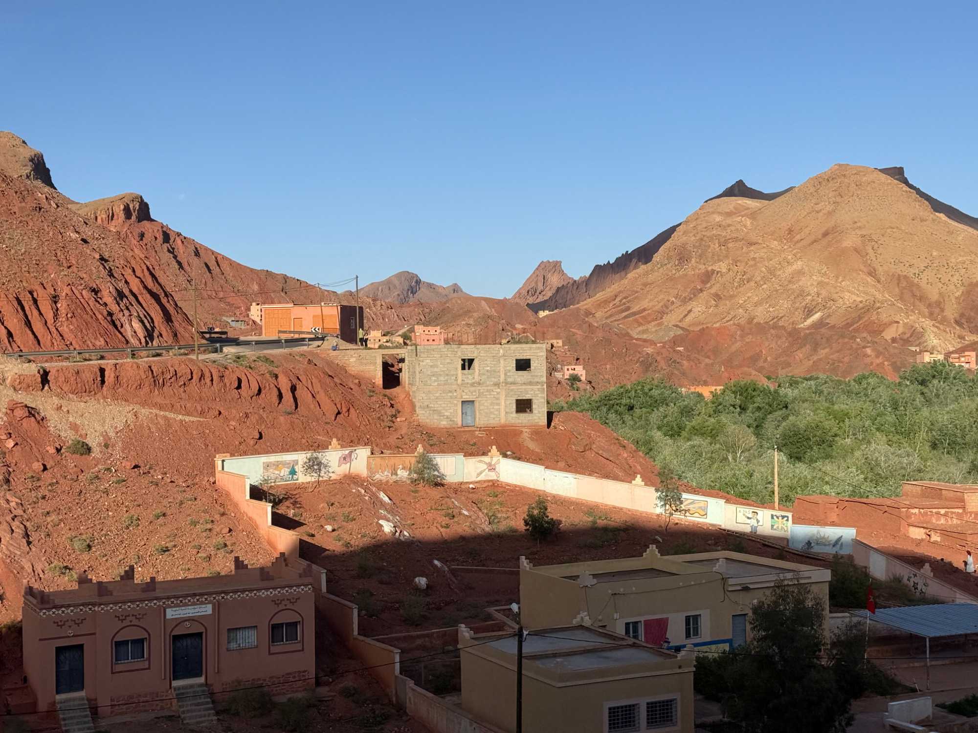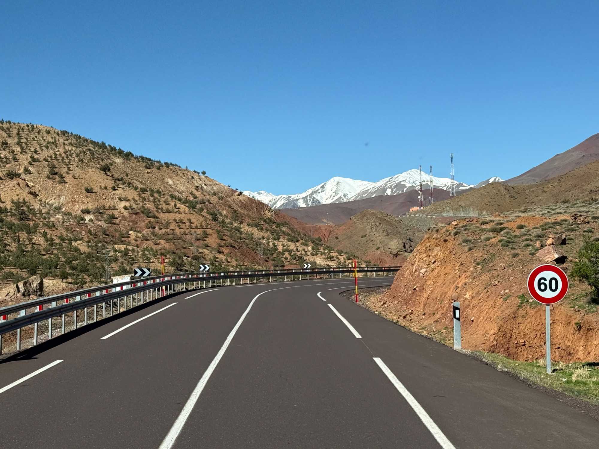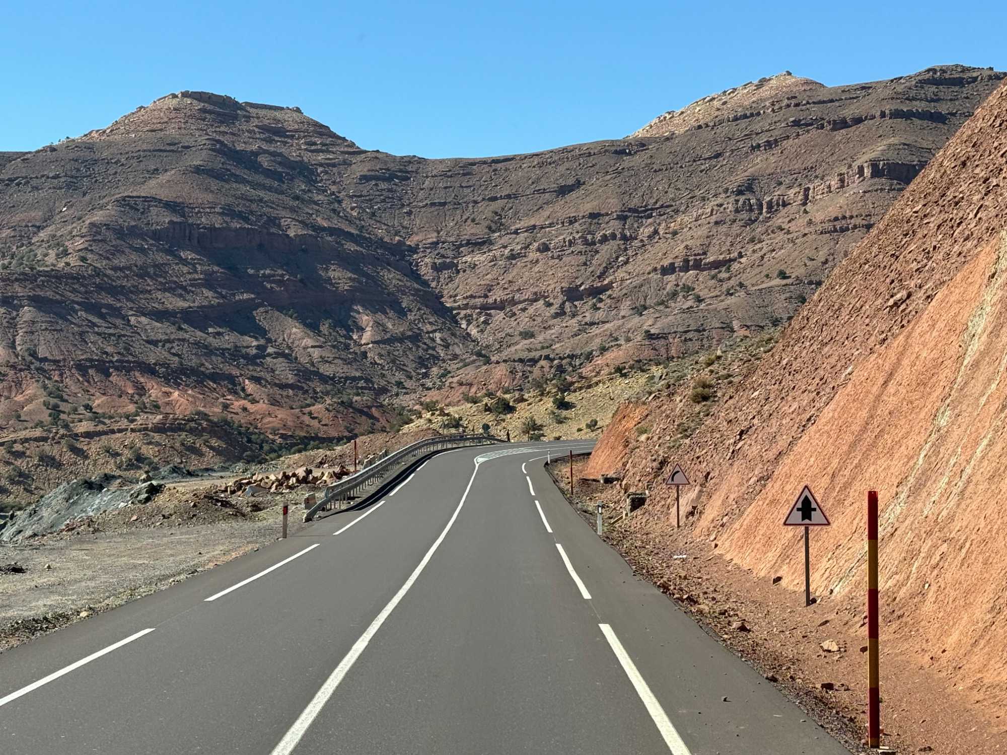 Au fil de notre montée, les paysages se transforment de façon spectaculaire. Nous quittons peu à peu les plaines pour emprunter des routes sinueuses qui s’élèvent à travers des cols impressionnants, dont certains dépassent les 2 000 mètres d’altitude. À chaque virage, le décor change : les teintes ocre et rouges de la terre, les villages berbères accrochés à flanc de montagne, les vallées profondes et les plateaux arides créent un contraste saisissant.