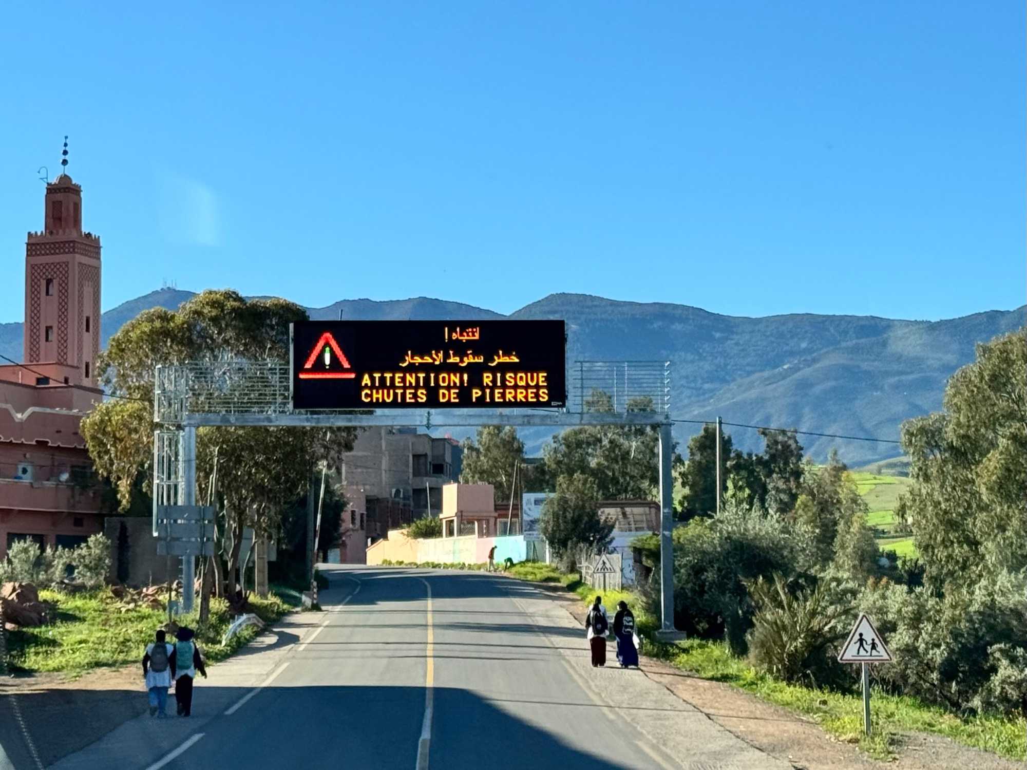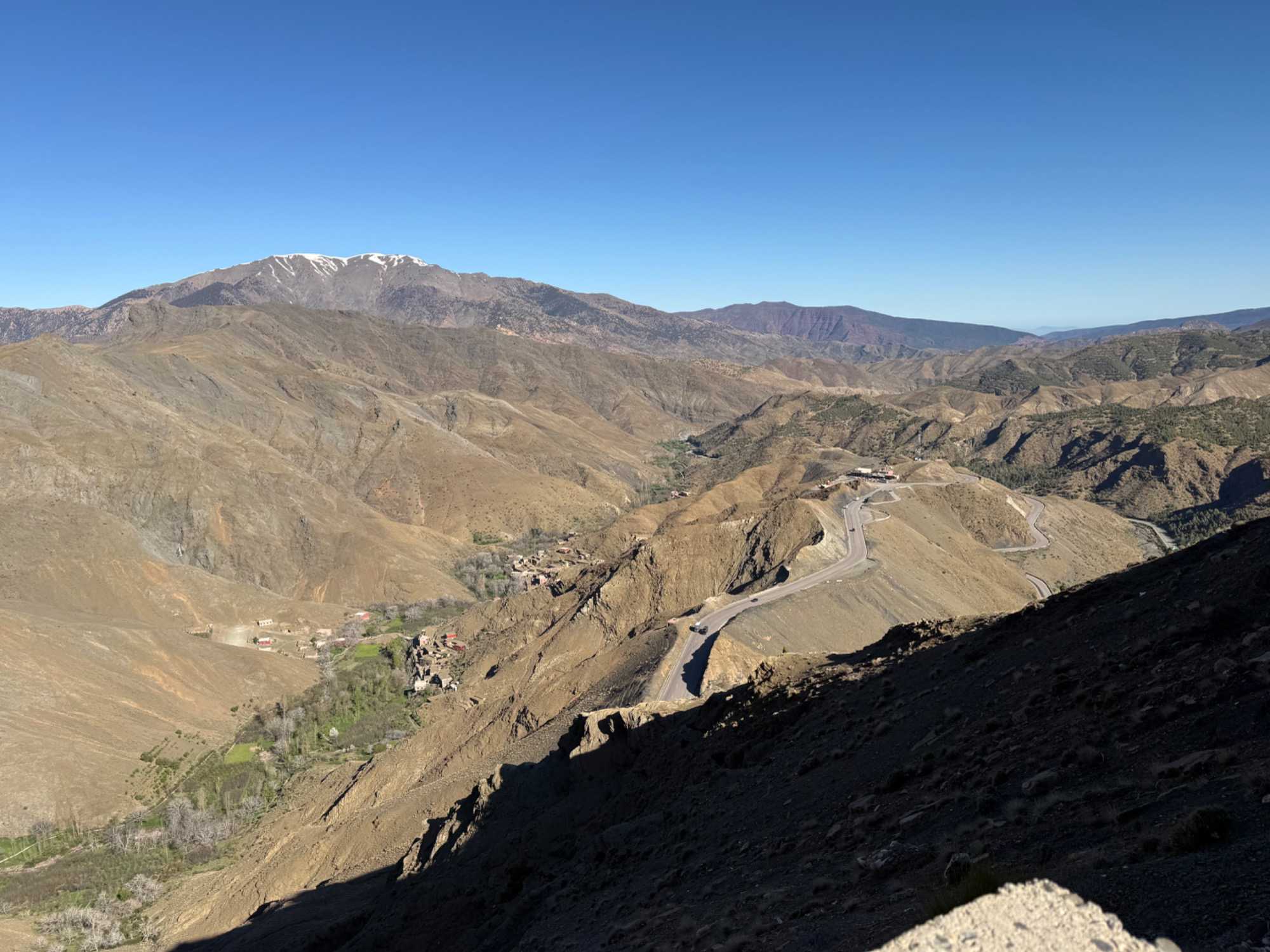 On ressent réellement cette traversée en altitude. L’air devient plus frais, la lumière plus vive, et les panoramas de plus en plus grandioses. Par moments, la route semble suspendue entre ciel et terre, offrant des points de vue à couper le souffle sur les reliefs escarpés du Haut Atlas.