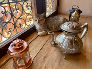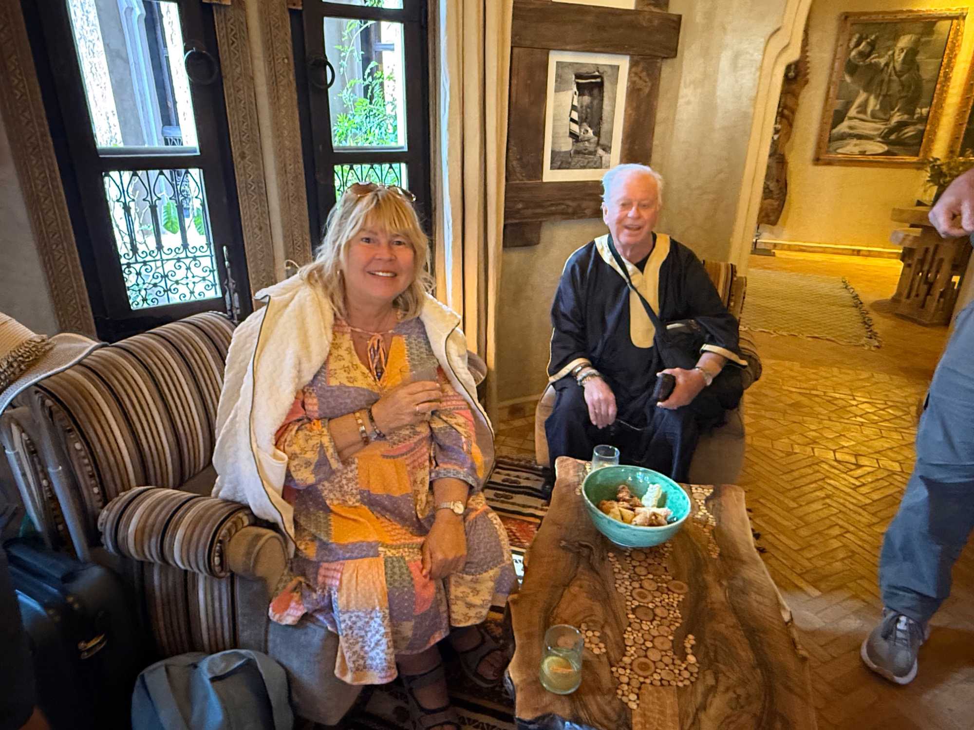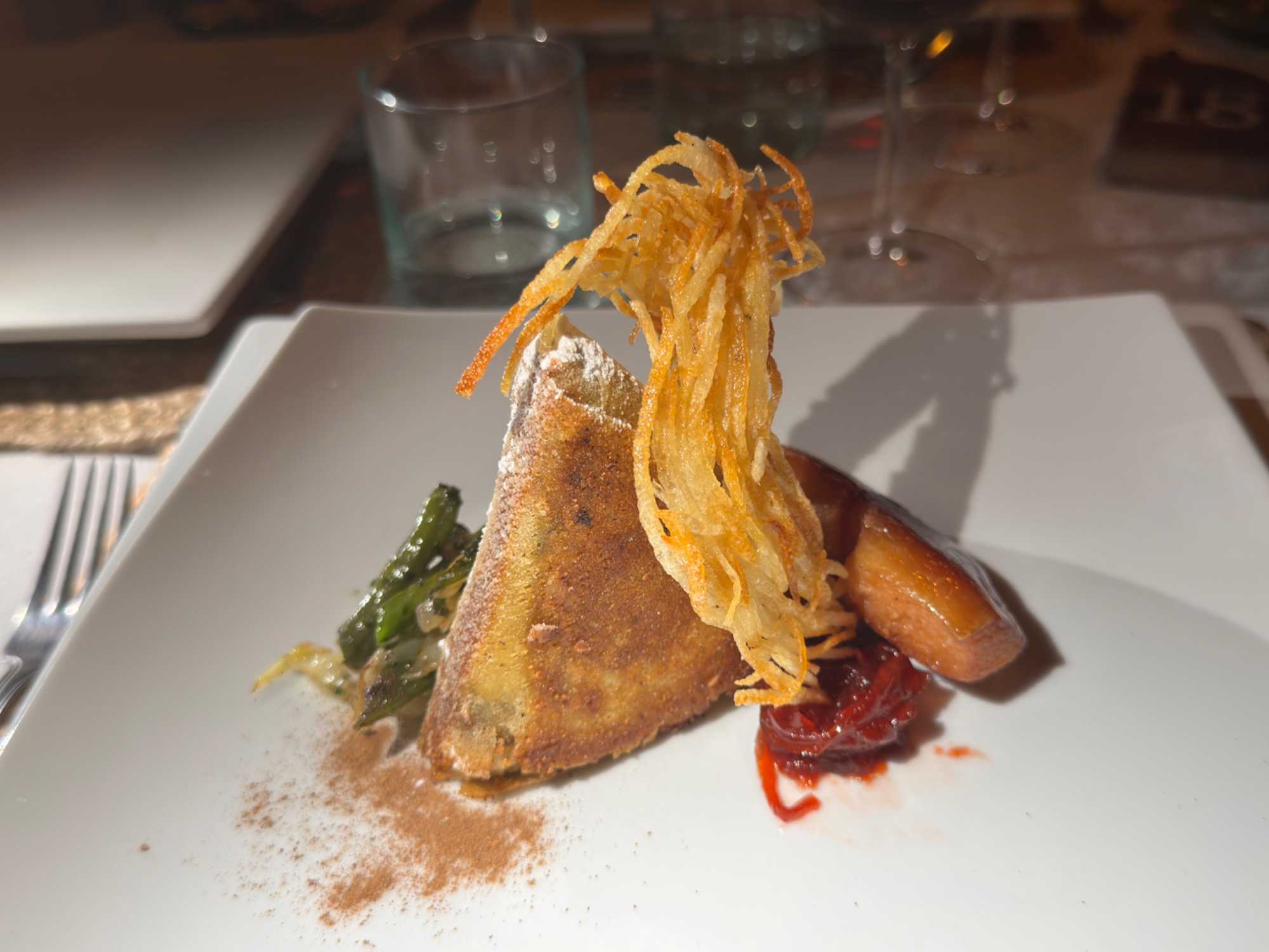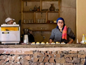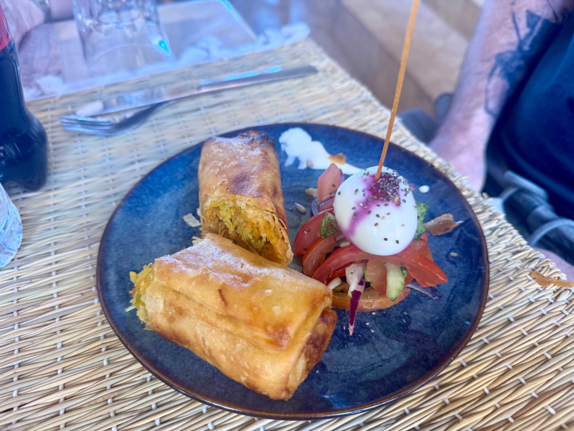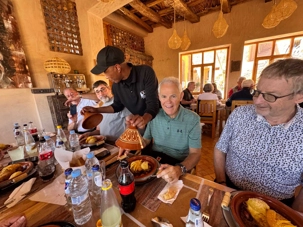 Le repas est une véritable découverte culinaire. Nous dégustons notre première tajine, un délicieux plat de poulet au citron, accompagné d’entrées savoureuses comme des feuilletés aux légumes parfumés au cumin, curcuma et curry. Le tout est suivi d’un dessert exquis, ainsi que de petites douceurs marocaines au miel, aux amandes et aux noix.