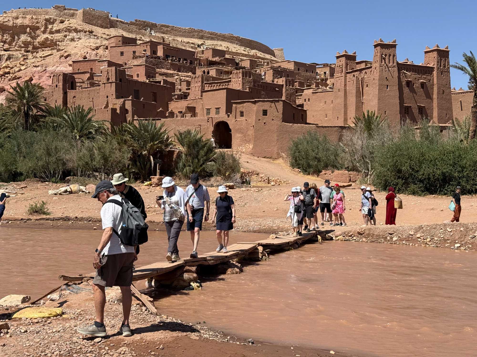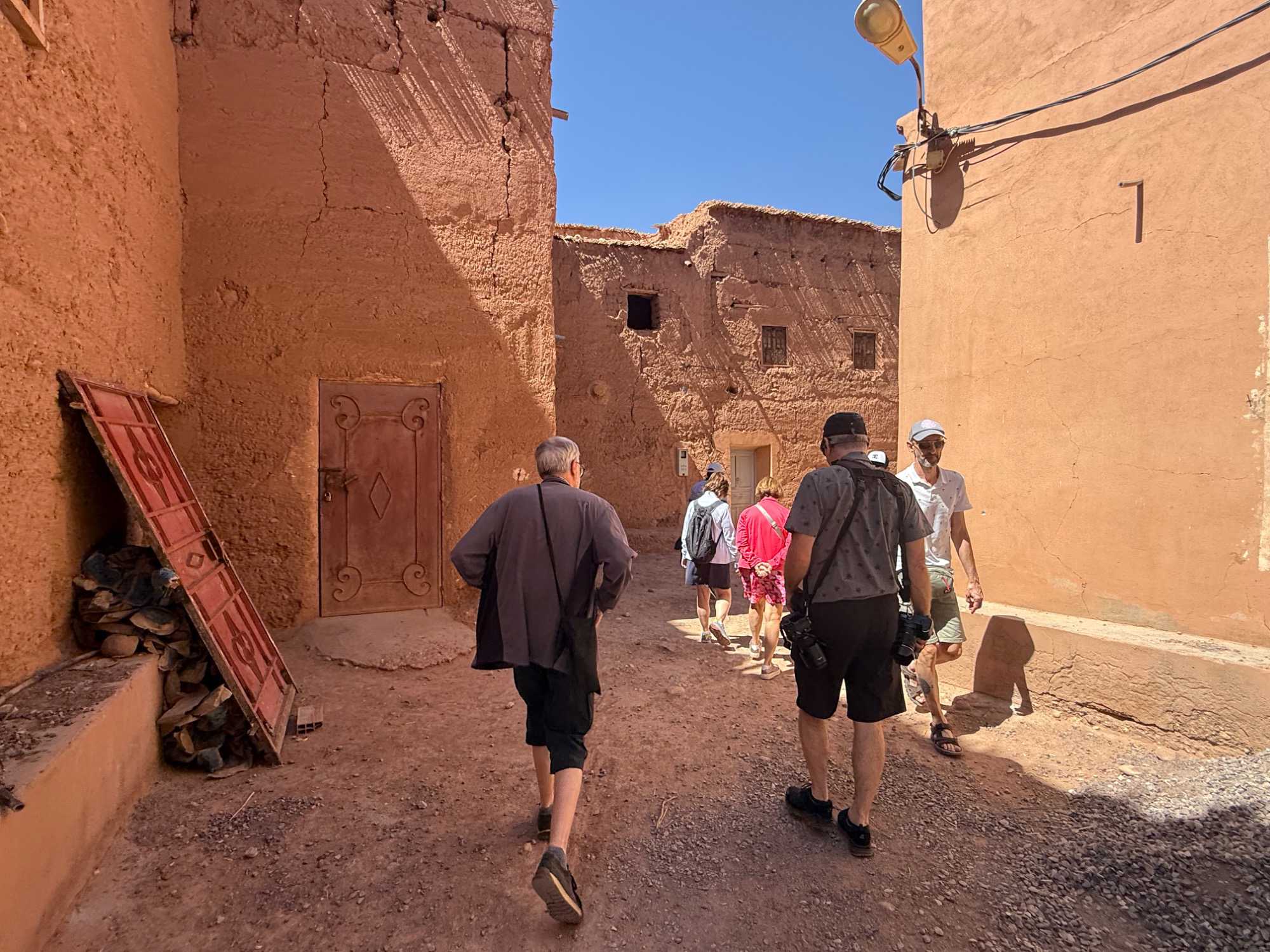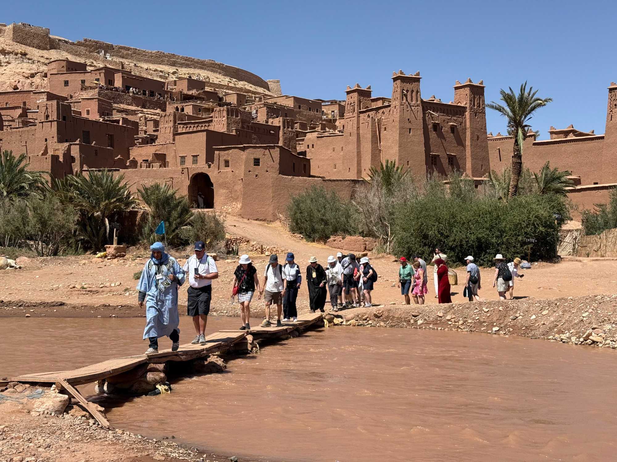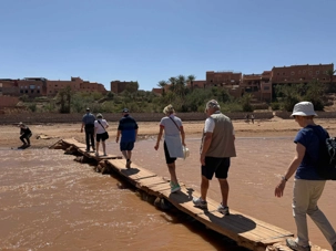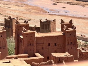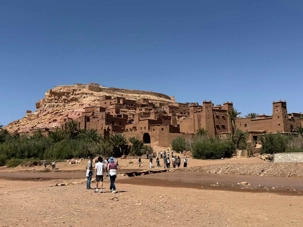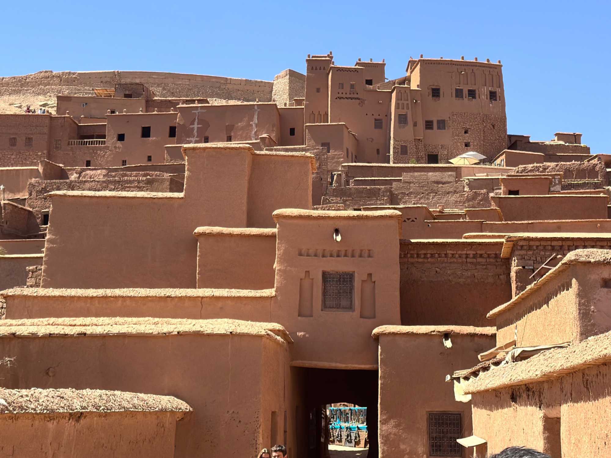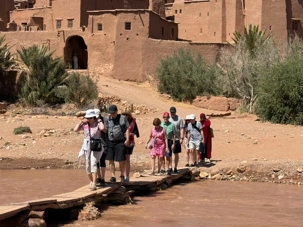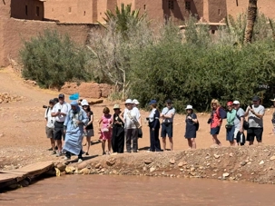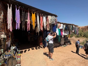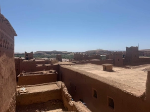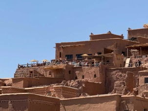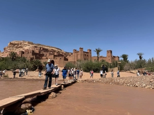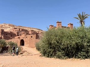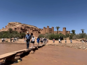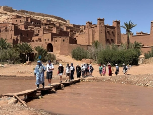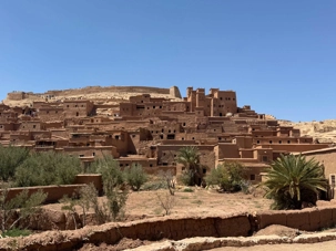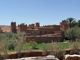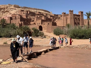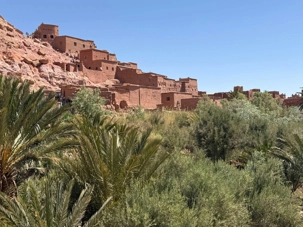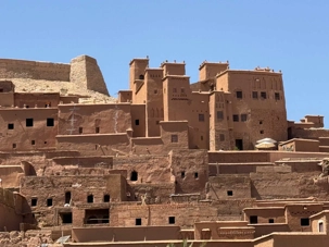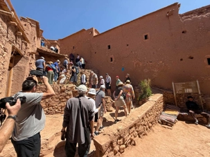 Nous reprenons ensuite la route en direction d’un lieu emblématique : Aït Benhaddou, classé au patrimoine mondial de l’UNESCO. Nous arrivons en fin de matinée dans ce village fortifié absolument fascinant. Dès notre arrivée, le décor est saisissant : un ensemble de kasbahs en terre crue, aux teintes d’argile rouge, qui semblent se fondre dans le paysage désertique environnant.