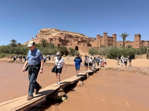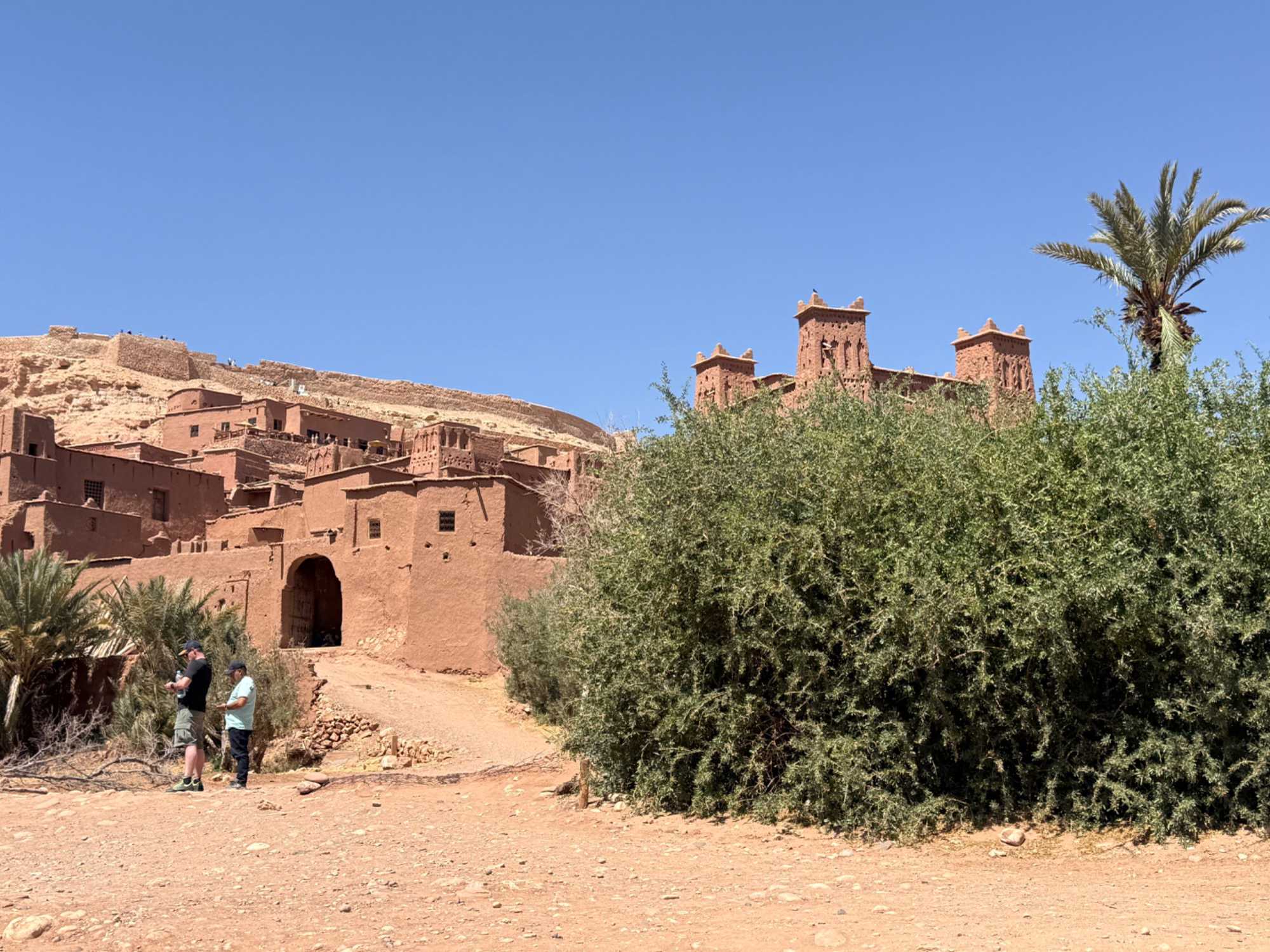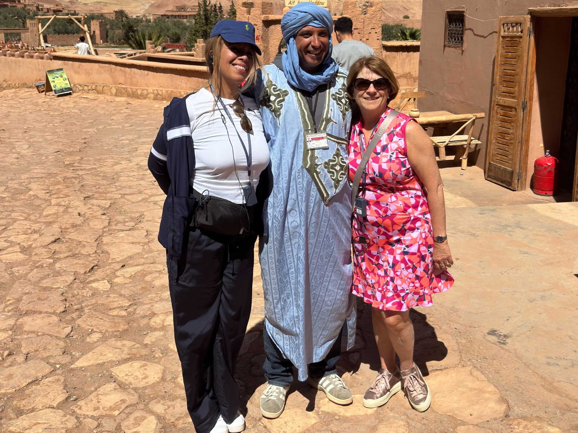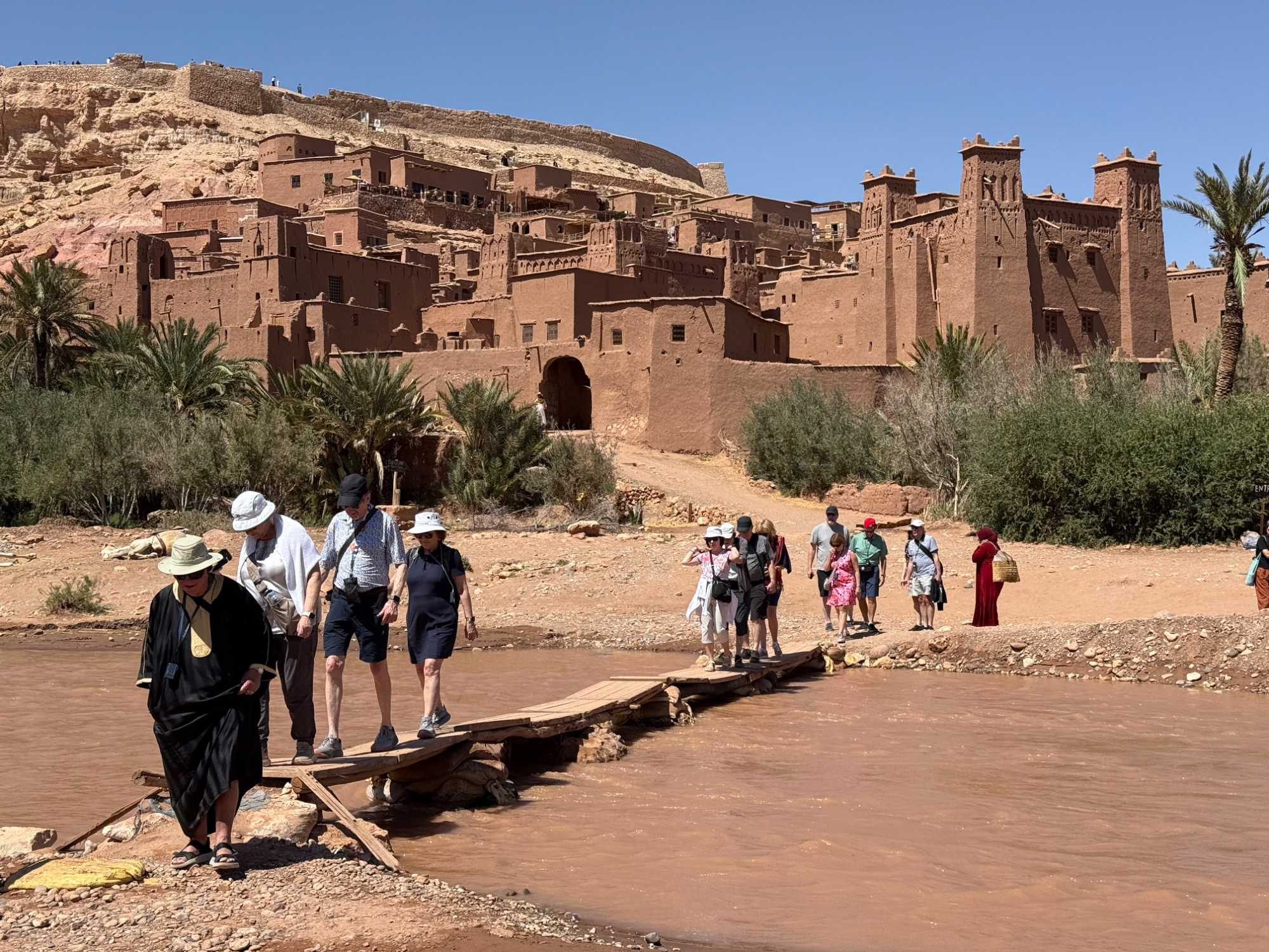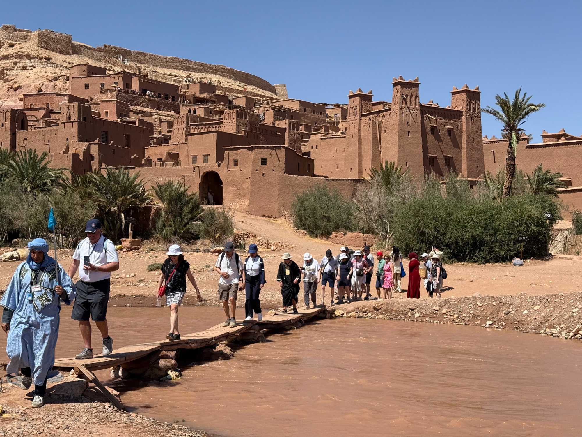 Nous reprenons ensuite la route en direction d’un lieu emblématique : Aït Benhaddou, classé au patrimoine mondial de l’UNESCO. Nous arrivons en fin de matinée dans ce village fortifié absolument fascinant. Dès notre arrivée, le décor est saisissant : un ensemble de kasbahs en terre crue, aux teintes d’argile rouge, qui semblent se fondre dans le paysage désertique environnant.
