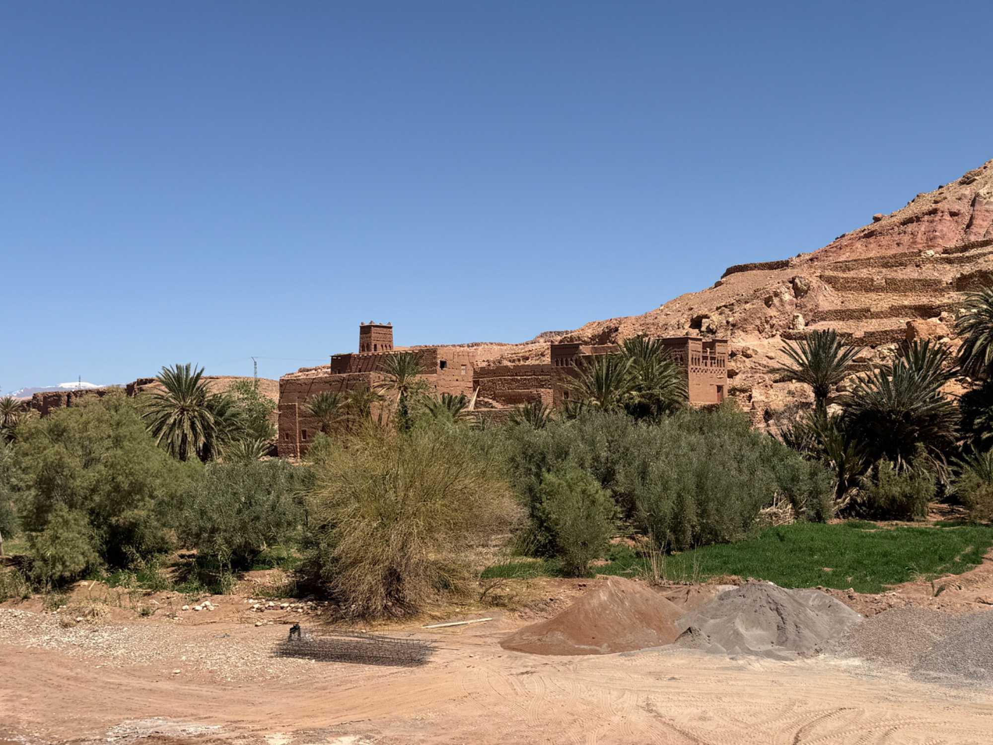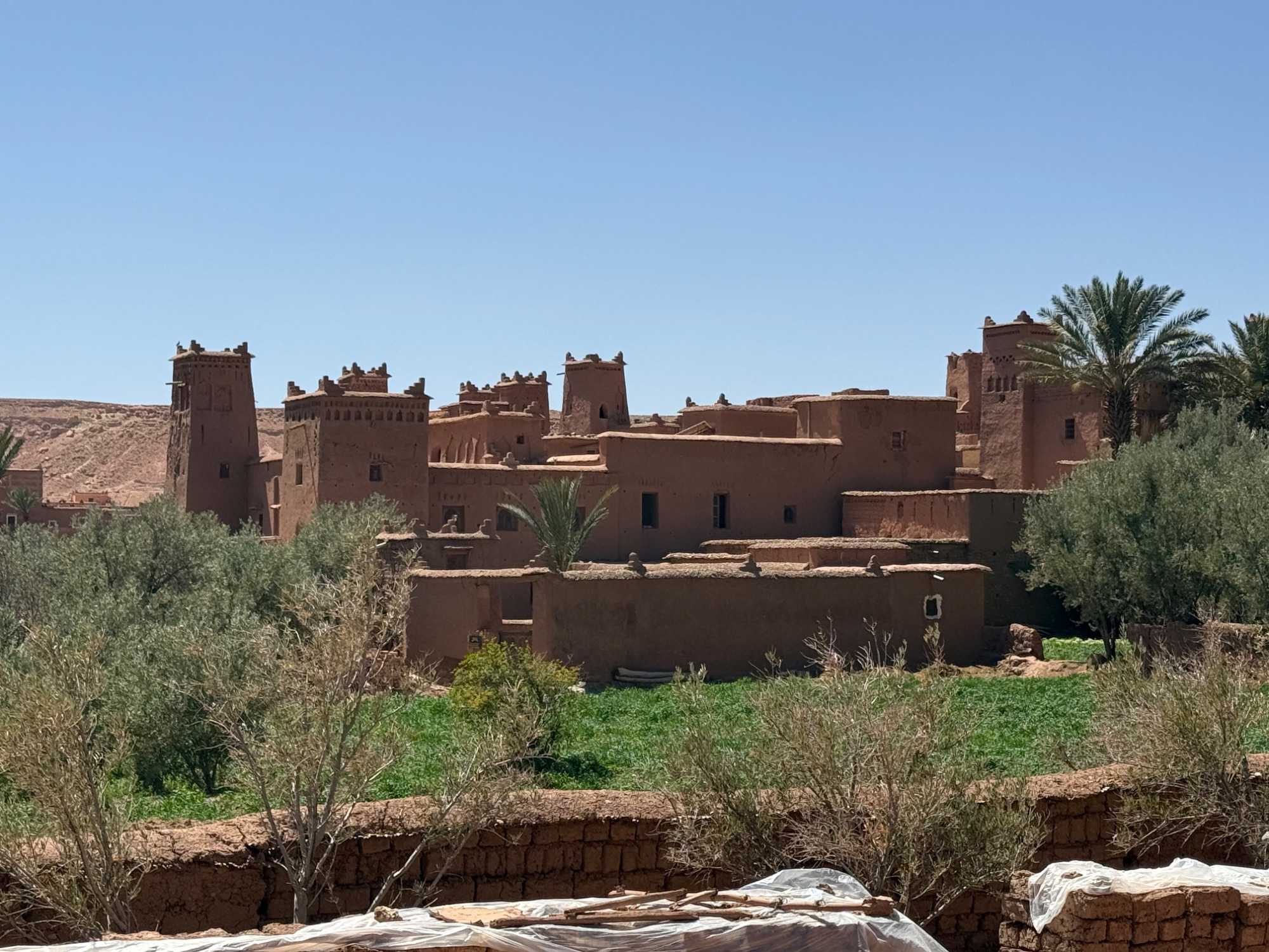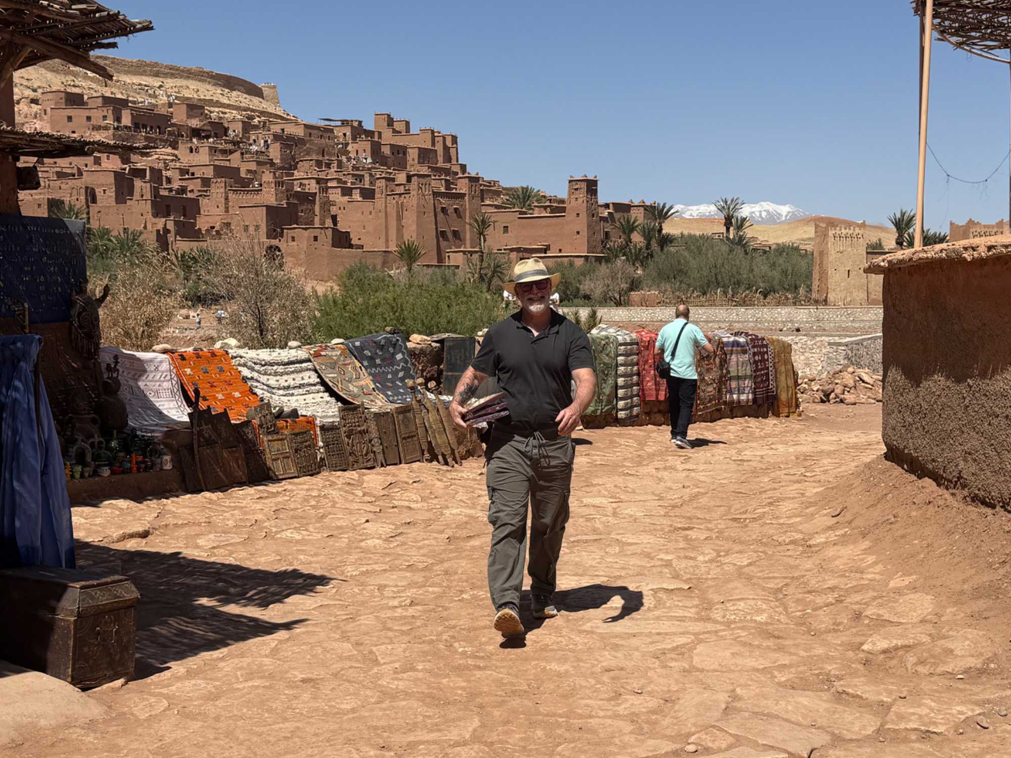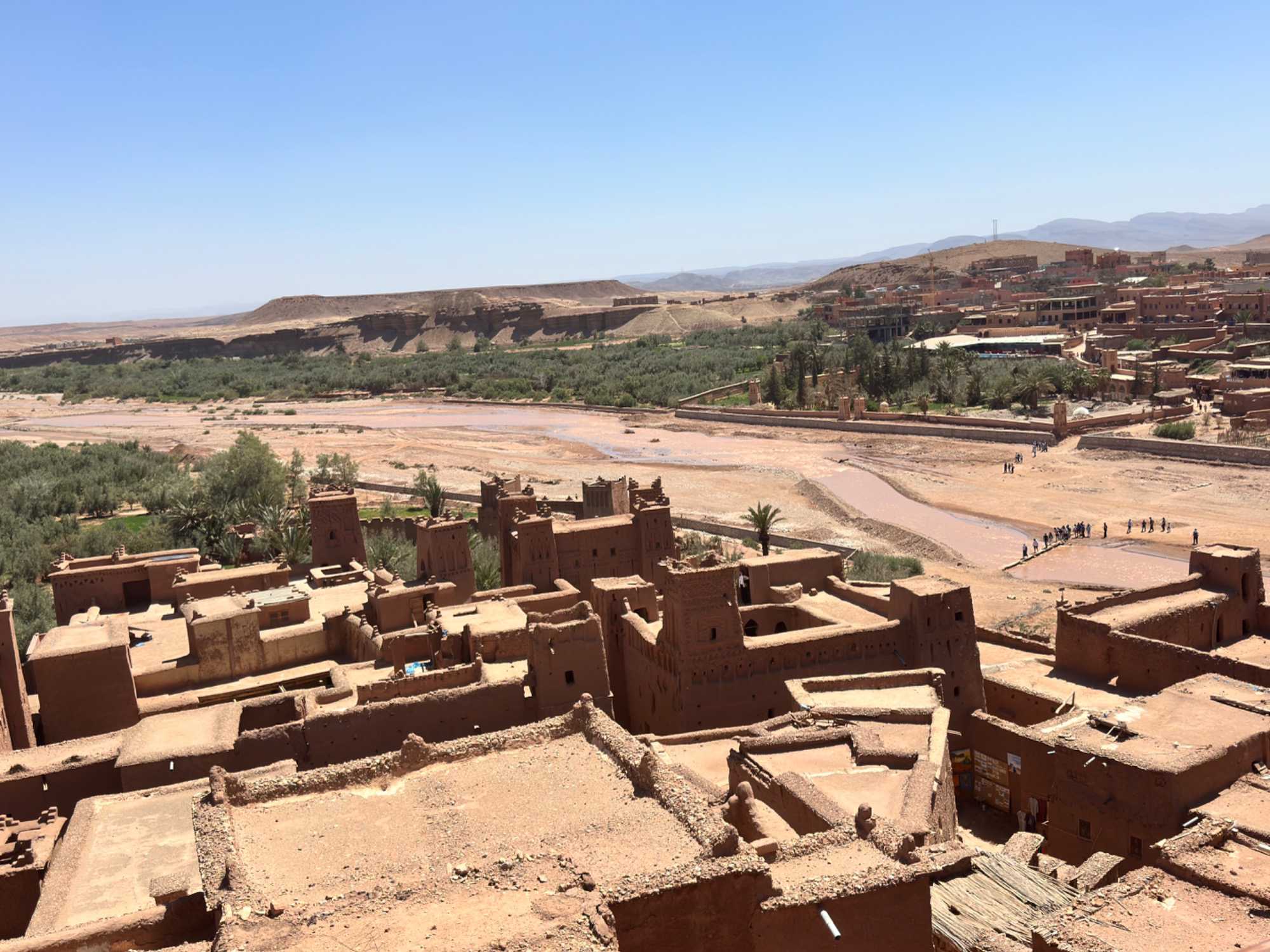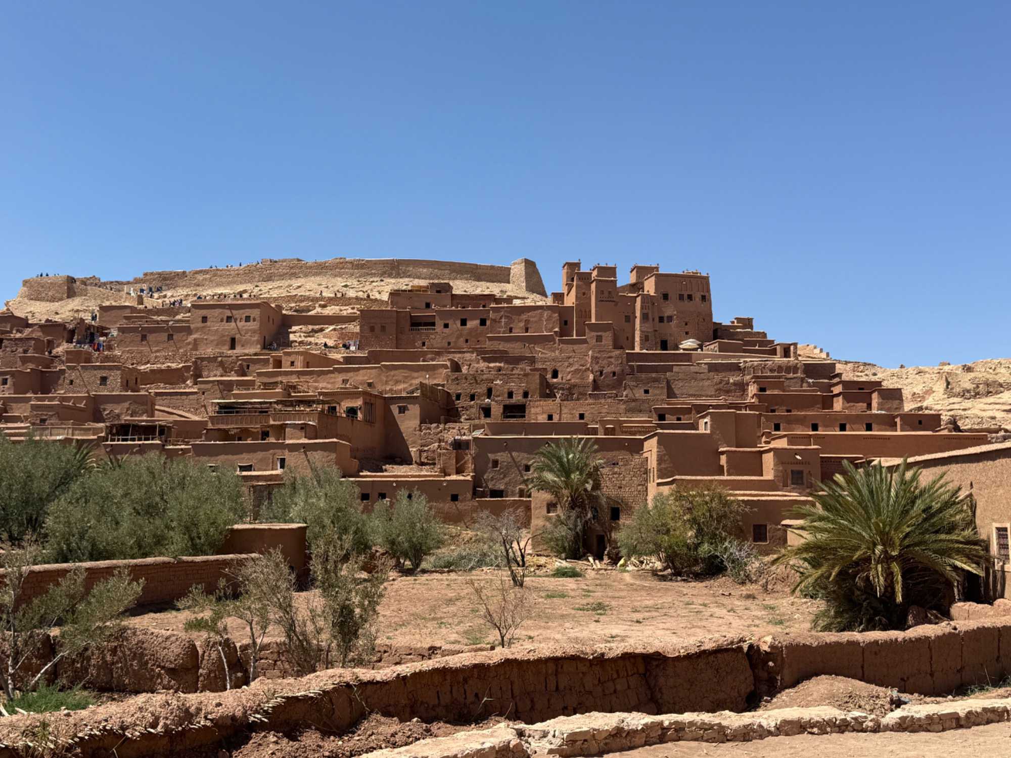Nous reprenons ensuite la route en direction d’un lieu emblématique : Aït Benhaddou, classé au patrimoine mondial de l’UNESCO. Nous arrivons en fin de matinée dans ce village fortifié absolument fascinant. Dès notre arrivée, le décor est saisissant : un ensemble de kasbahs en terre crue, aux teintes d’argile rouge, qui semblent se fondre dans le paysage désertique environnant.