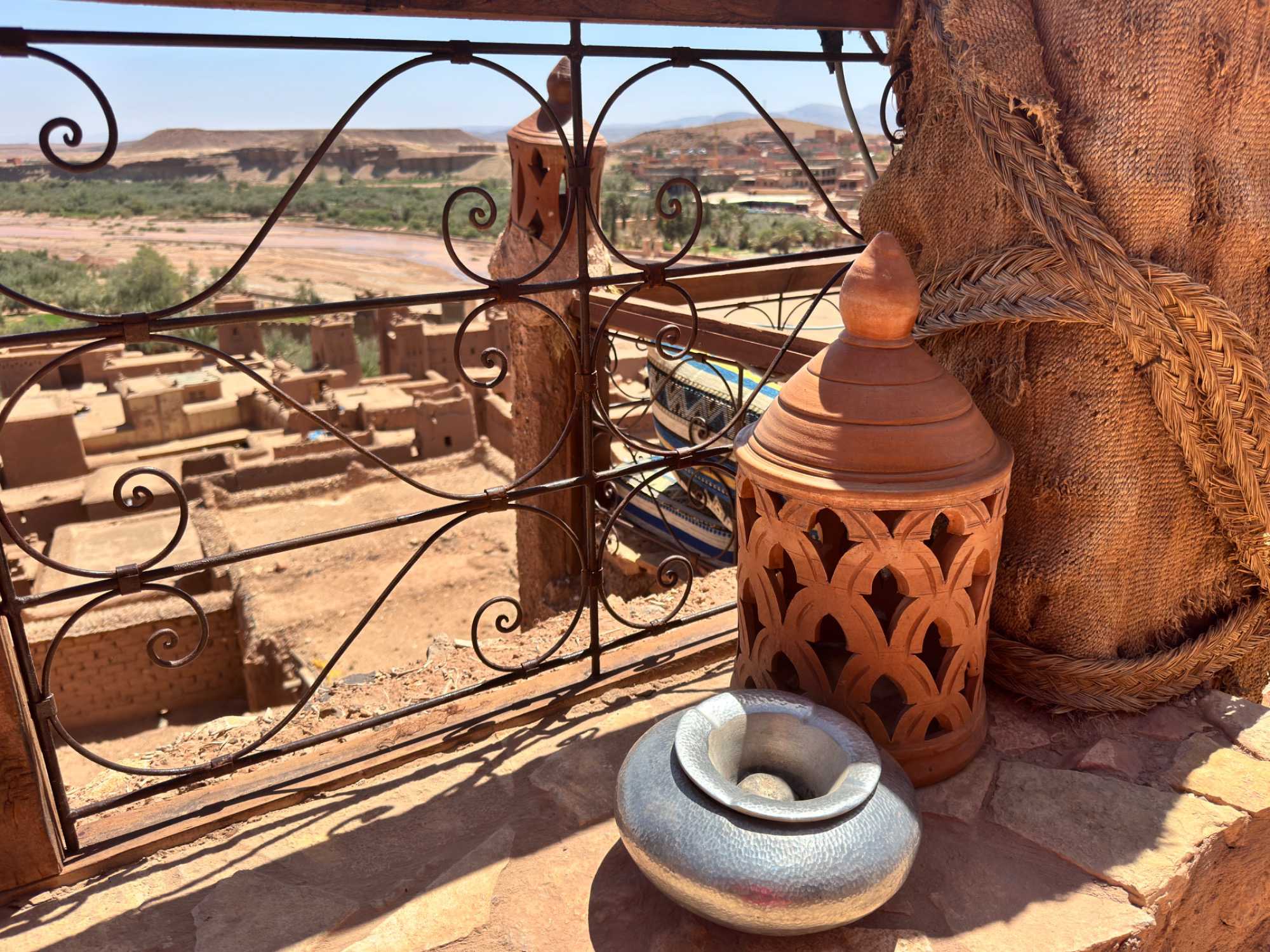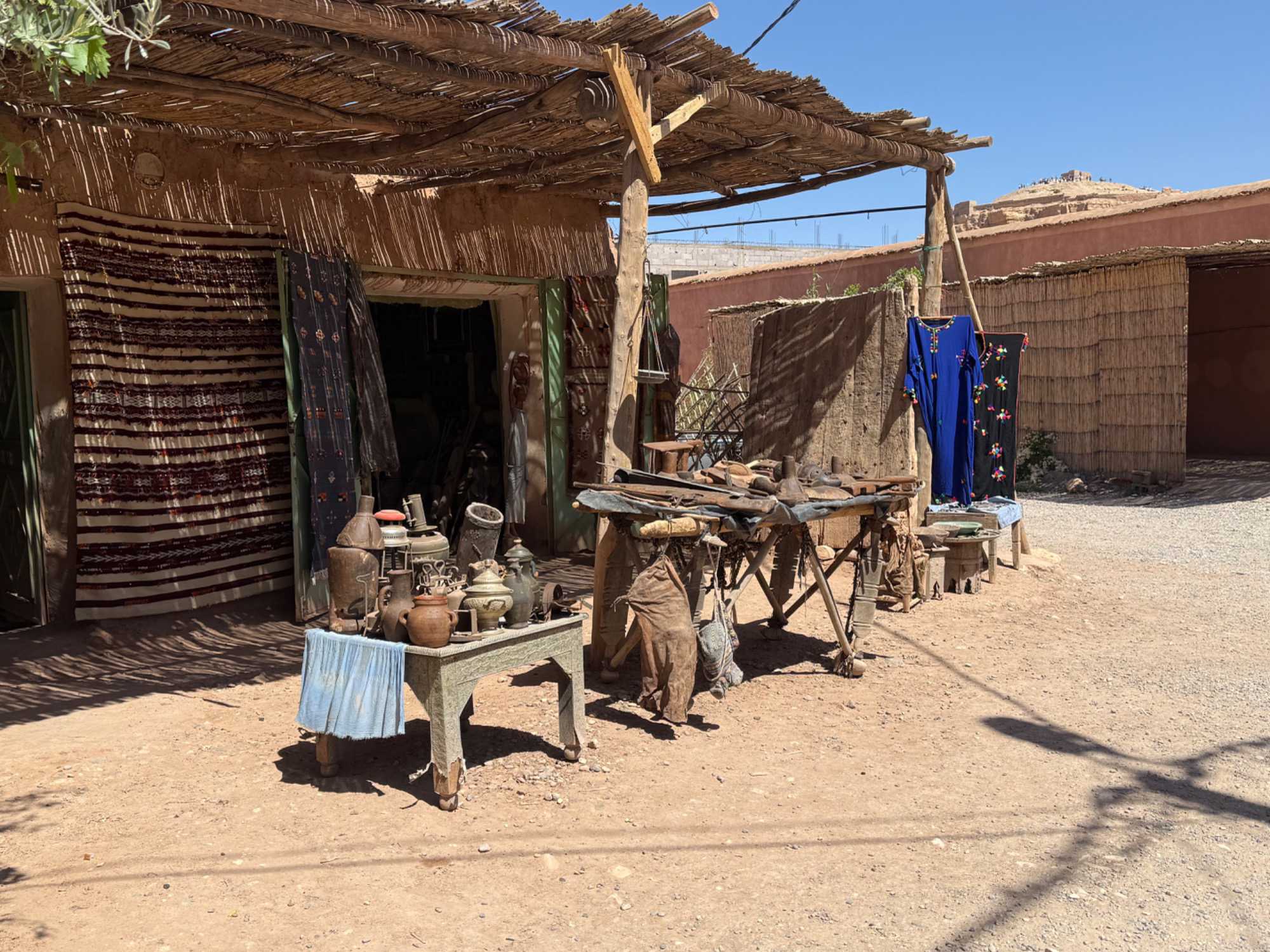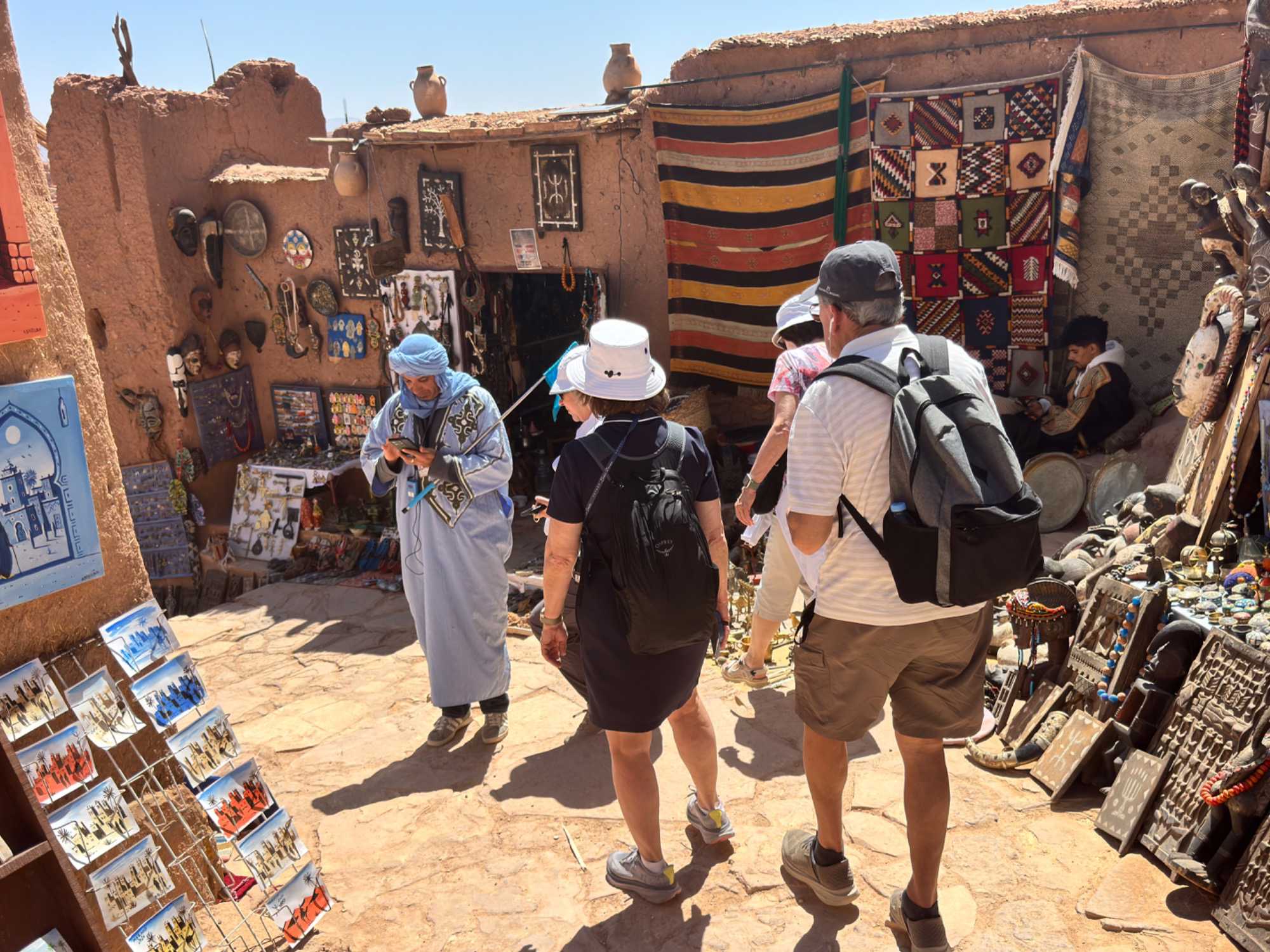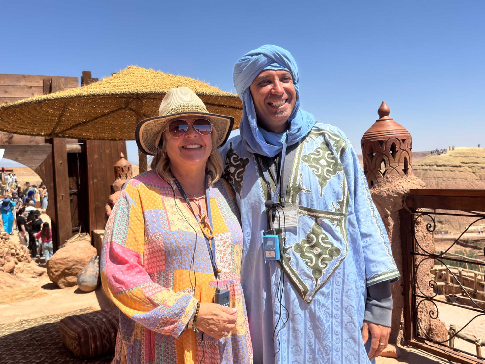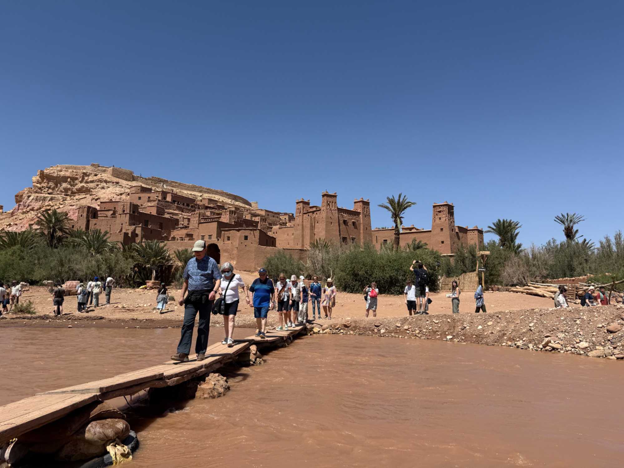 Nous reprenons ensuite la route en direction d’un lieu emblématique : Aït Benhaddou, classé au patrimoine mondial de l’UNESCO. Nous arrivons en fin de matinée dans ce village fortifié absolument fascinant. Dès notre arrivée, le décor est saisissant : un ensemble de kasbahs en terre crue, aux teintes d’argile rouge, qui semblent se fondre dans le paysage désertique environnant.