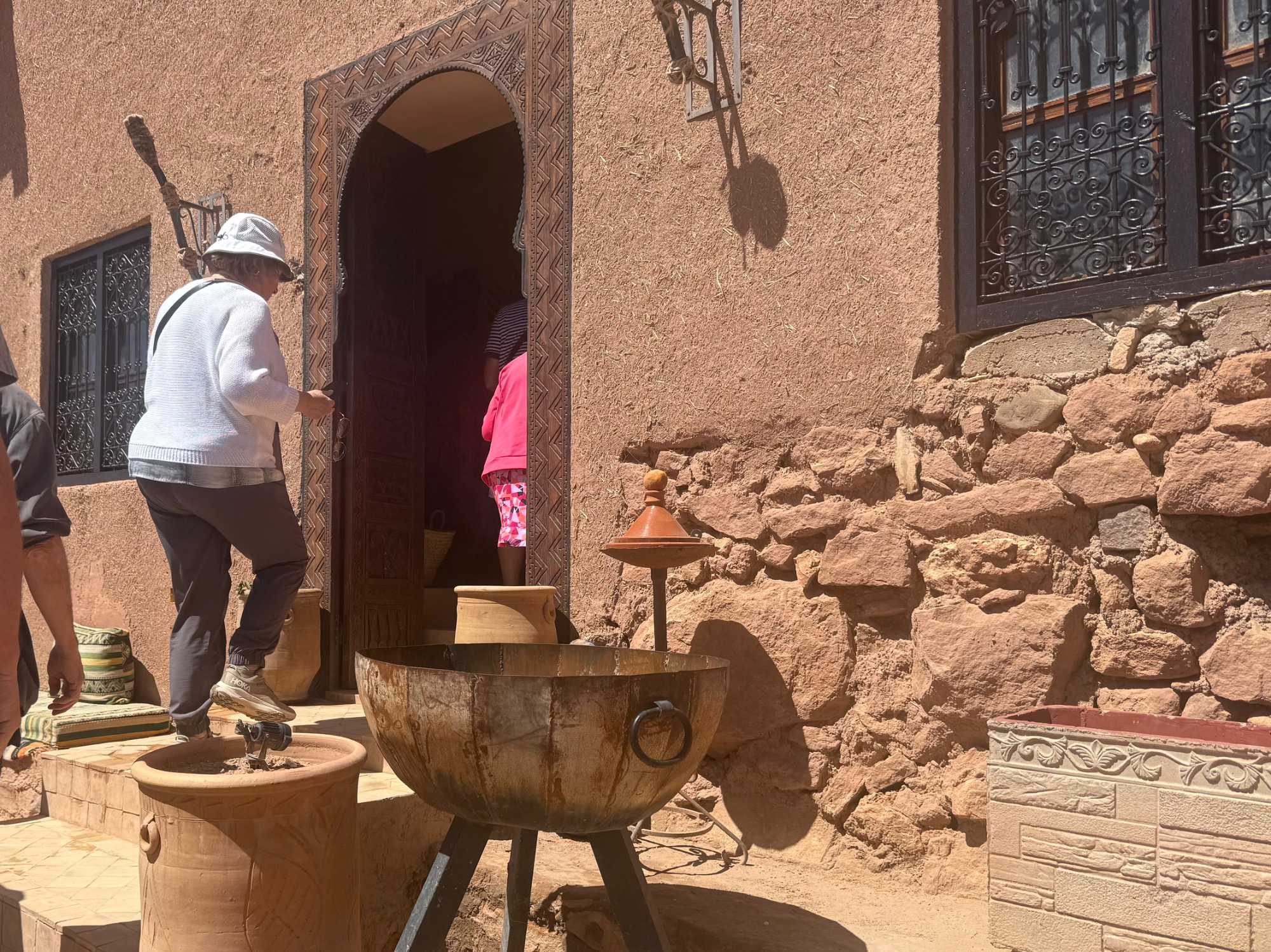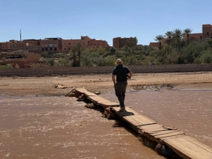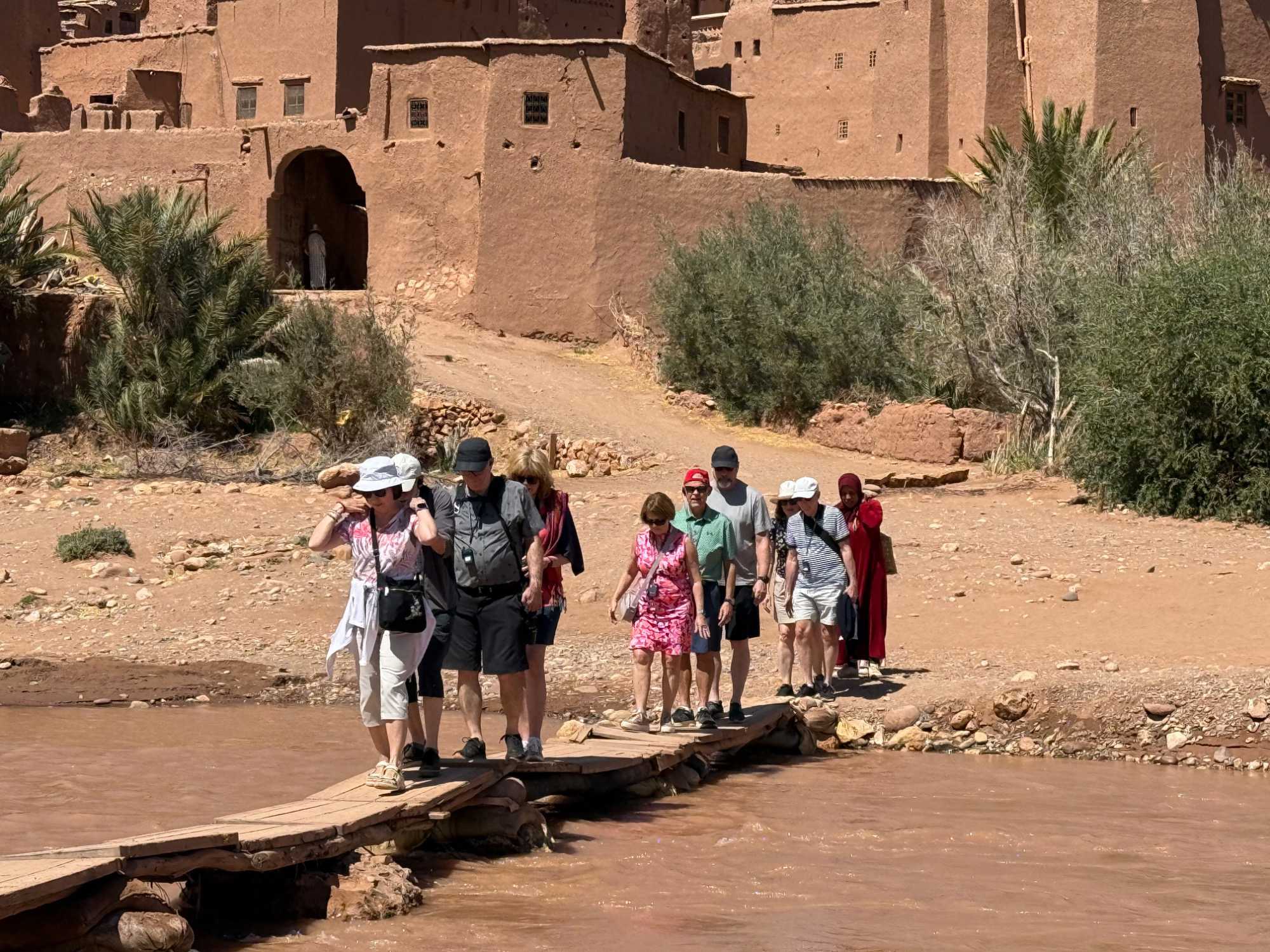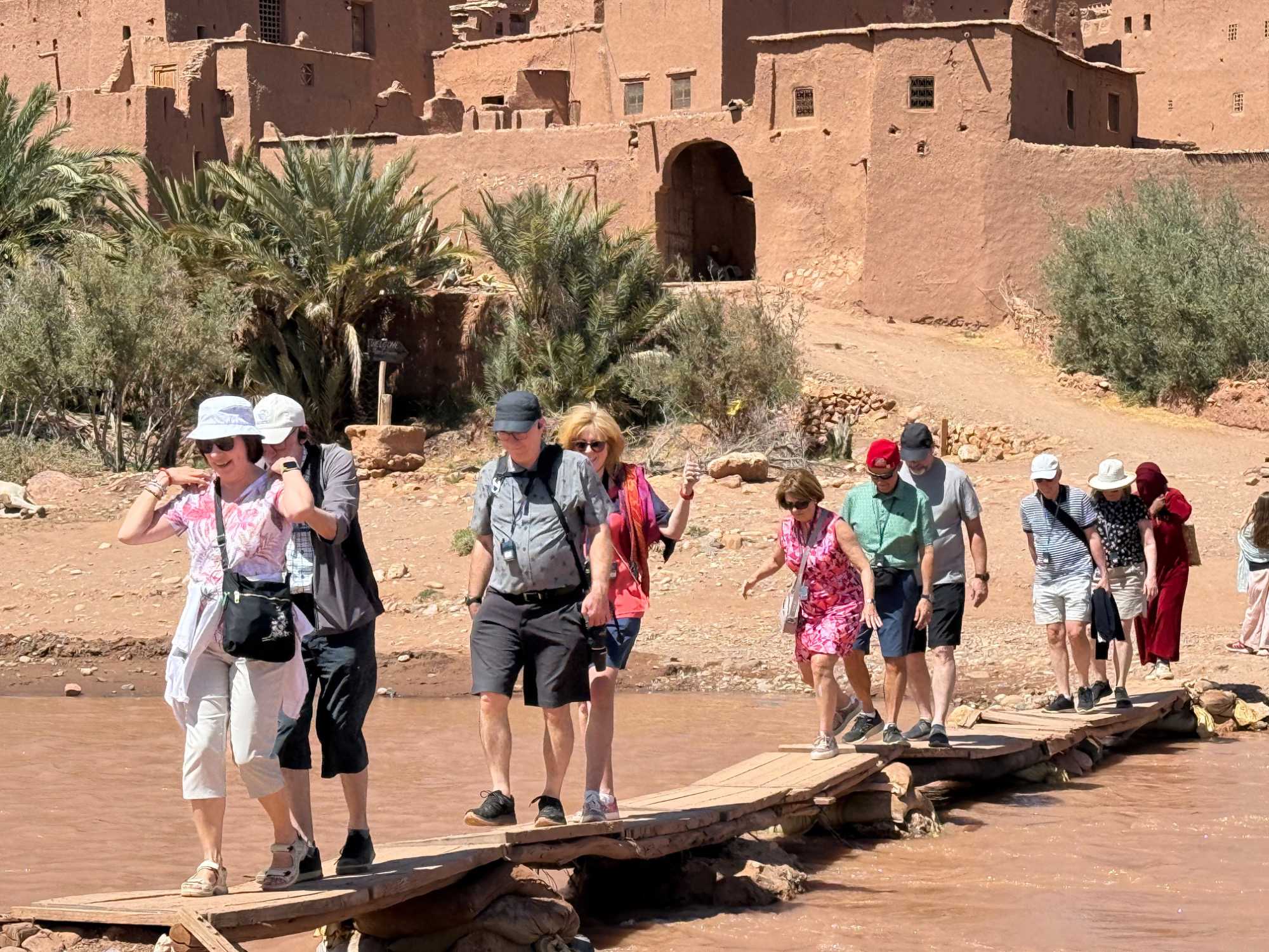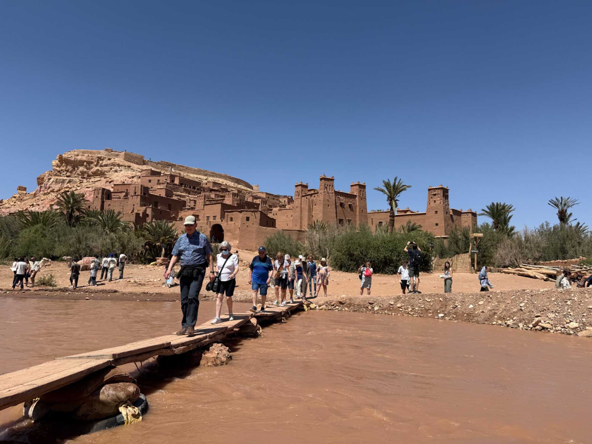 Nous reprenons ensuite la route en direction d’un lieu emblématique : Aït Benhaddou, classé au patrimoine mondial de l’UNESCO. Nous arrivons en fin de matinée dans ce village fortifié absolument fascinant. Dès notre arrivée, le décor est saisissant : un ensemble de kasbahs en terre crue, aux teintes d’argile rouge, qui semblent se fondre dans le paysage désertique environnant.