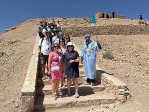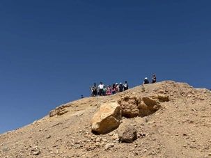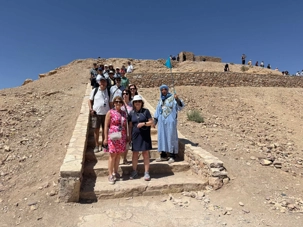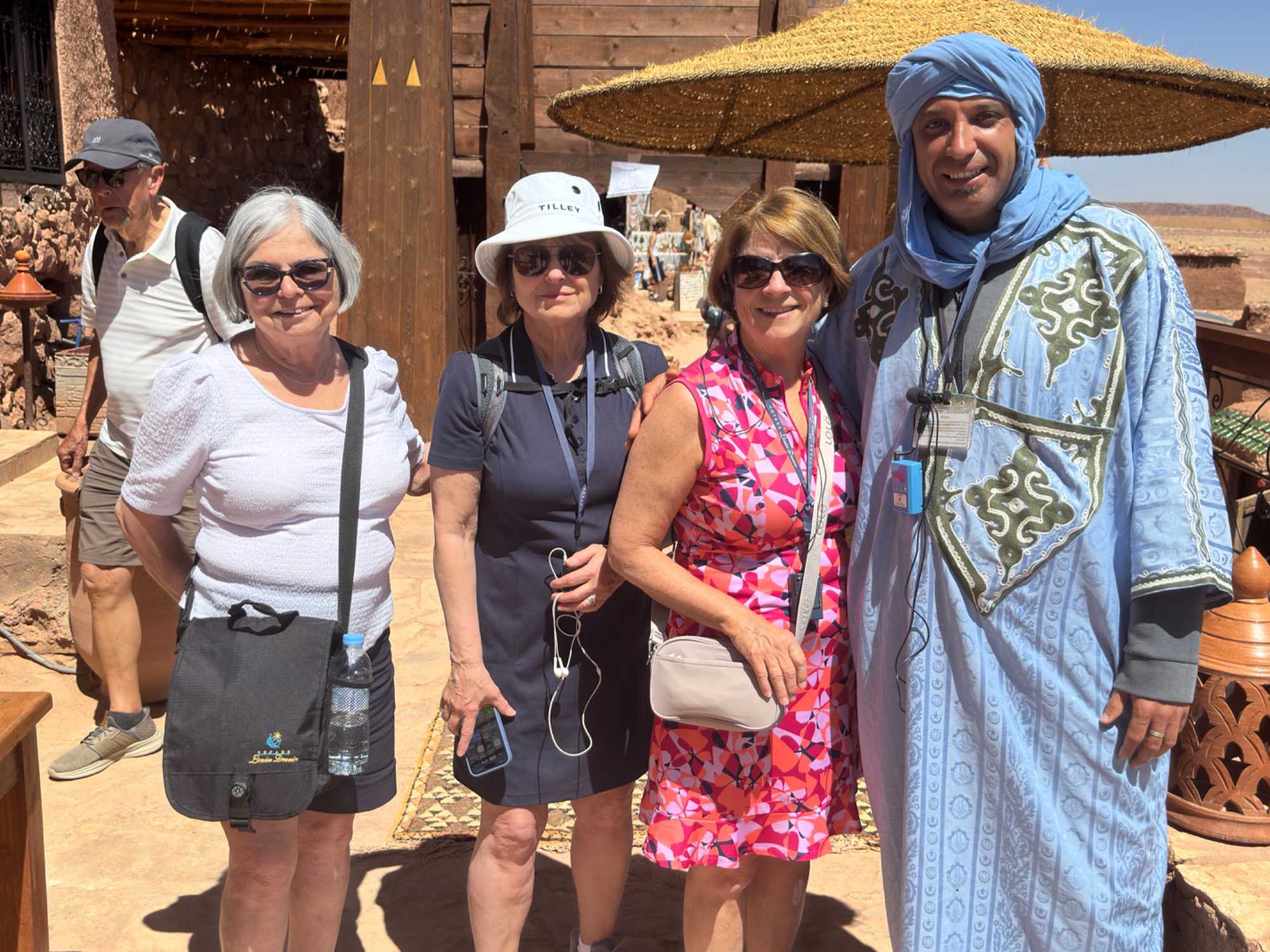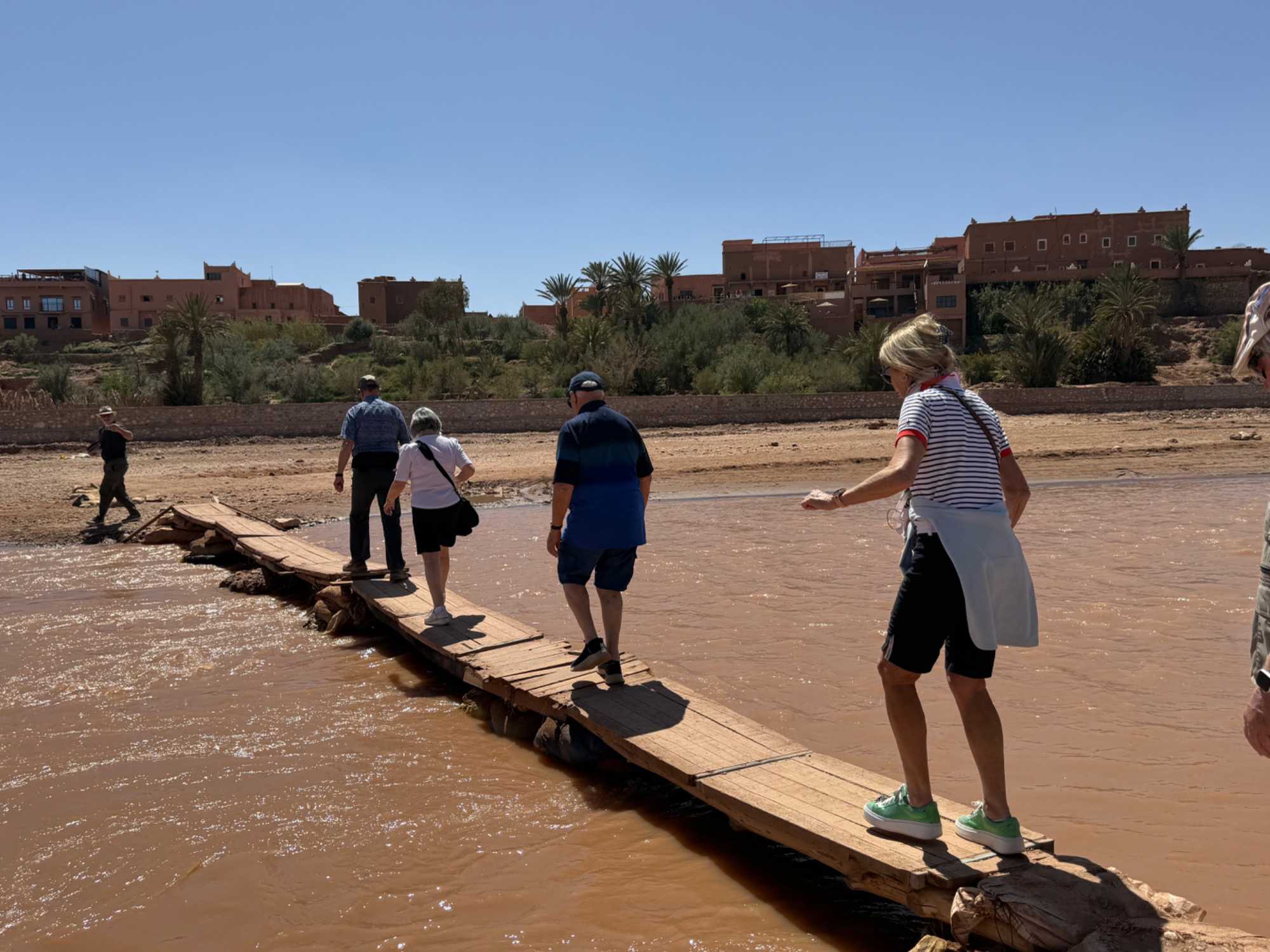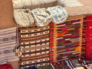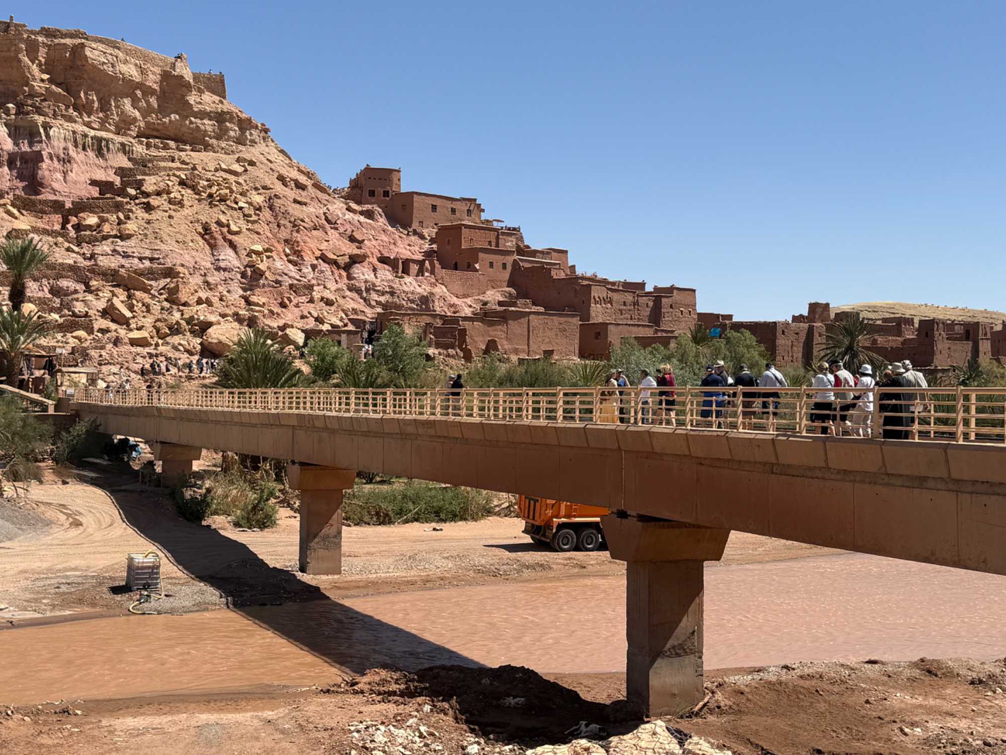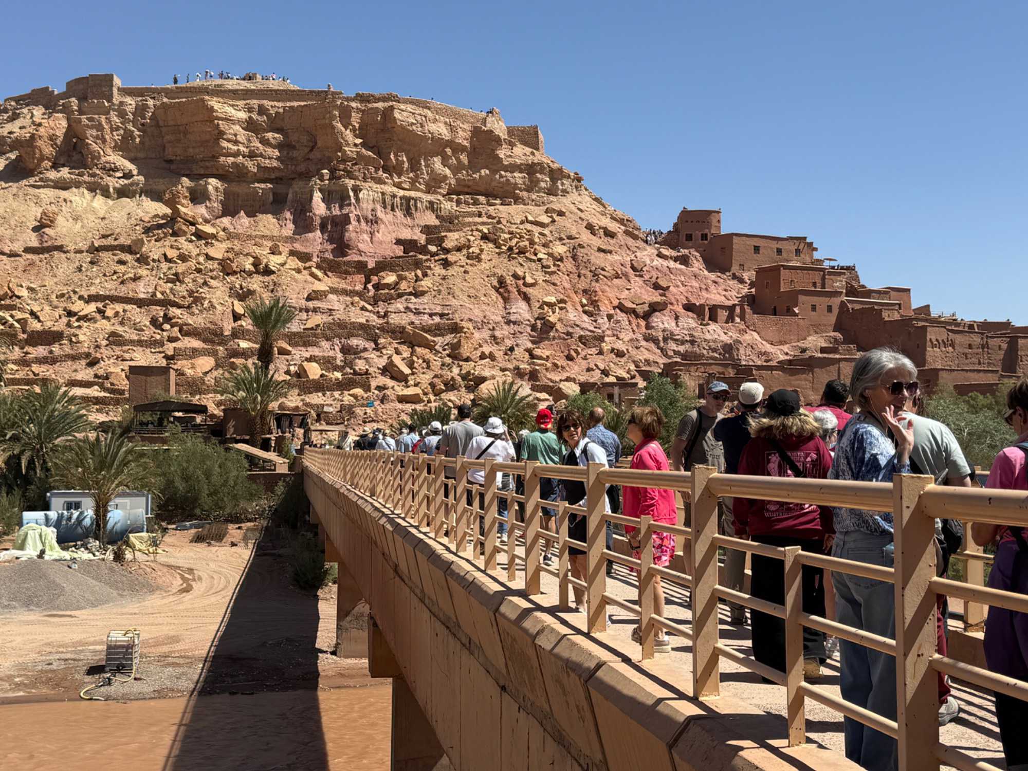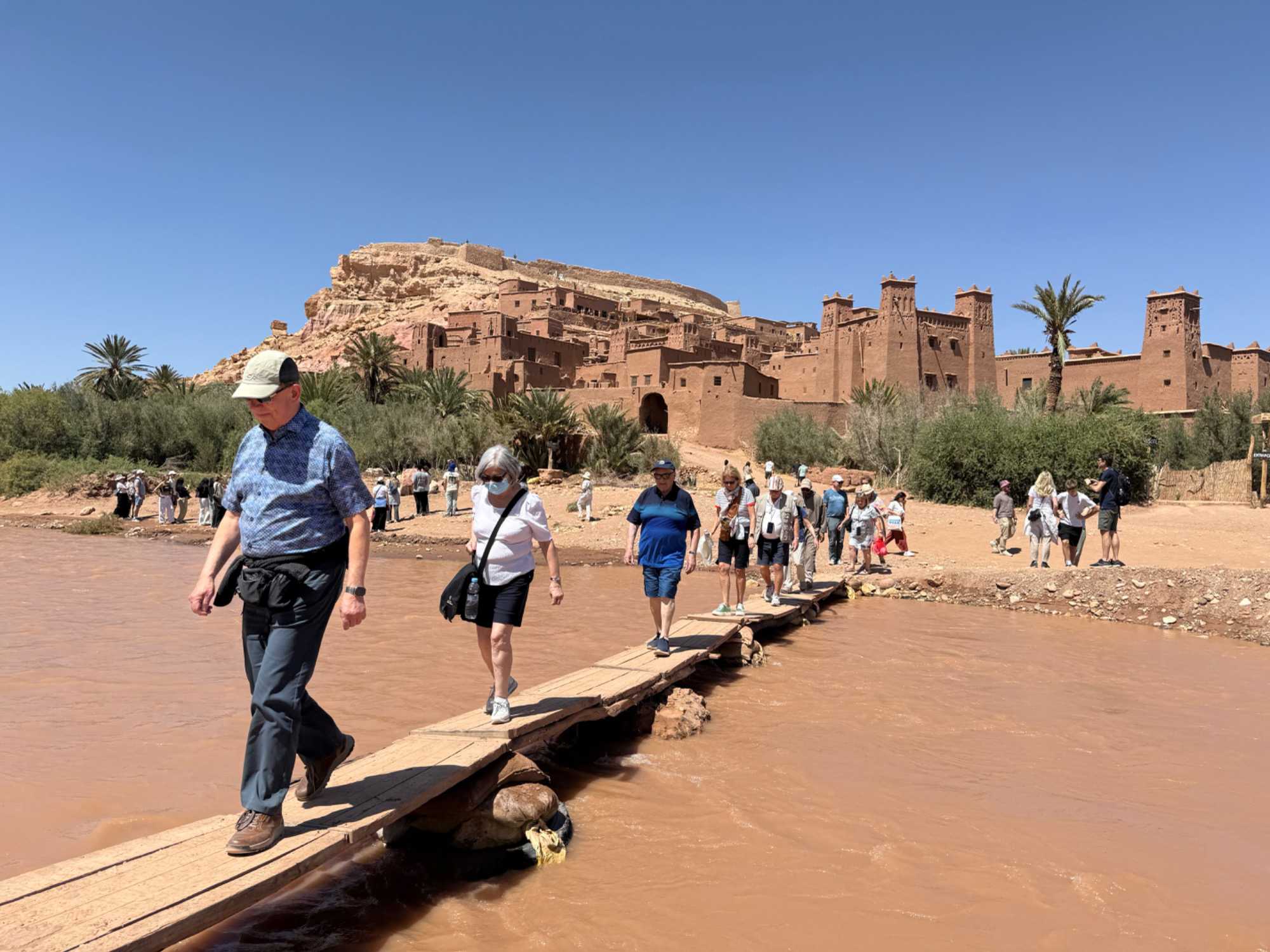 Nous reprenons ensuite la route en direction d’un lieu emblématique : Aït Benhaddou, classé au patrimoine mondial de l’UNESCO. Nous arrivons en fin de matinée dans ce village fortifié absolument fascinant. Dès notre arrivée, le décor est saisissant : un ensemble de kasbahs en terre crue, aux teintes d’argile rouge, qui semblent se fondre dans le paysage désertique environnant.