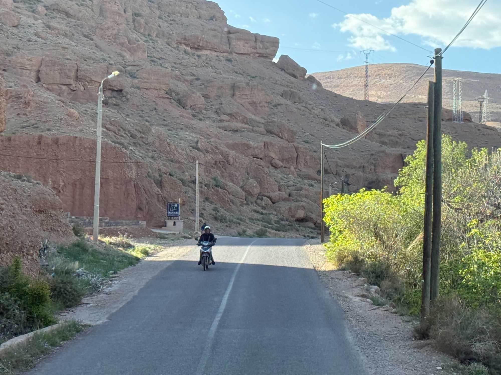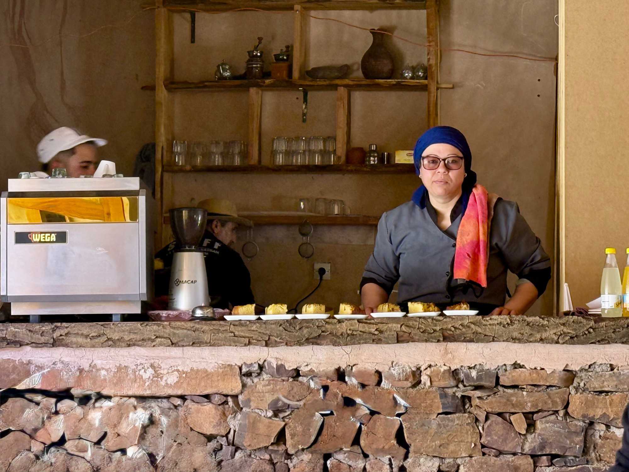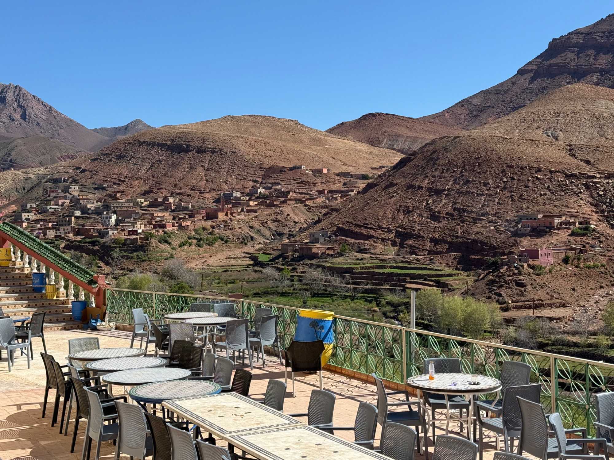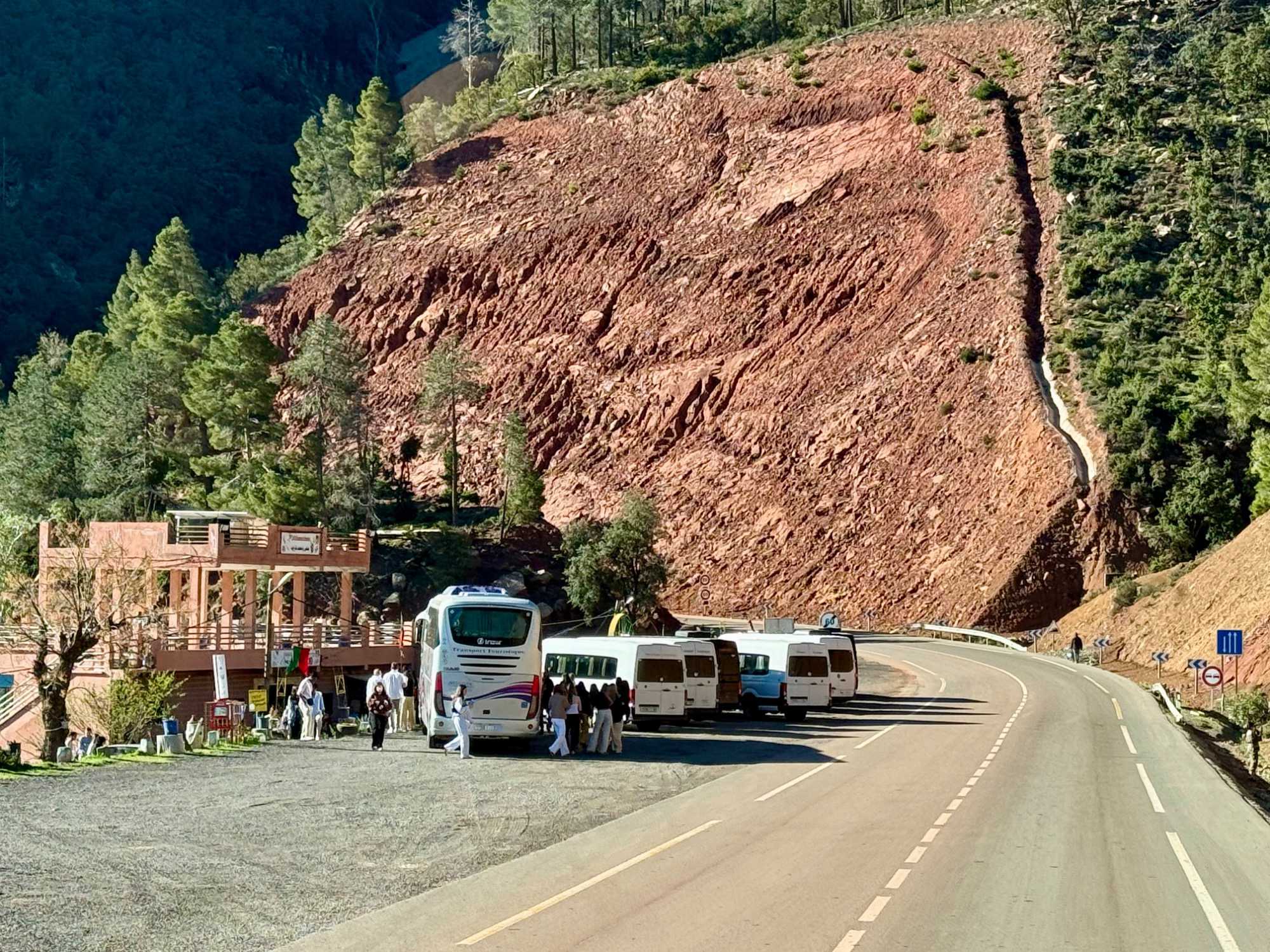 Nous faisons un premier arrêt au cœur des montagnes pour une pause bien méritée. L’occasion de savourer un petit café local, appelé ici nous-nous, un café marocain typique, simple mais délicieux, qui accompagne parfaitement ce moment suspendu face aux panoramas grandioses.