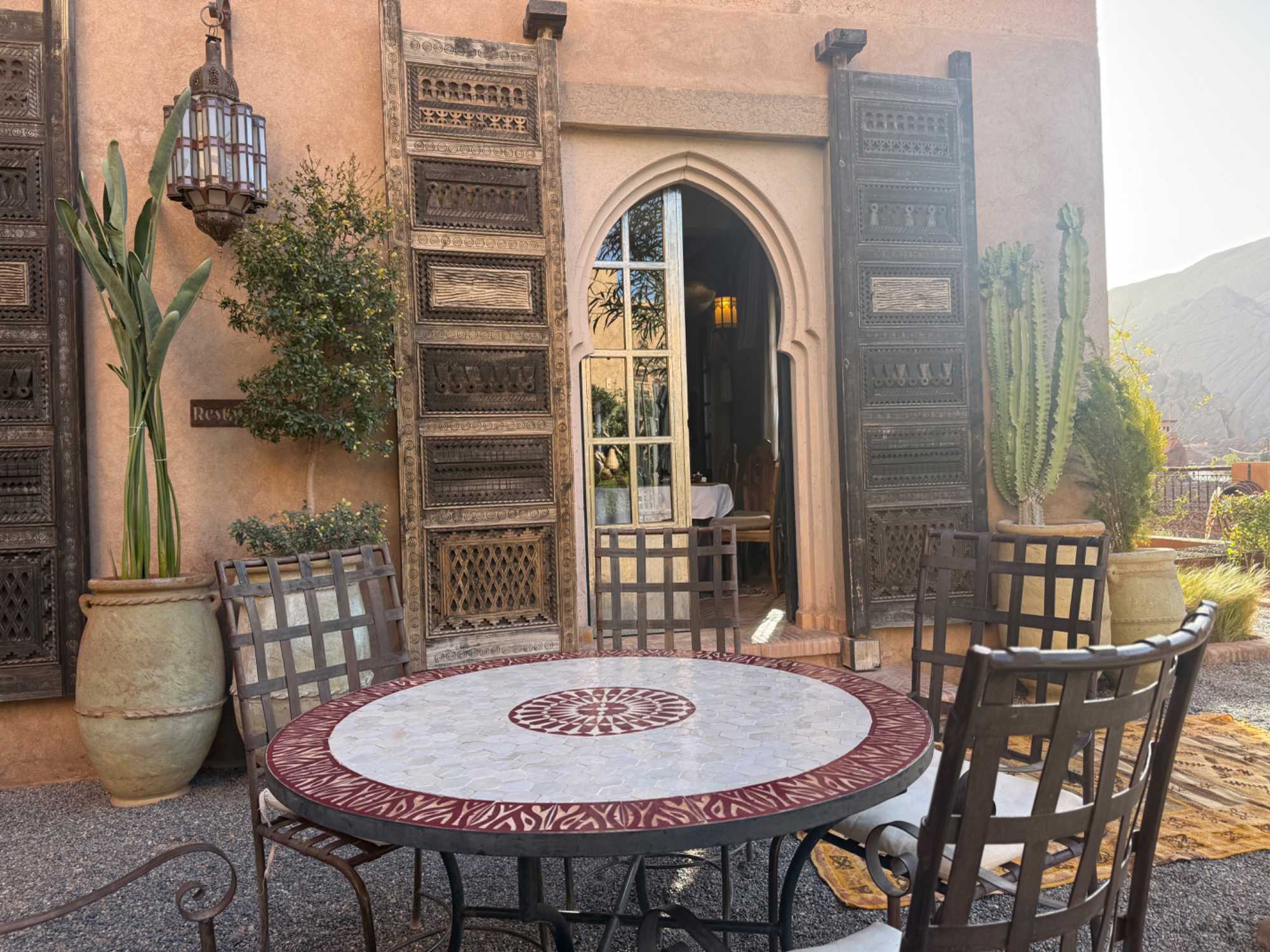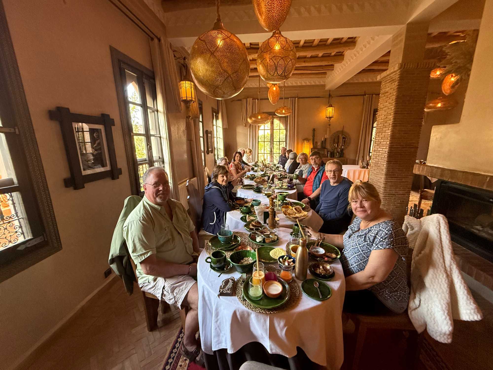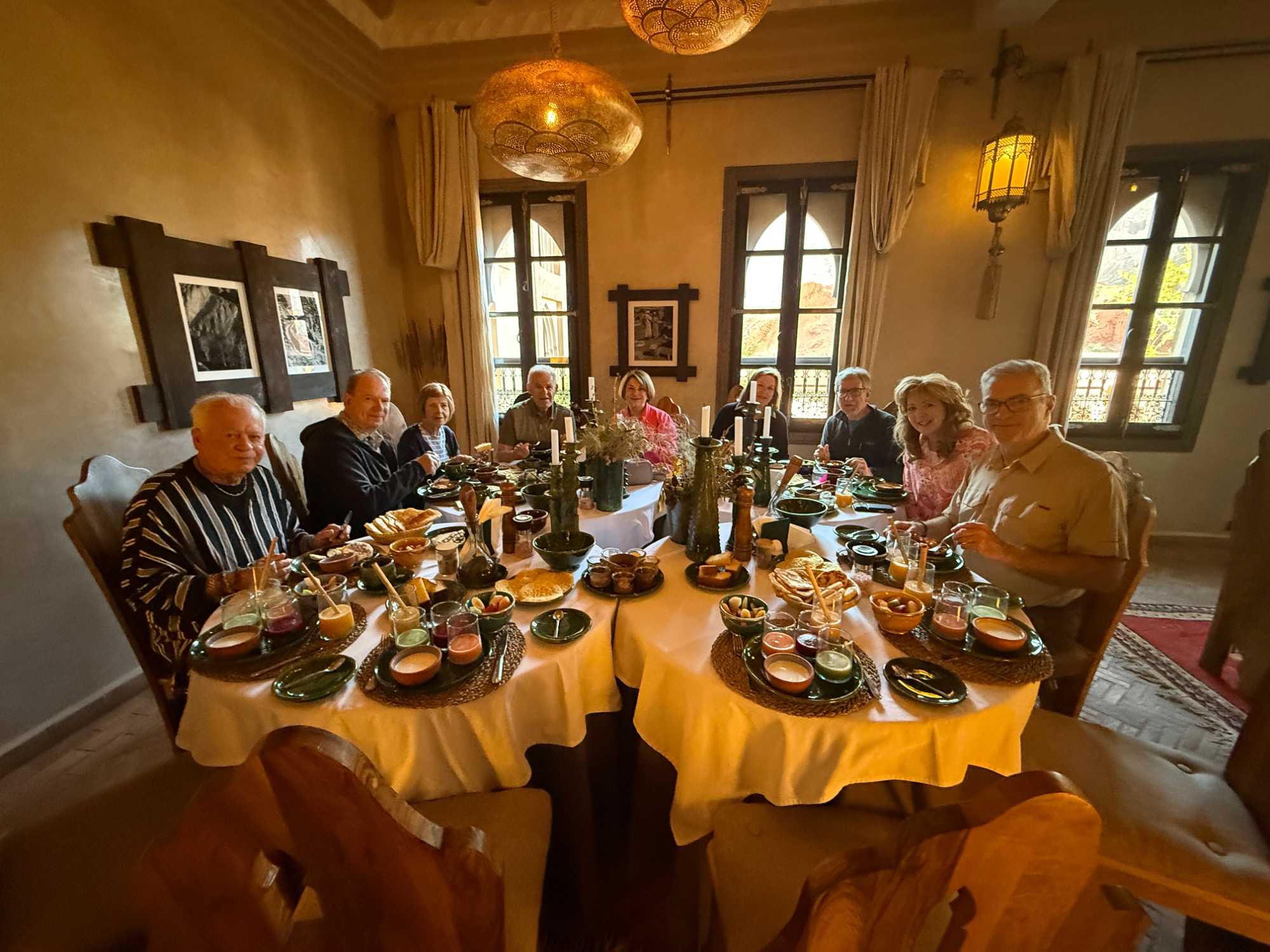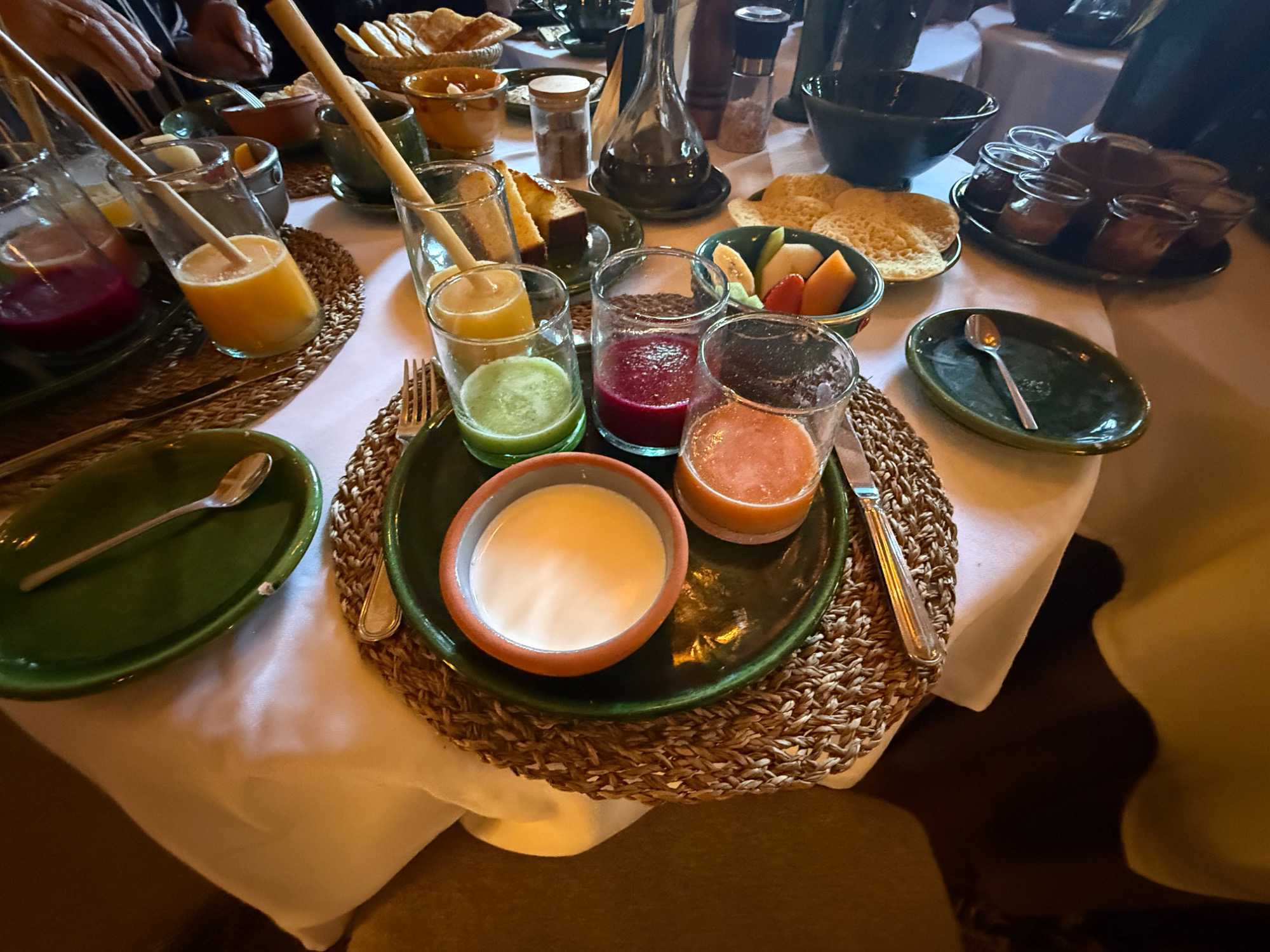 Tout est soigneusement présenté à table : quatre jus différents pour chacun, des crêpes maison, du pain frais, une variété de confitures, sans oublier les œufs préparés à la marocaine, tout simplement délicieux. Un petit-déjeuner élégant, généreux et savoureux — à l’image de cet hôtel exceptionnel.