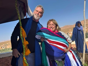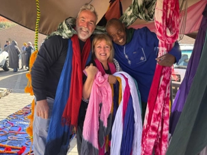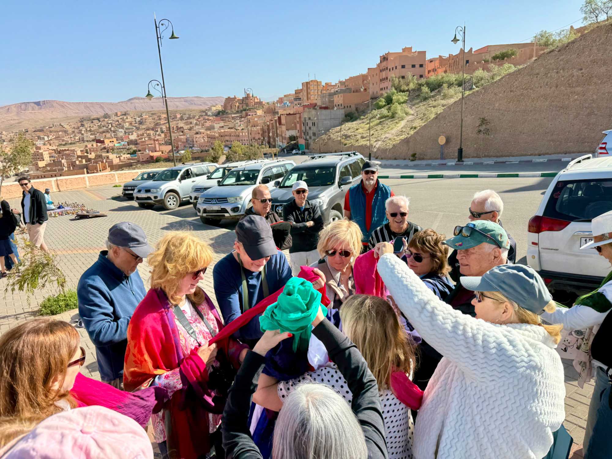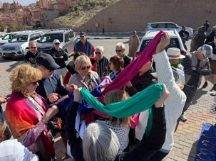 Un berbère se prête même au jeu et montre à Nicole et Caroline comment nouer un turban. Nous avons nos premiers mannequins du groupe !