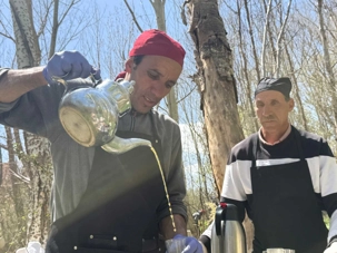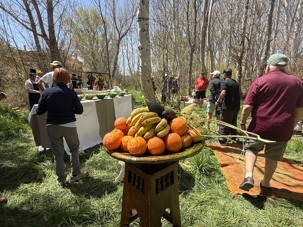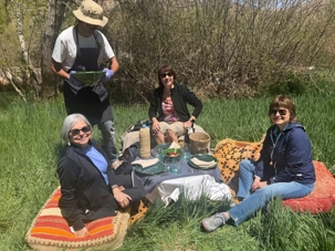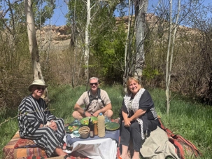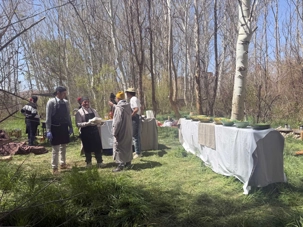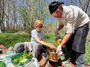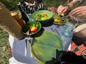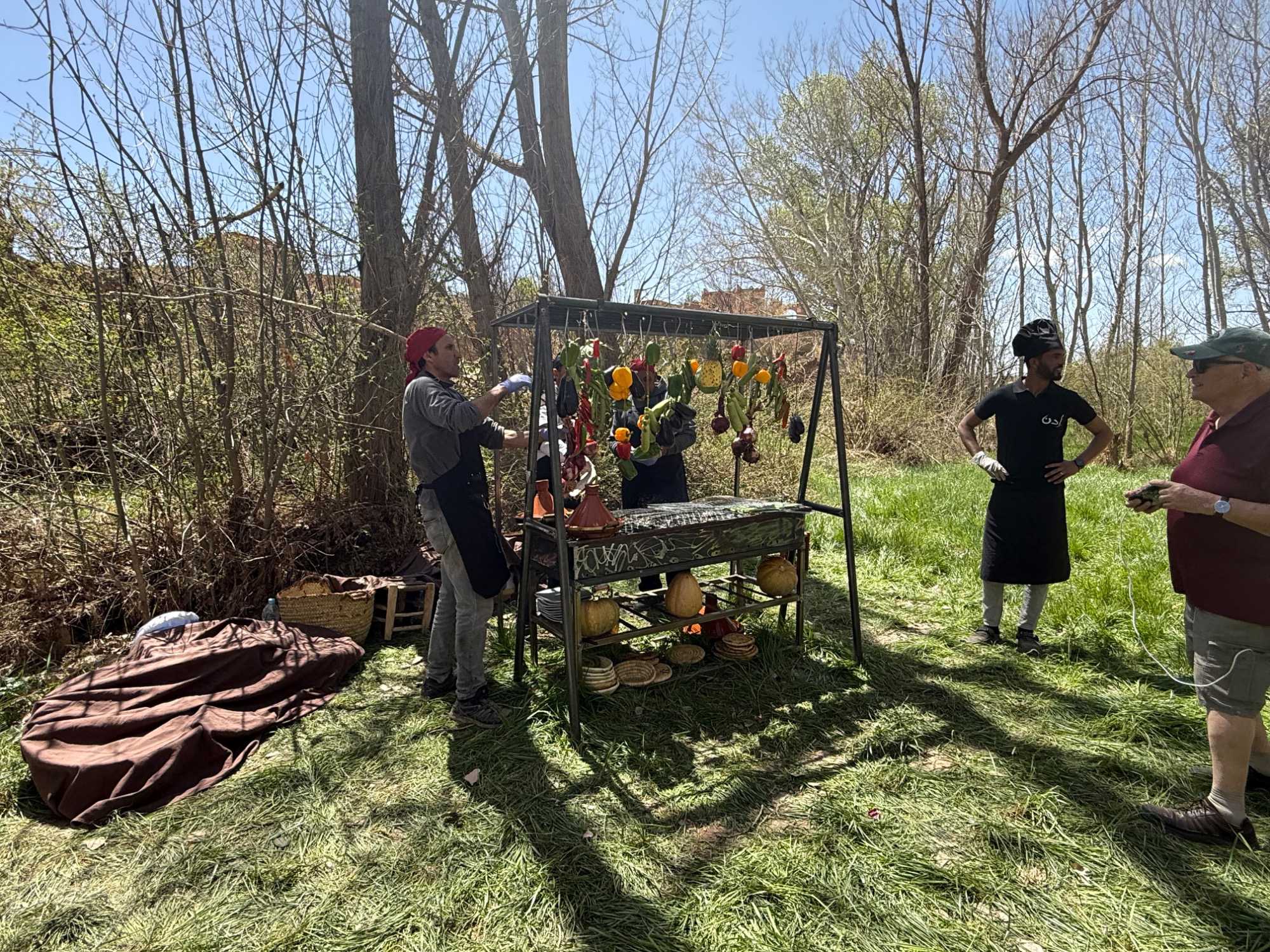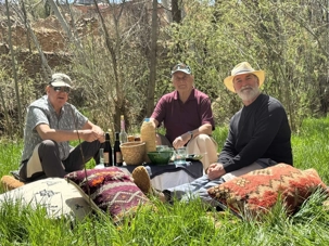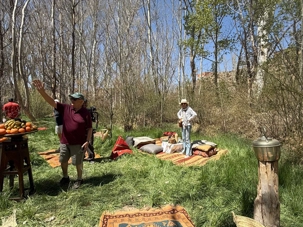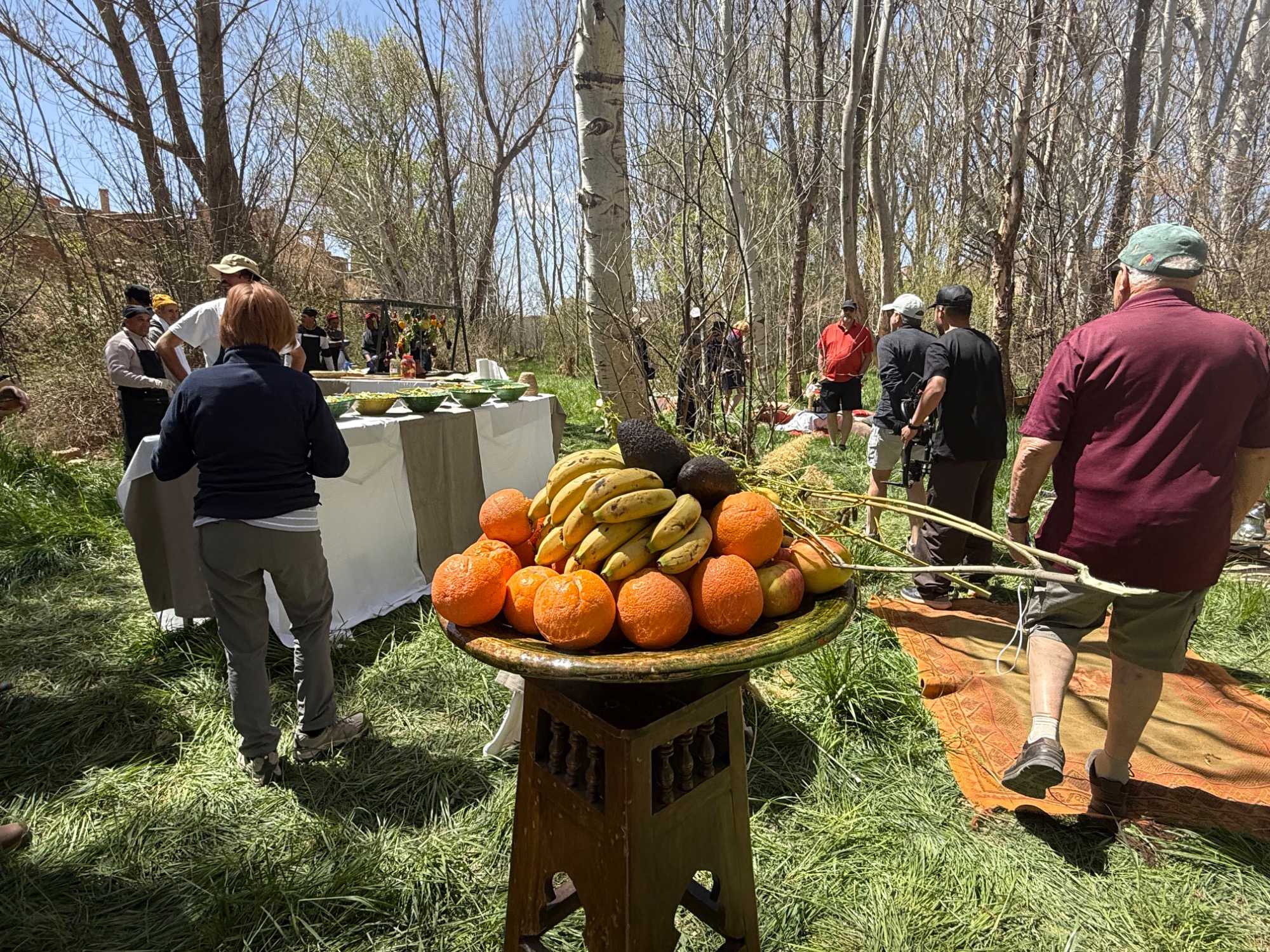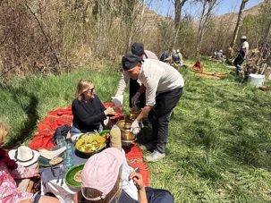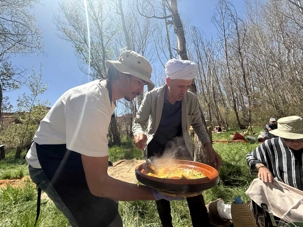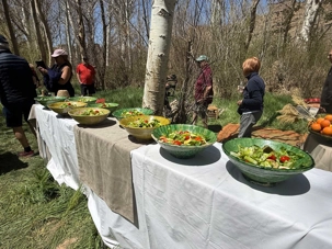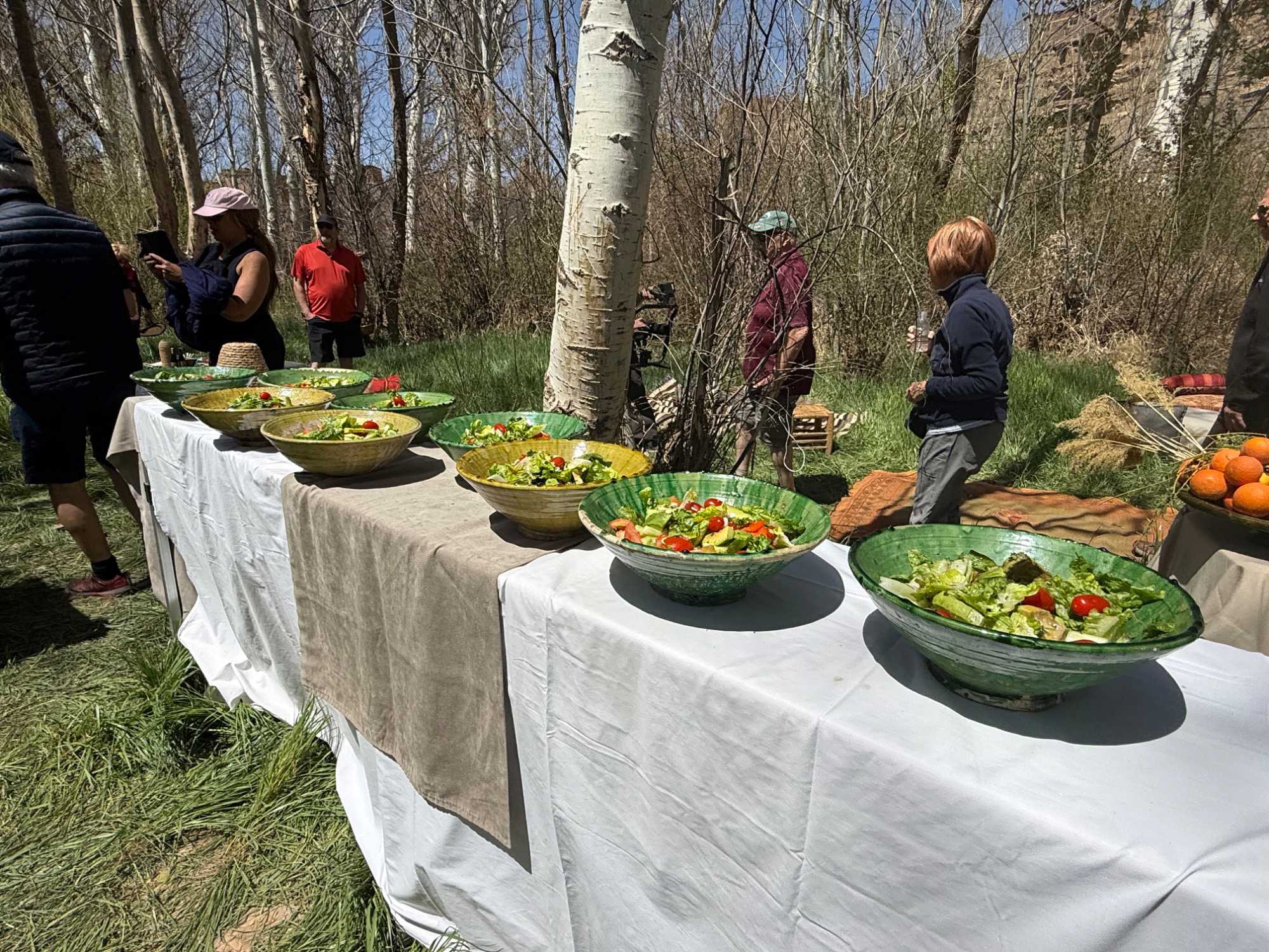 Brochettes de poulet, brochettes de bœuf, salades fraîches, pain maison… le tout accompagné de vin. Un véritable festin, digne d’un grand restaurant, en plein cœur de nulle part.