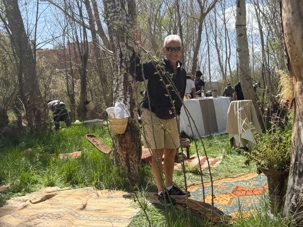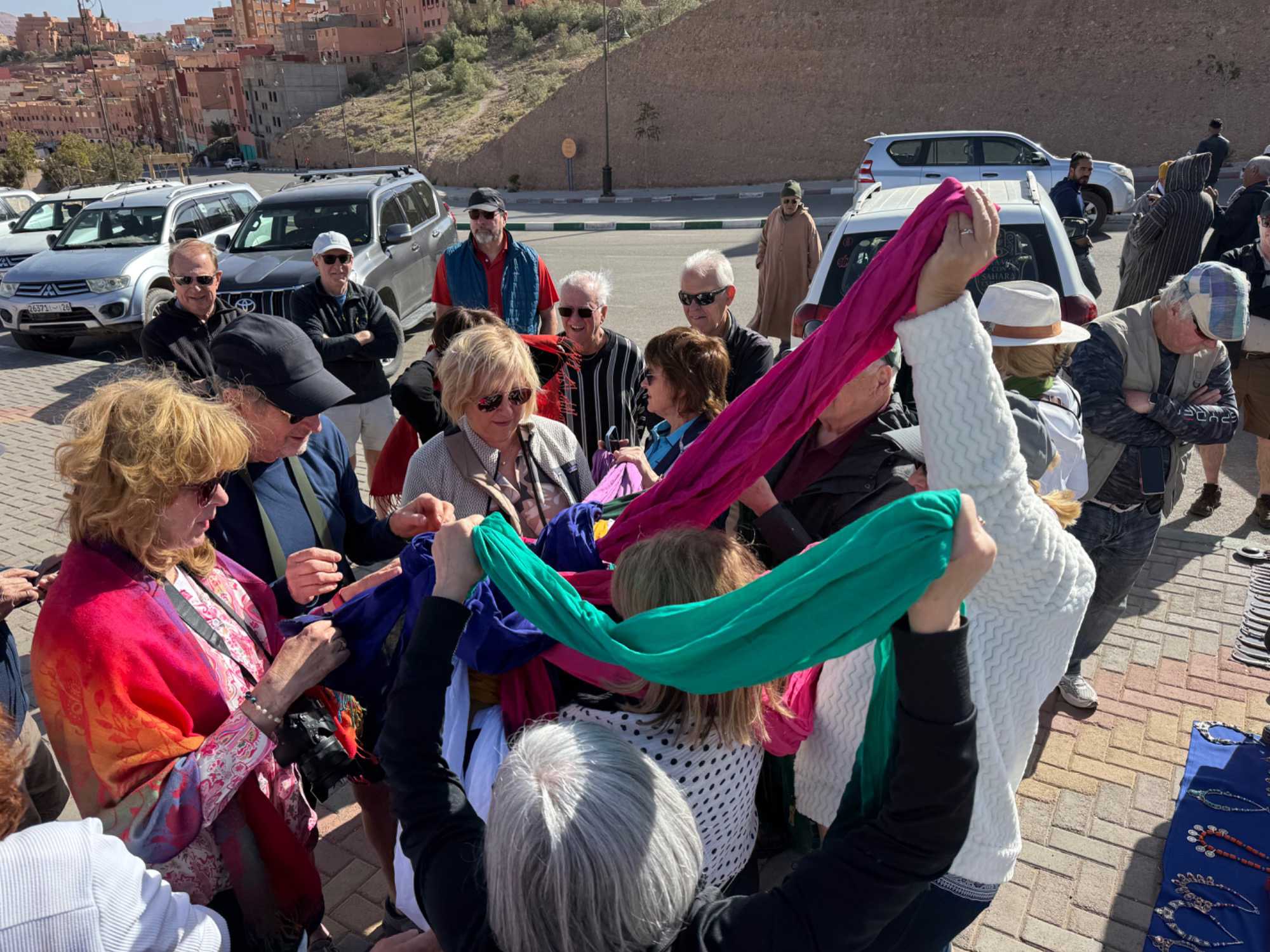 Je me retrouve les bras remplis de foulards, et chacun vient choisir le sien. Les dames d’abord, puis les messieurs… les rires fusent, l’ambiance est joyeuse.