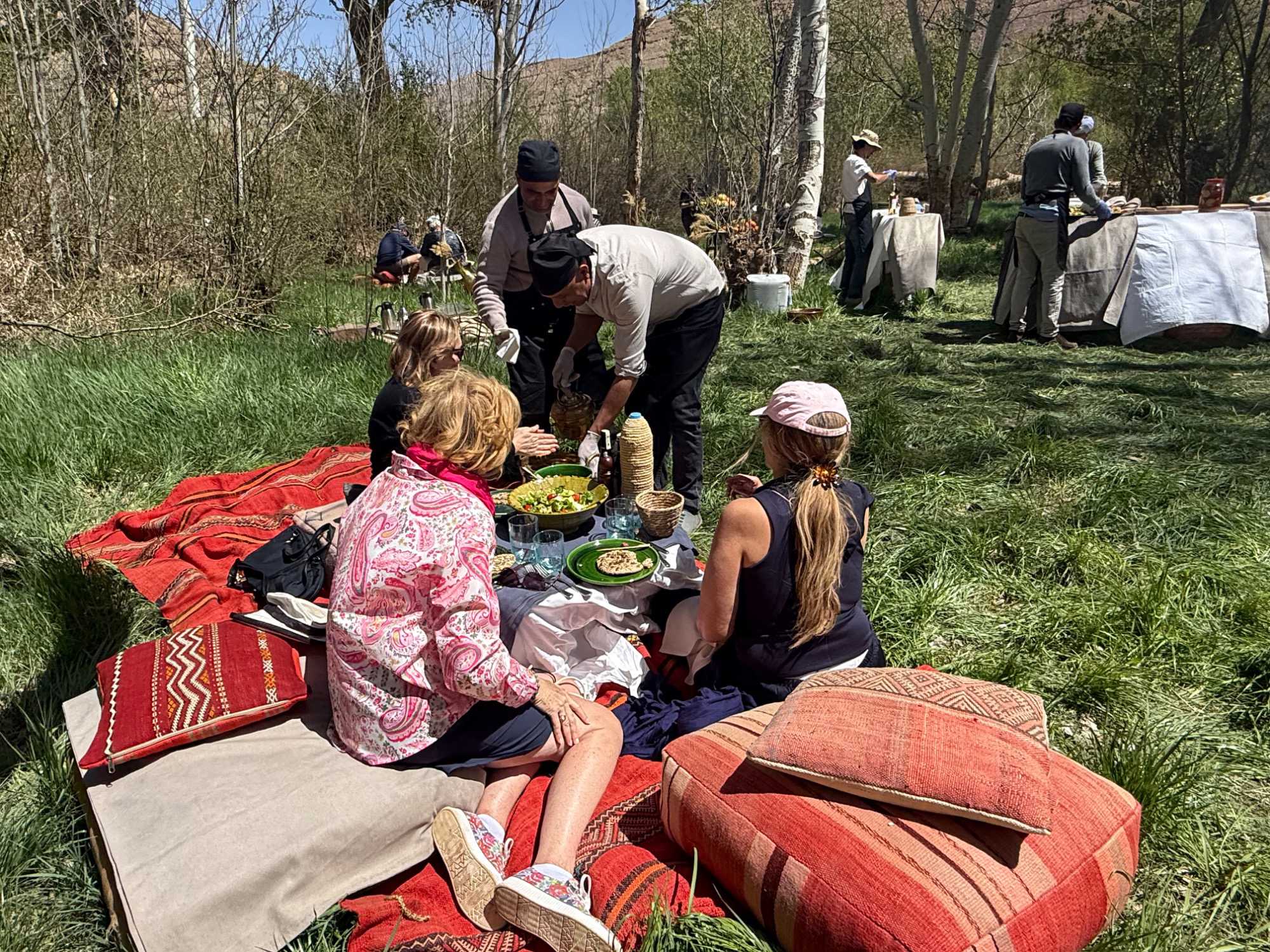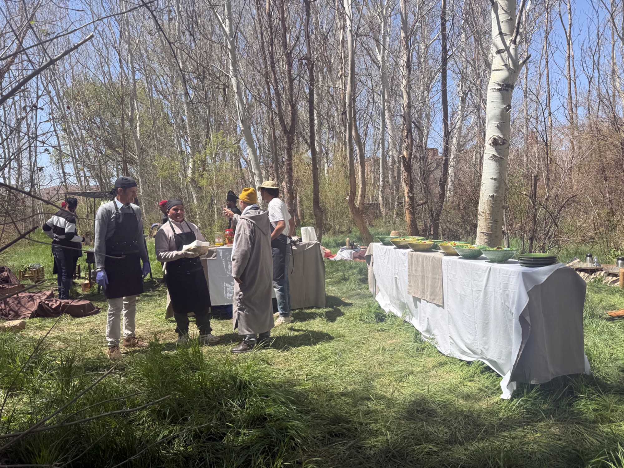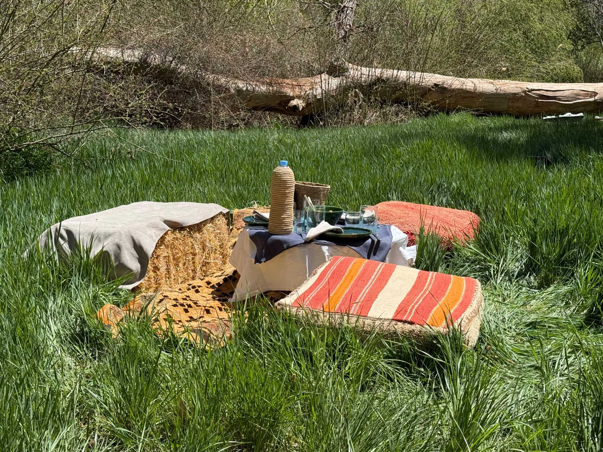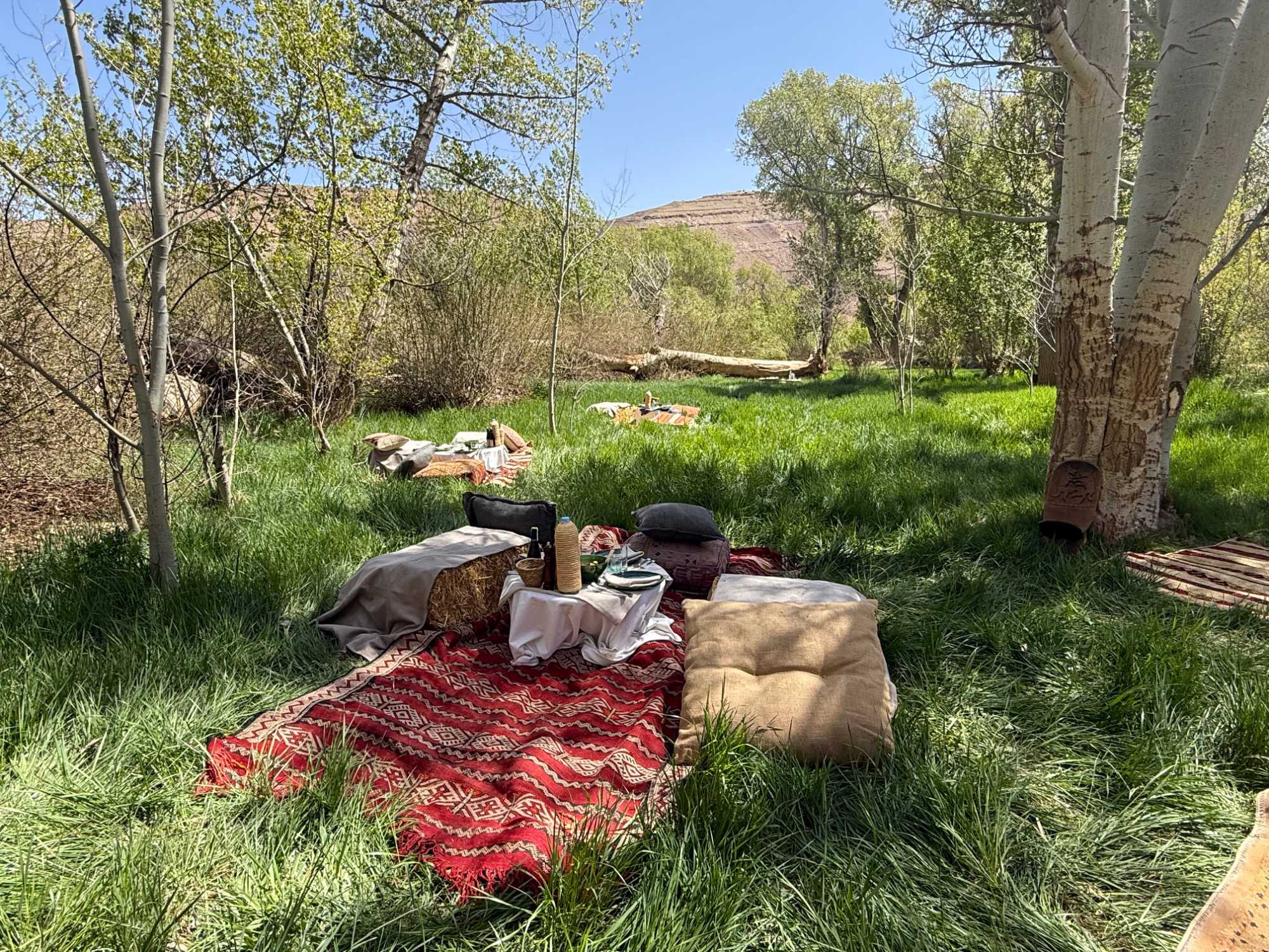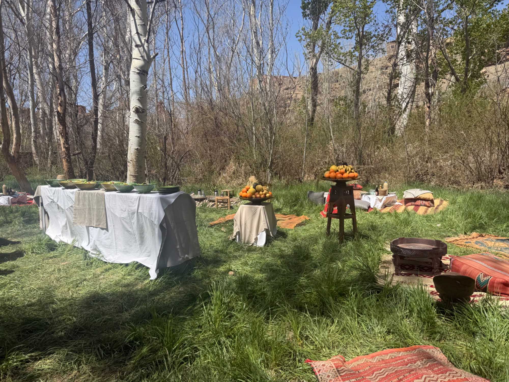 Des tables dressées avec soin, des coussins marocains, une ambiance intime et chaleureuse… tout est installé spécialement pour nous, au milieu de la nature.